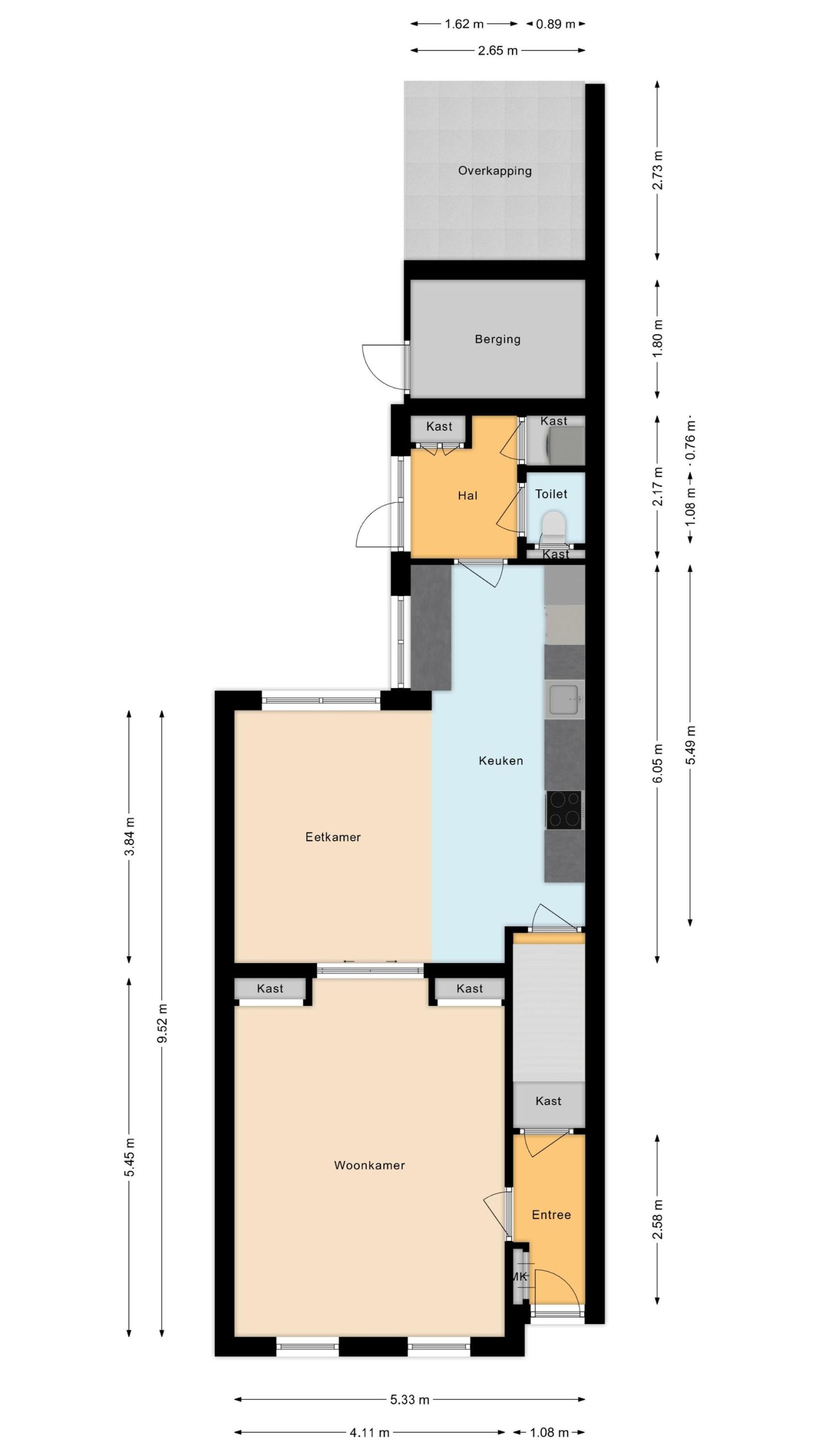 Via de entree komt u in de hal met meterkast, ruime bergkast en toegang tot de ruime woonkamer. De woonkamer is voorzien van een voor- en achterkamer gescheiden middels mooie en-suite deuren. Aan de achterzijde van de woning bevindt zich een halletje met toilet, wasruimte en de Cv-installatie. Via buitenom is er nog een nette fietsenberging bereikbaar en ruime multifunctionele overkapping.