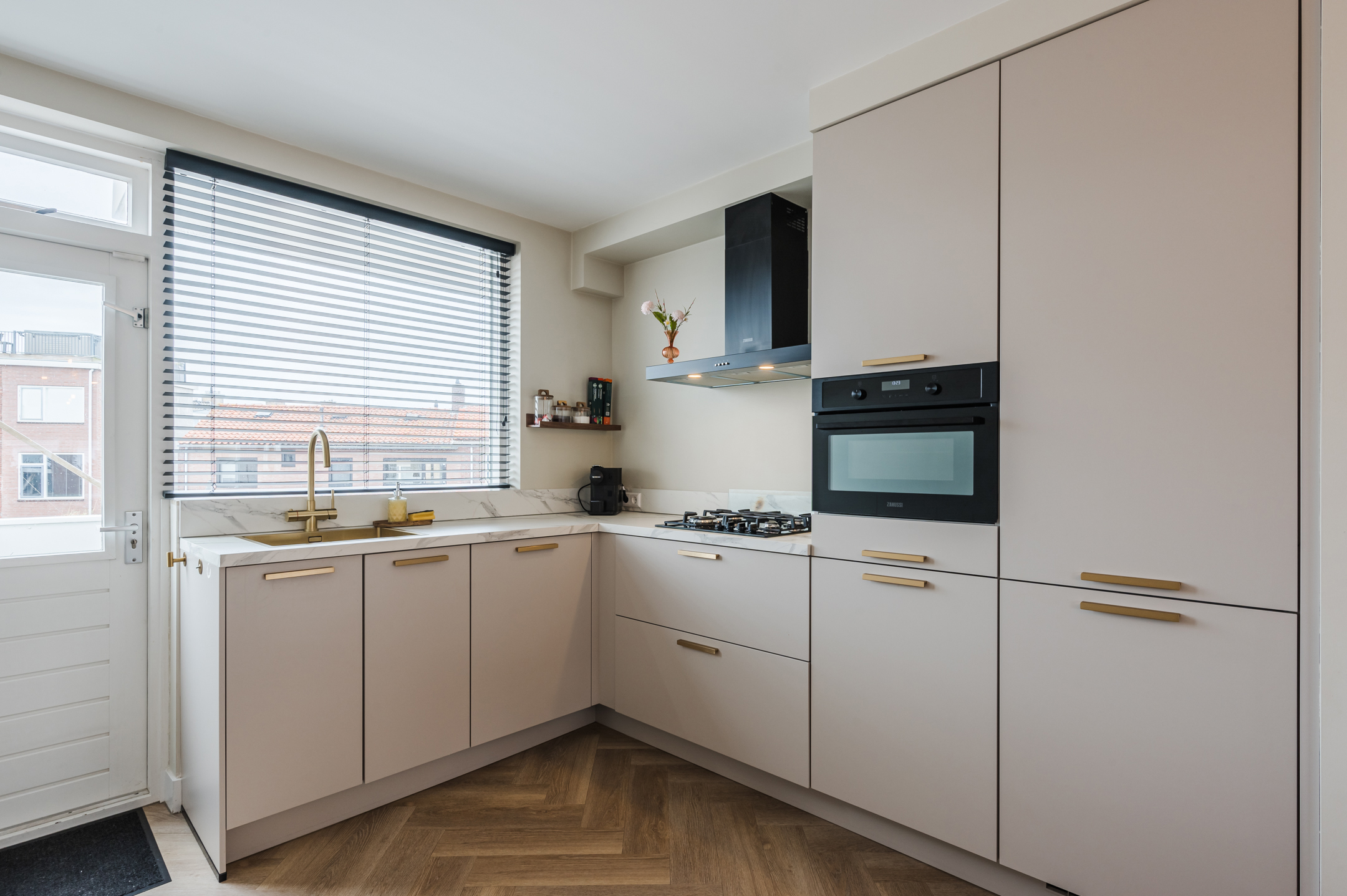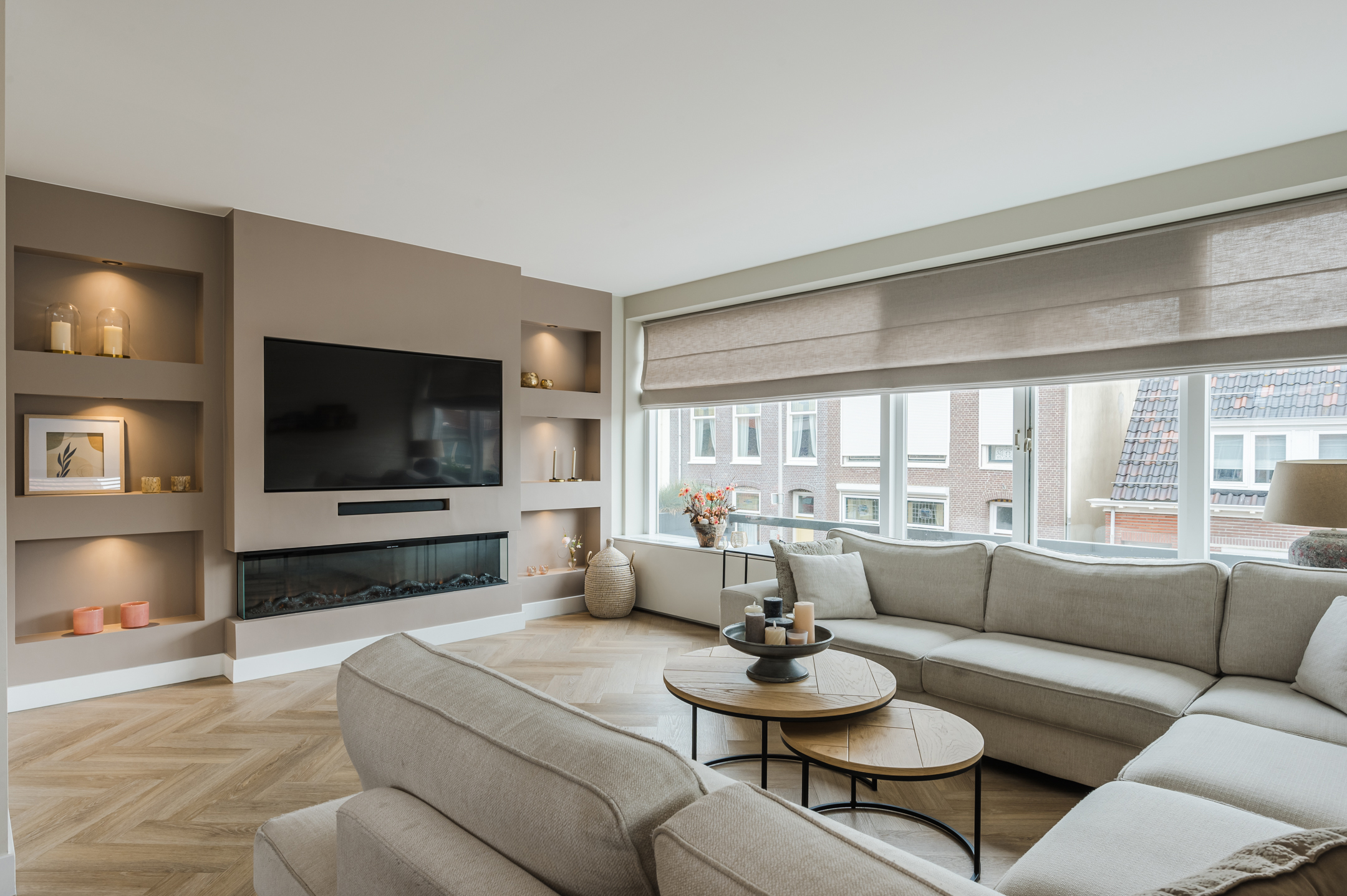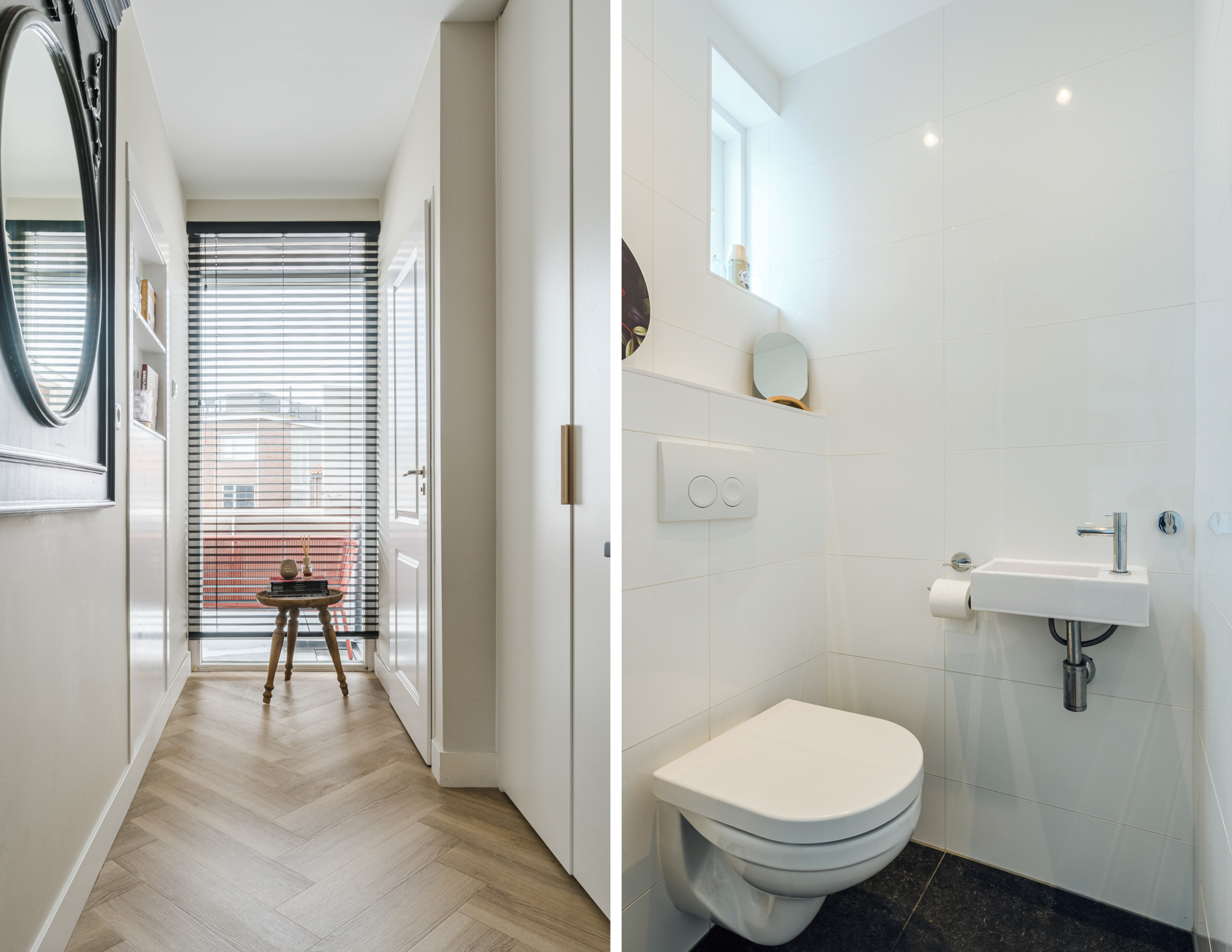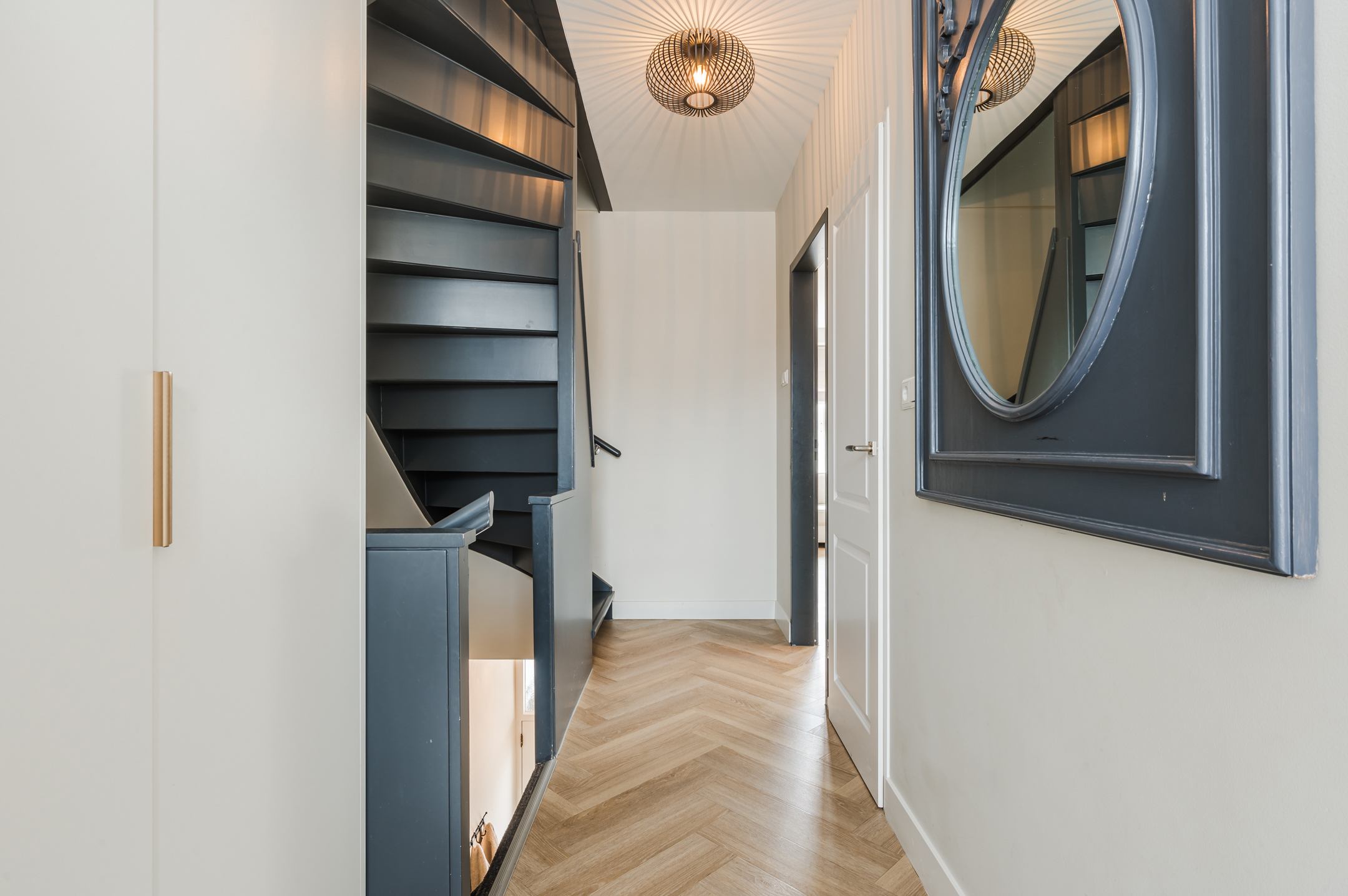 De entree van de woning bevindt zich op de begane grond. Hier treft u ook een hal met meterkast. Via een trap bereikt u de woonverdieping welke is voorzien van een fraaie visgraat pvc-vloer. Via de overloop welke is voorzien van het toilet, betreedt u de ruime L-vormige woonkamer van ca. 29 m² deze is heerlijk licht door de grote raampartij en heeft een direct in het oog springende cinewall met sfeervolle haard. De modern licht uitgevoerde keuken uit 2024 is voorzien van diverse inbouwapparatuur. Vanuit de keuken heeft u toegang tot het zonnige dakterras.