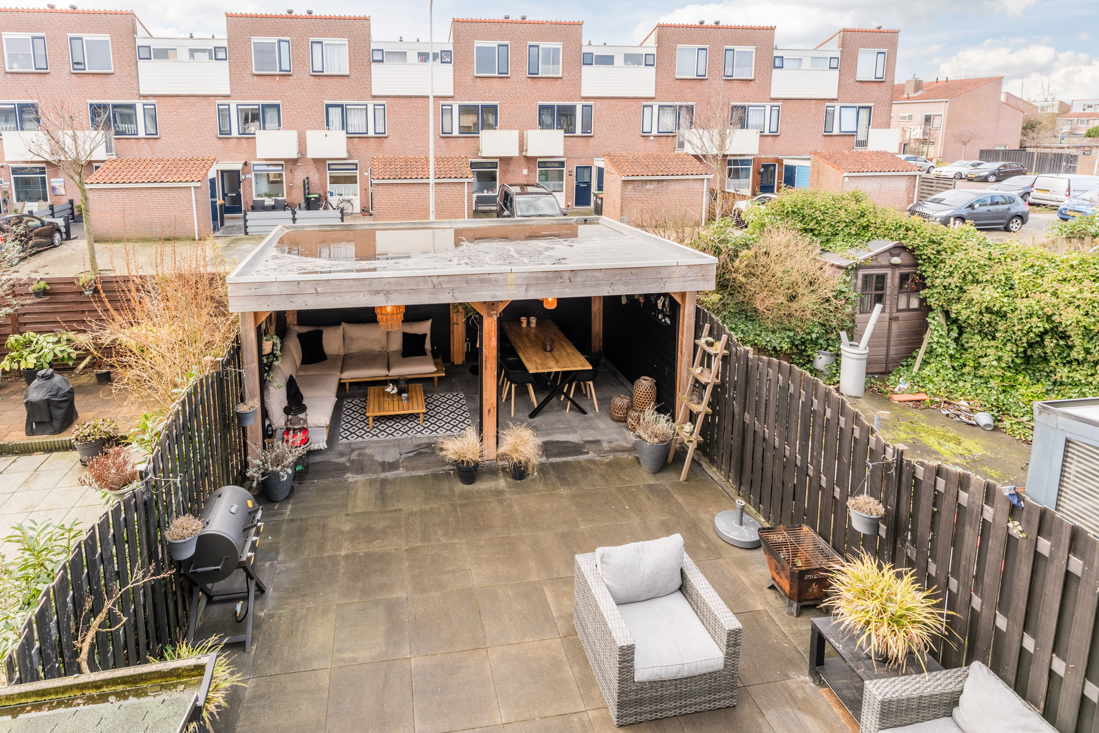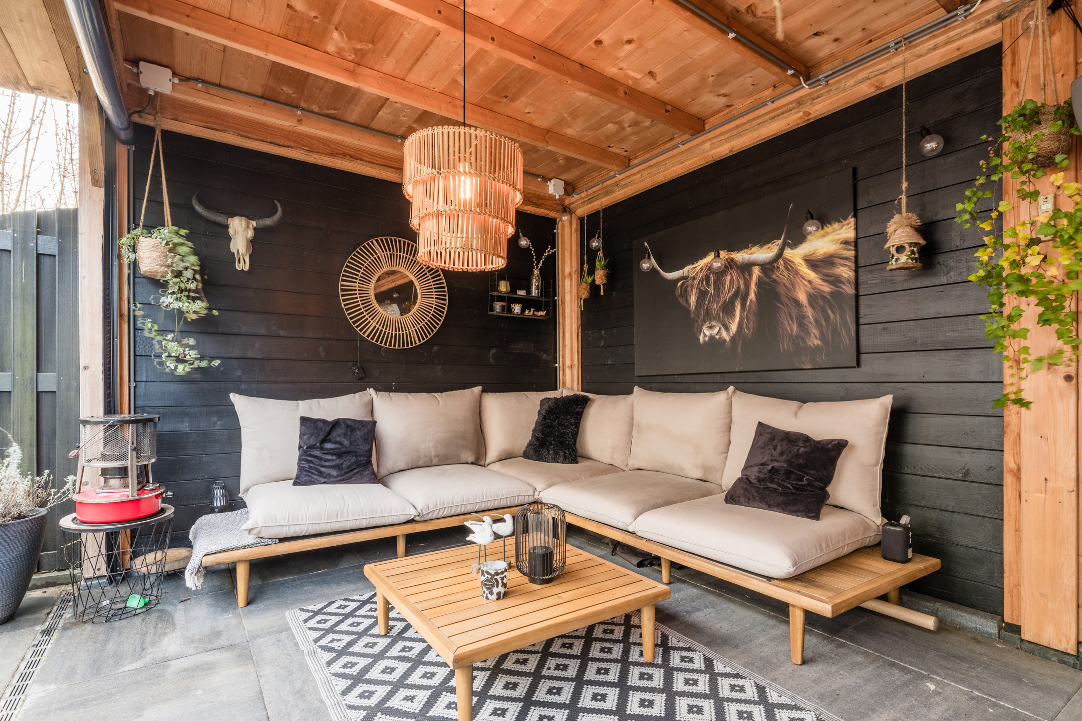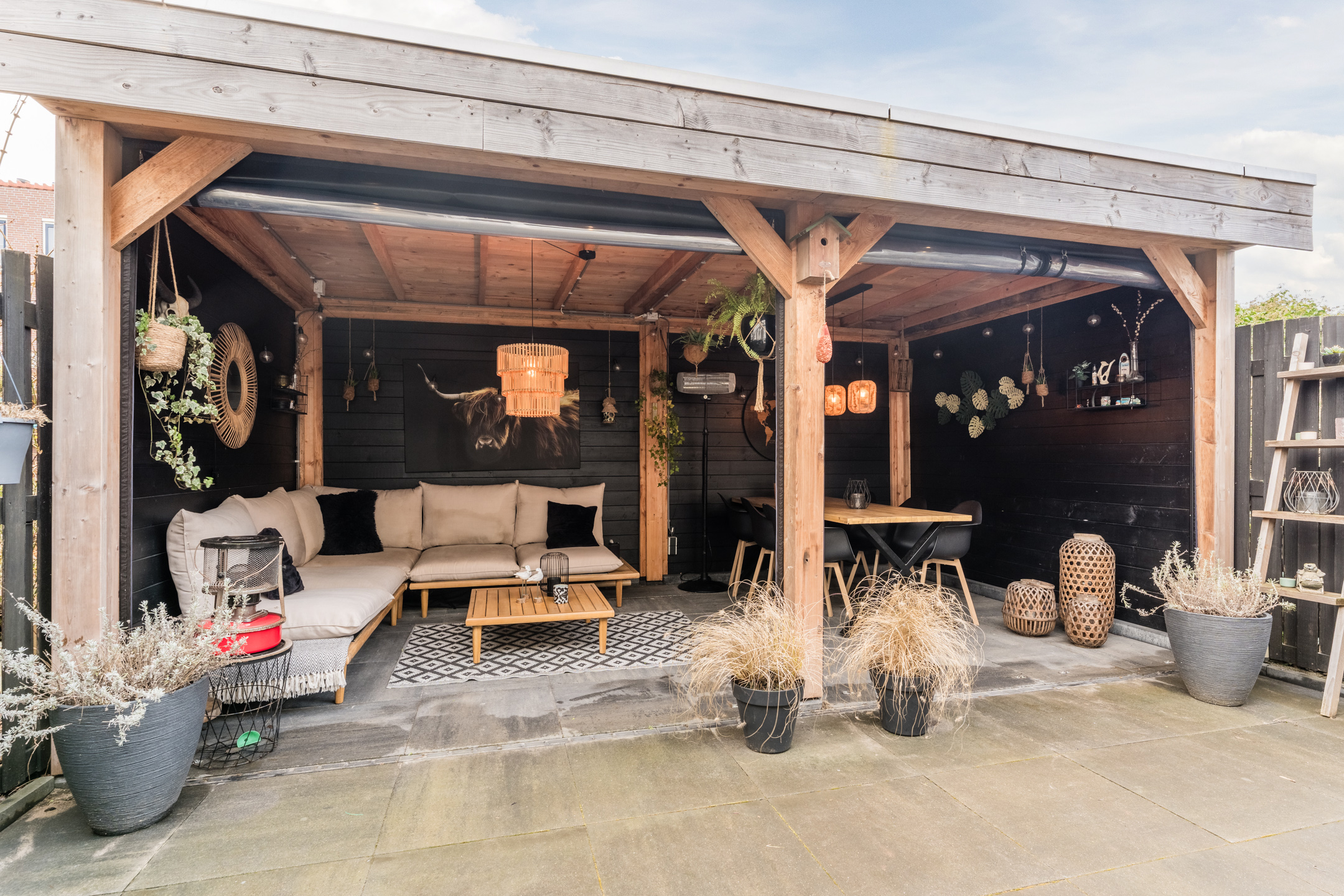Aan de achterzijde bevindt zich een heerlijk ruime en zonnige tuin. In juni 2021 is hier een ruime afsluitbare veranda gerealiseerd voorzien van elektra. Ook is er nog een kleine berging met kraan, waar u onder andere uw kussens kunt opslaan.