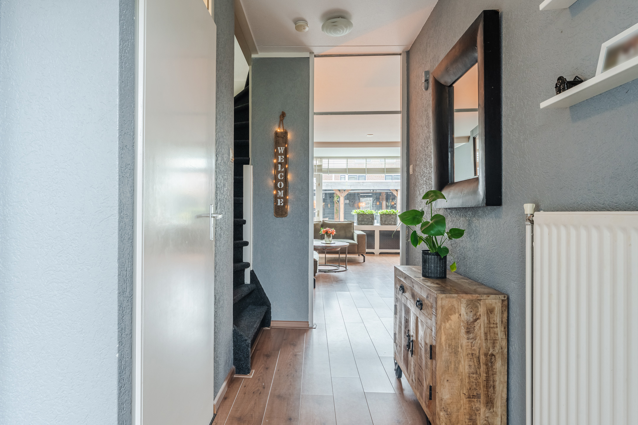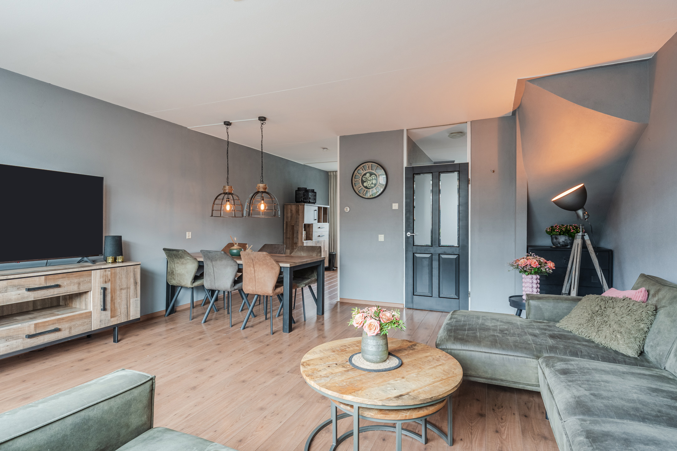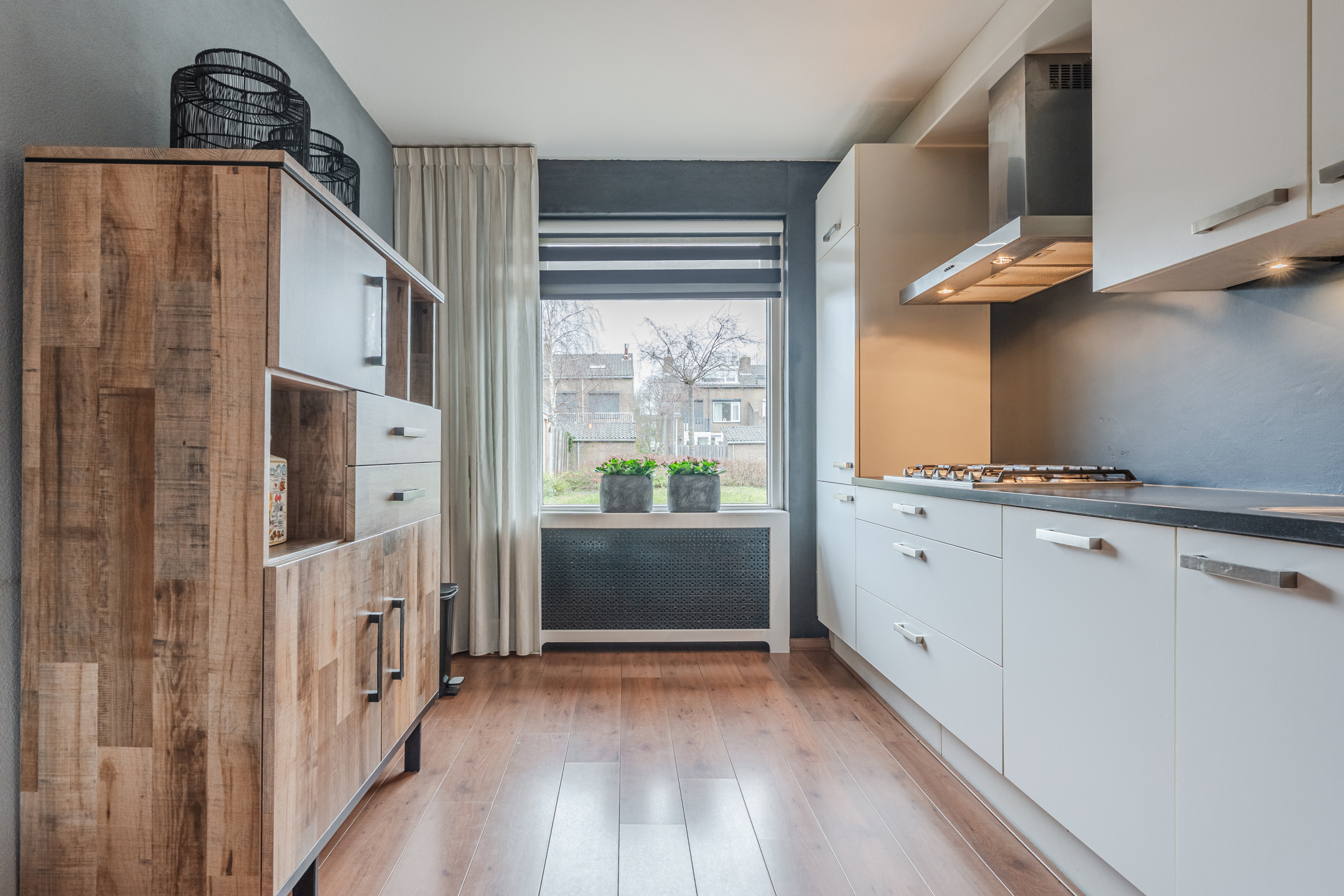 Via de ruime entree heeft u toegang tot het toilet, de meterkast en de trap naar de verdieping. De woonkamer is heerlijk licht vanwege de ligging op het zuiden en de grote raampartij. Aan de voorzijde van de woning bevindt zich de open keuken, voorzien van onder andere een combi-oven, Miele vaatwasmachine, 5-pits gasfornuis, afzuigkap, koelkast en vriezer.