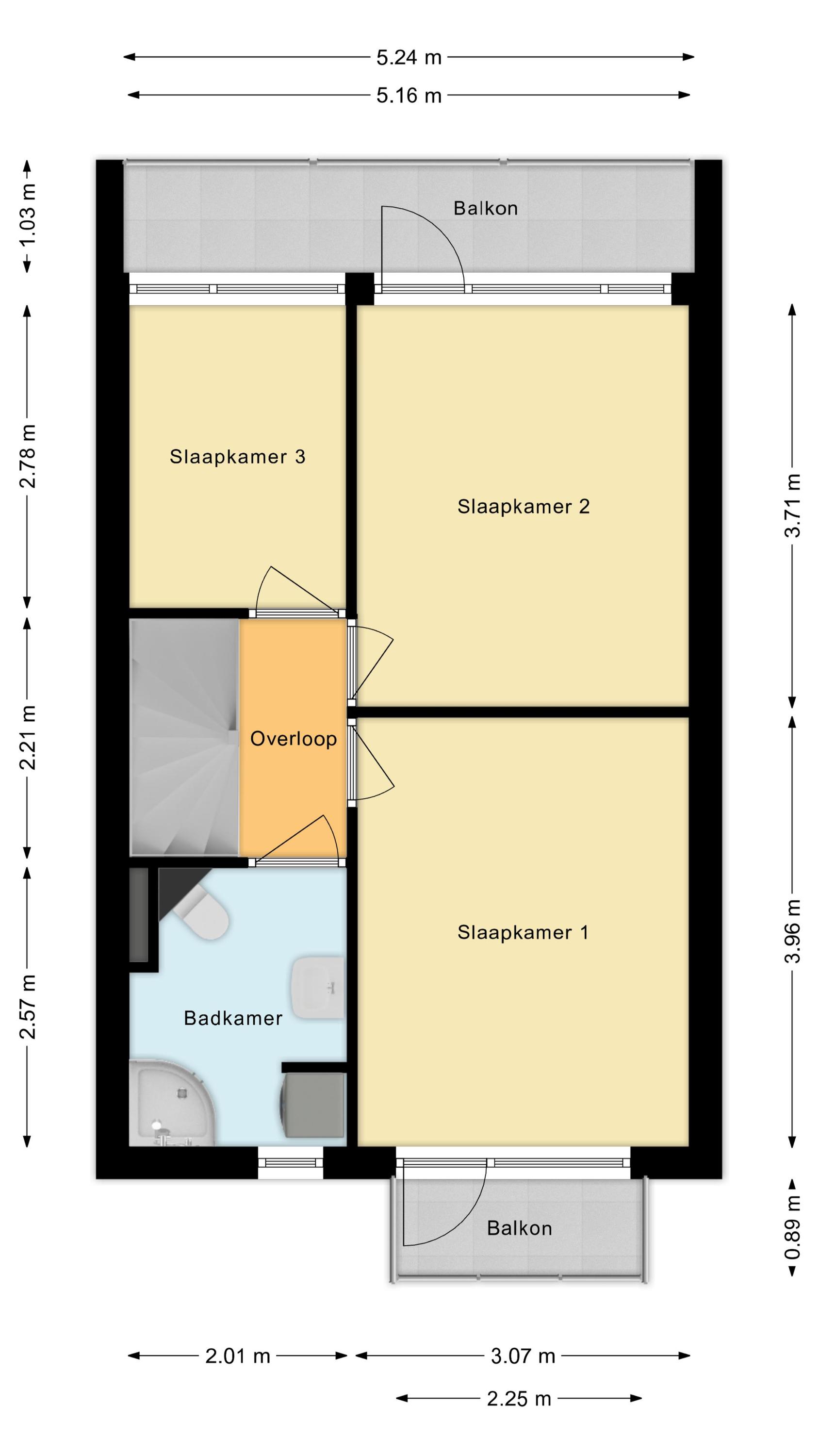 via de vaste trap komt u op de overloop. Hier bevinden zich 3 goed formaat slaapkamers, waarvan 2 toegang hebben tot een eigen balkon. Verder is er nog een badkamer met toilet, wastafel, douche en was/droger opstelling.