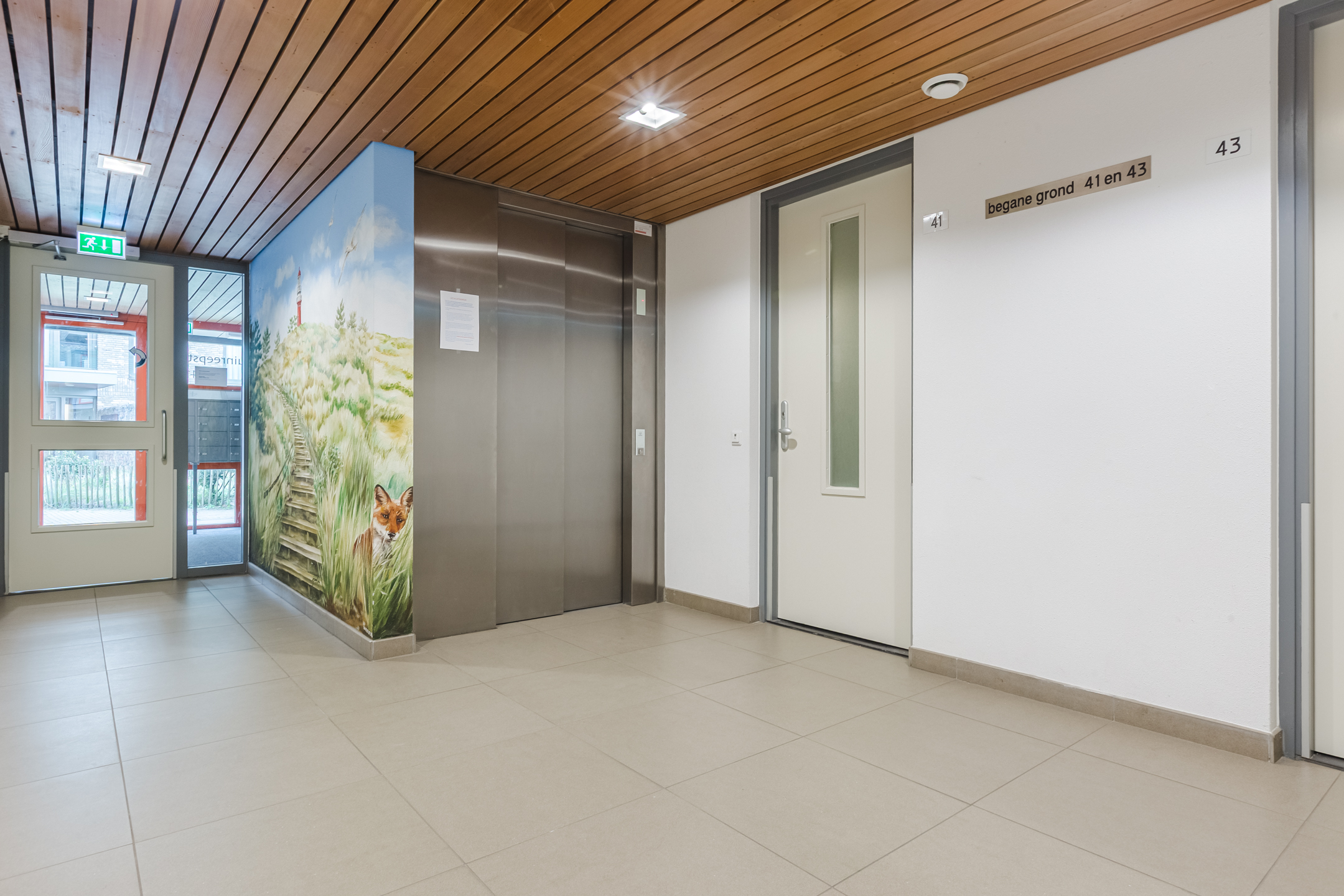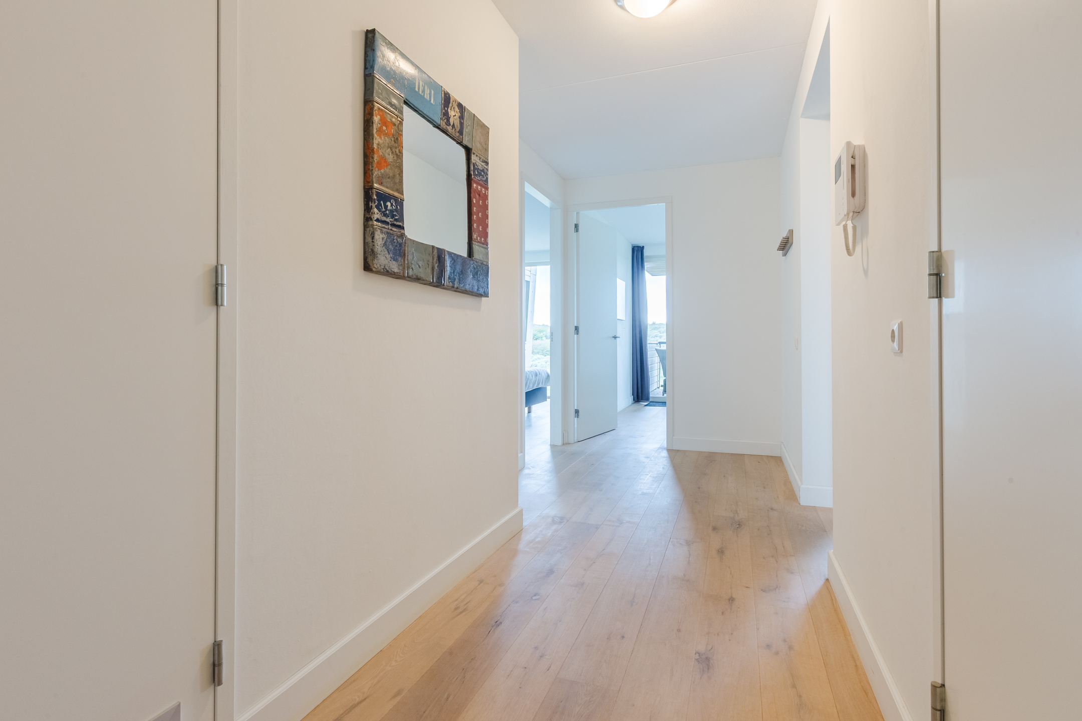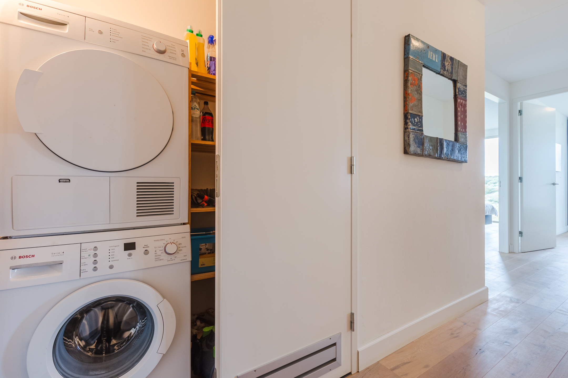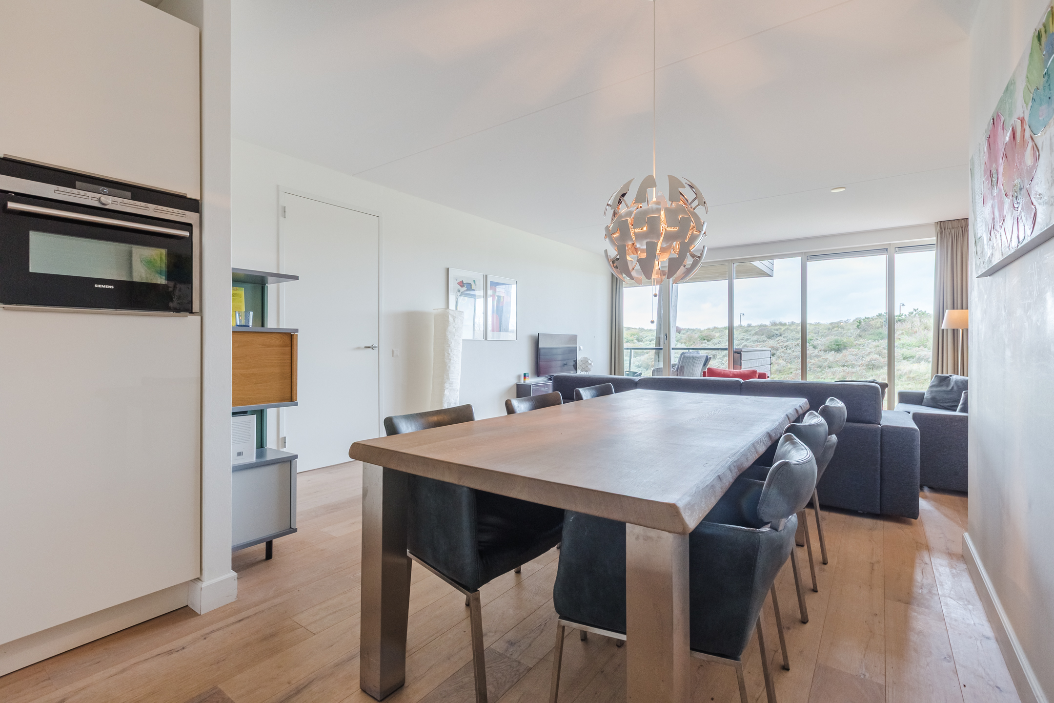 Via de afgesloten entree met bellentableau heeft u de mogelijkheid om via de lift of trap naar de eerste woonlaag te gaan. Een ruime hal biedt toegang tot alle vertrekken. De woonkamer, gelegen op het westen, heeft een grote raampartij die zorgt voor veel licht en een prachtig uitzicht over de duinen. De lichte open keuken in L-opstelling is voorzien van Siemens inbouwapparatuur. Verder beschikt het appartement over twee ruime slaapkamers, een badkamer met ligbad, dubbele wastafel, toilet en douche. In de hal bevindt zich een tweede toilet en een praktische bergruimte met plaats voor de wasmachine en droger. Het royale balkon, eveneens op het westen gelegen, is bereikbaar vanuit zowel de woonkamer als de slaapkamer, zodat u optimaal kunt genieten van de zon en het buitenleven.