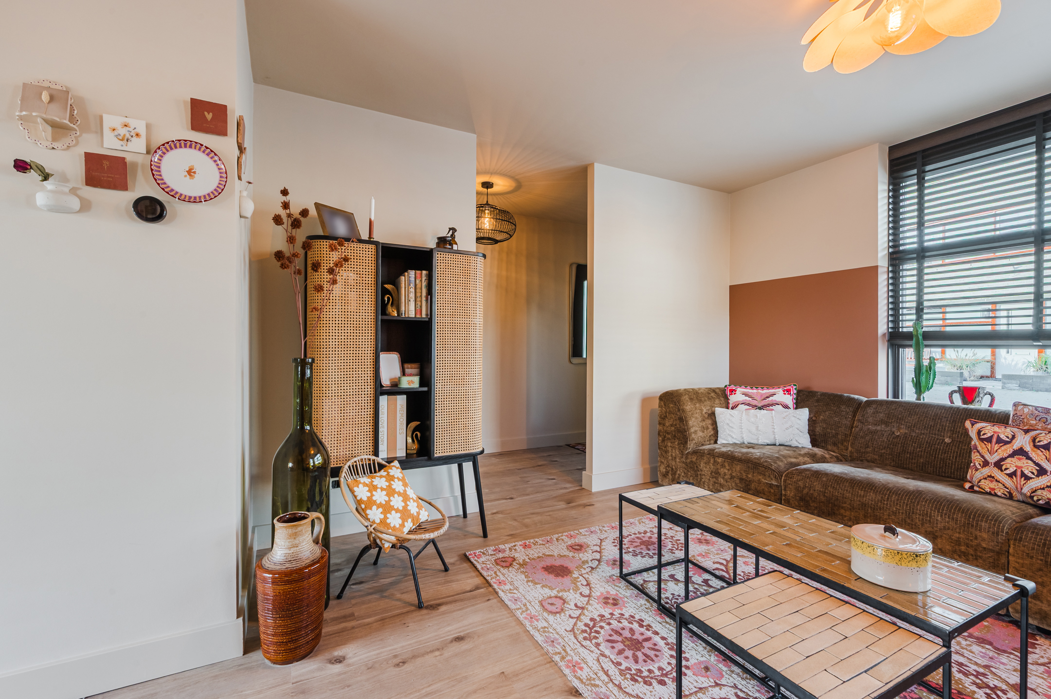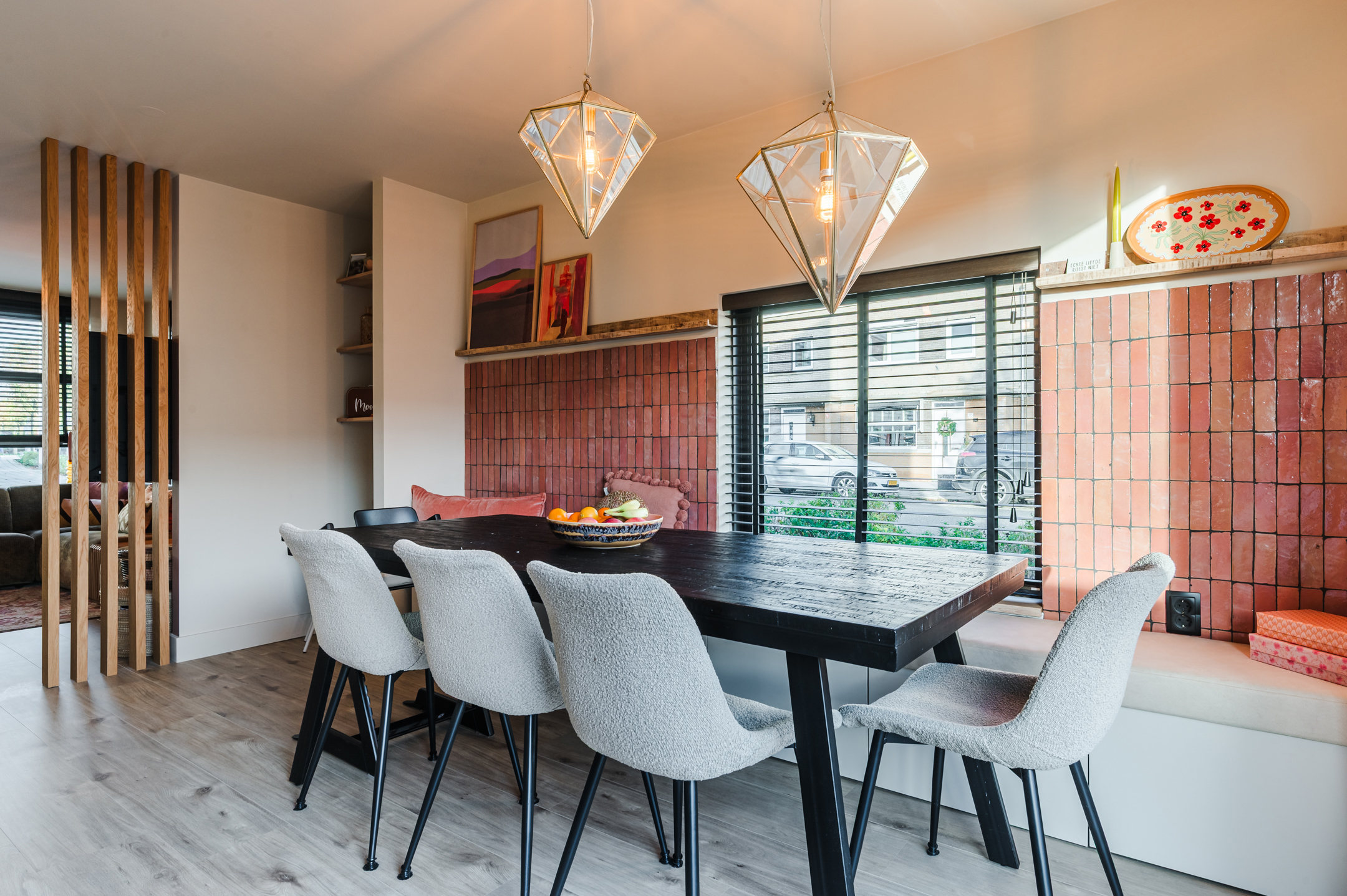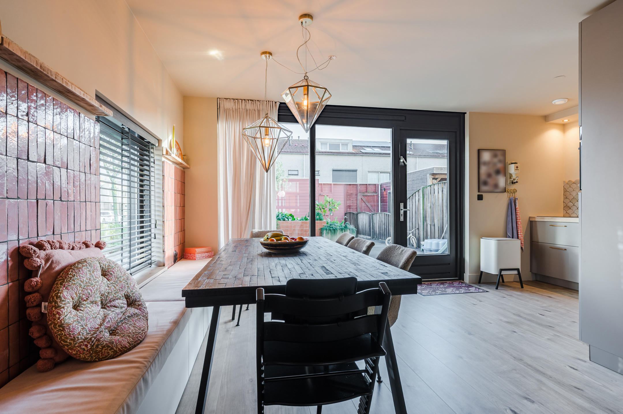 Via de entree komt u in de hal met de meterkast en de vaste trap naar de verdieping. Ook is er toegang tot de sfeervol ingerichte woonkamer met roomdivider. Hierdoor is er een leefkeuken gecreëerd met een vaste wandbank waar u tevens spullen in kwijt kunt.