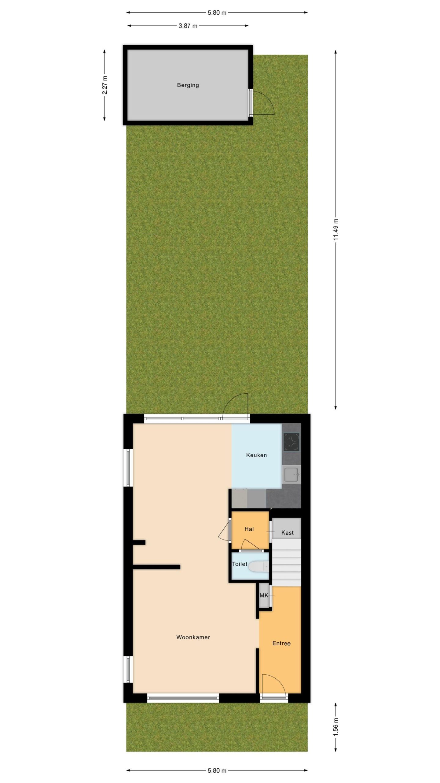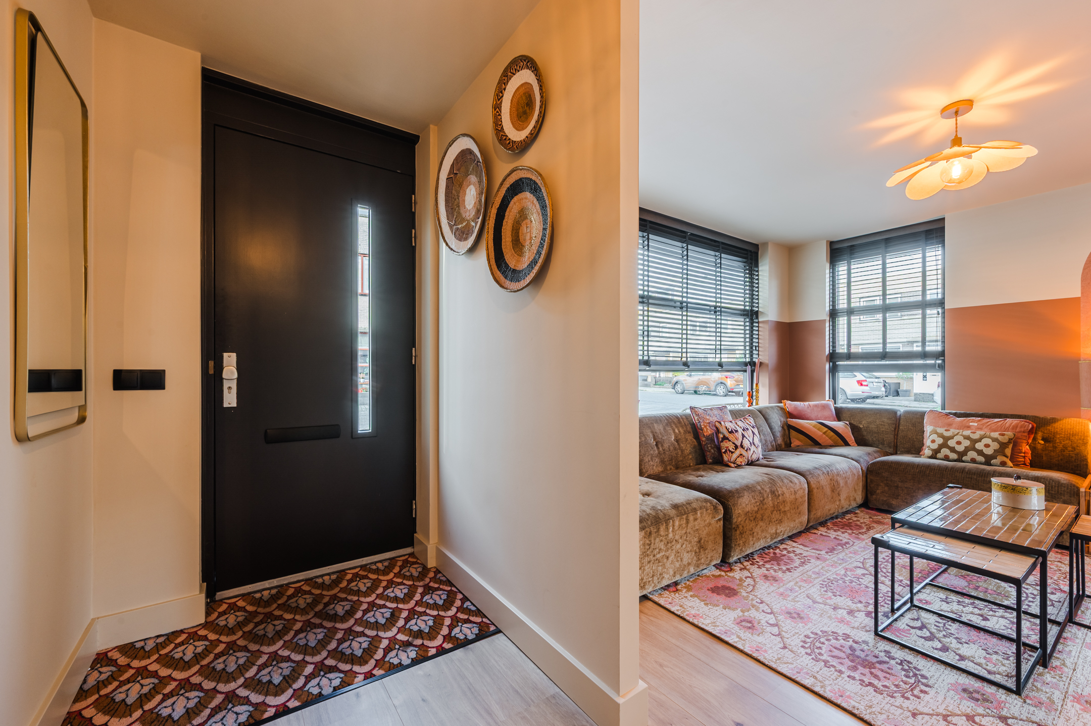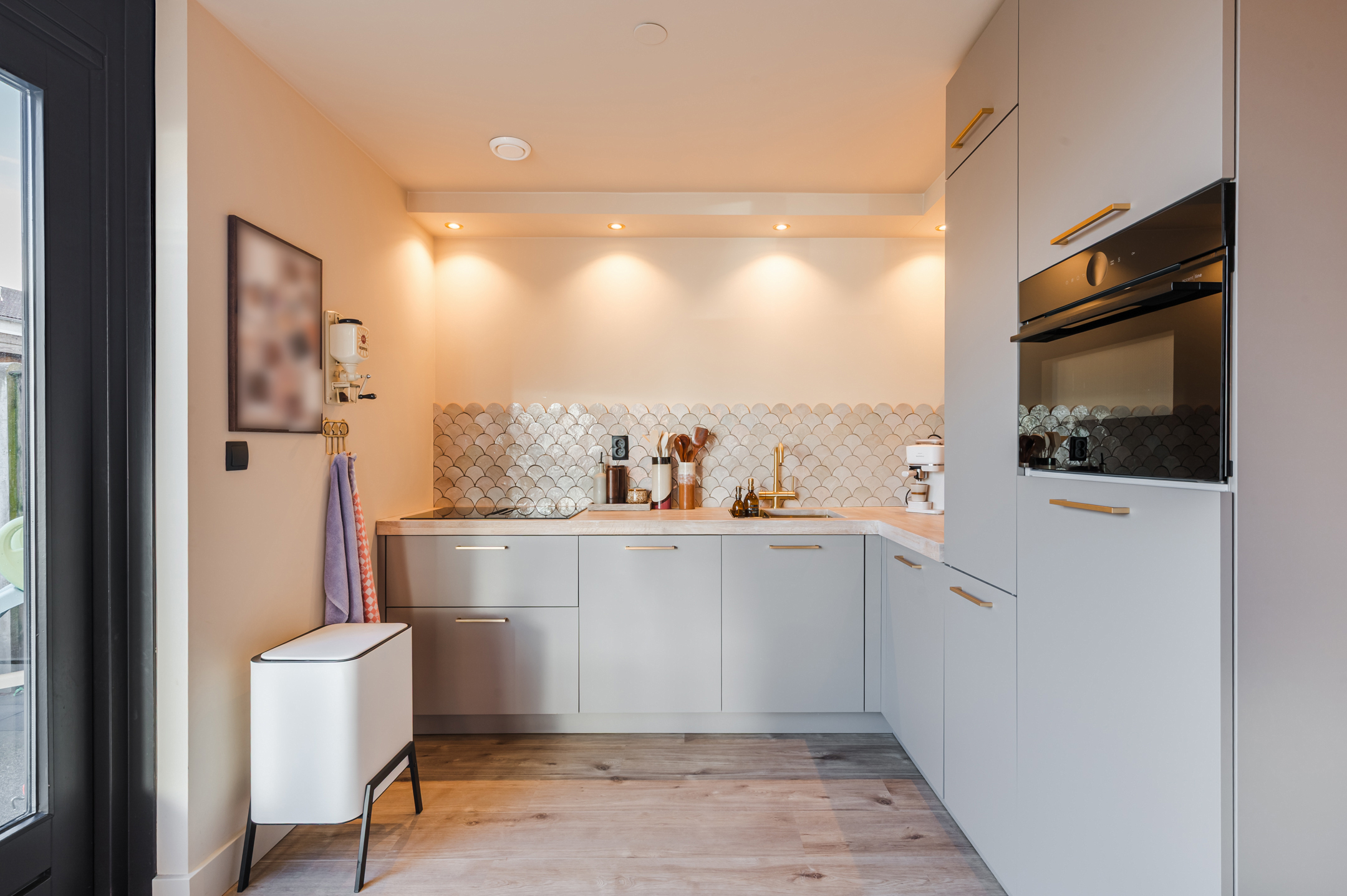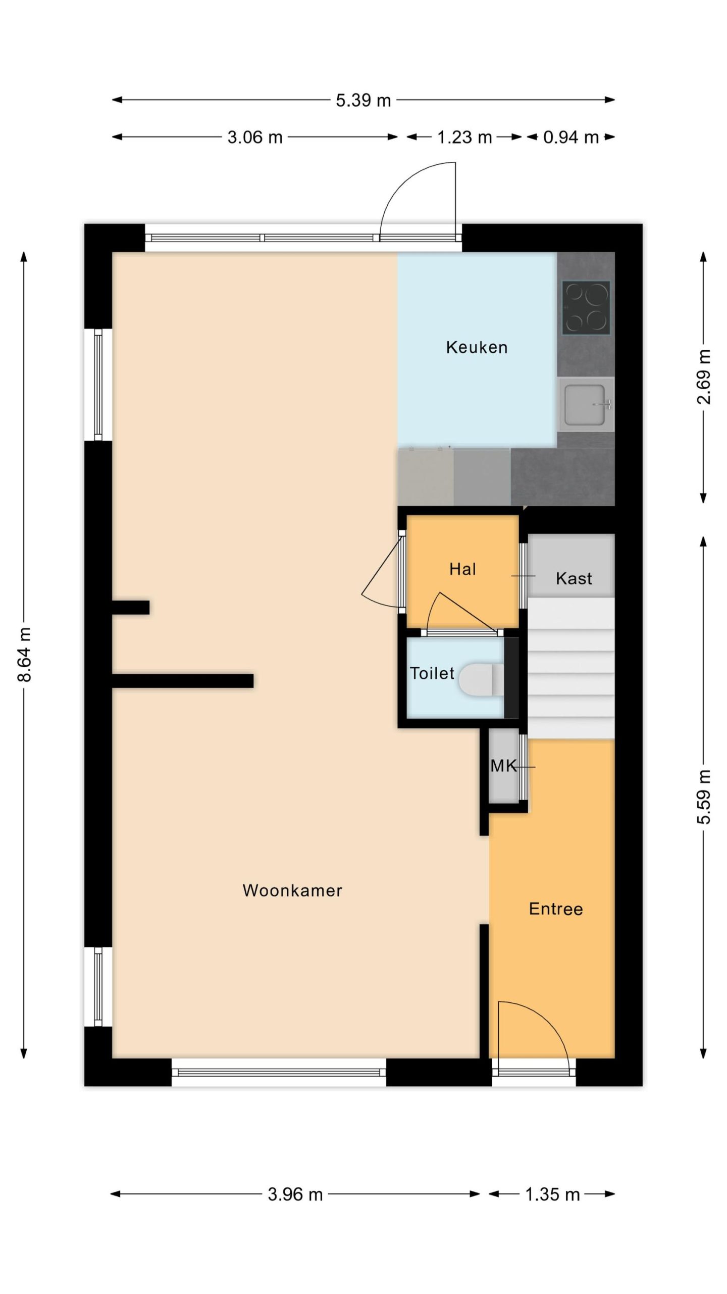 Via de entree komt u in de hal met de meterkast en de vaste trap naar de verdieping. Ook is er toegang tot de sfeervol ingerichte woonkamer met roomdivider. Hierdoor is er een leefkeuken gecreëerd met een vaste wandbank waar u tevens spullen in kwijt kunt.