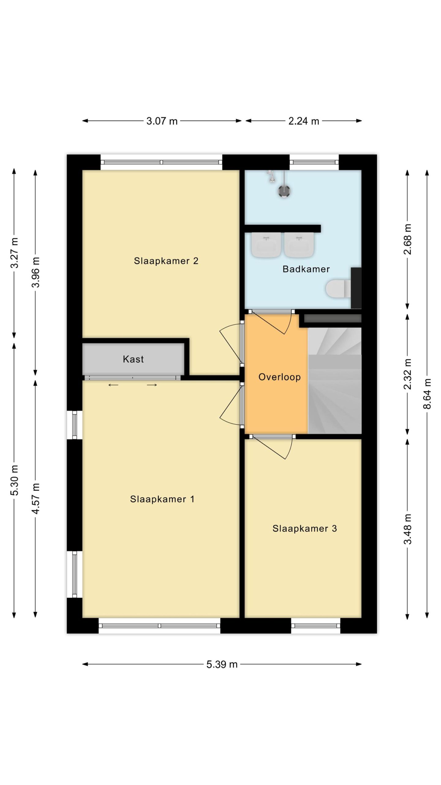 Via de overloop komt u op de eerste verdieping waar u toegang heeft tot 3 goed formaat slaapkamers. De badkamer is voorzien van een mooi badkamermeubel met dubbele wasbak, toilet en inloopdouche.