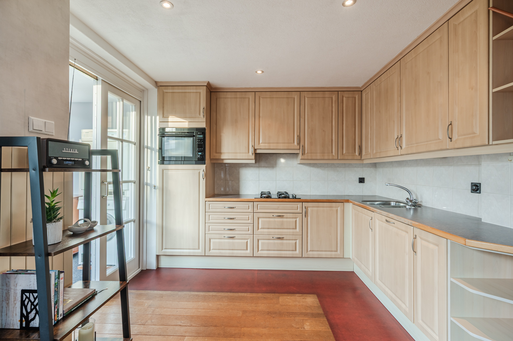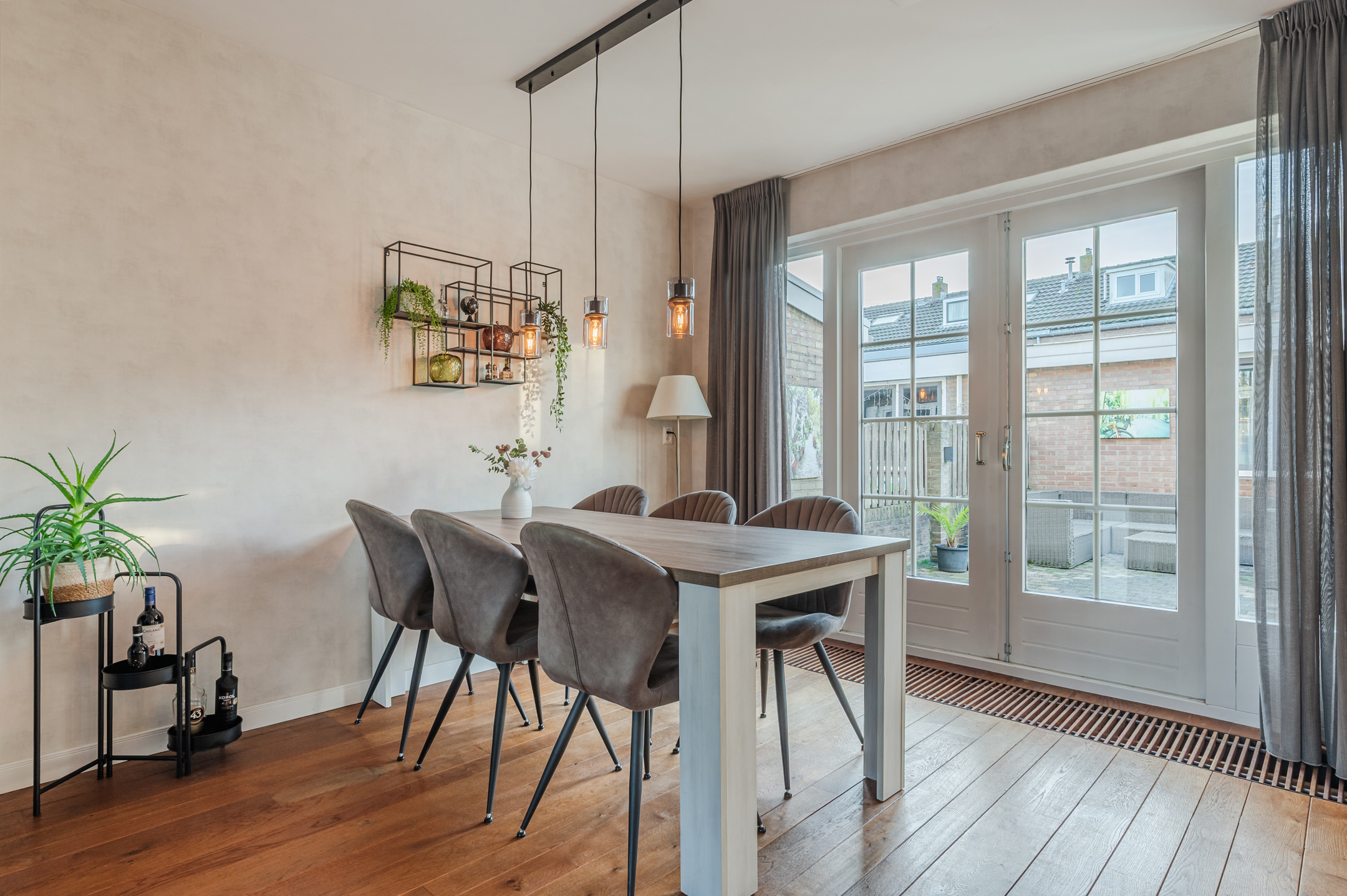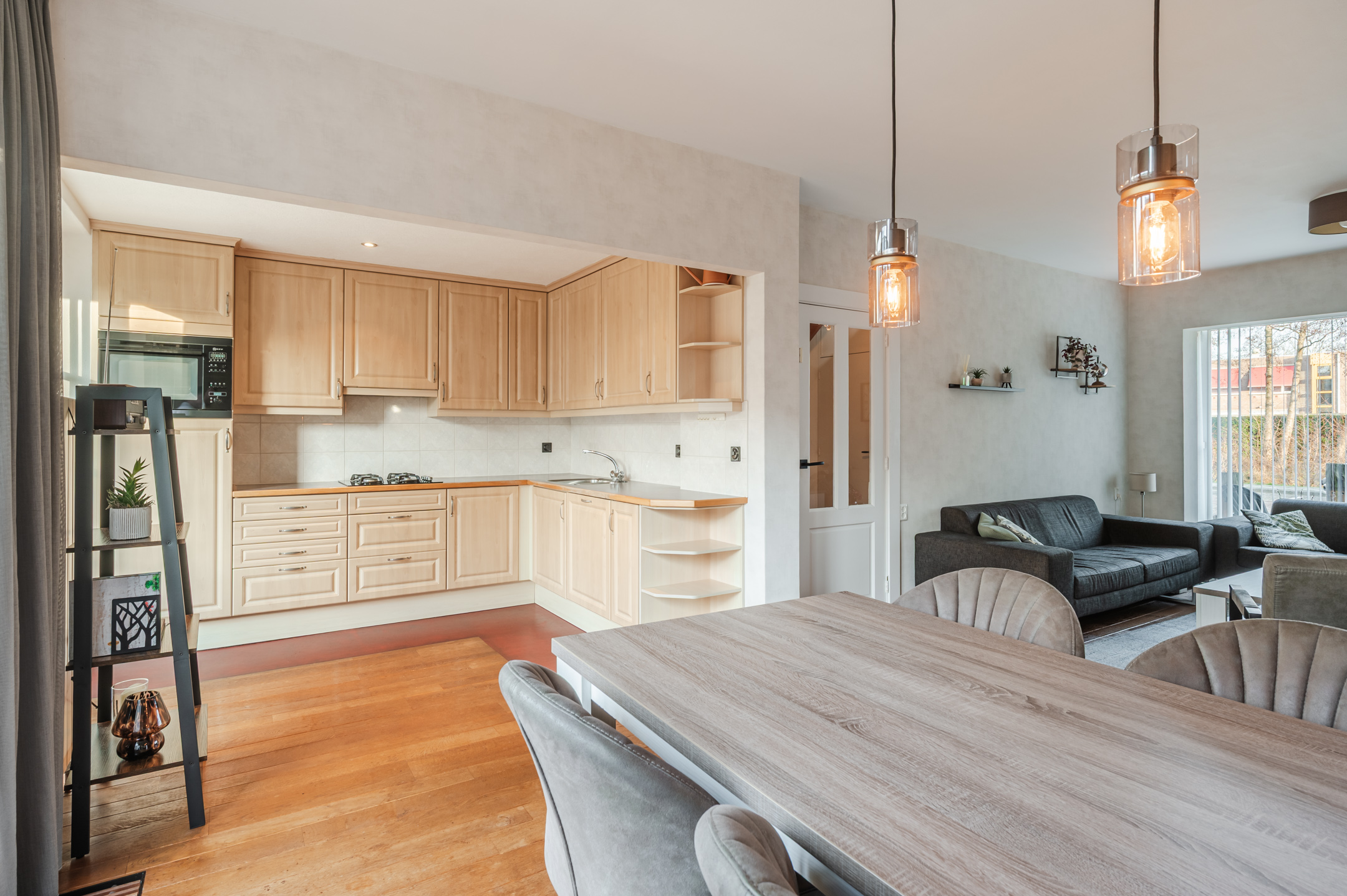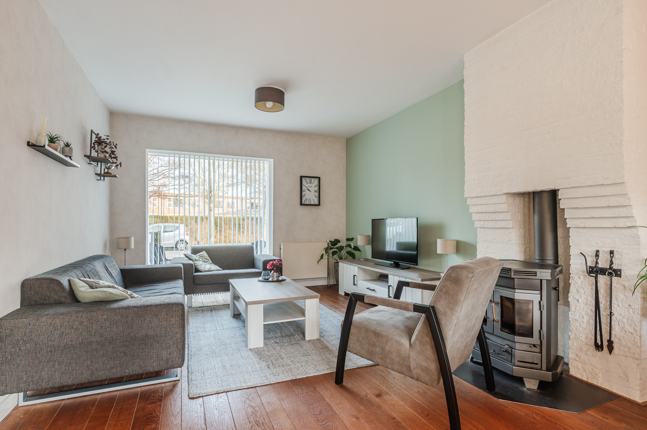 Via de voortuin komt u binnen in de ruime entree met toilet en garderobe. De lichte doorzonwoonkamer geeft direct een warm en huiselijk gevoel, versterkt door de fraaie houten vloer en de sfeervolle houtkachel. De openslaande deuren aan de achterzijde maken de tuin tot een verlengstuk van de woonkamer. In de zomermaanden zorgt het zonnescherm voor aangename schaduw. De open keuken is voorzien van diverse inbouwapparatuur en staat in verbinding met de praktische bijkeuken, waar aansluitingen voor wasmachine en droger aanwezig zijn.