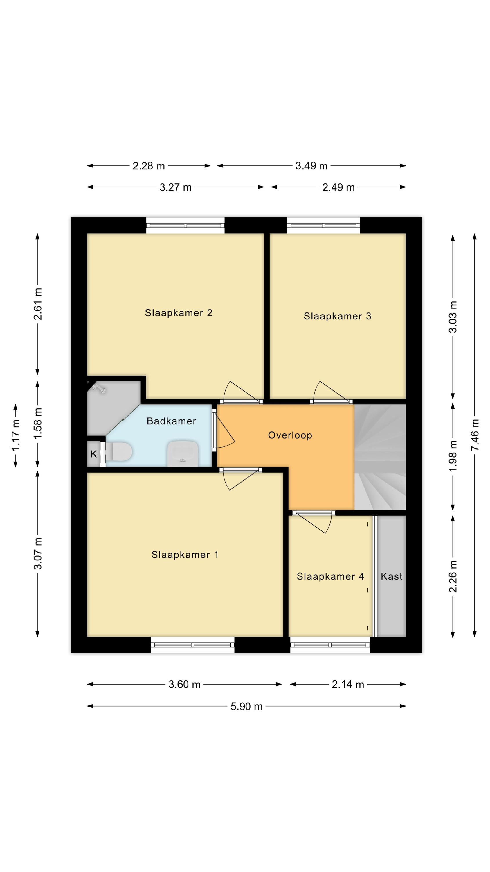 De verdieping is voorzien van een dakkapel aan de voor- en achterzijde van de woning