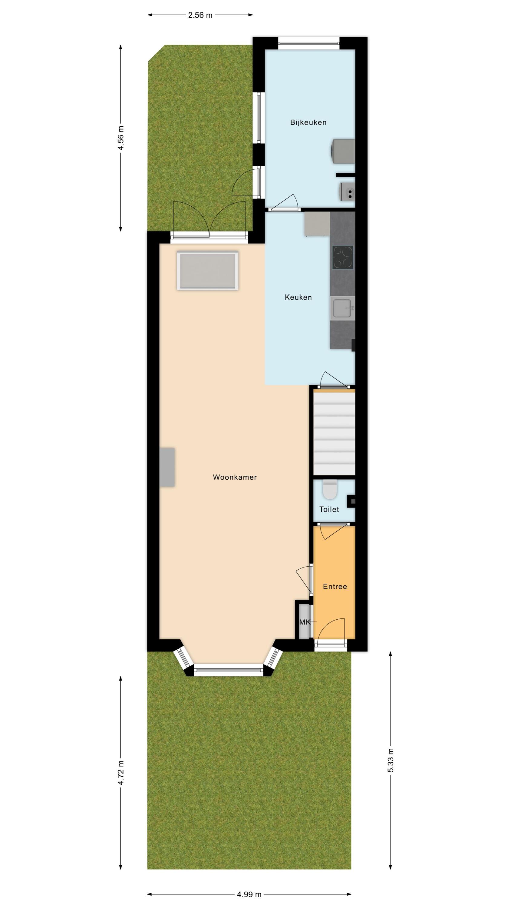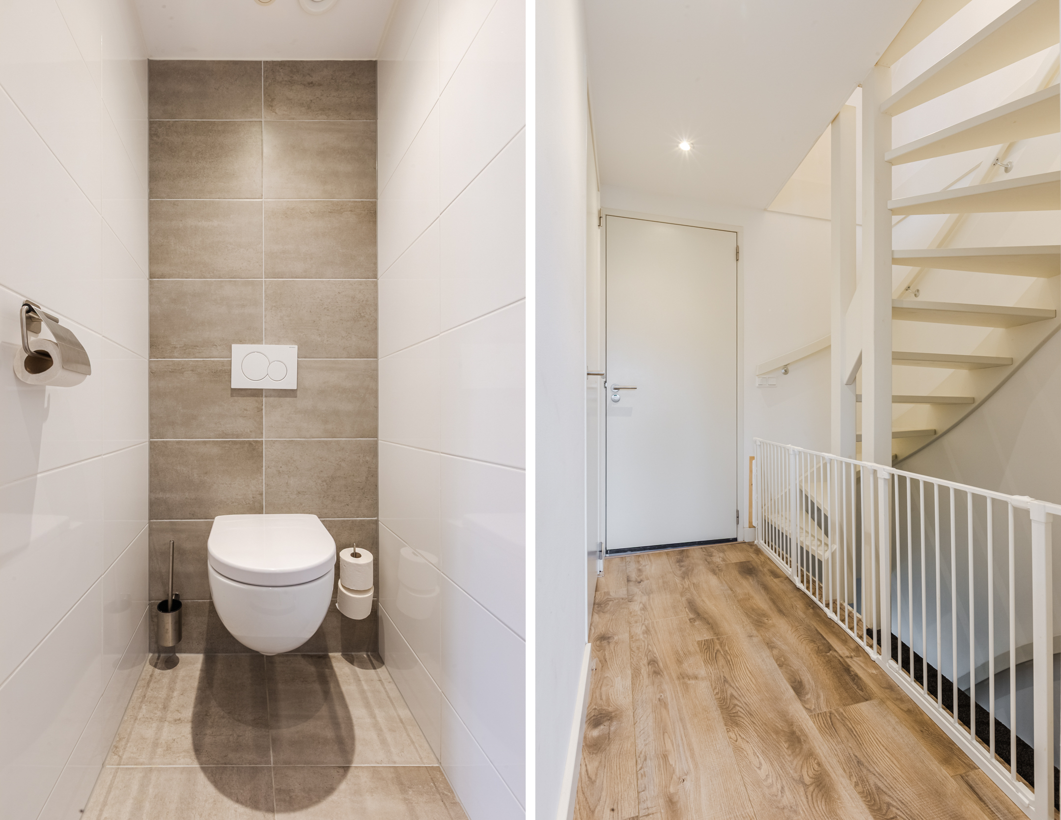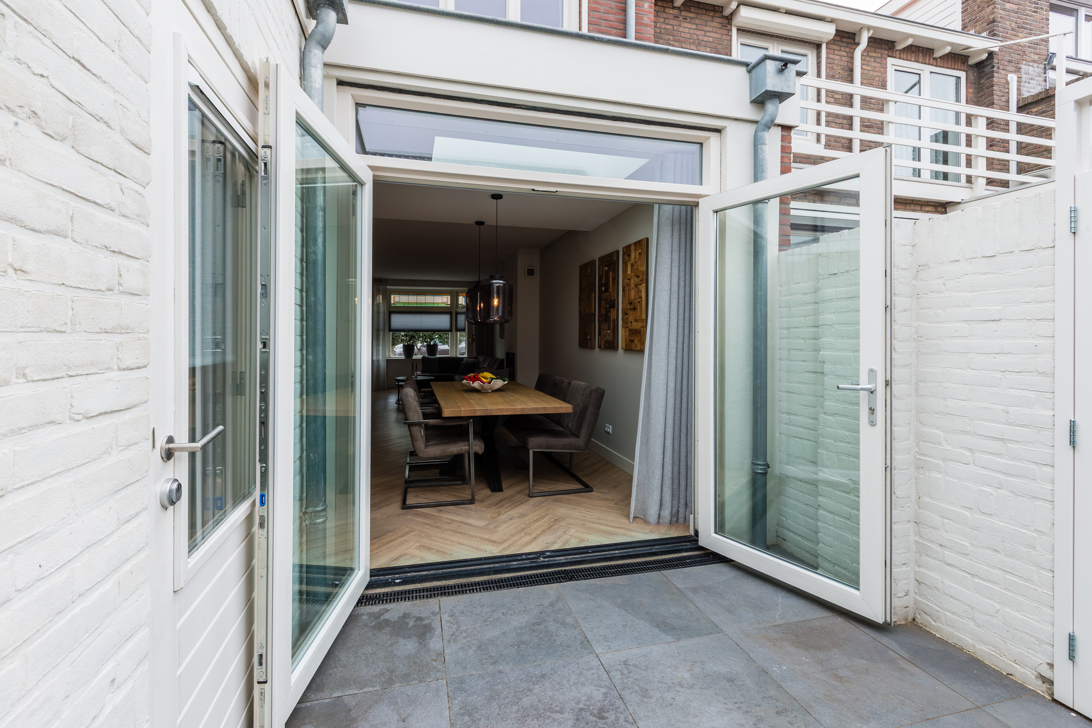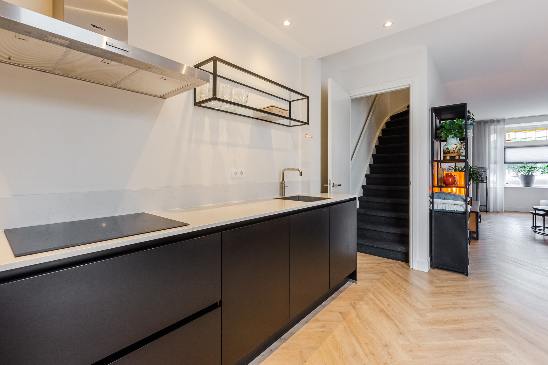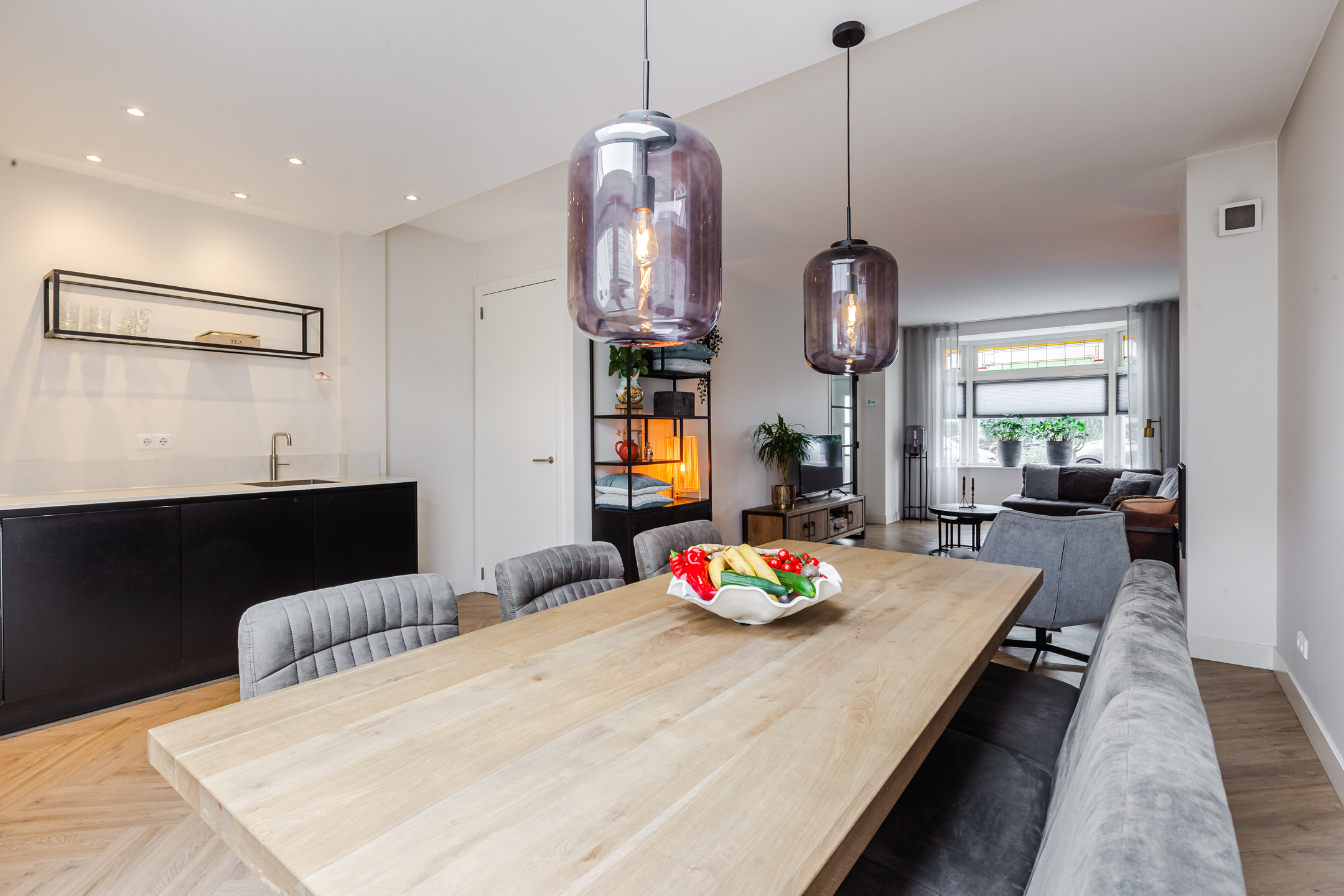Begane grond: via de voortuin bereikt u de entree met toegang tot het toilet en de woonkamer. De diepe woonkamer is prachtig verbouwd en aan de achterzijde van de woning bevindt zich een uitbouw met lichtstraat. Hierdoor heeft de open keuken veel lichtinval. De keuken is voorzien van luxe apparatuur, waaronder een combi-oven, afzuigkap, koelkast, Quooker en een vaatwasser.
