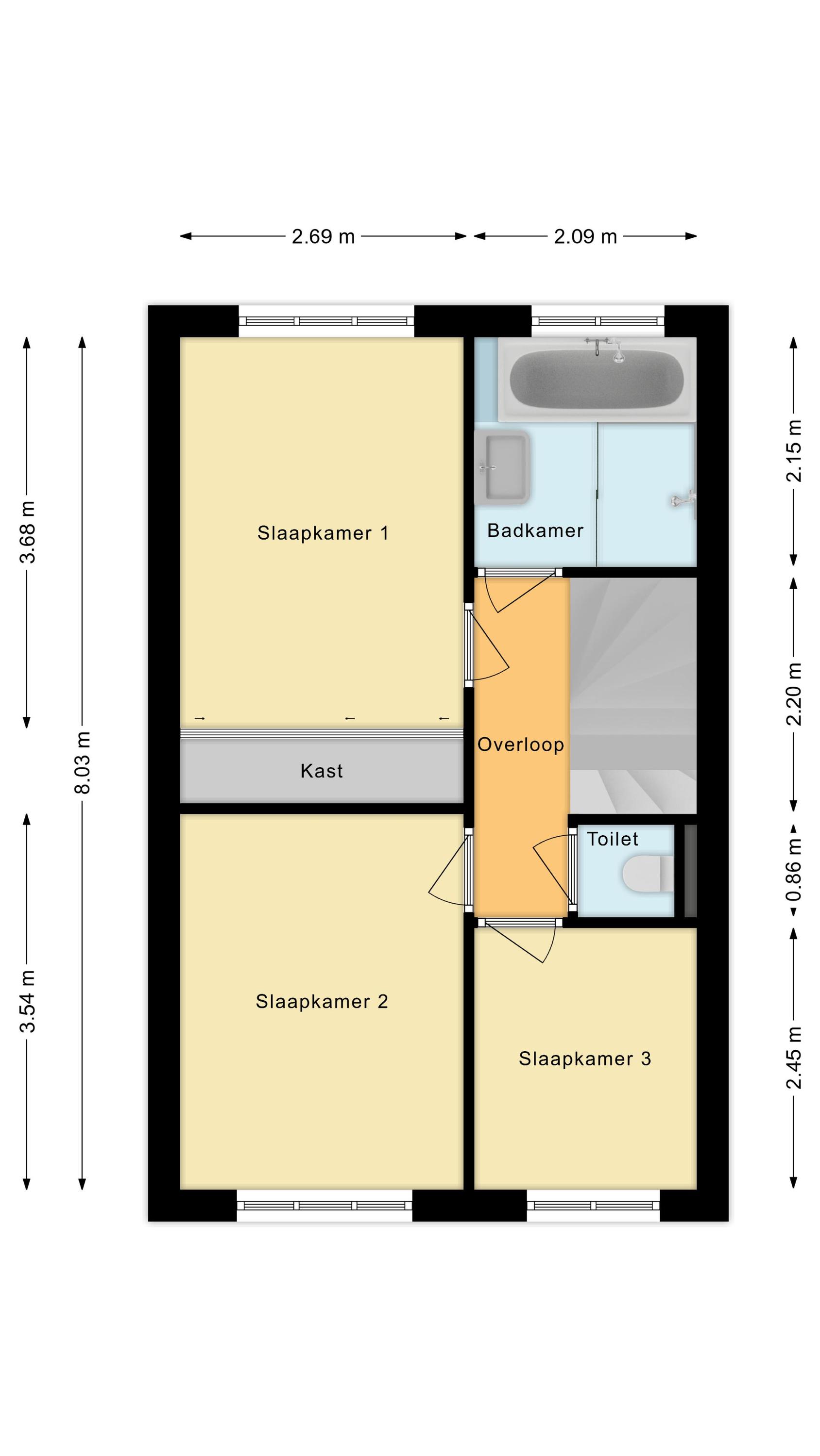 Eerste verdieping: Via de vaste trap komt u op de overloop. hiervandaan zijn alle ruimtes bereikbaar. Er zijn drie goed formaat slaapkamers, waarvan één voorzien van een inbouwkast. De badkamer bevindt zich aan de achterzijde van de woning en is voorzien van een heerlijk ligbad, een wastafel en een fijne inloopdouche. Tevens is er een separaat toilet op de verdieping.