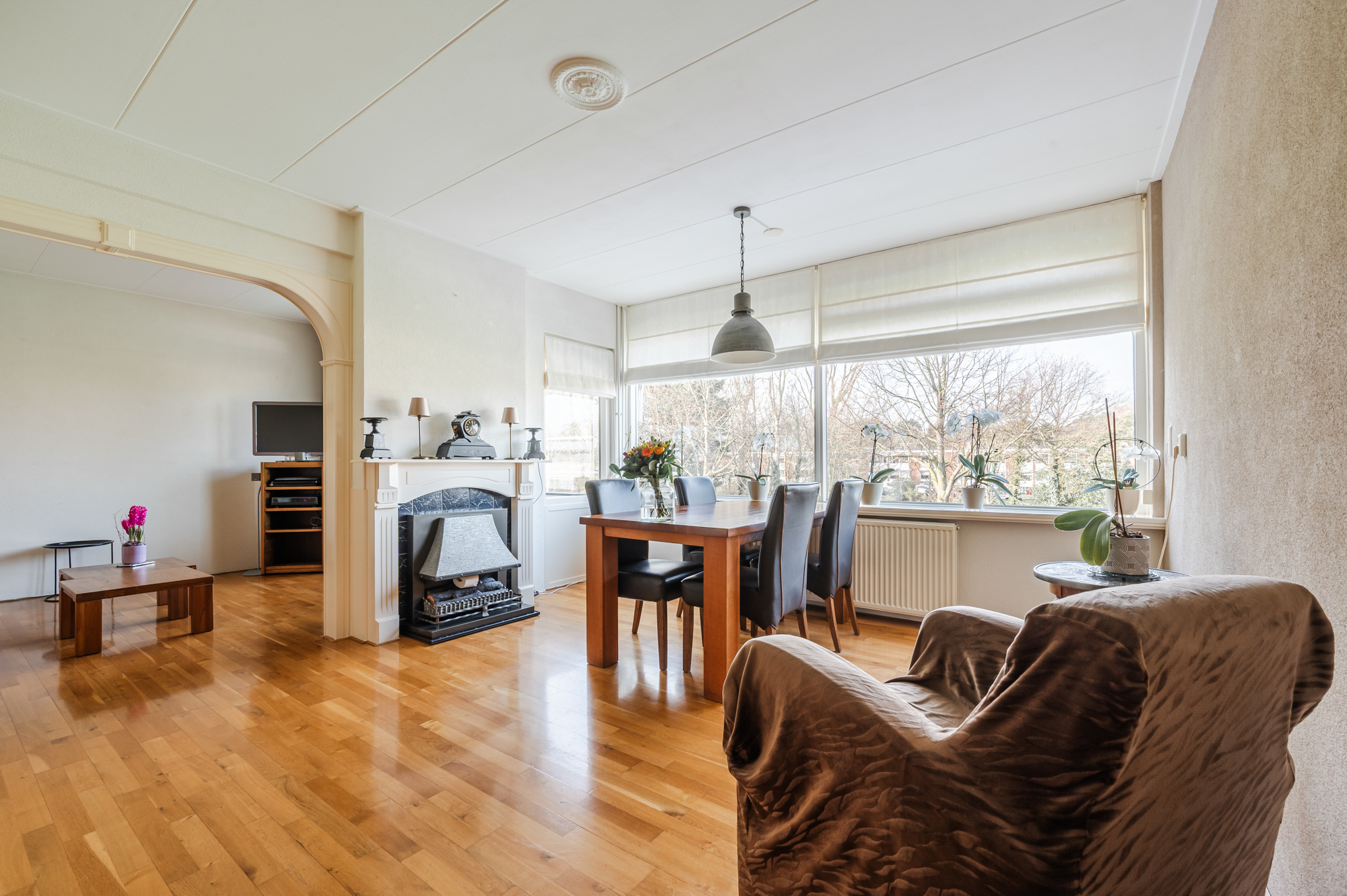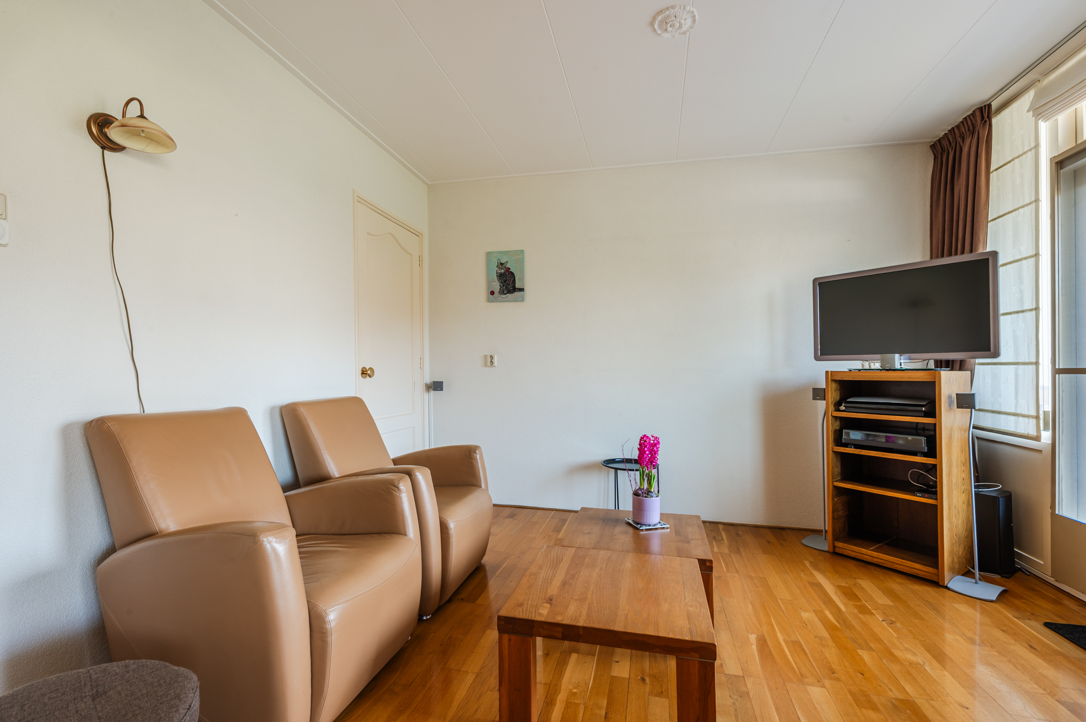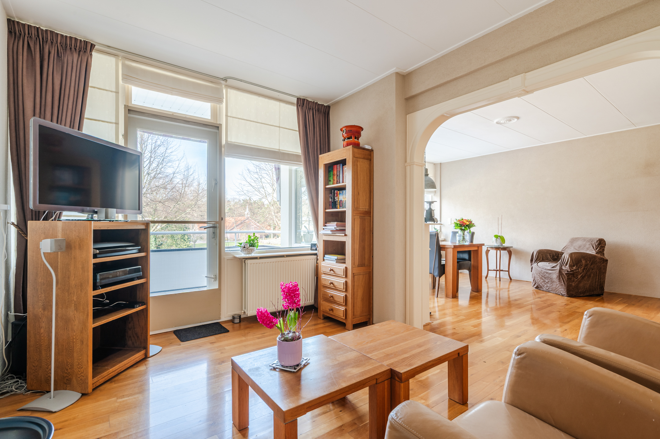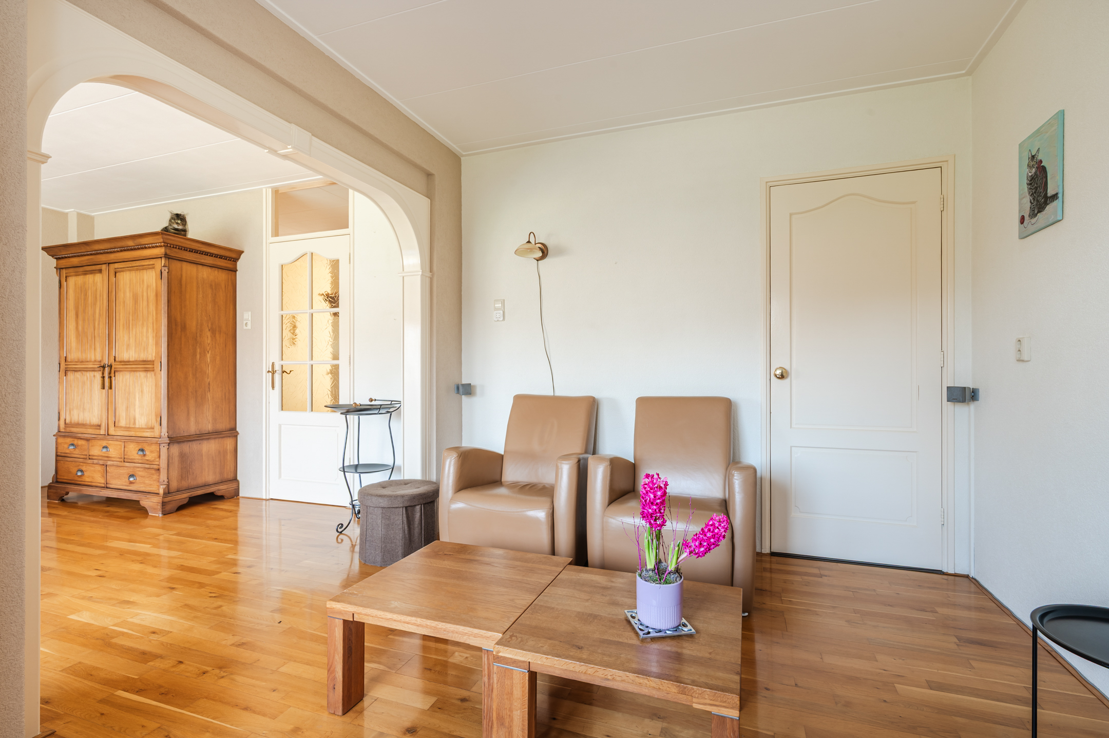 De royale woonkamer is gelegen aan de voorzijde van de woning en biedt een vrij uitzicht richting het park. Ook aan deze zijde is een balkon aanwezig. Tevens beschikt de woonkamer over een vaste kast met toegang tot de ruime vliering.