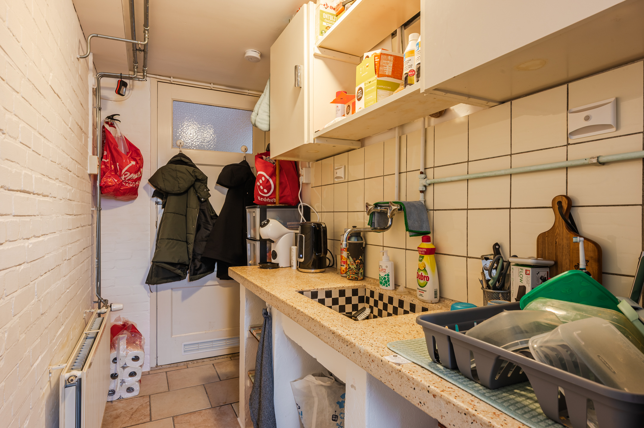 Toegang tot het souterrain, waar zich aan de voorzijde van het gebouw een kamer bevindt. Aan de achterzijde bevinden zich een ruime garage en een naastgelegen extra ruimte met aansluitingen voor wasmachine en droger. Het souterrain en de garage zijn van elkaar gescheiden door middel van een hal.