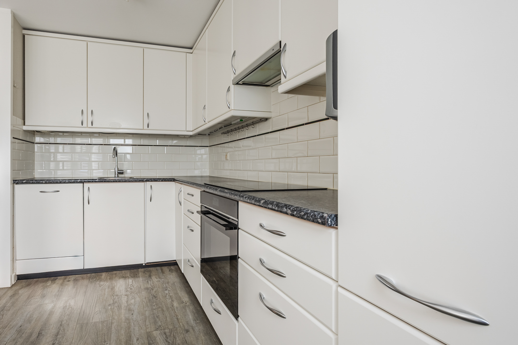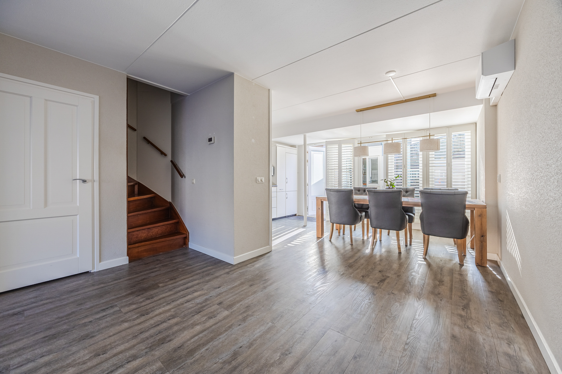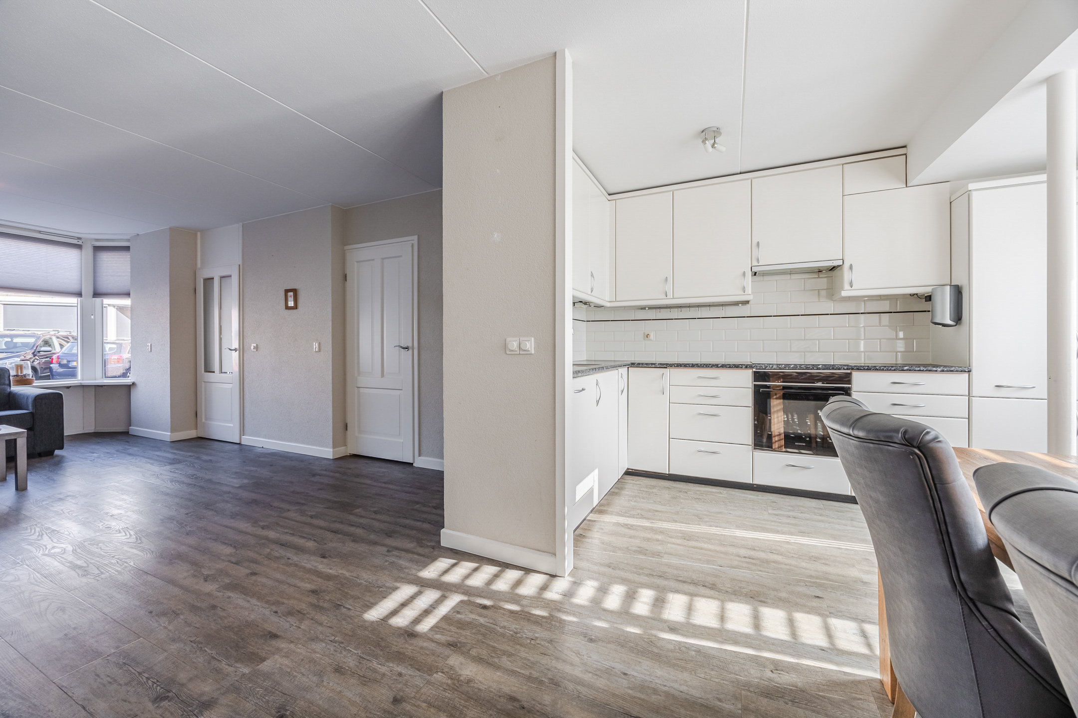 Via de entree heeft u toegang tot de meterkast, het toilet en de uitgebouwde en lichte woonkamer. De woonkamer is voorzien van een nette pvc vloer met vloerverwarming. De achterzijde is uitgebouwd en voorzien van openslaande deuren met hoogwaardige houten shutters. Hier bevindt zich tevens de open keuken voorzien van diverse inbouwapparatuur, waaronder een inductie kookplaat, vaatwasmachine, koel- en vrieskast en een oven.