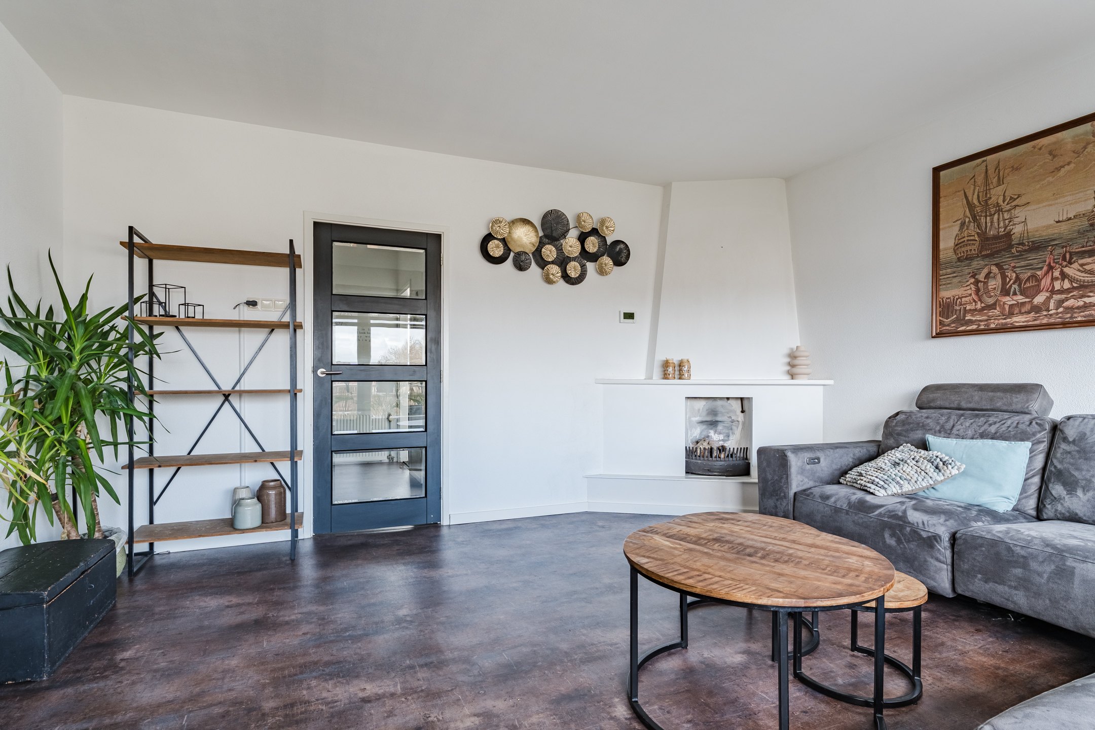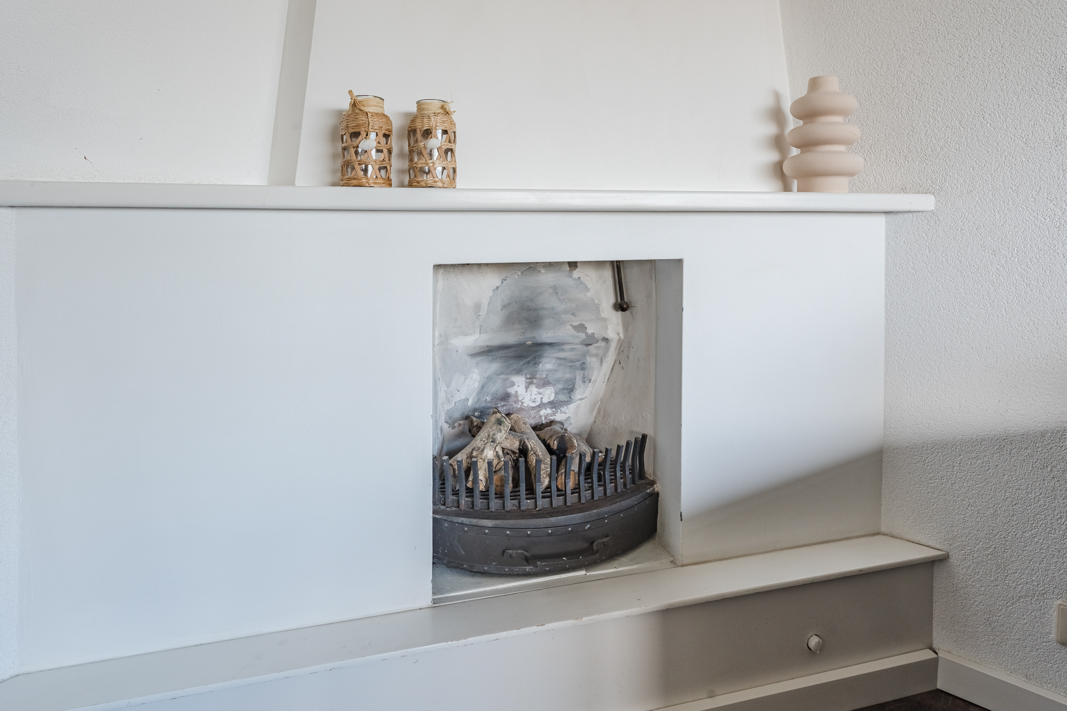 De lichte woonkamer is voorzien van een sfeervolle gashaard, biedt toegang tot het balkon op het zuidoosten en heeft een vrij uitzicht over de Zanderij.