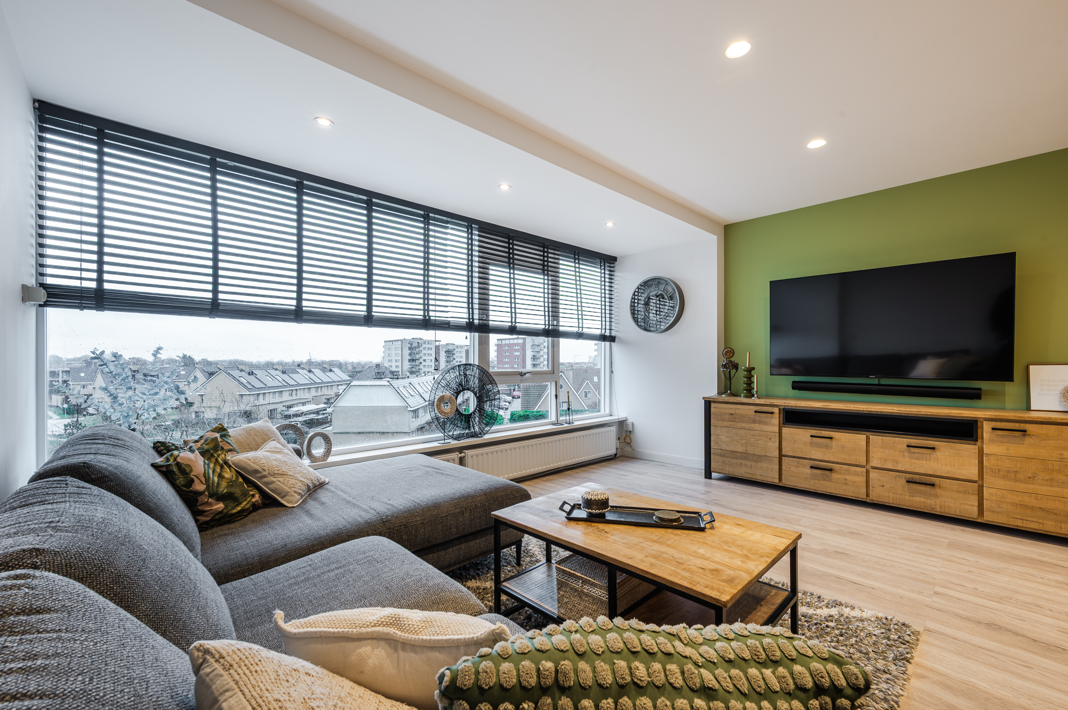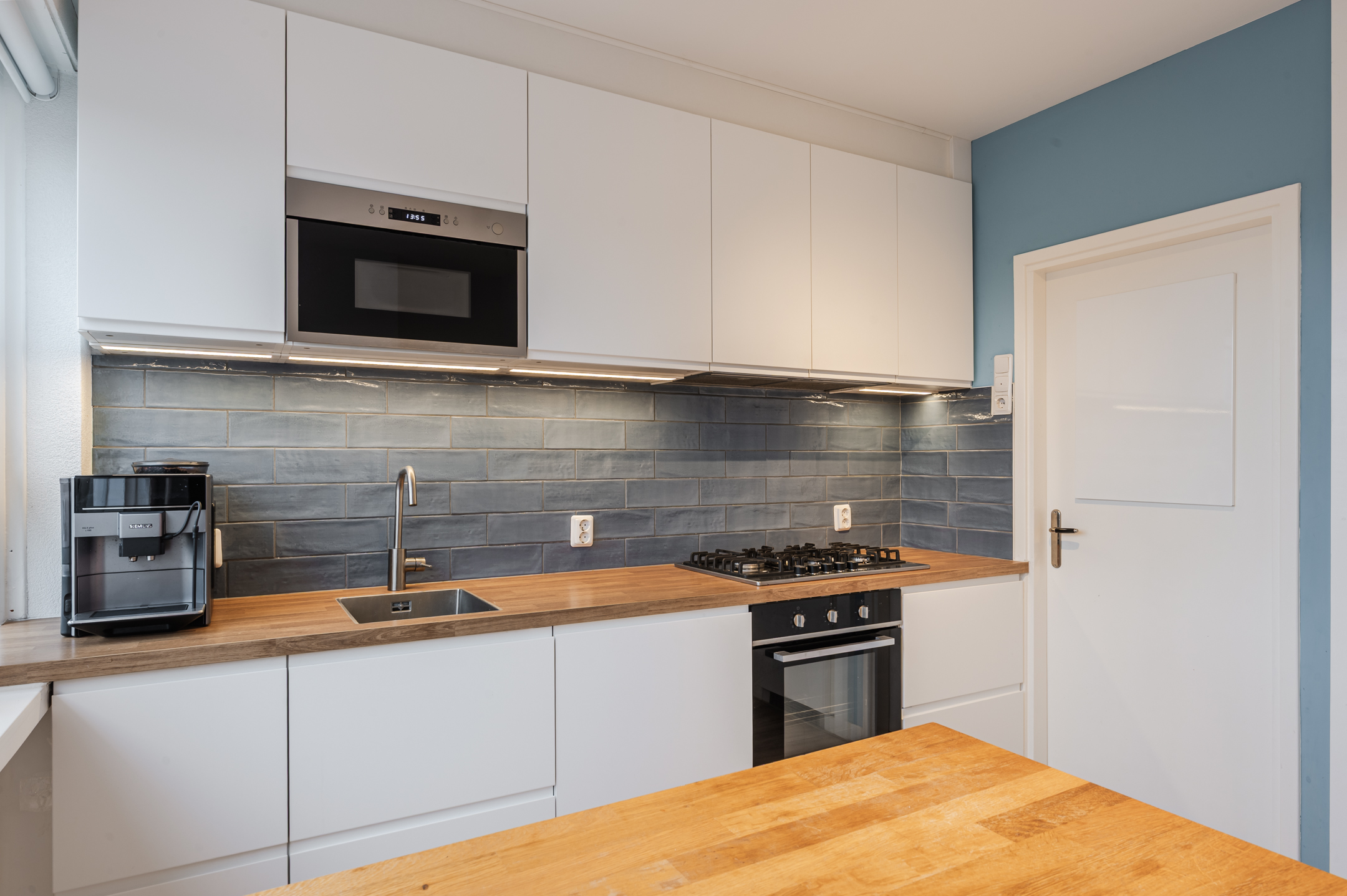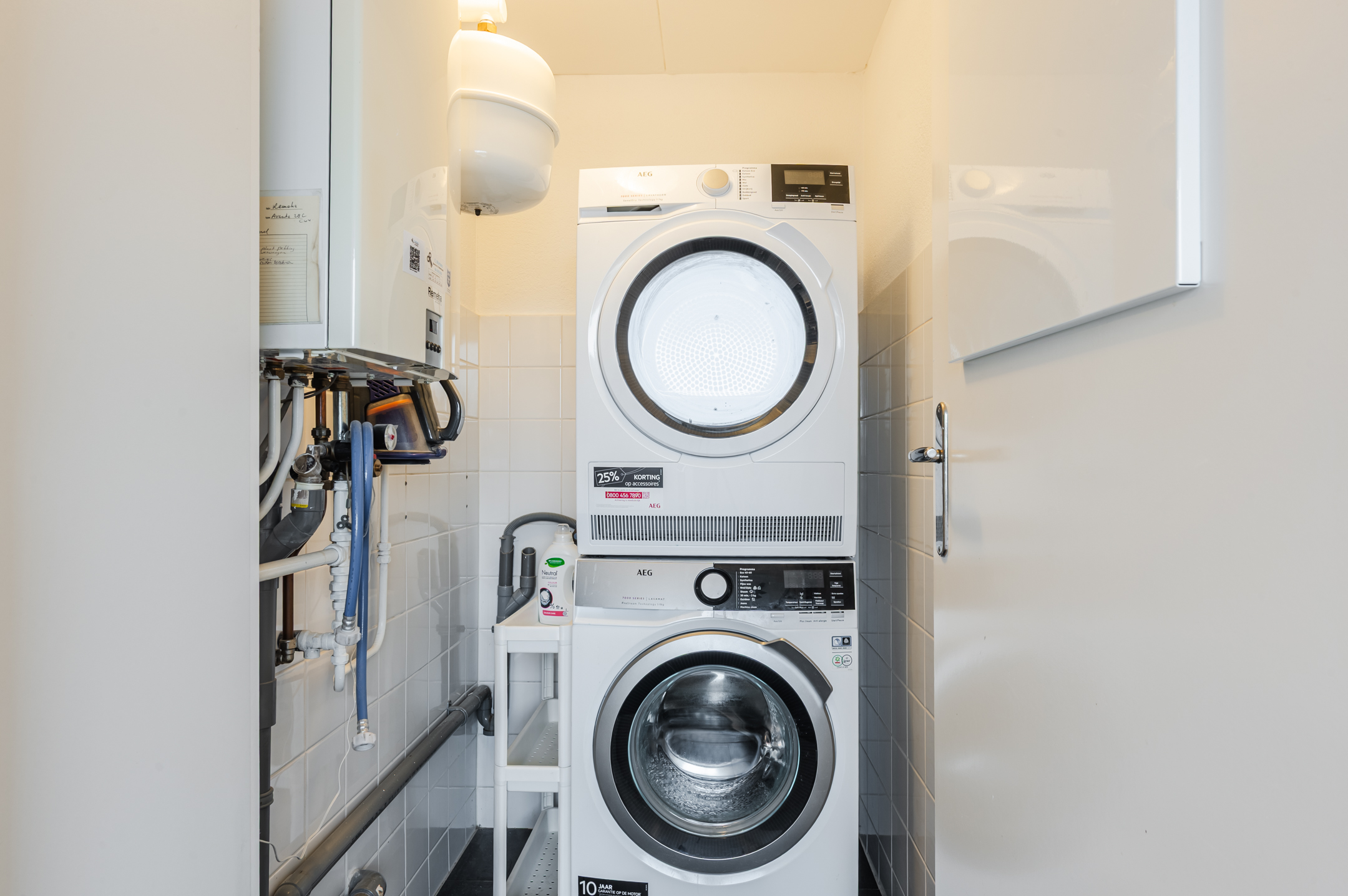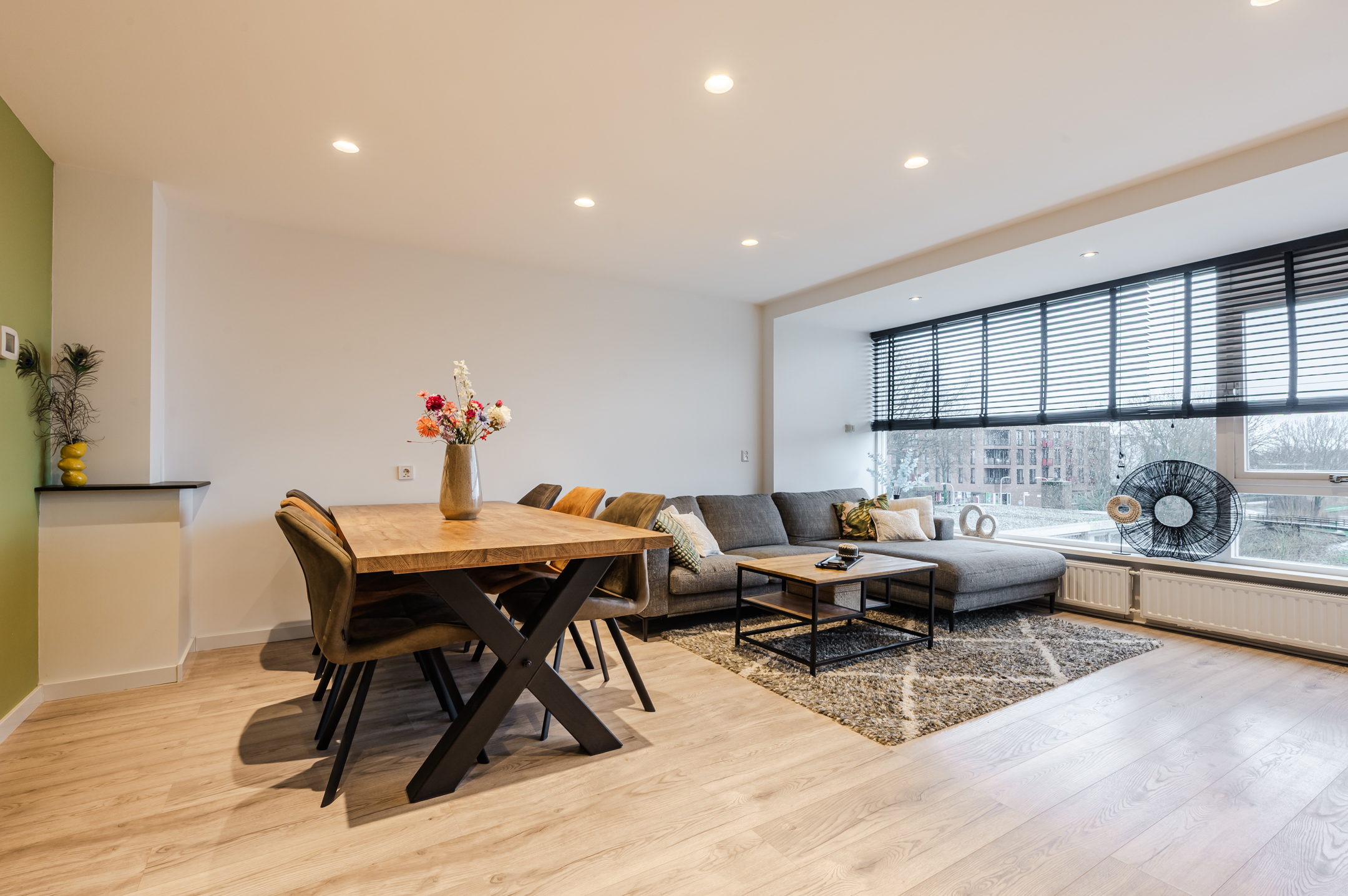 De ruime woonkeuken (2021) is gelegen aan de voorzijde van het appartement, voorzien van inbouwapparatuur en biedt toegang tot de bijkeuken met aansluitingen voor wasmachine en droger en de cv-installatie. De uitgebouwde woonkamer is dankzij de grote raampartij heerlijk licht en biedt een vrij uitzicht. De in het plafond verwerkte spots zorgen voor sfeervolle verlichting.