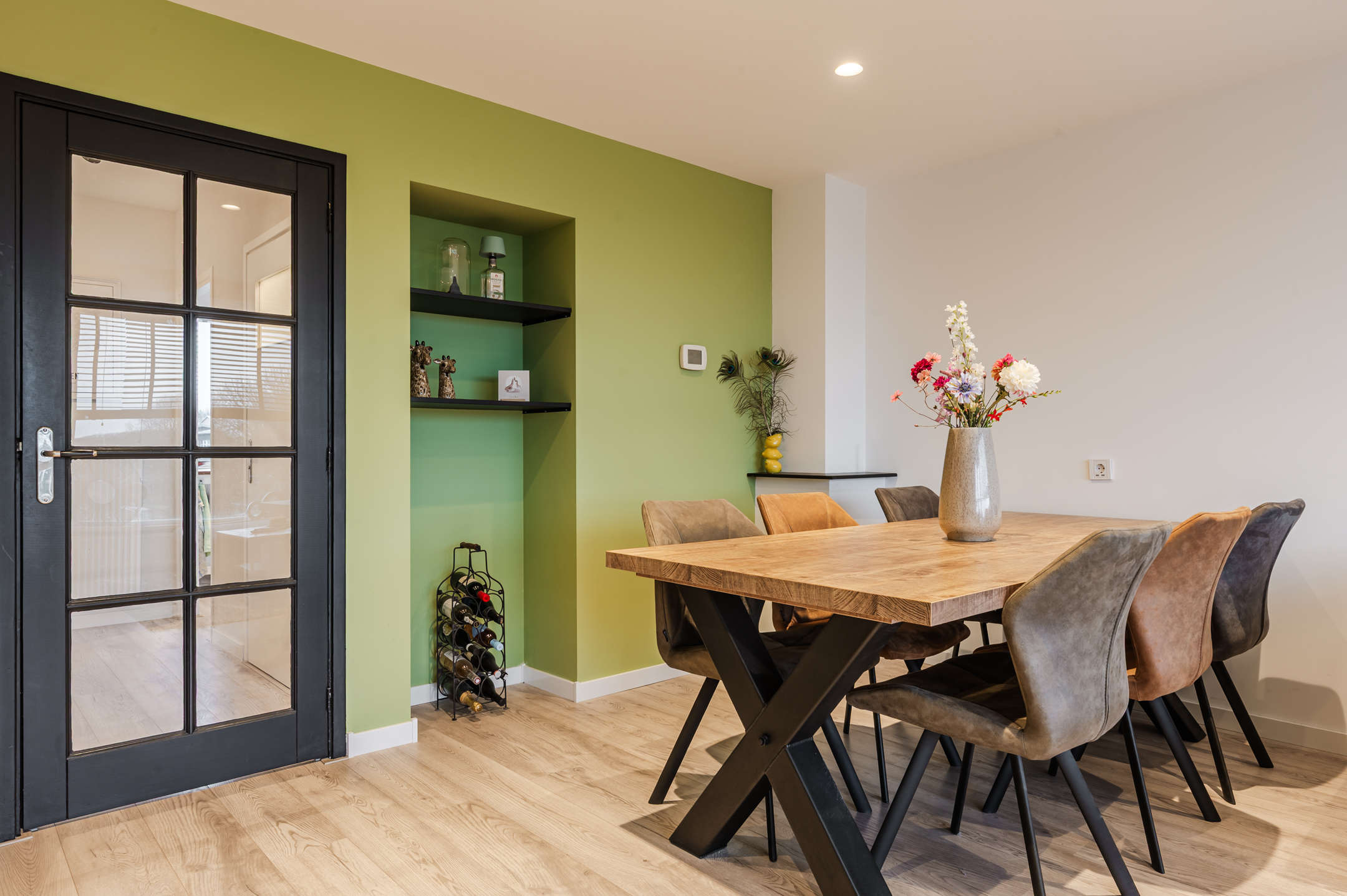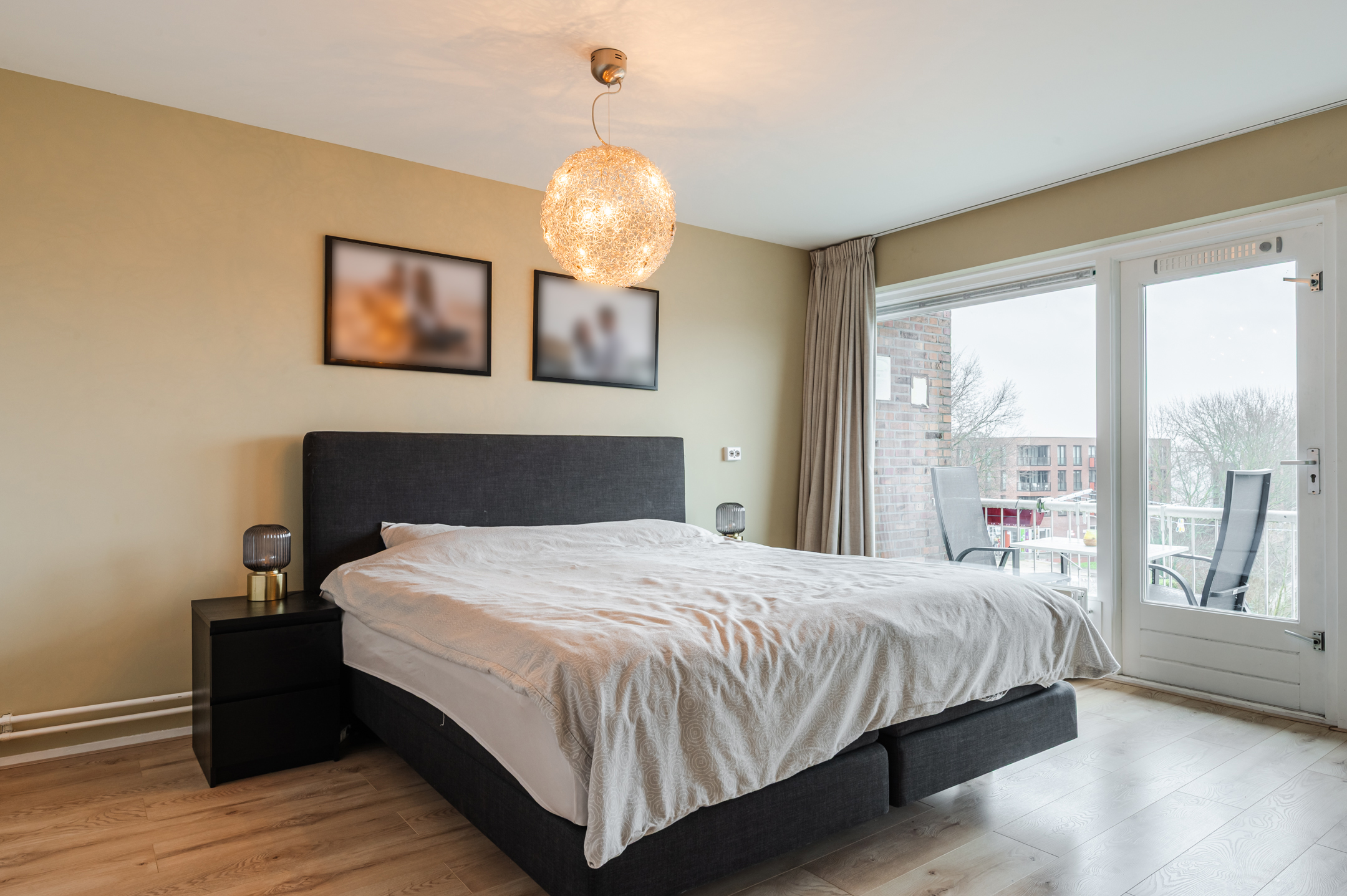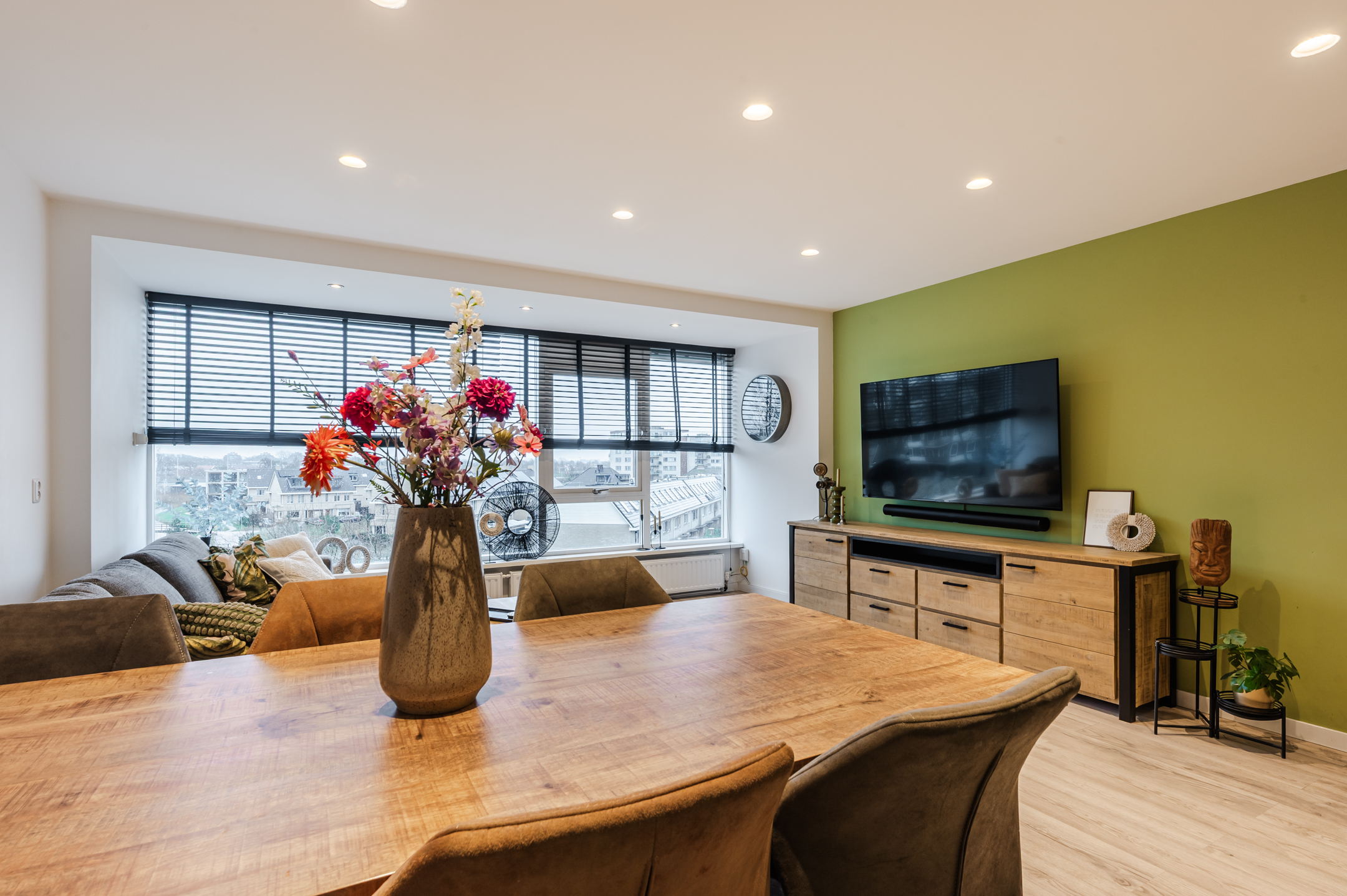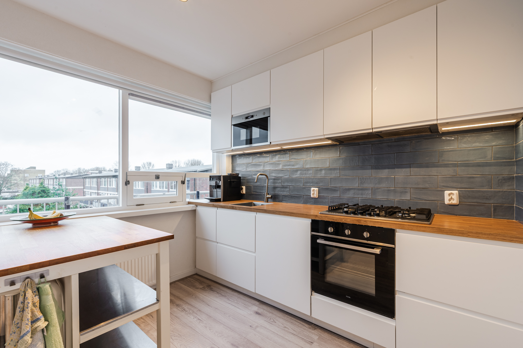 De ruime woonkeuken (2021) is gelegen aan de voorzijde van het appartement, voorzien van inbouwapparatuur en biedt toegang tot de bijkeuken met aansluitingen voor wasmachine en droger en de cv-installatie. De uitgebouwde woonkamer is dankzij de grote raampartij heerlijk licht en biedt een vrij uitzicht. De in het plafond verwerkte spots zorgen voor sfeervolle verlichting.