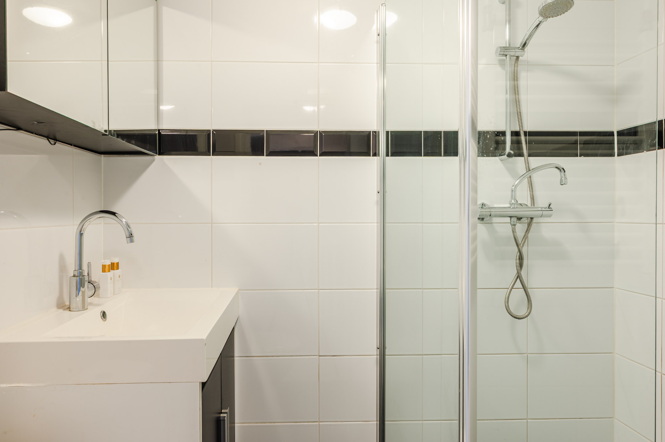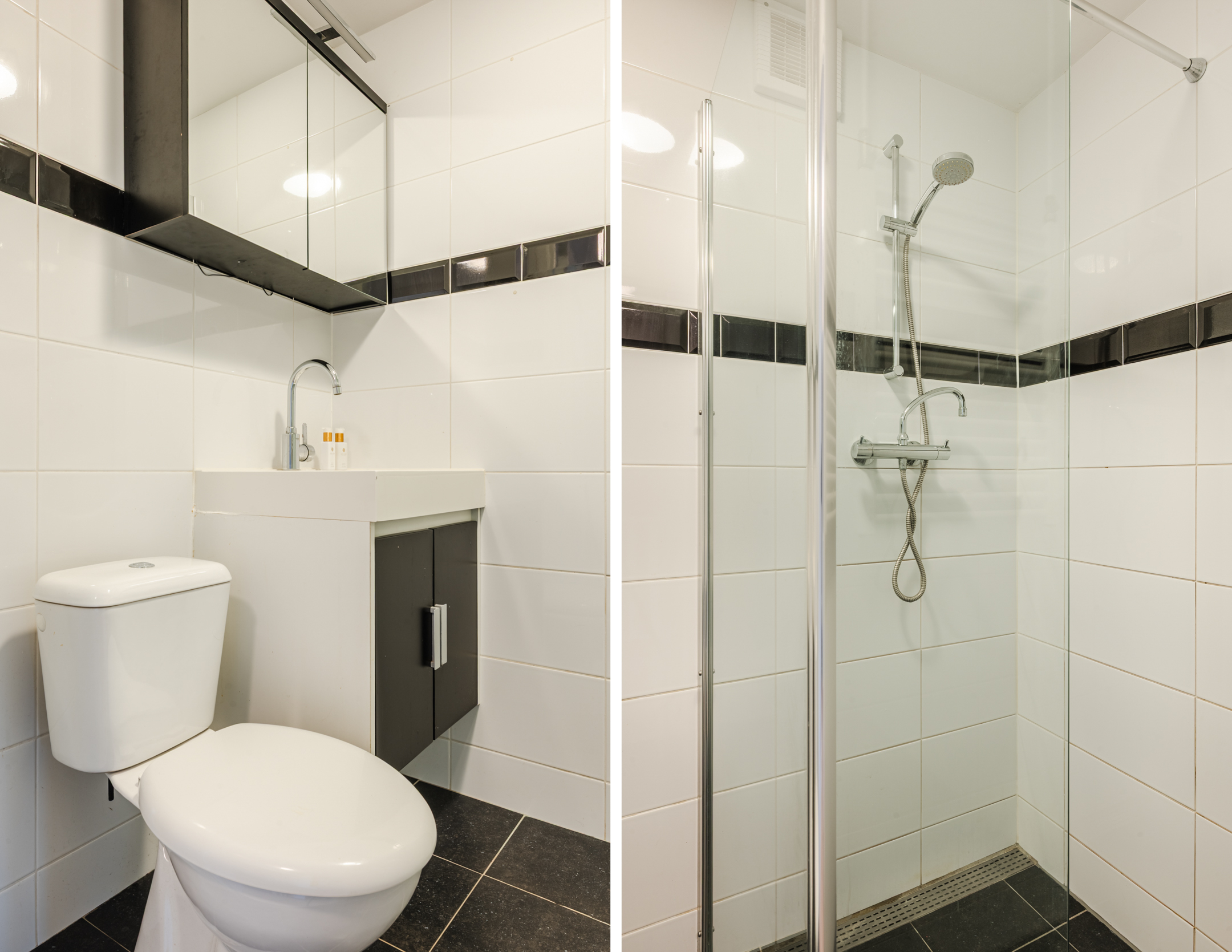 Aan de voorzijde bevinden zich nog twee ruime slaapkamers. De badkamer is volledig betegeld en voorzien van een douche, toilet en wastafelmeubel.
