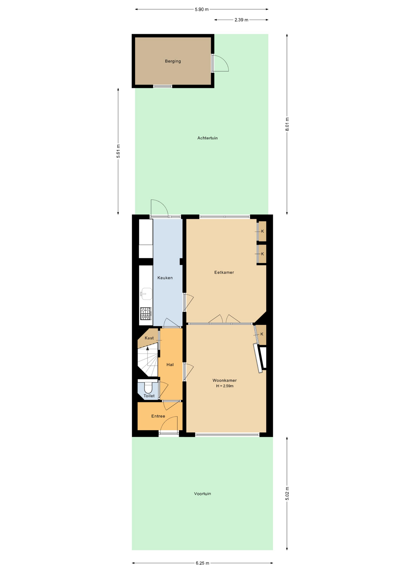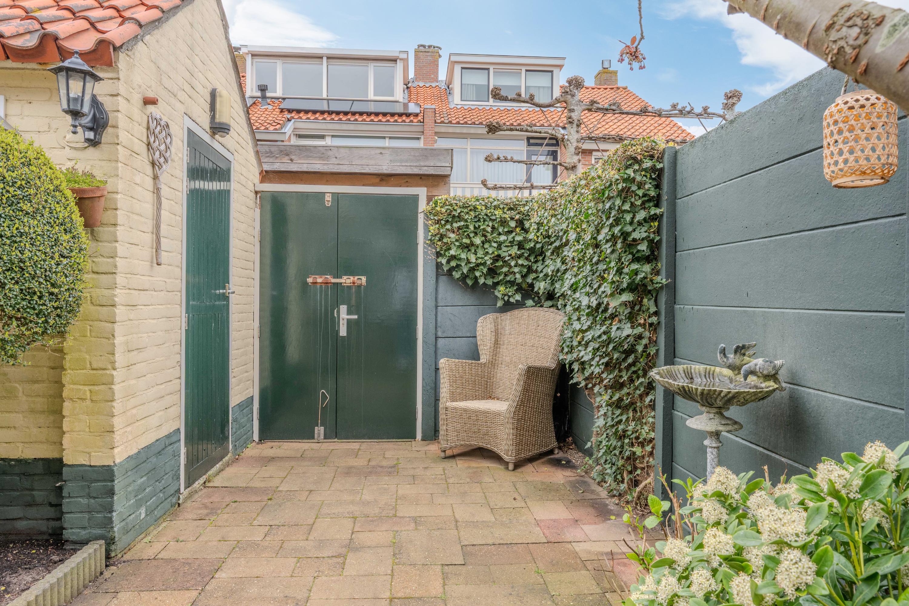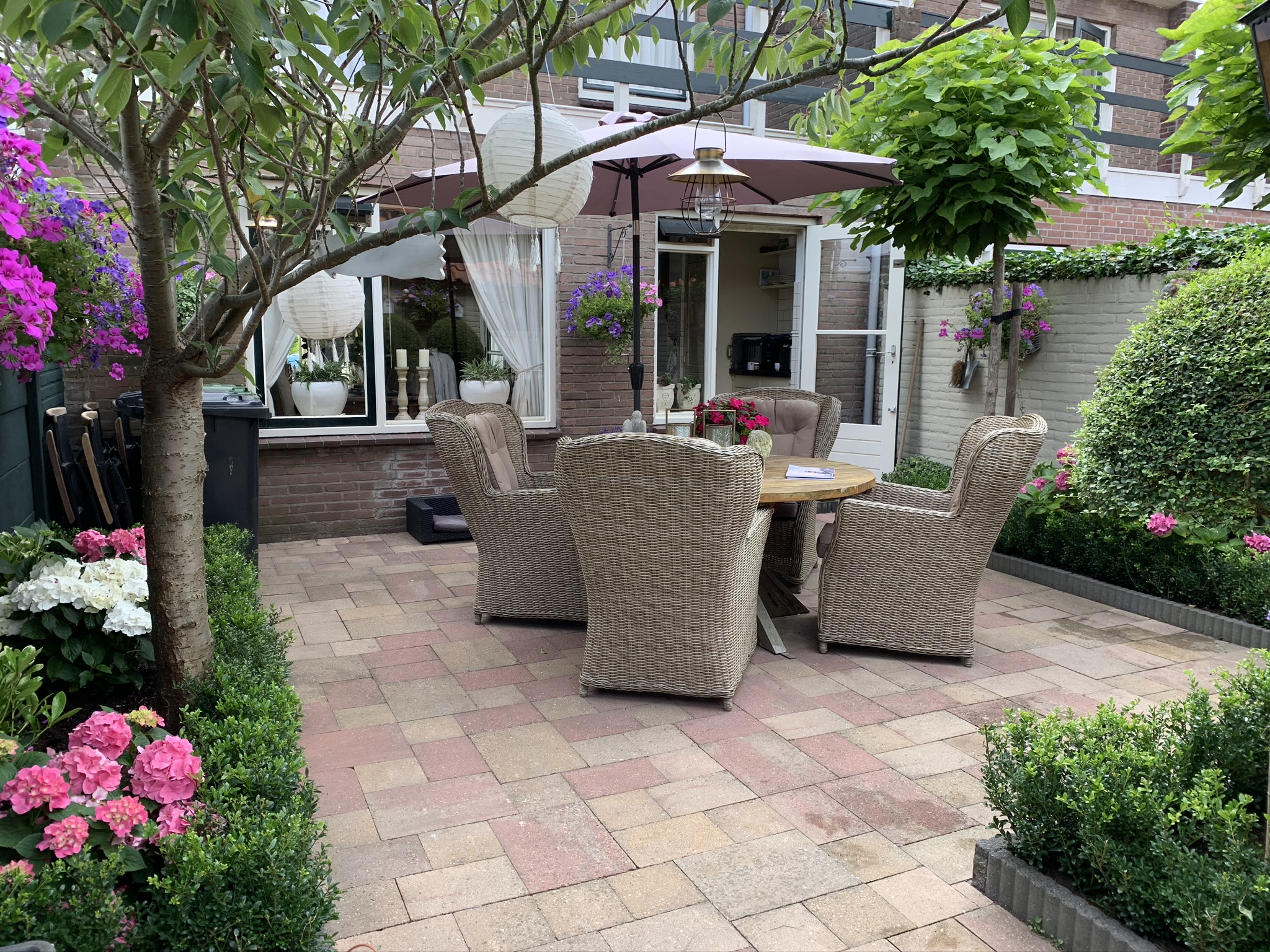 Buiten: Achterom bereikbaar ligt de fraai aangelegde achtertuin. In deze groene tuin kunt u heerlijk genieten van de rust en de zon. Aan de achterzijde van de tuin bevindt zich de berging die is voorzien van een stroompunt.