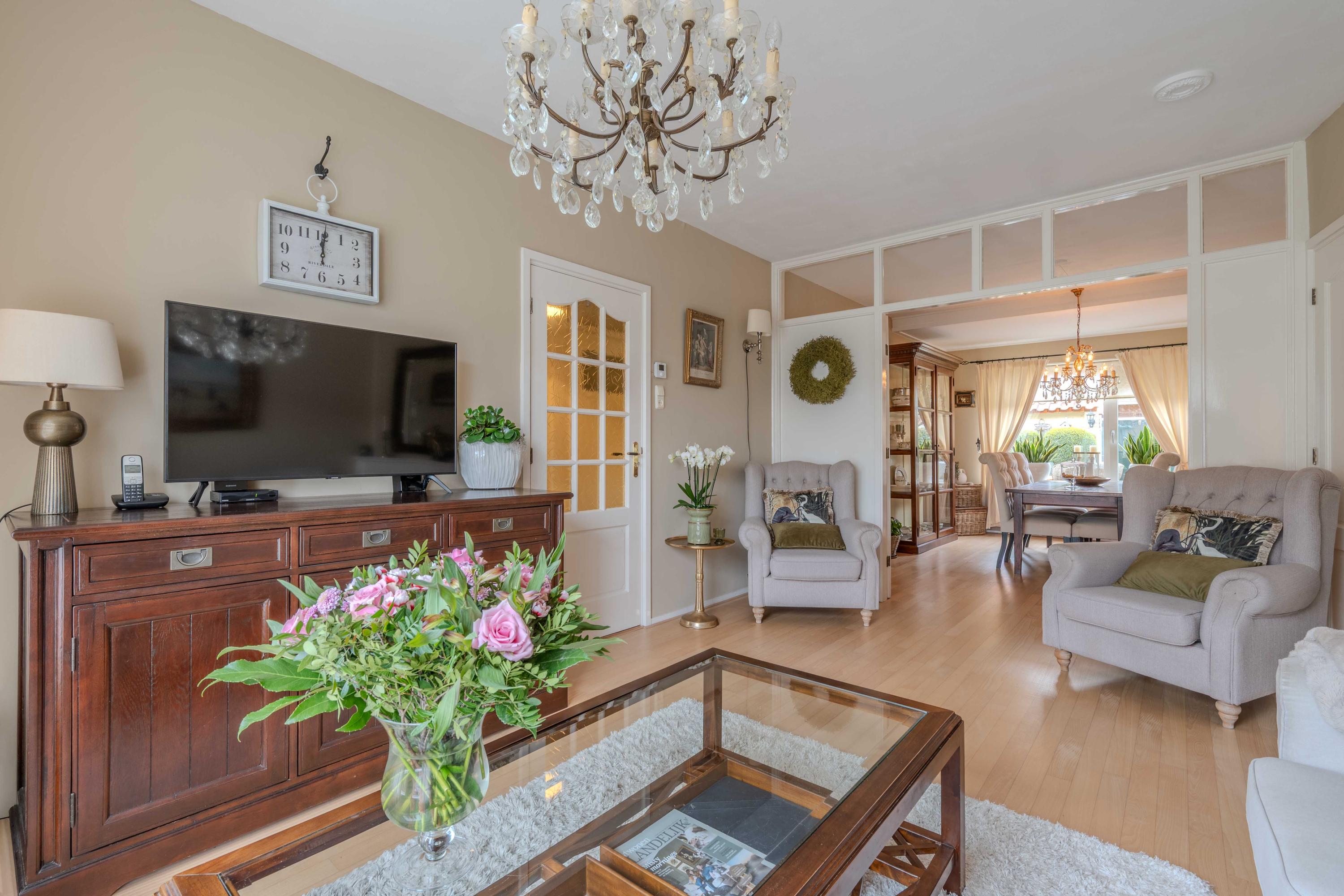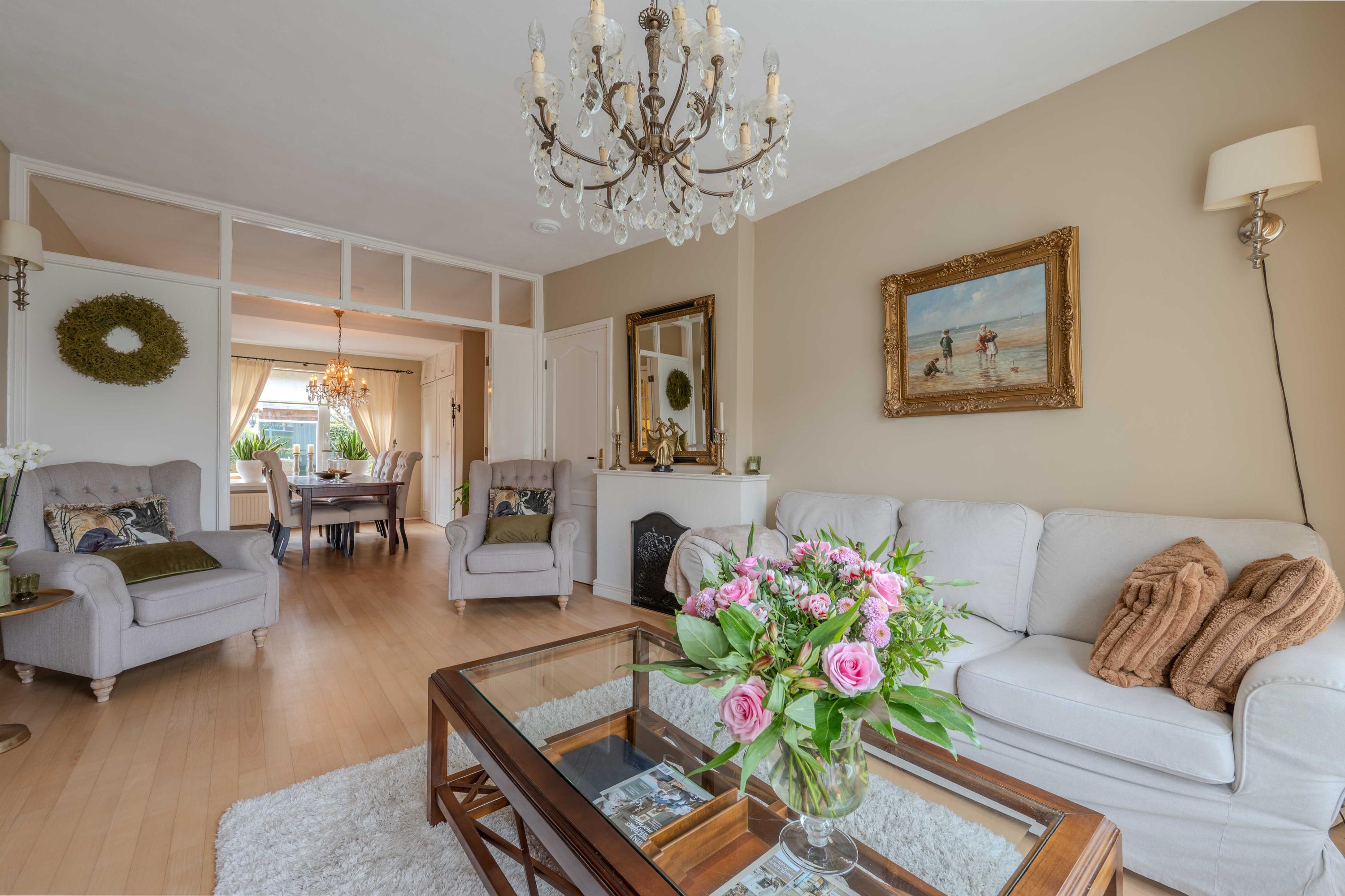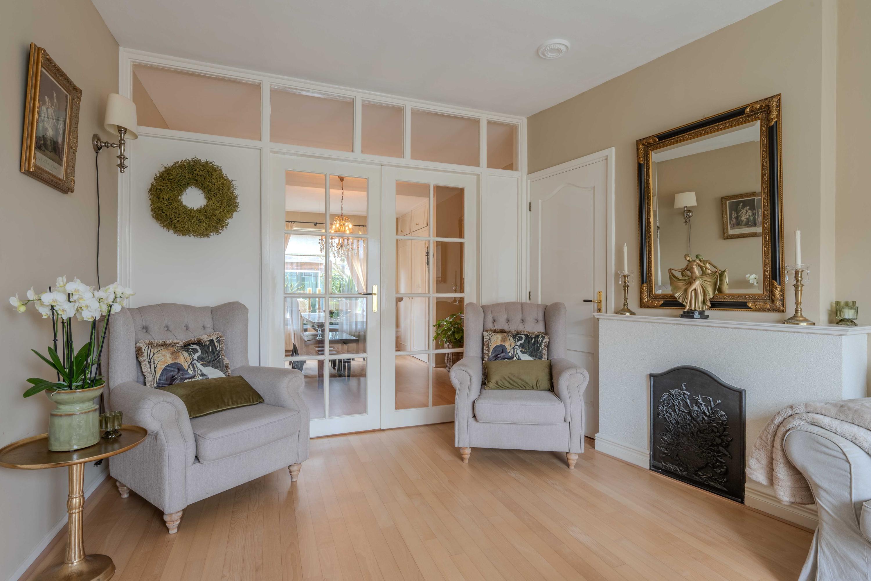 Vanuit de keuken bereikt u tevens de woonkamer. Deze riante woonkamer is voorzien van sfeervolle en-suite deuren en een nette houten vloer. Door de grote raampartijen aan zowel de voor- als achterzijde kunt u genieten van veel lichtinval in de woonkamer.