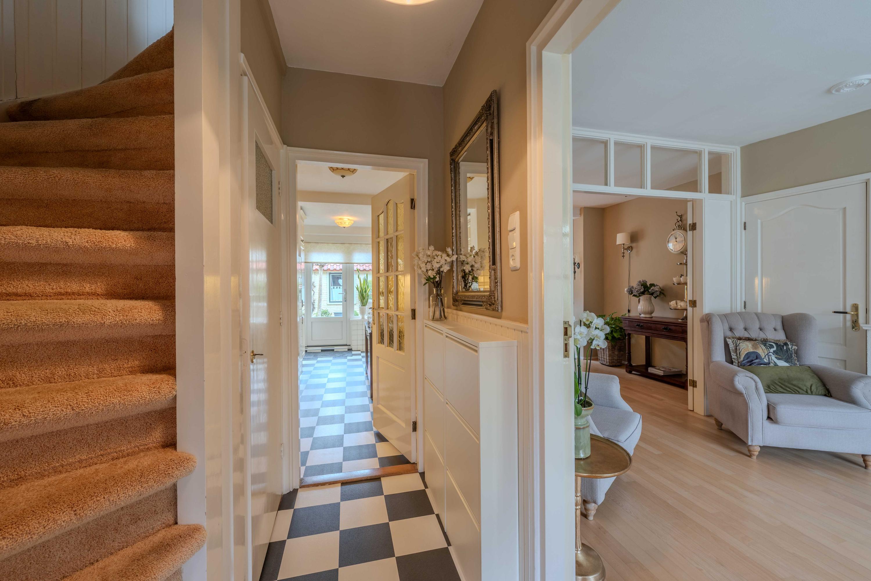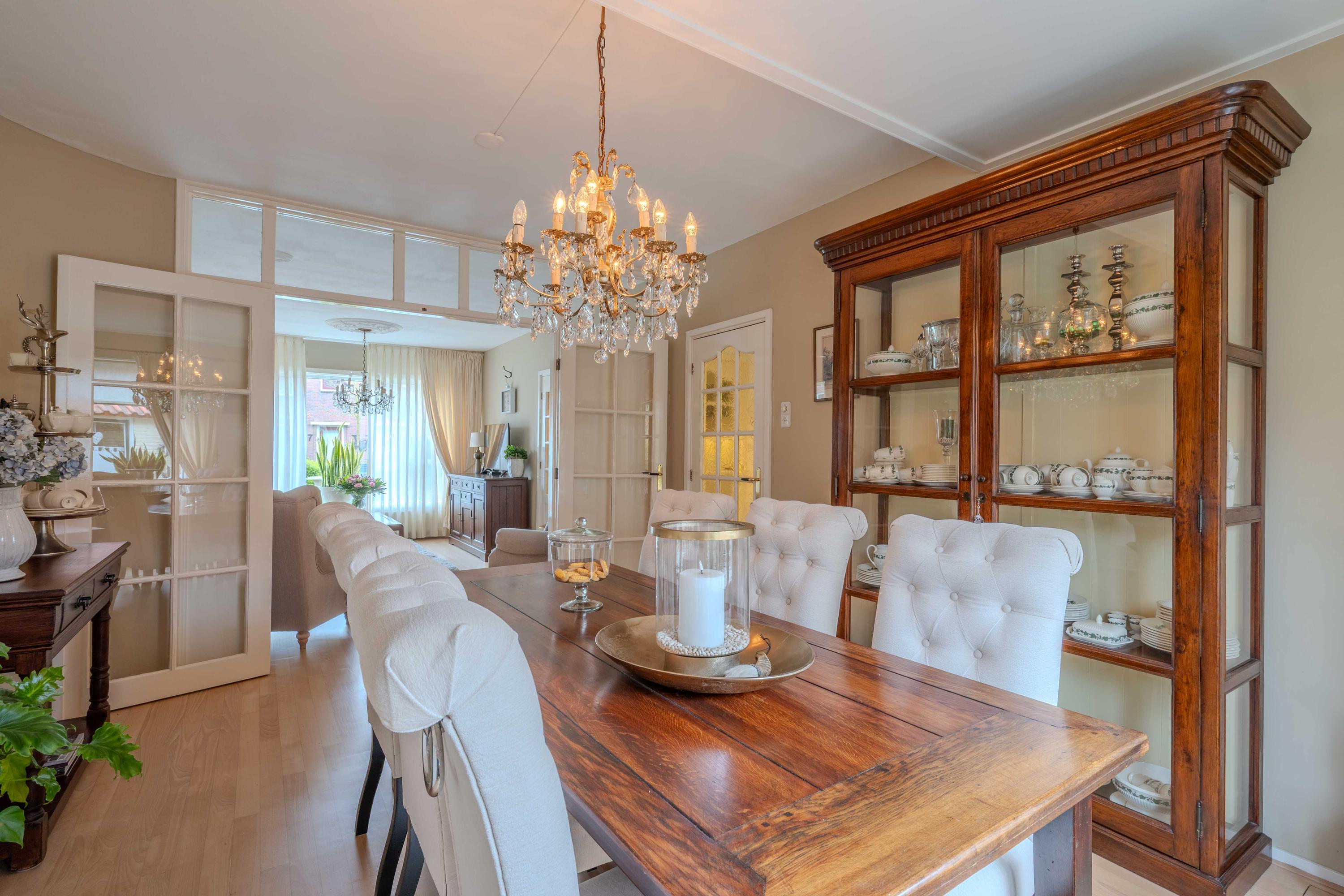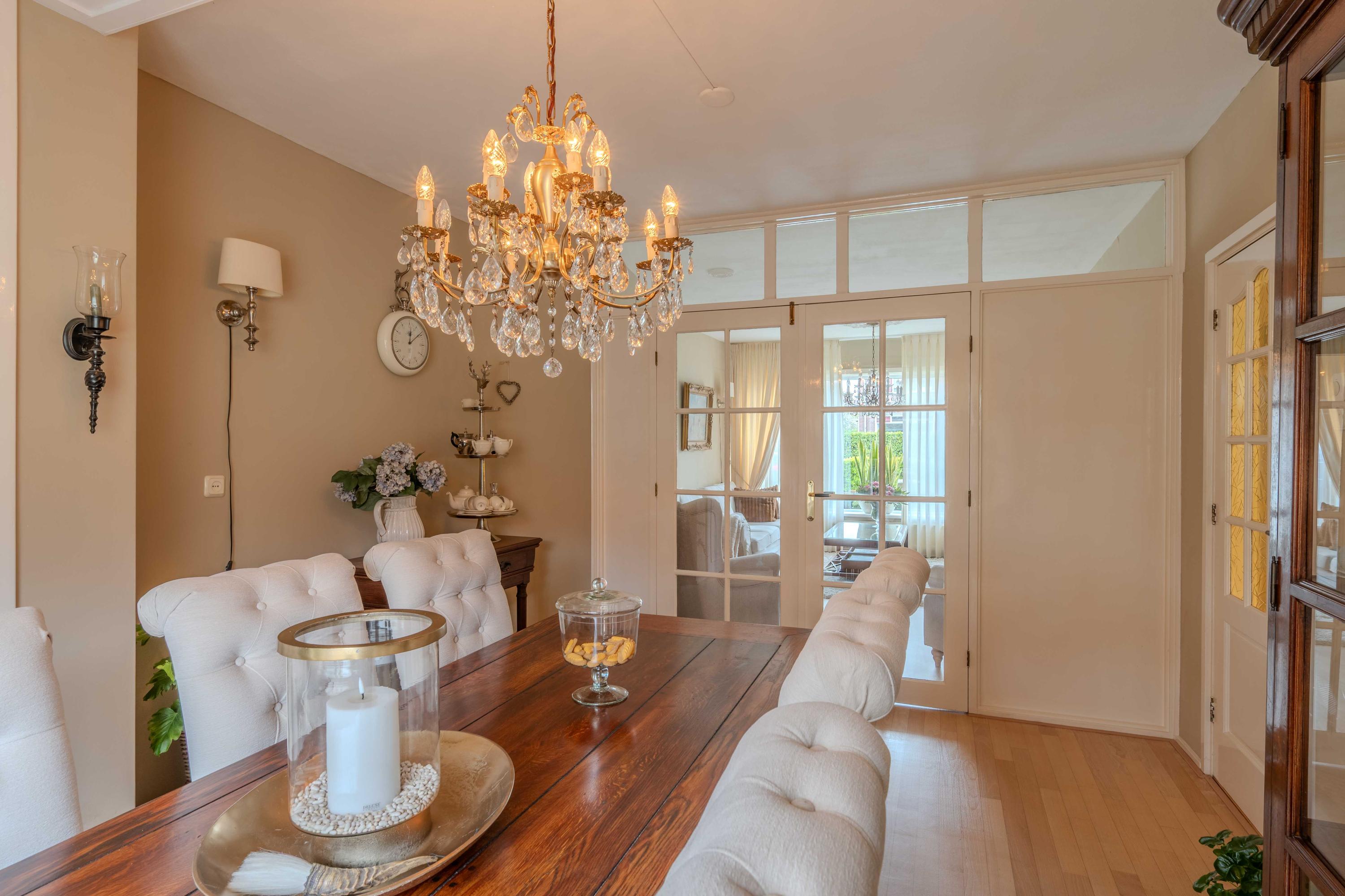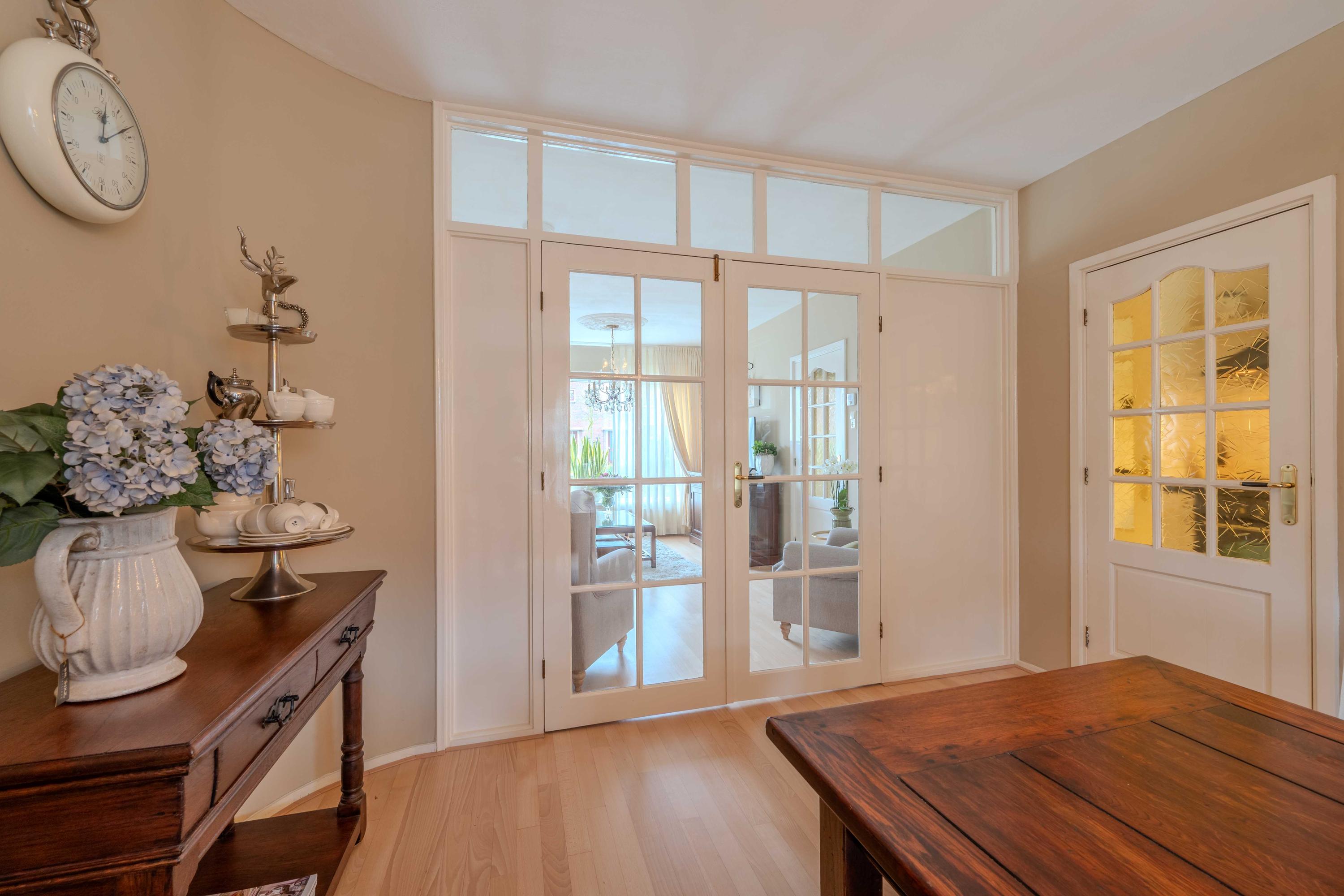 Vanuit de keuken bereikt u tevens de woonkamer. Deze riante woonkamer is voorzien van sfeervolle en-suite deuren en een nette houten vloer. Door de grote raampartijen aan zowel de voor- als achterzijde kunt u genieten van veel lichtinval in de woonkamer.