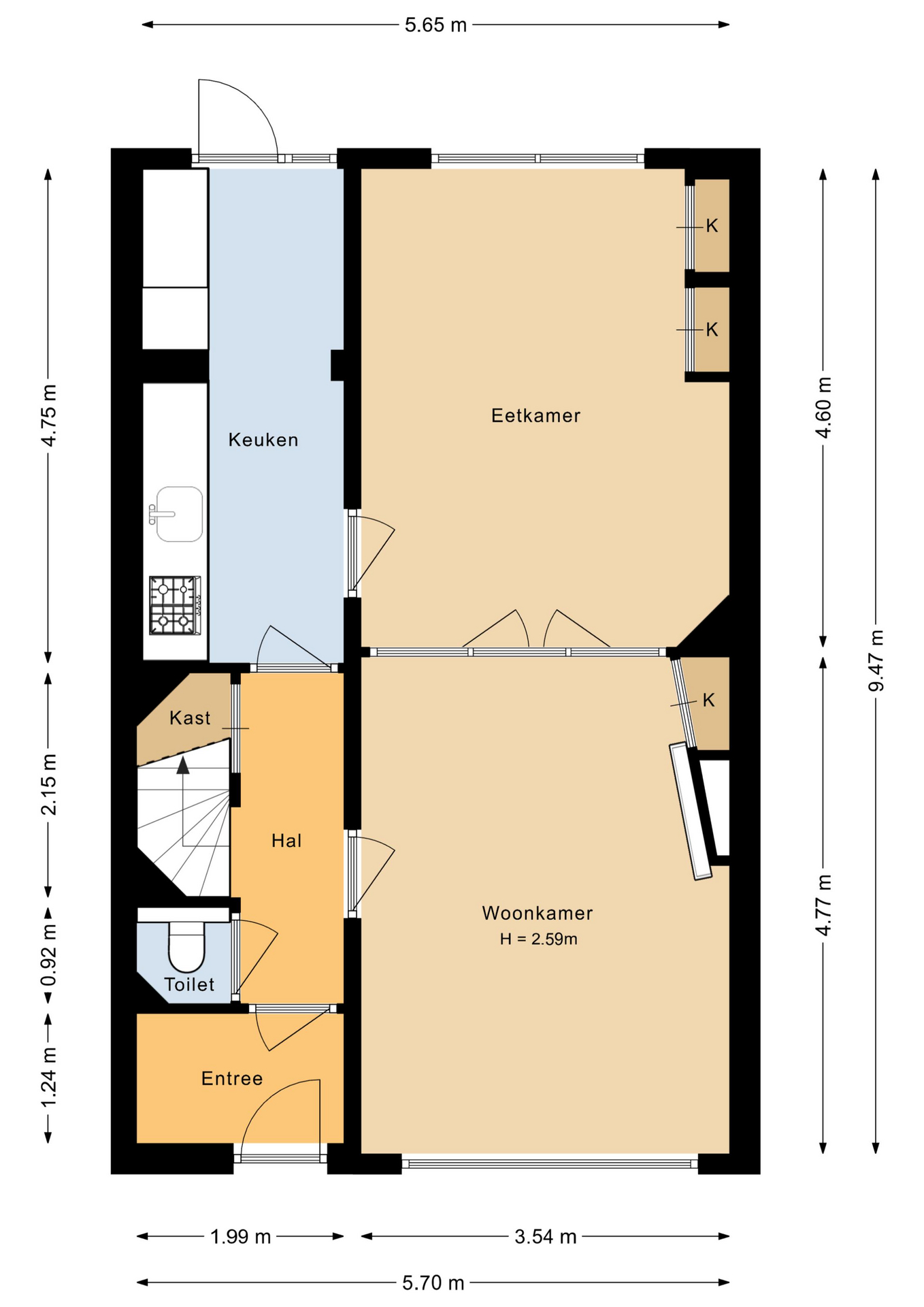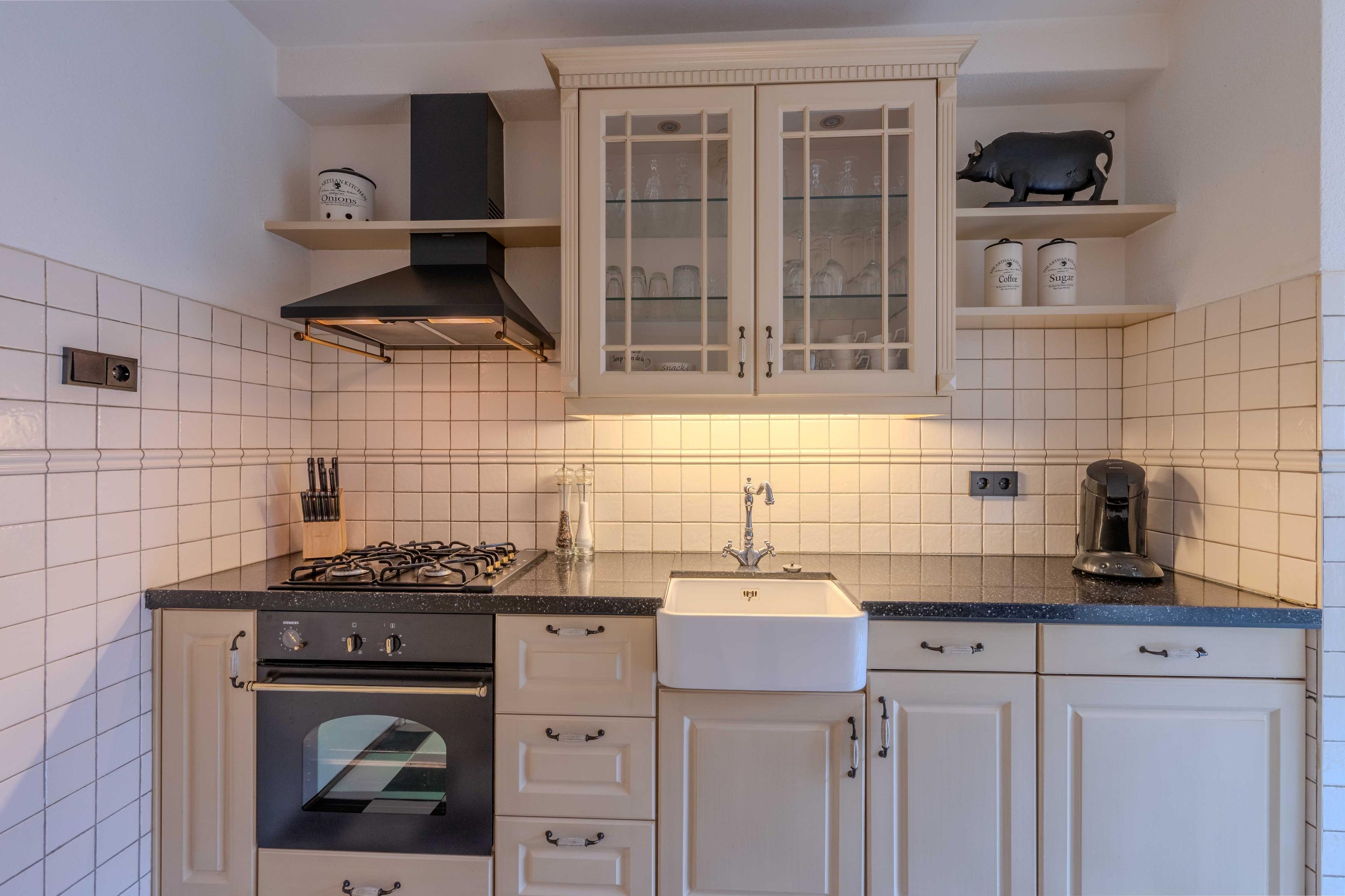 Via de entree komt u in het tochtportaal. Hiervandaan loopt u de hal in vanwaar u toegang heeft tot het toilet, de vaste trap naar de verdieping, de trapkast, de keuken en de woonkamer. De keuken is voorzien van en prachtig composiet werkblad en diverse inbouwapparatuur, waaronder een oven, 4-pits gasfornuis, afzuigkap, koelkast en vriezer.
