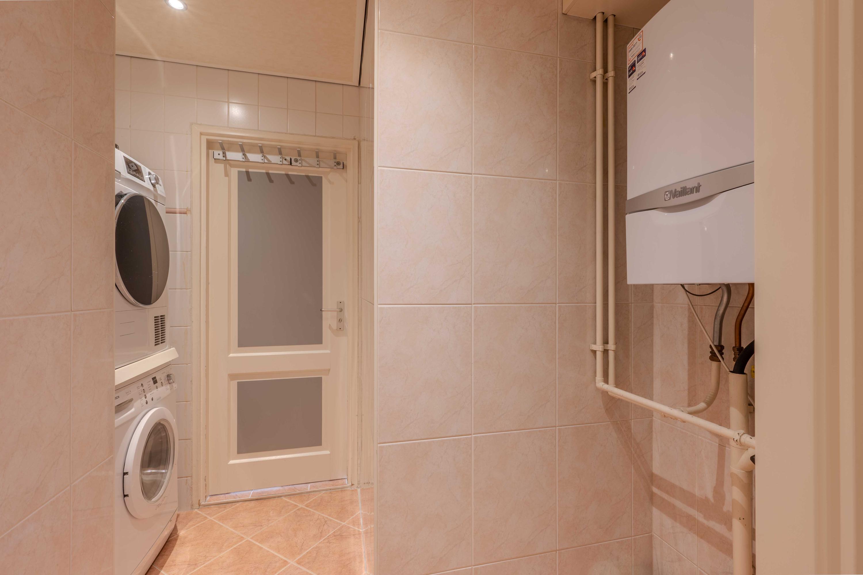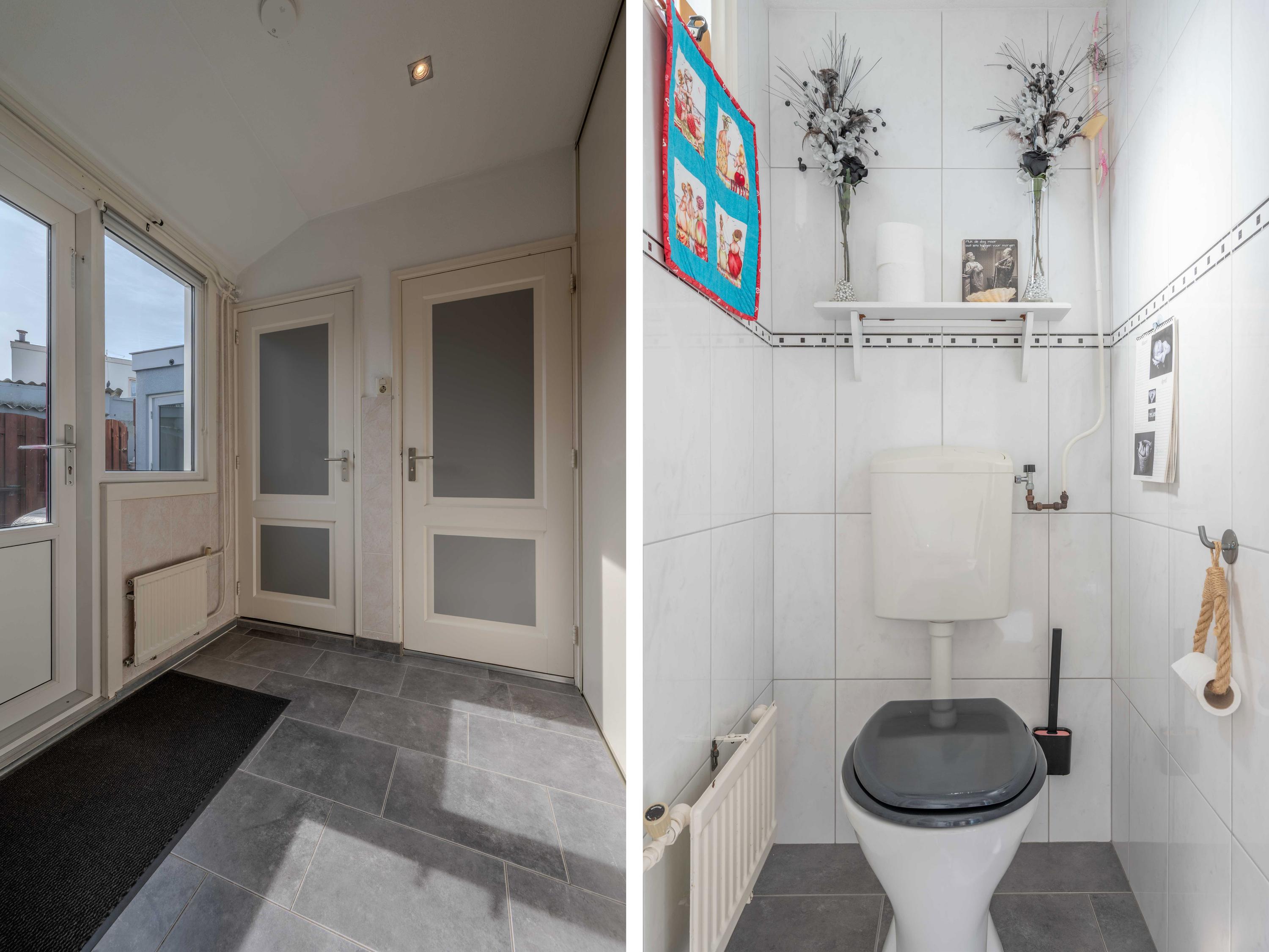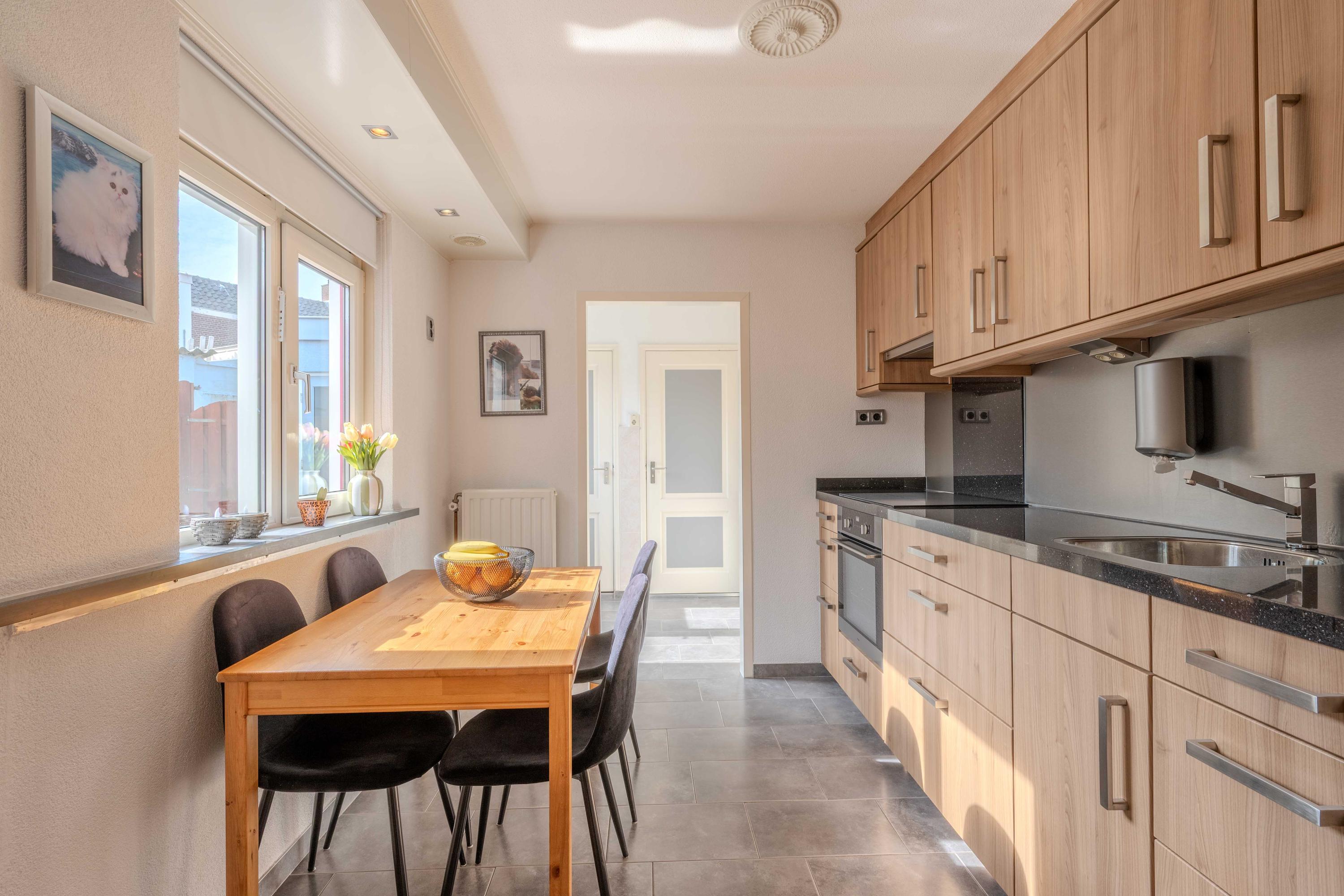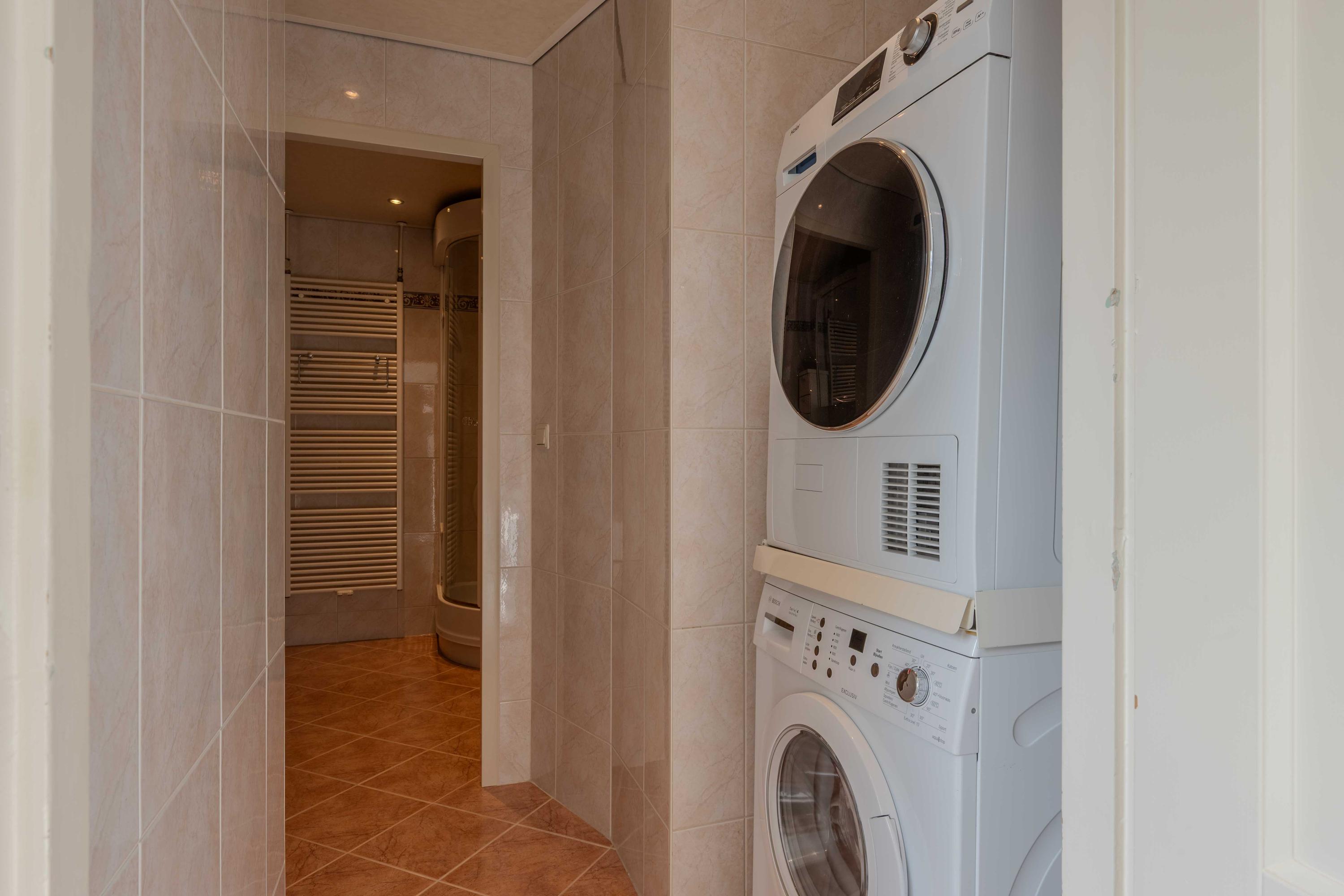 De keuken (circa 2000) is voorzien van een oven, Pelgrim inductiekookplaat, afzuigkap, losse vaatwasser (blijft achter), combimagnetron en koelkast met vriesvak. Aan de andere zijde van de keuken is er een hal met toilet, bergruimte en een deur naar de plaats. Als u verder doorloopt naar achter, komt u in een halletje met de CV-ketel (circa 11 jaar) en de badkamer. De badkamer is voorzien van een toilet, douche en wastafel. Ook is er een mooi spanplafond aangebracht.