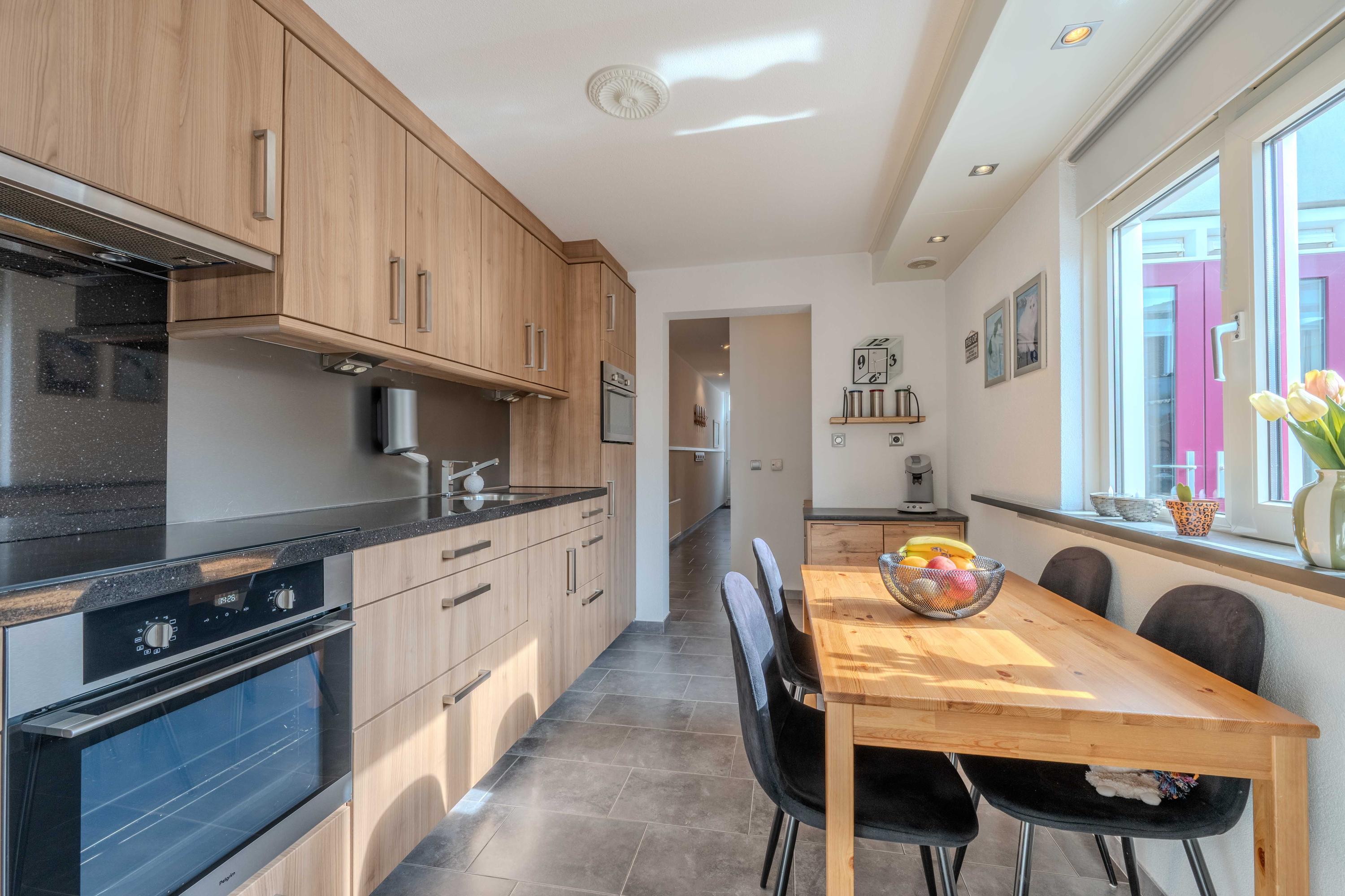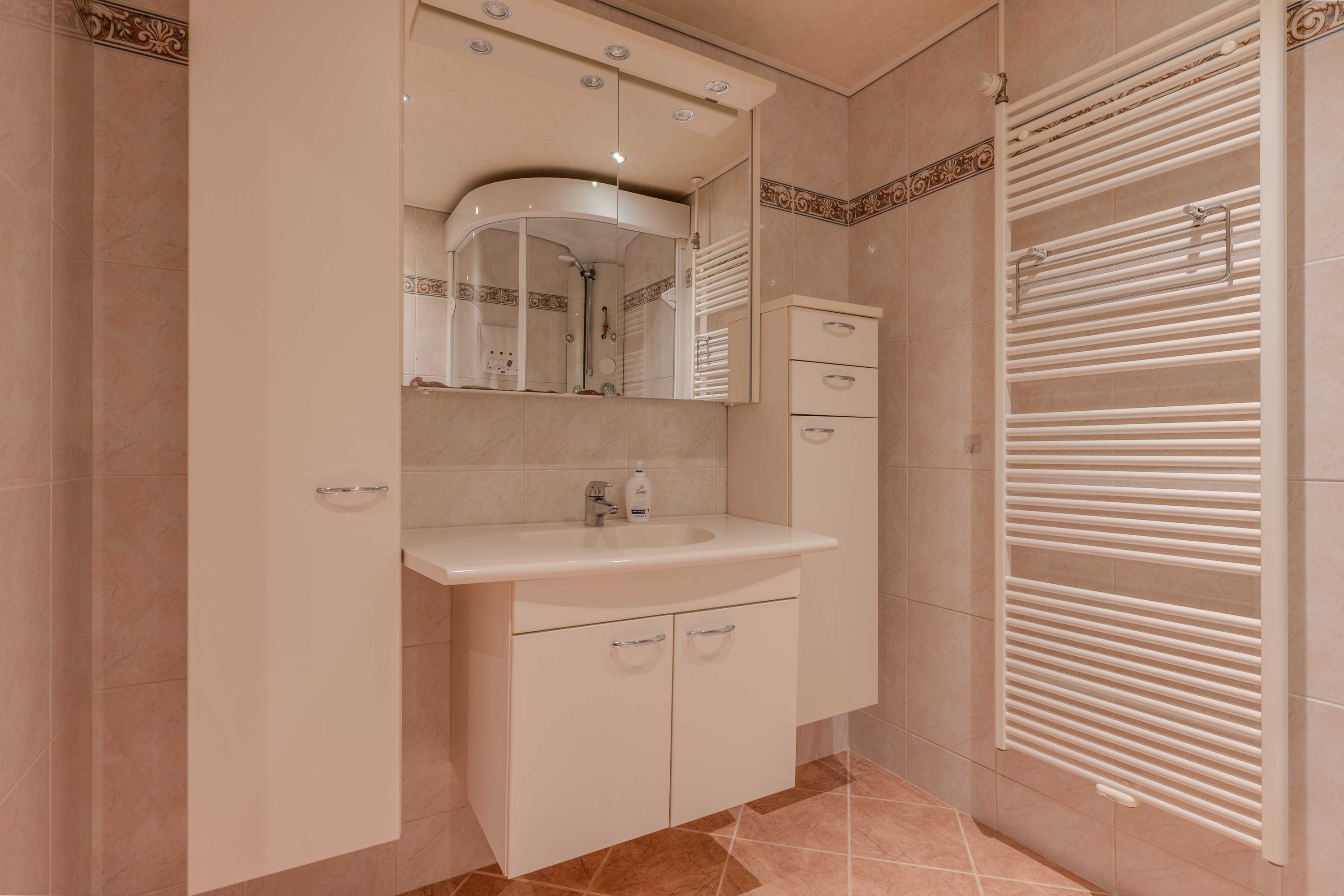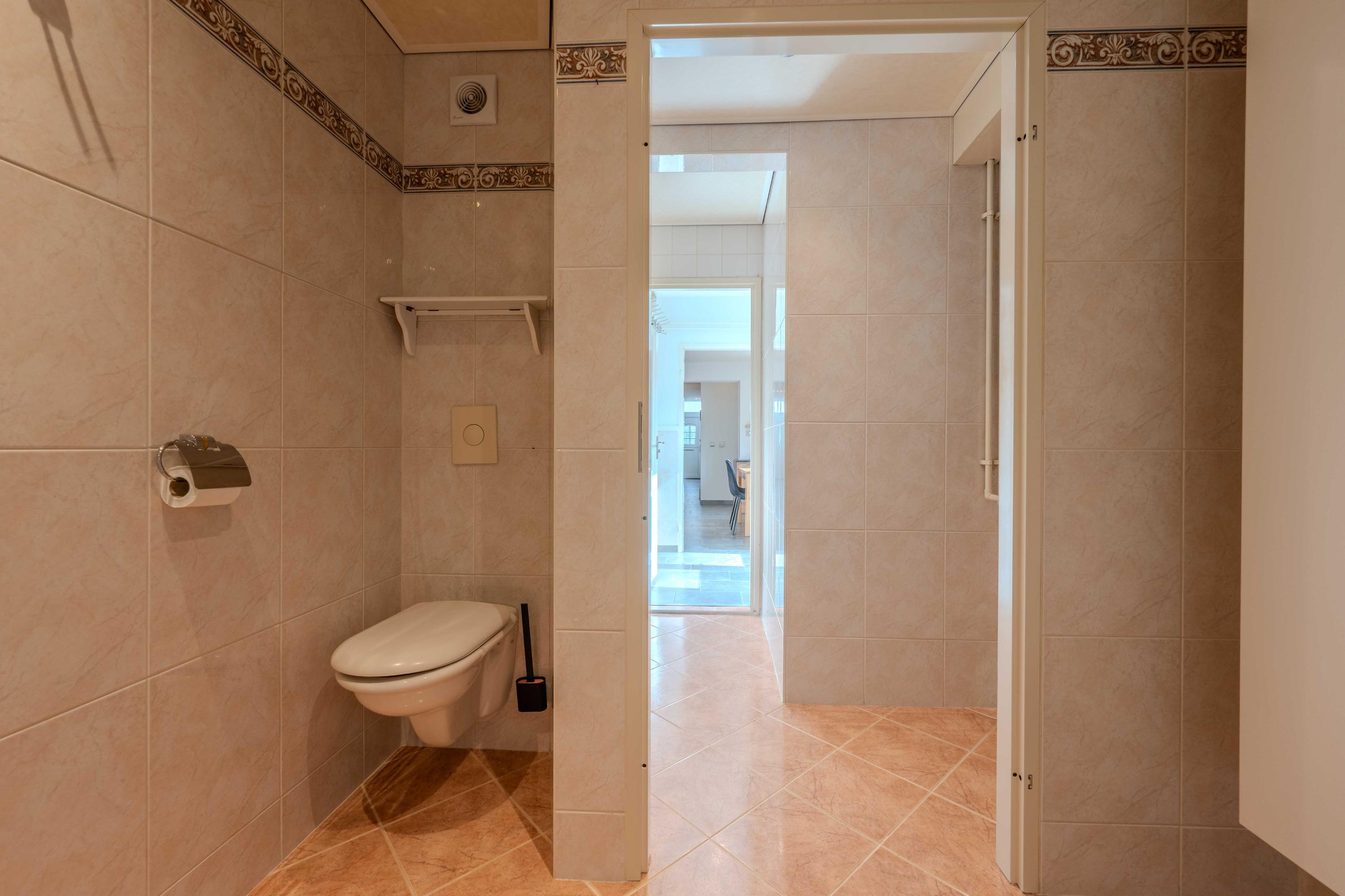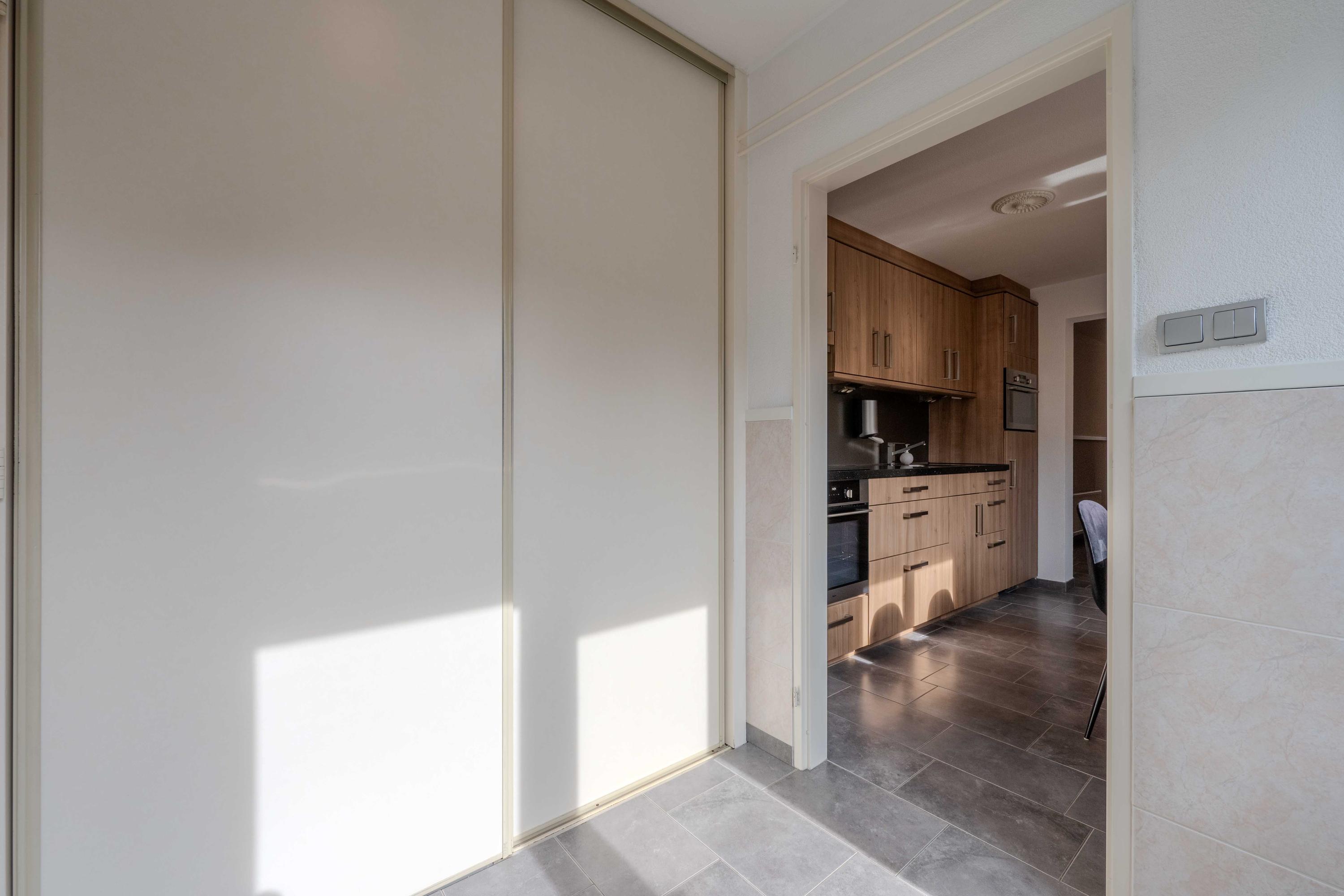 De keuken (circa 2000) is voorzien van een oven, Pelgrim inductiekookplaat, afzuigkap, losse vaatwasser (blijft achter), combimagnetron en koelkast met vriesvak. Aan de andere zijde van de keuken is er een hal met toilet, bergruimte en een deur naar de plaats. Als u verder doorloopt naar achter, komt u in een halletje met de CV-ketel (circa 11 jaar) en de badkamer. De badkamer is voorzien van een toilet, douche en wastafel. Ook is er een mooi spanplafond aangebracht.