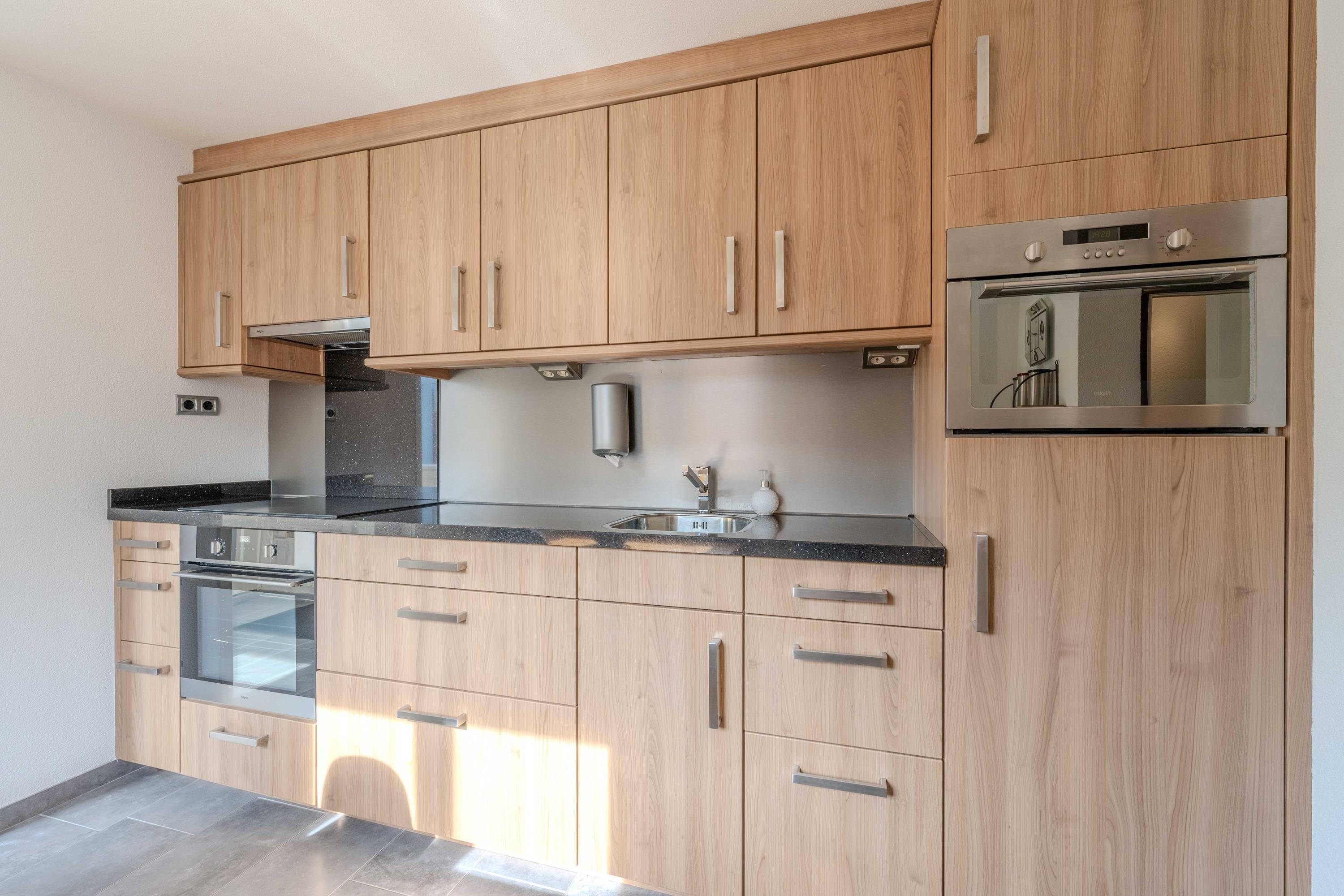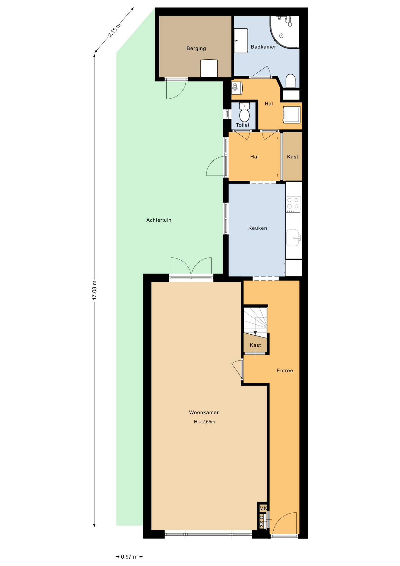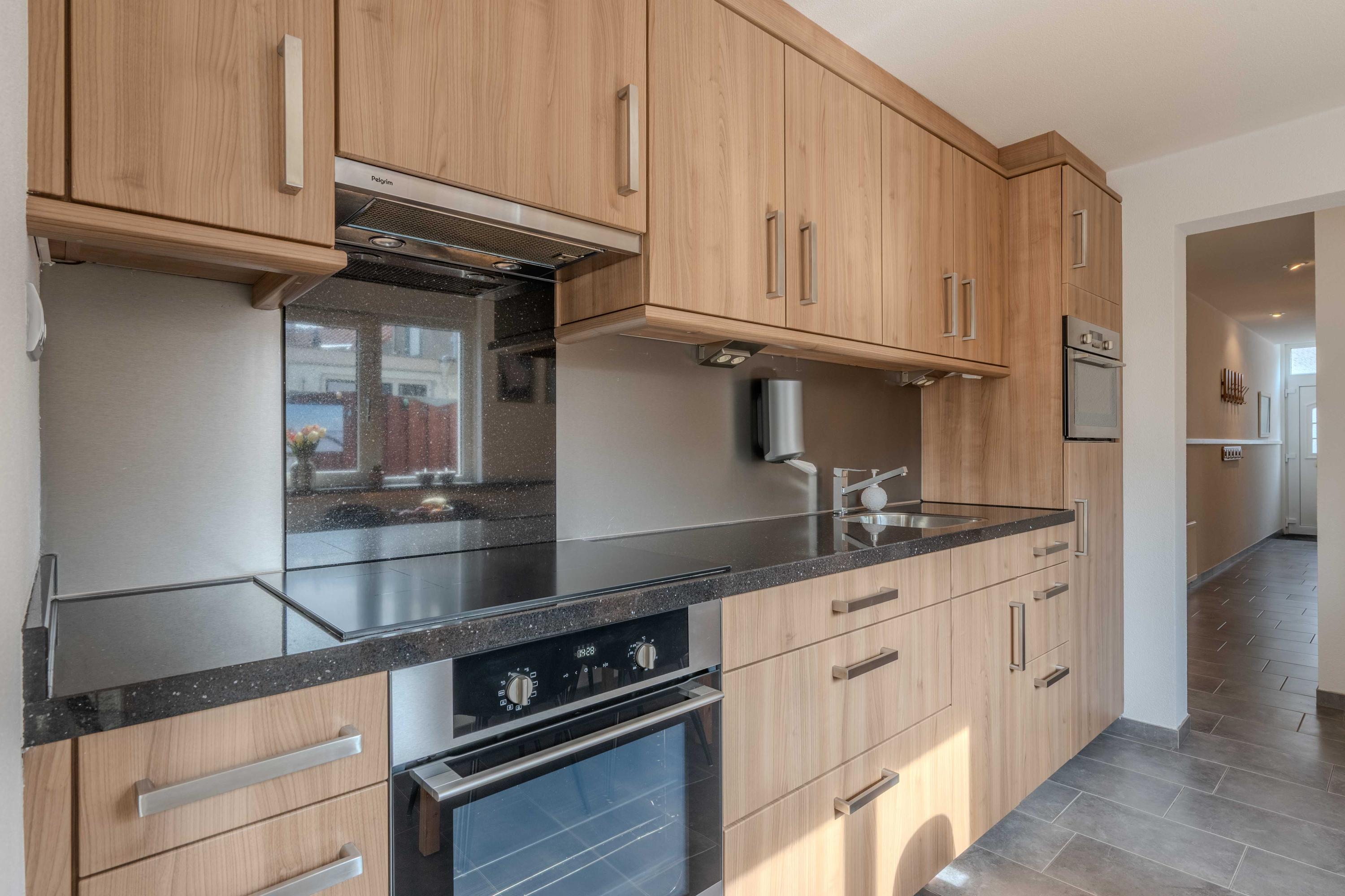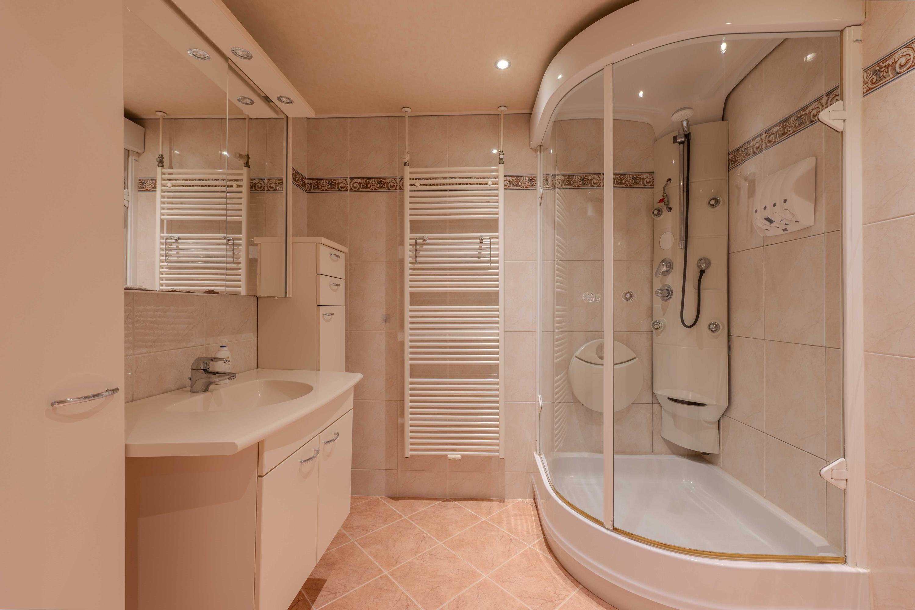 De keuken (circa 2000) is voorzien van een oven, Pelgrim inductiekookplaat, afzuigkap, losse vaatwasser (blijft achter), combimagnetron en koelkast met vriesvak. Aan de andere zijde van de keuken is er een hal met toilet, bergruimte en een deur naar de plaats. Als u verder doorloopt naar achter, komt u in een halletje met de CV-ketel (circa 11 jaar) en de badkamer. De badkamer is voorzien van een toilet, douche en wastafel. Ook is er een mooi spanplafond aangebracht.