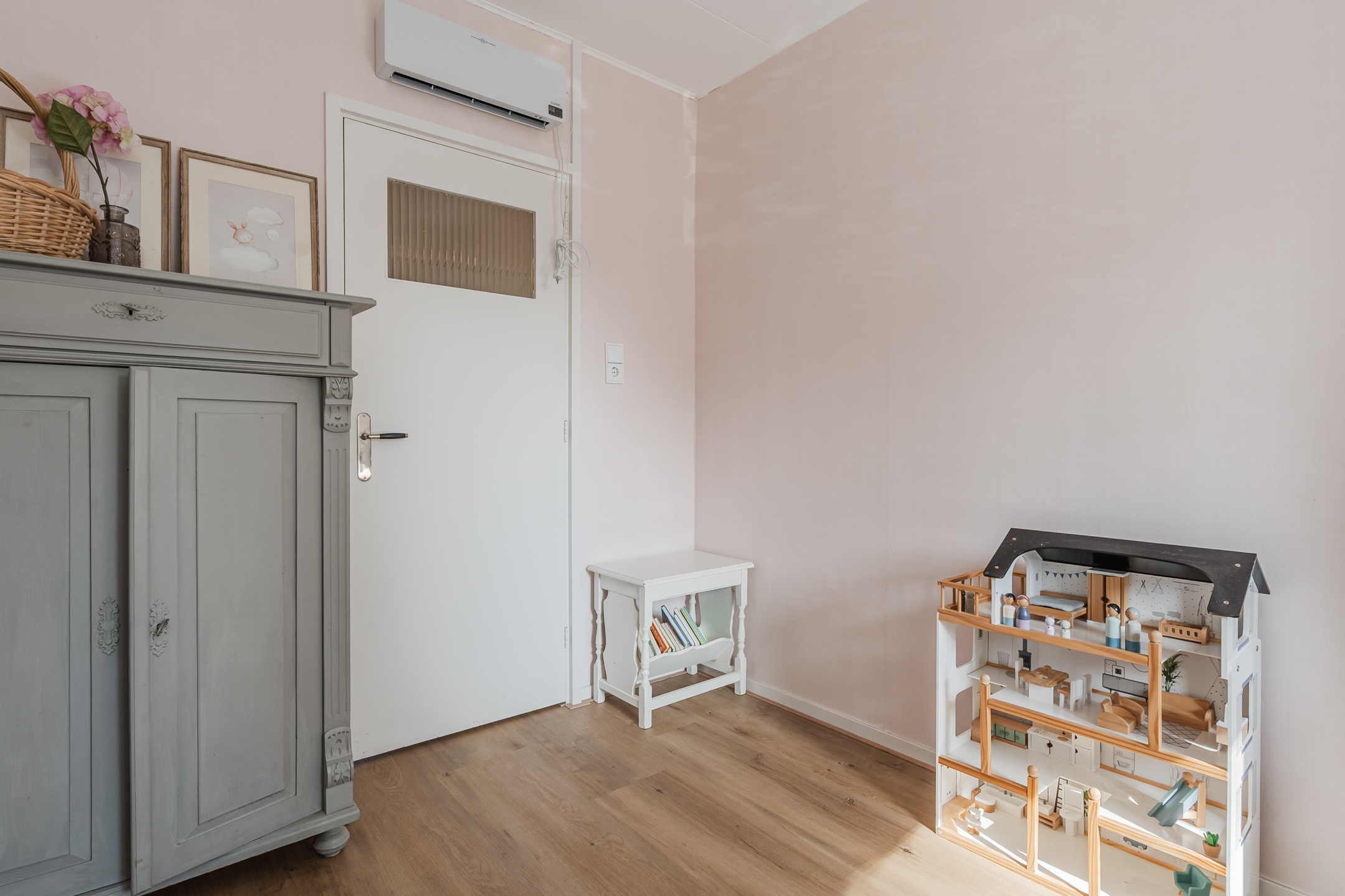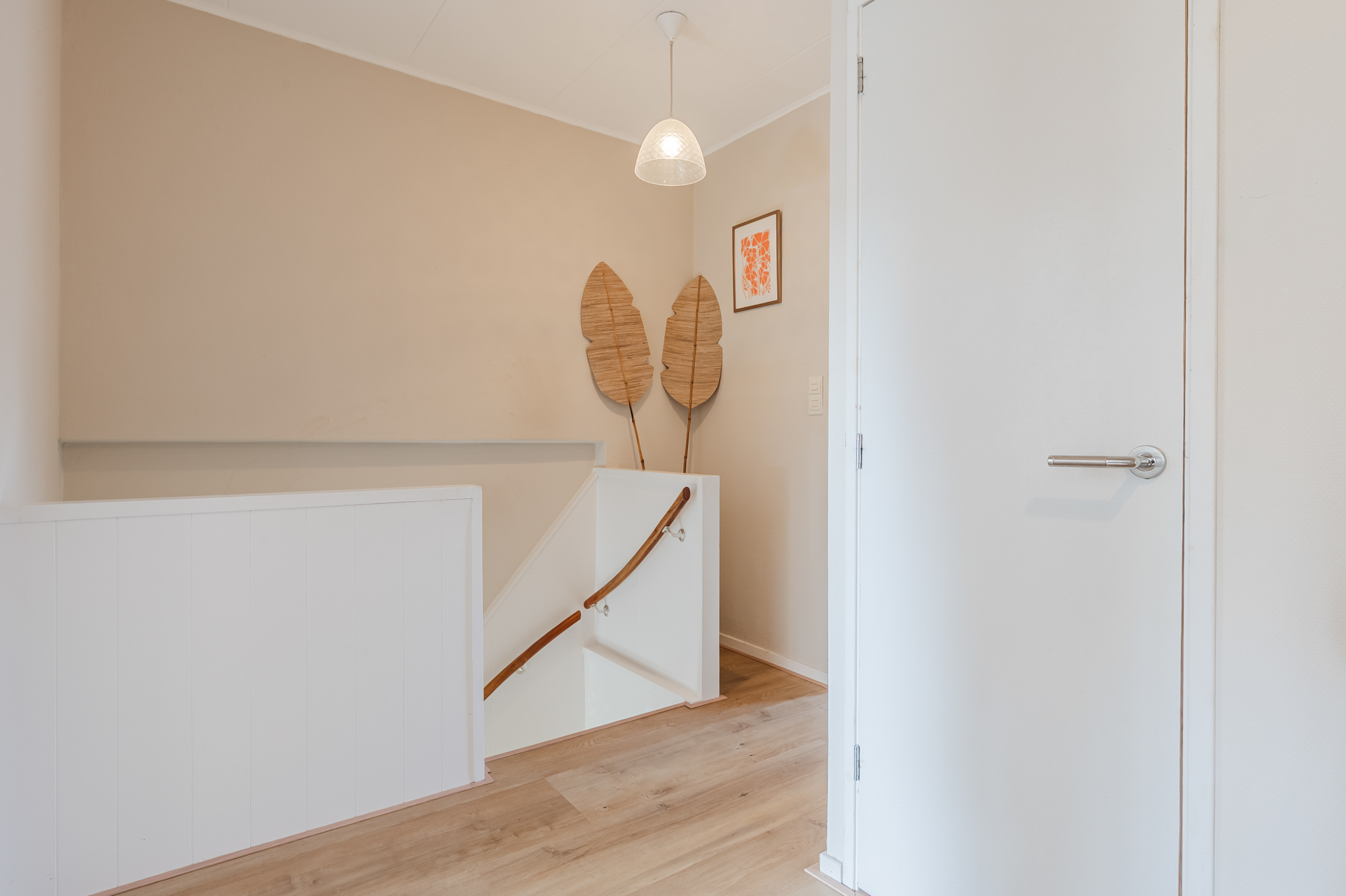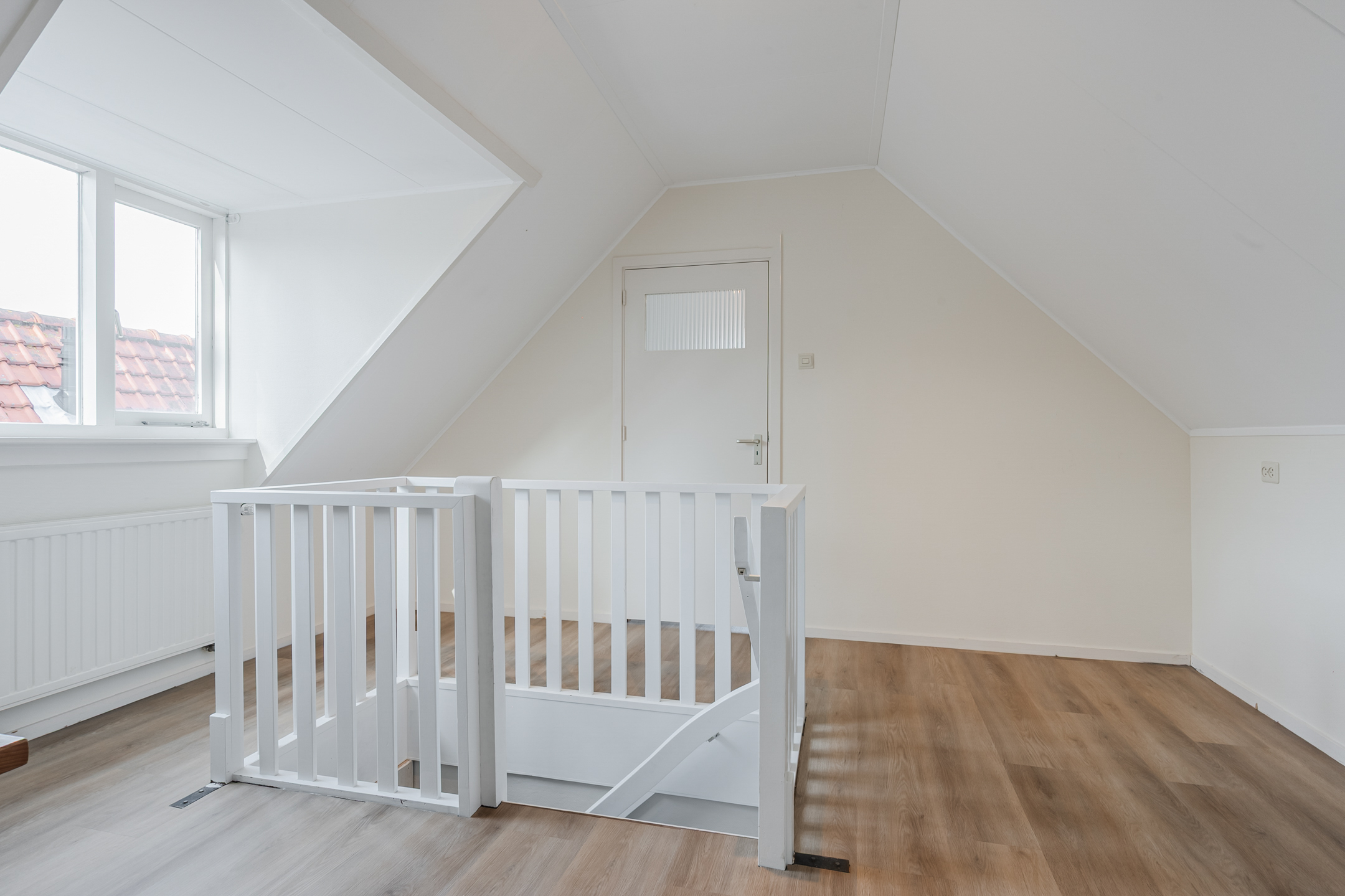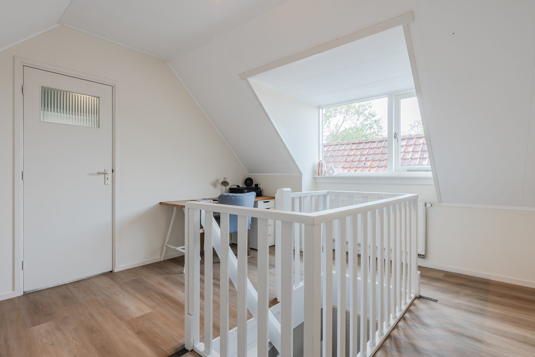 Ruime overloop met praktische bergkast. Er zijn vier slaapkamers, waarvan één momenteel in gebruik kledingkamer. Vanuit deze deze kamer is ook het dakterras te bereiken. De complete badkamer is voorzien van een ligbad, wastafelmeubel, toilet en wasmachine-aansluiting. De gehele verdieping is afgewerkt met een onderhoudsvriendelijke PVC-vloer.