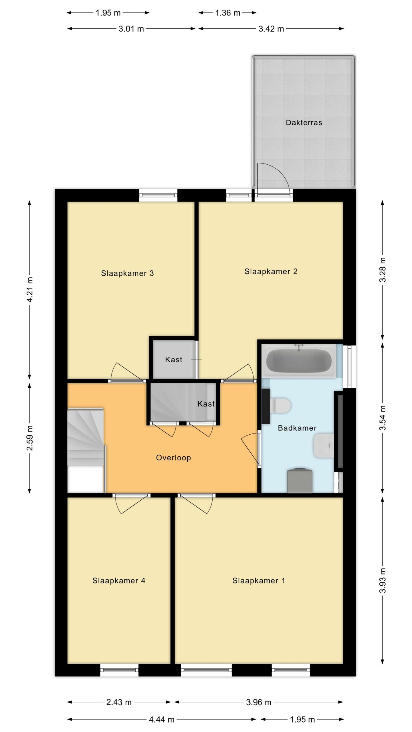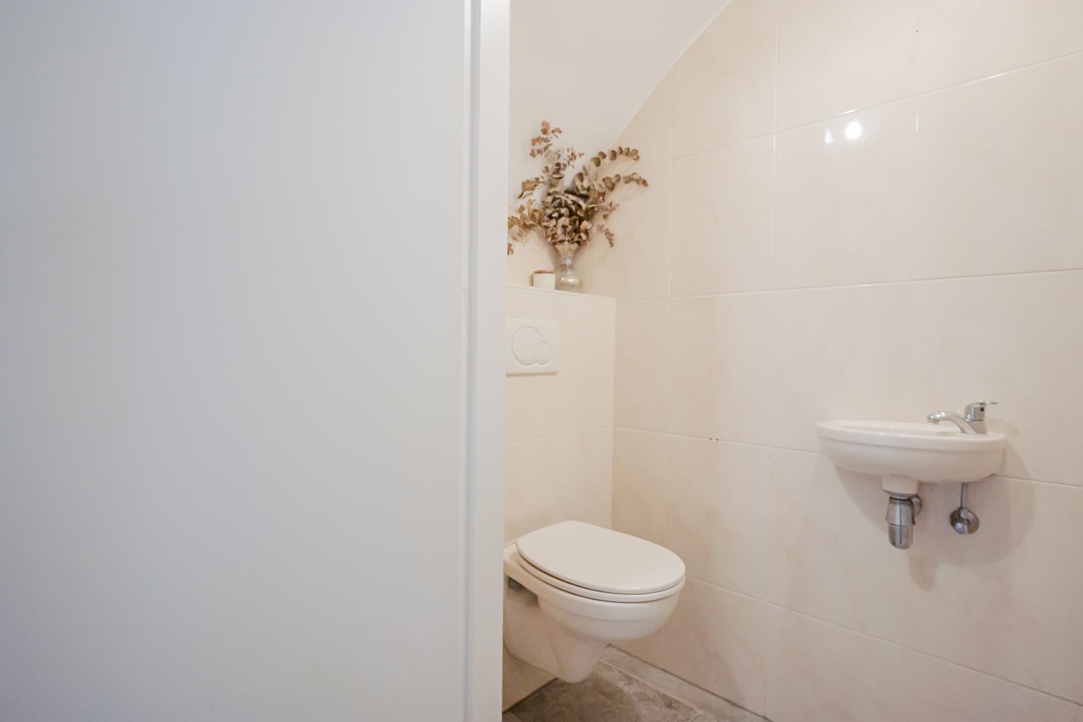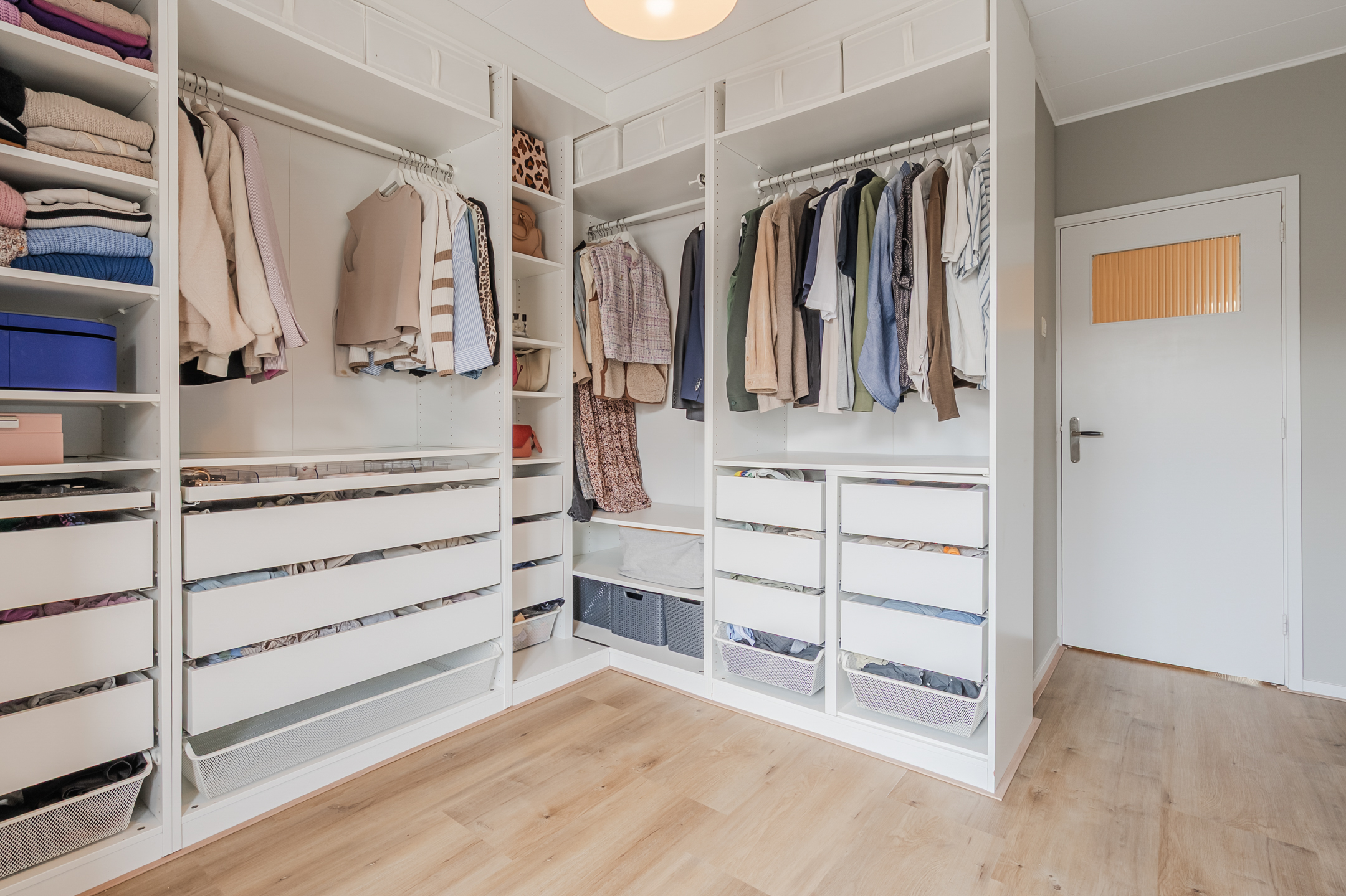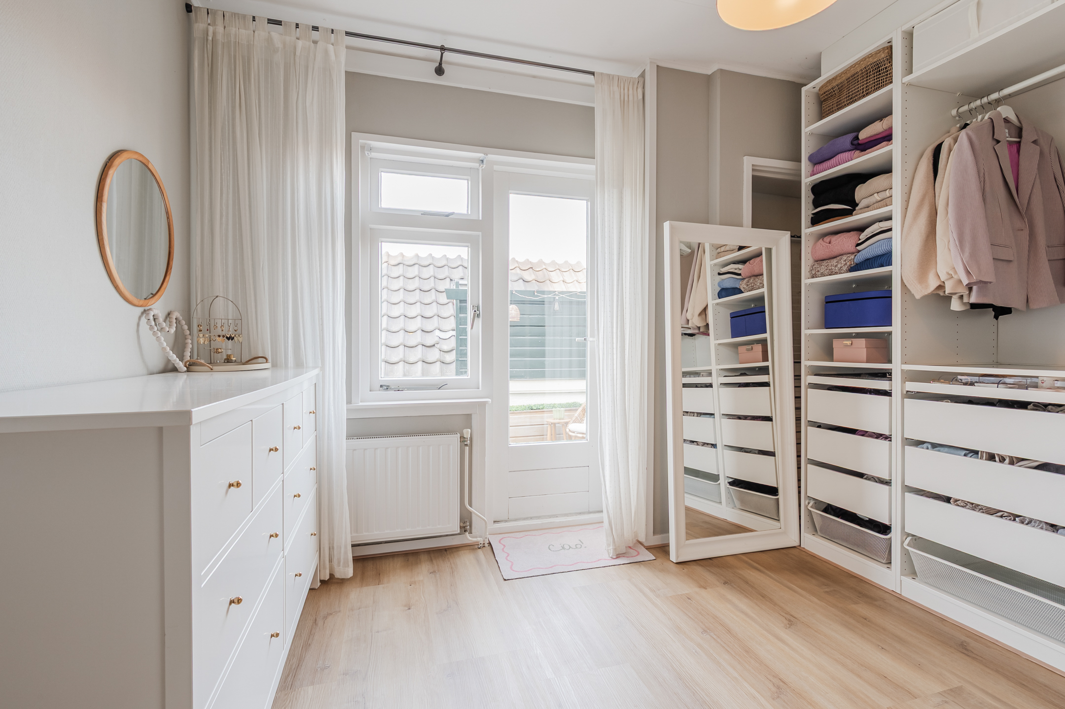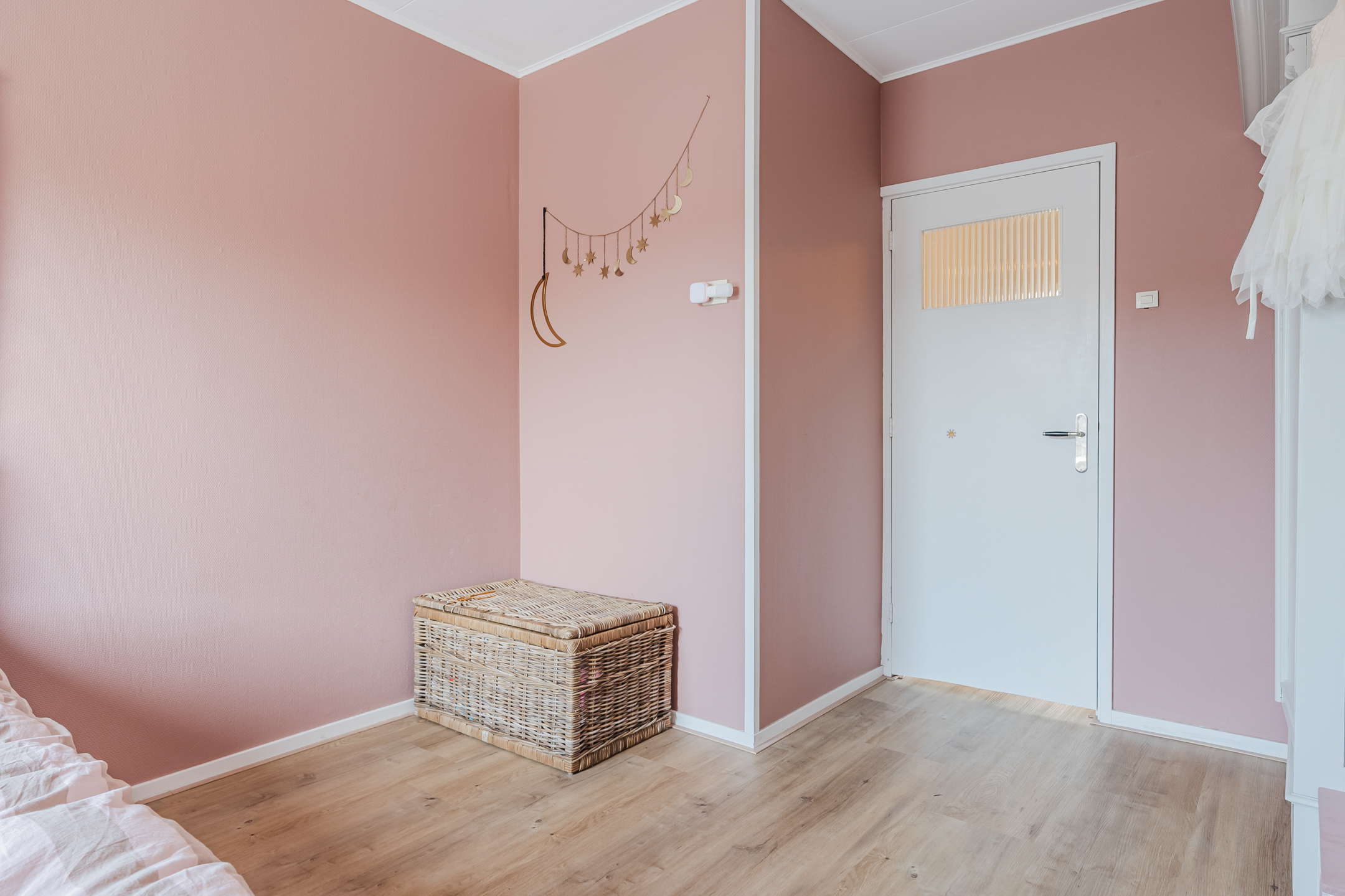 Ruime overloop met praktische bergkast. Er zijn vier slaapkamers, waarvan één momenteel in gebruik kledingkamer. Vanuit deze deze kamer is ook het dakterras te bereiken. De complete badkamer is voorzien van een ligbad, wastafelmeubel, toilet en wasmachine-aansluiting. De gehele verdieping is afgewerkt met een onderhoudsvriendelijke PVC-vloer.