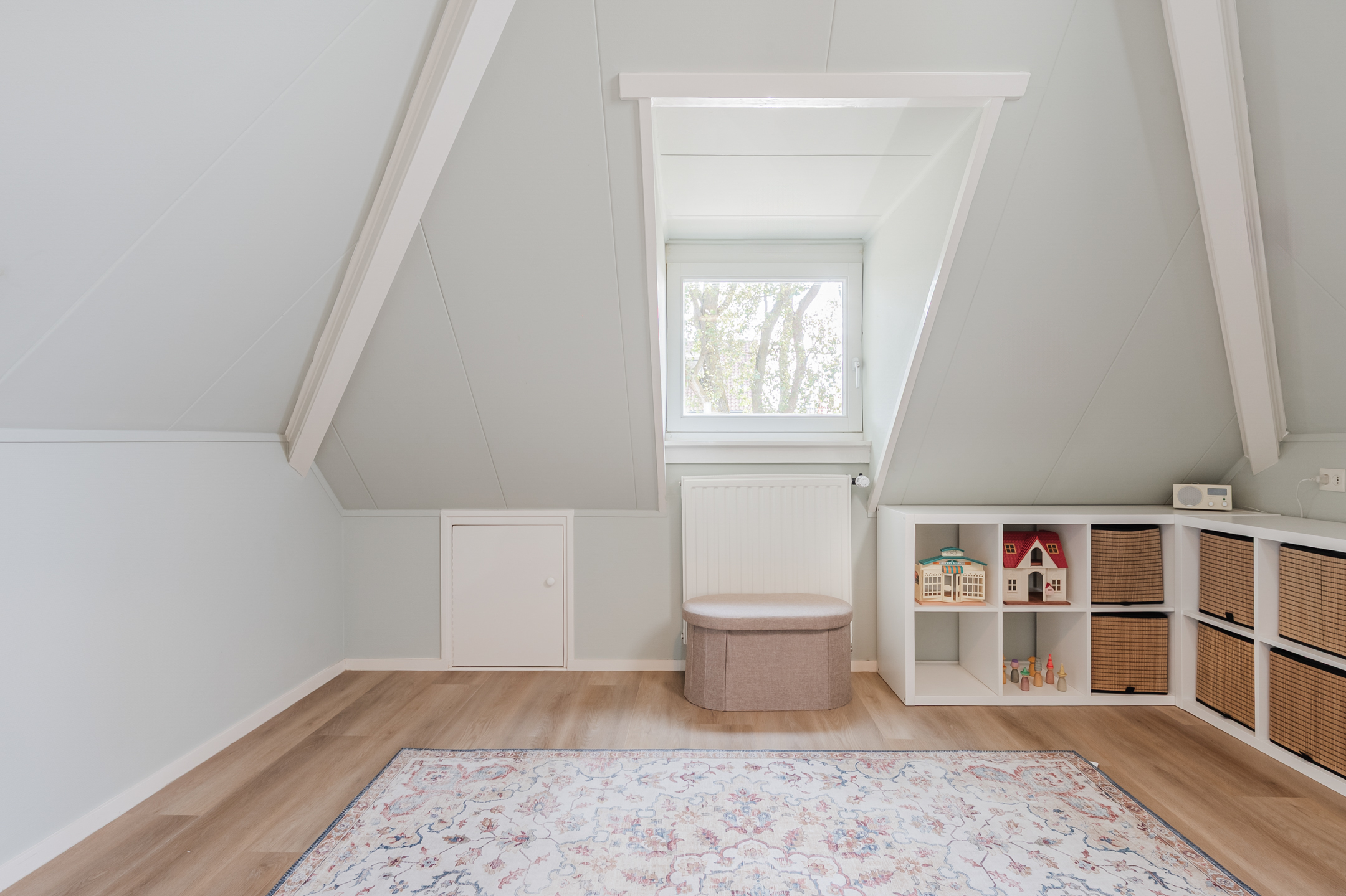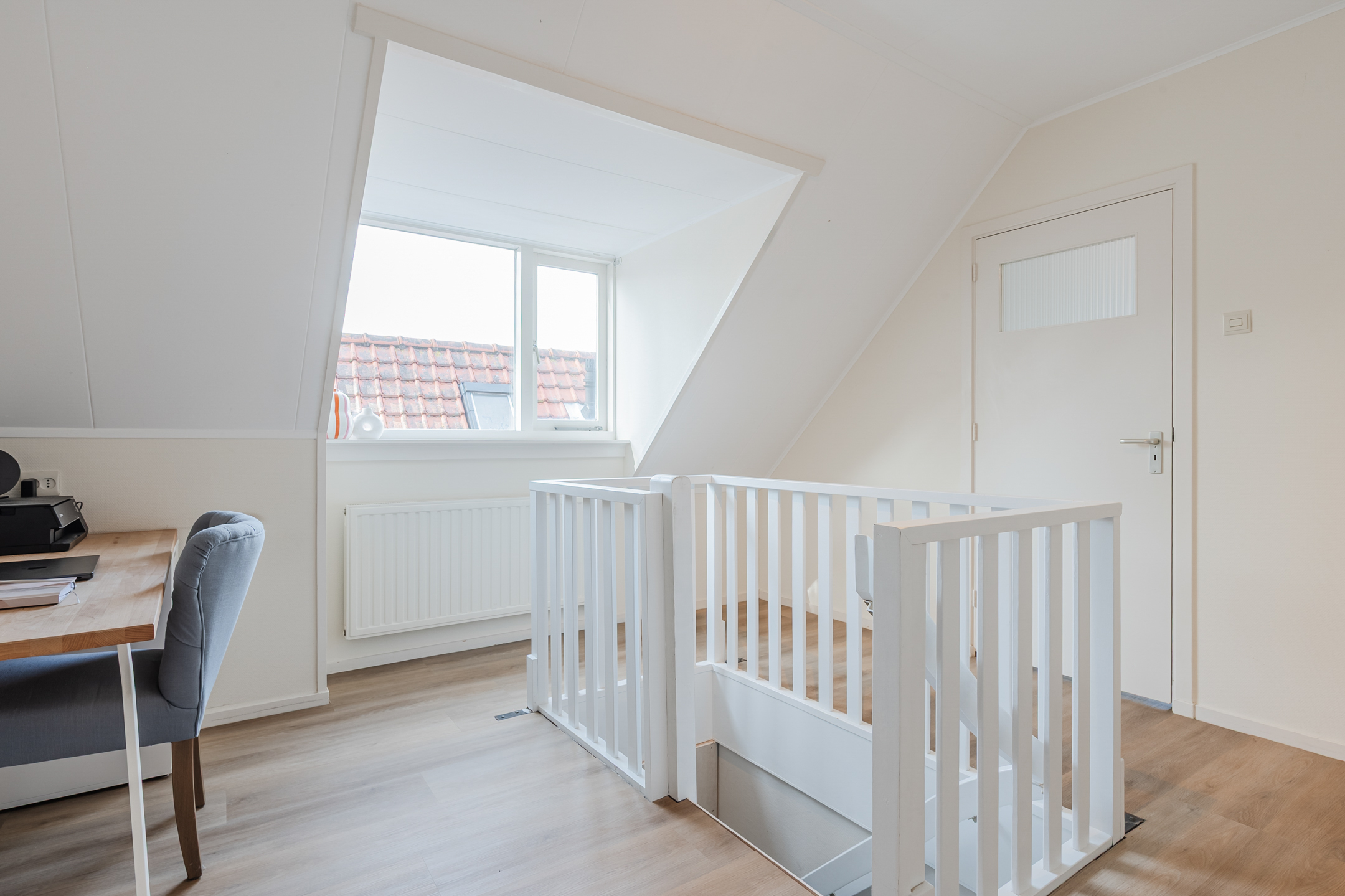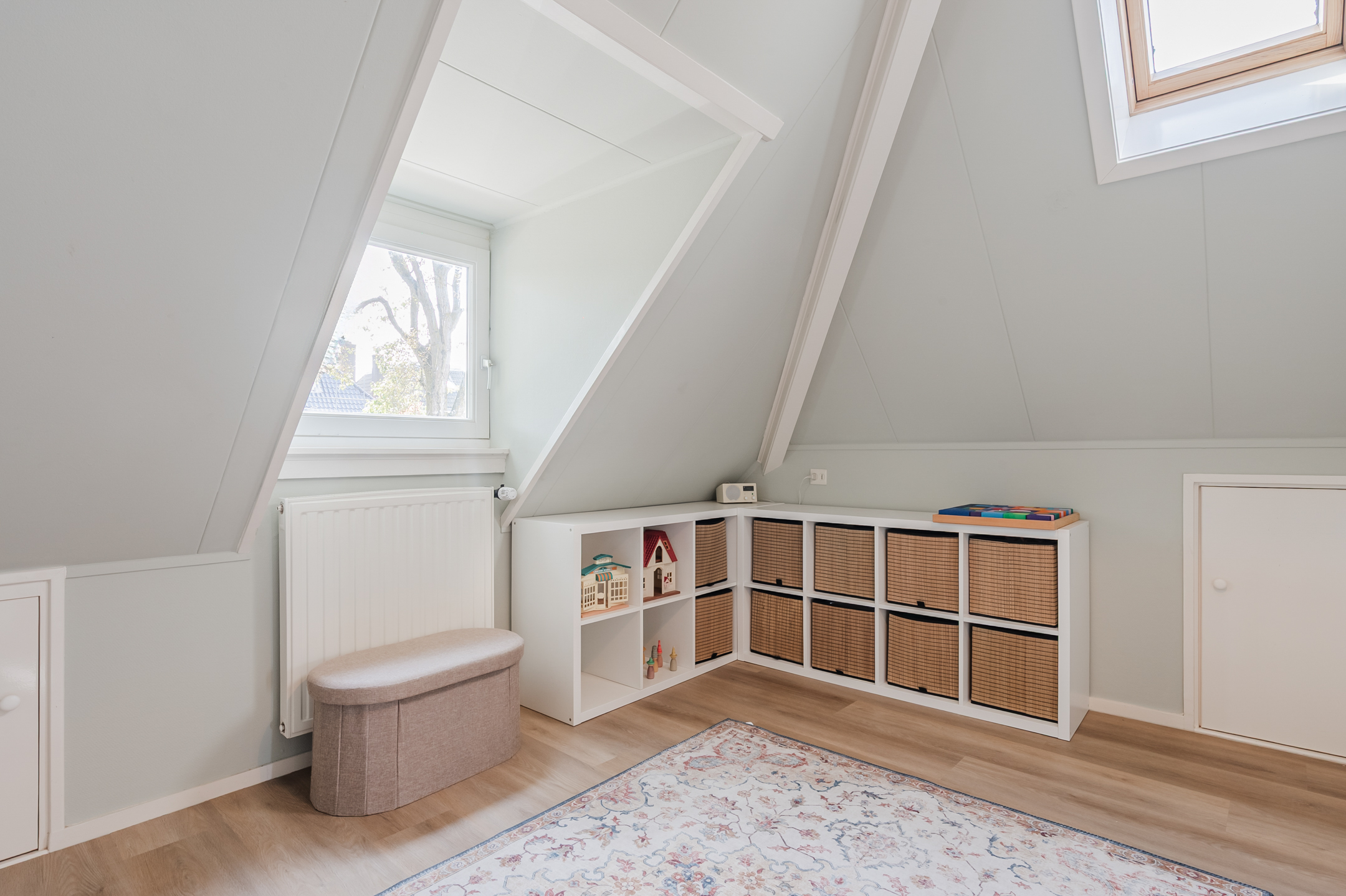 Via een vaste trap bereikt u de verrassend ruime zolderverdieping met overloop, twee volwaardige slaapkamers en veel bergruimte. Ook deze verdieping is voorzien van een onderhoudsvriendelijke PVC-vloer.
