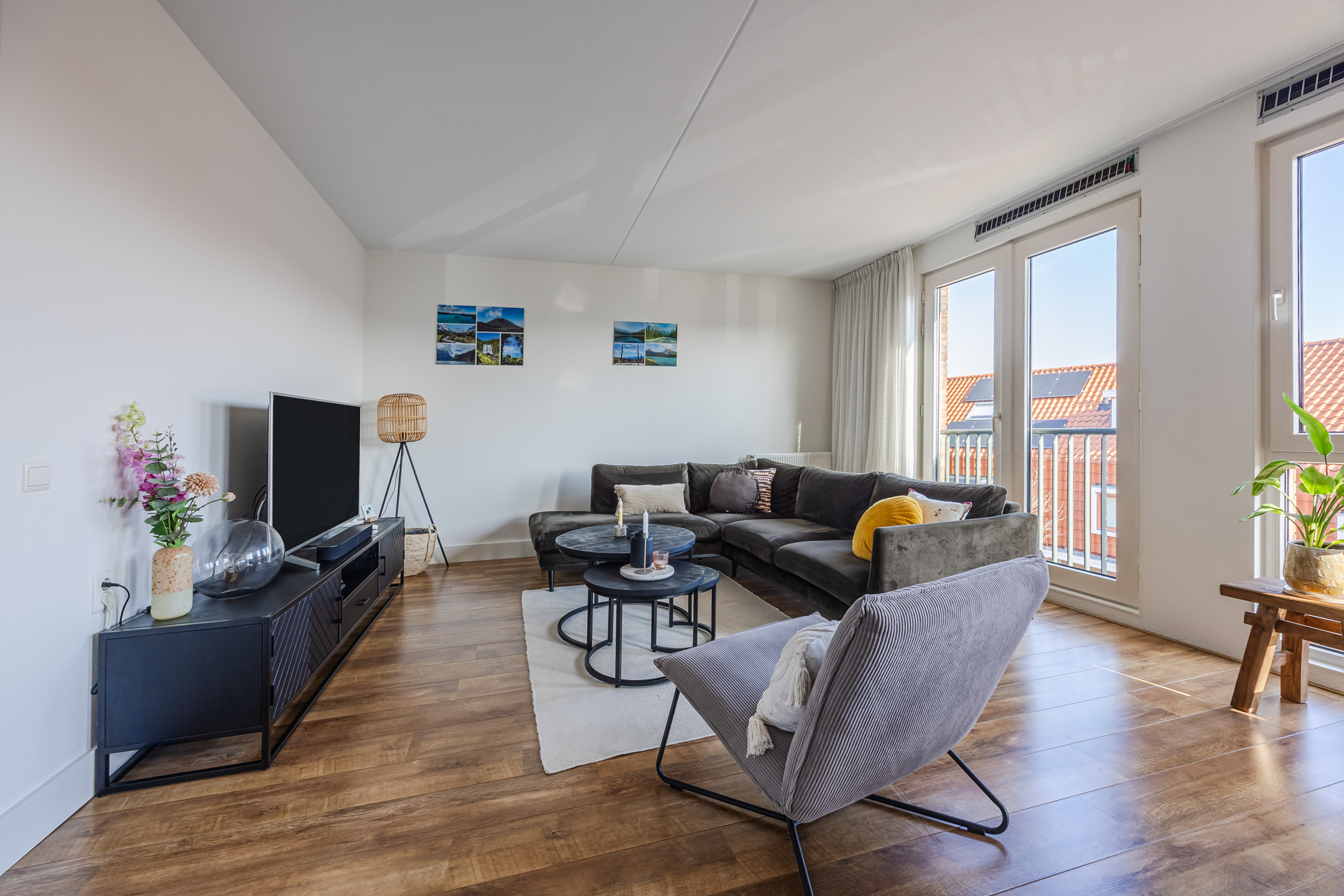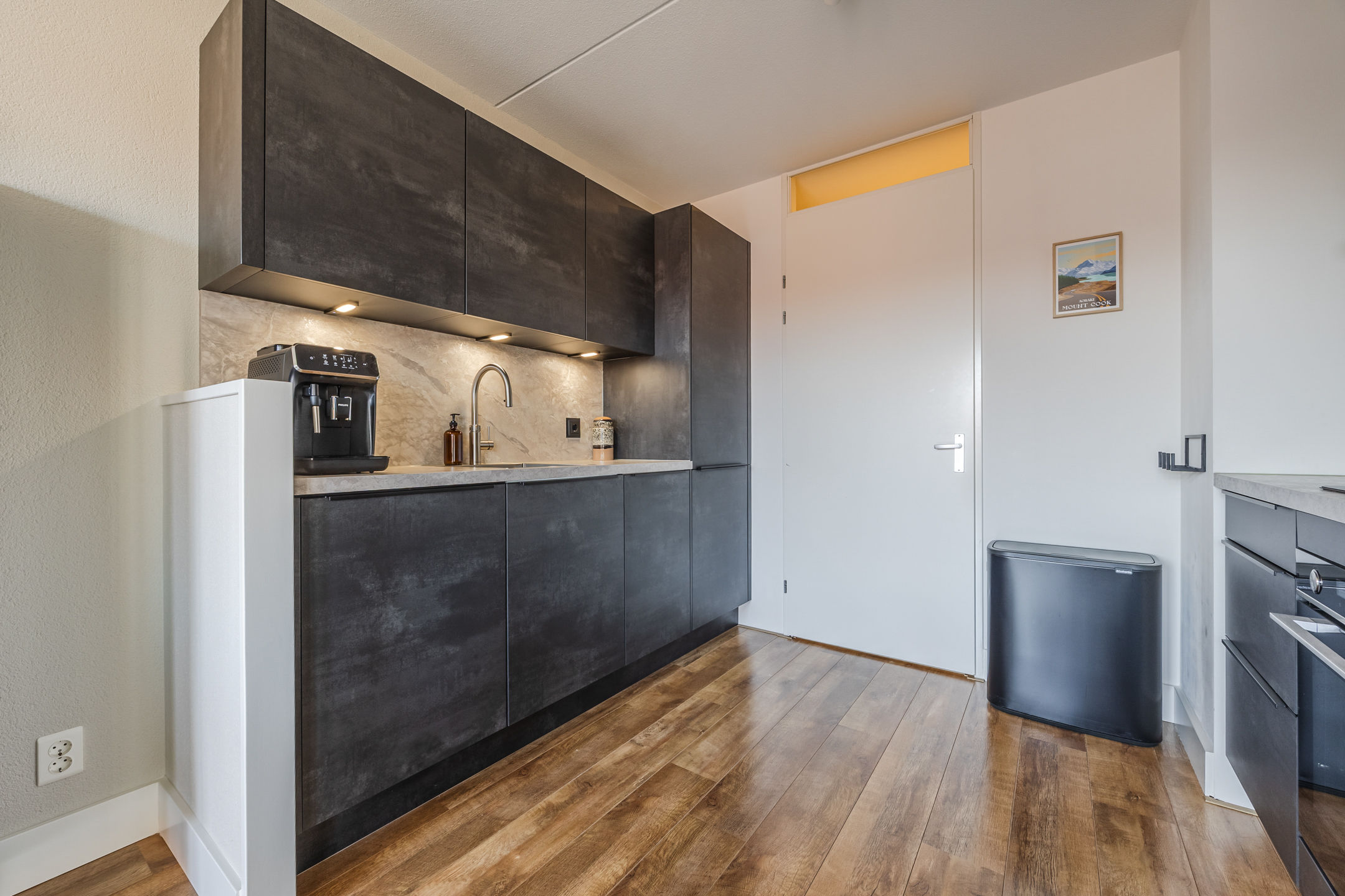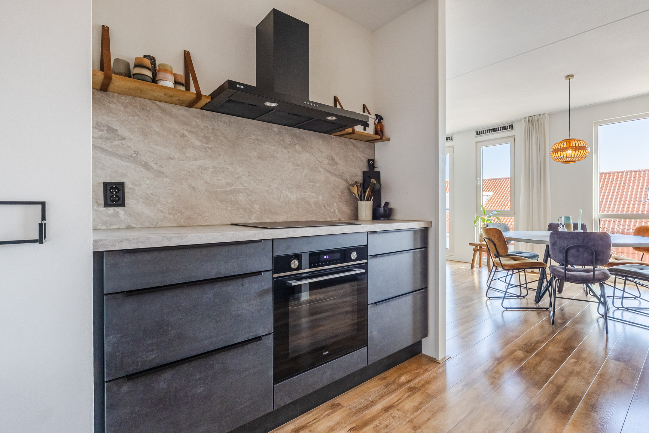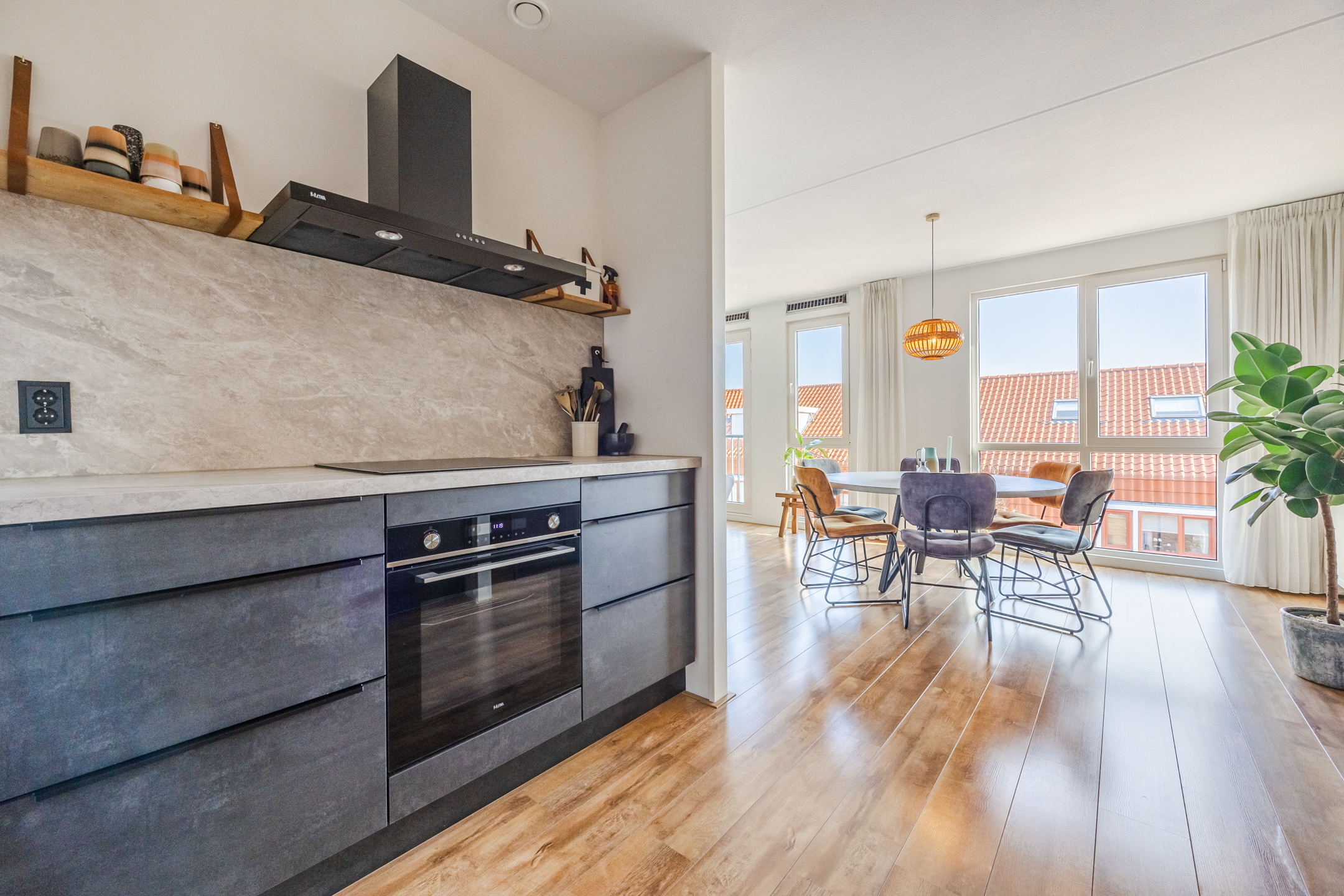 De woonkamer beschikt over grote raampartijen en een Frans balkon, waardoor er veel natuurlijk licht binnenvalt. De open keuken (bouwjaar 2023) is voorzien van diverse inbouwapparatuur, waaronder een inductiekookplaat, oven, afzuigkap, Quooker, vaatwasser, vriezer en koelkast.