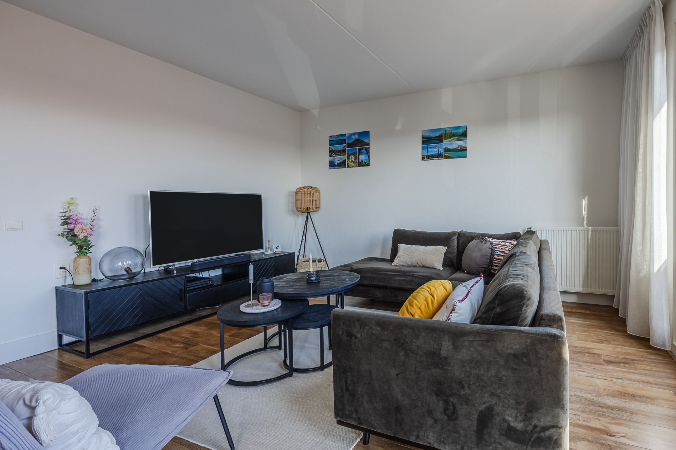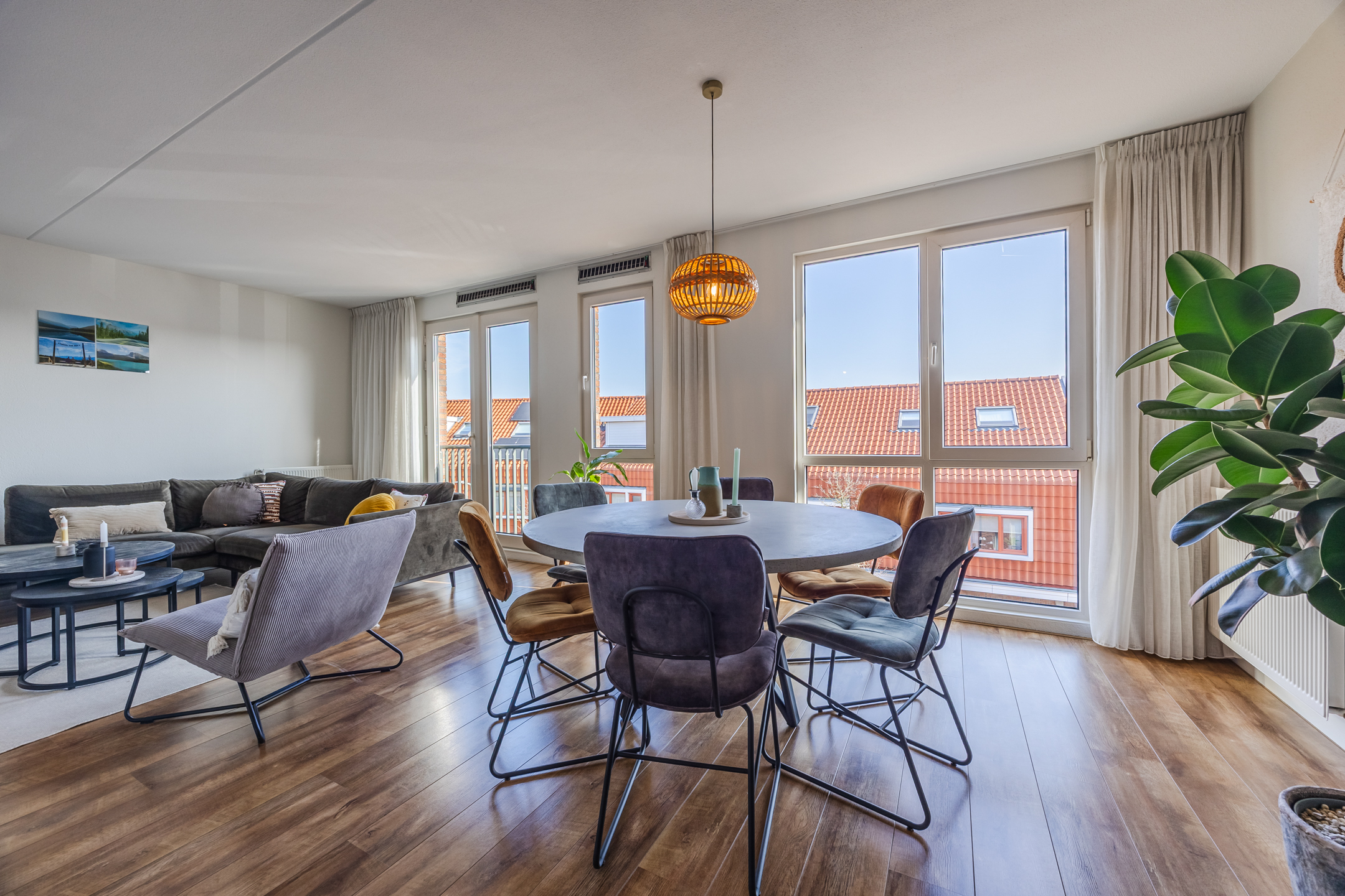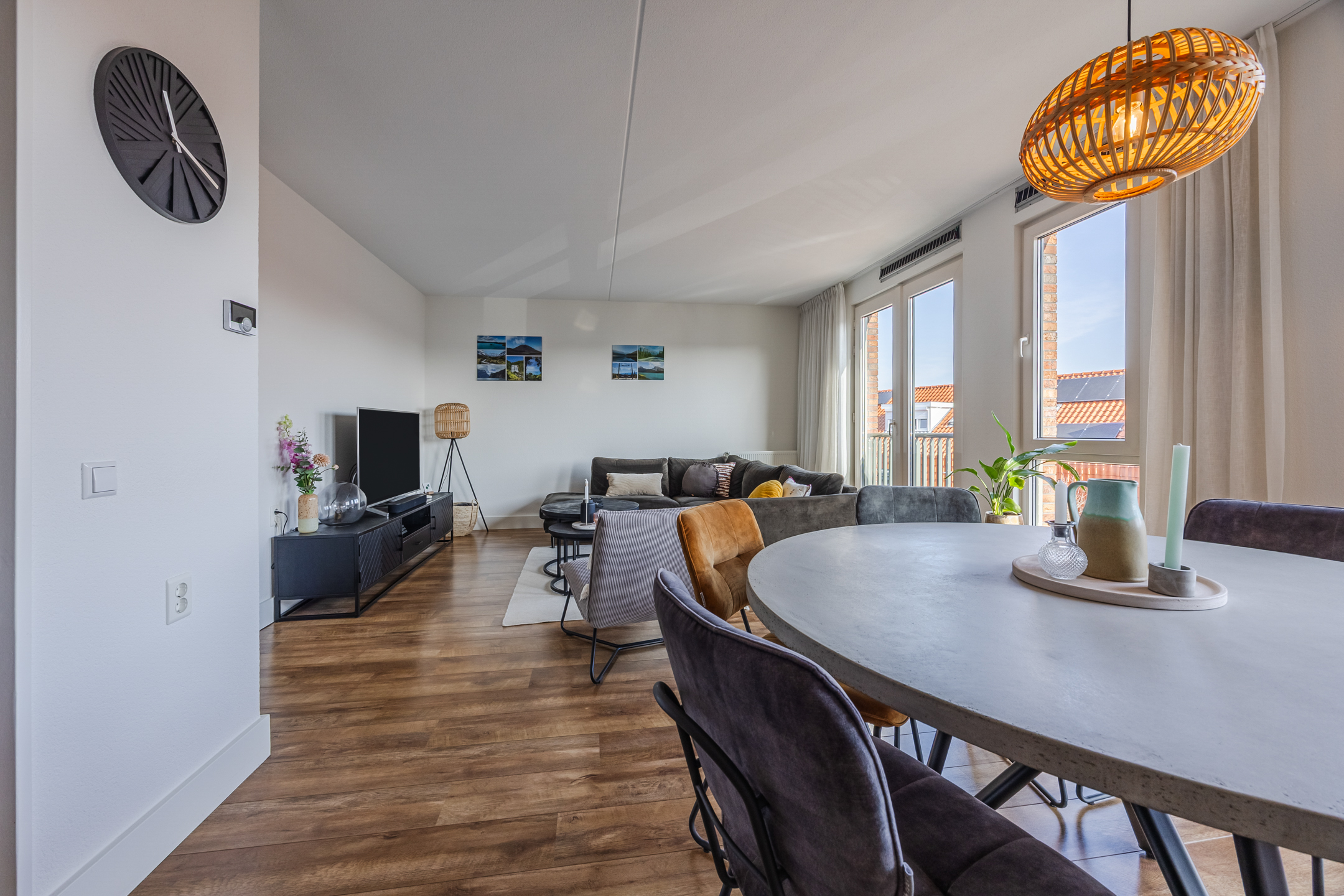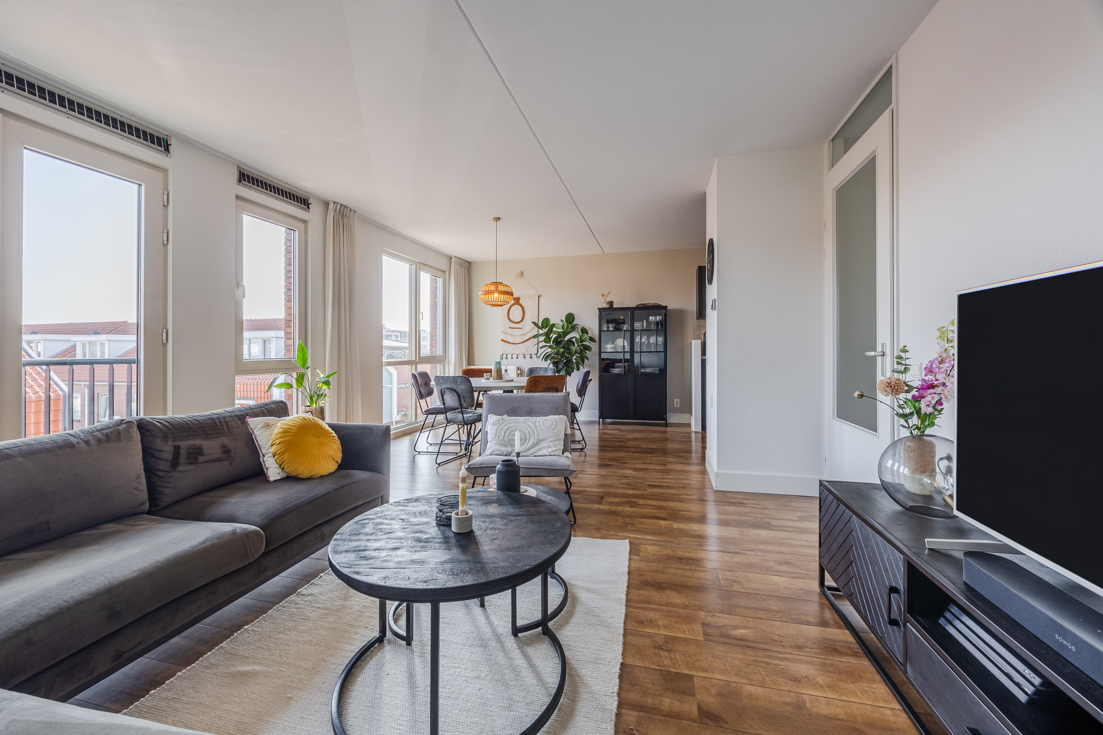 De woonkamer beschikt over grote raampartijen en een Frans balkon, waardoor er veel natuurlijk licht binnenvalt. De open keuken (bouwjaar 2023) is voorzien van diverse inbouwapparatuur, waaronder een inductiekookplaat, oven, afzuigkap, Quooker, vaatwasser, vriezer en koelkast.