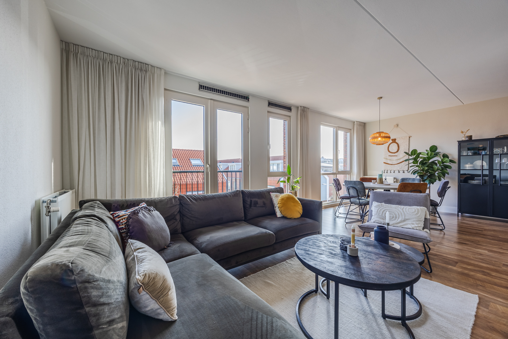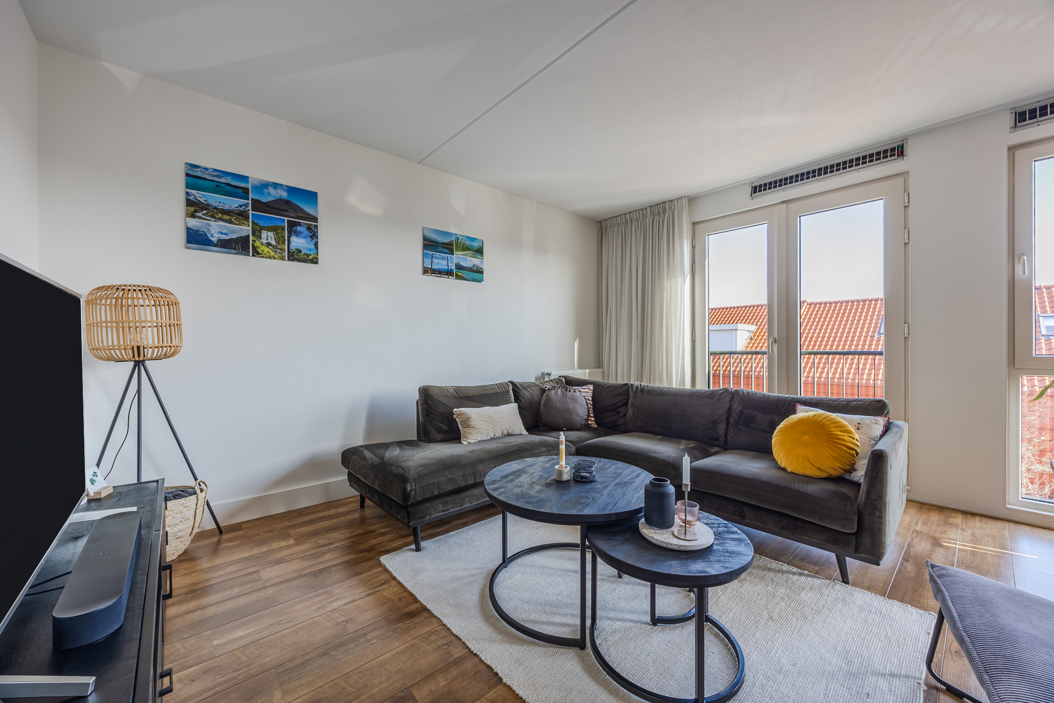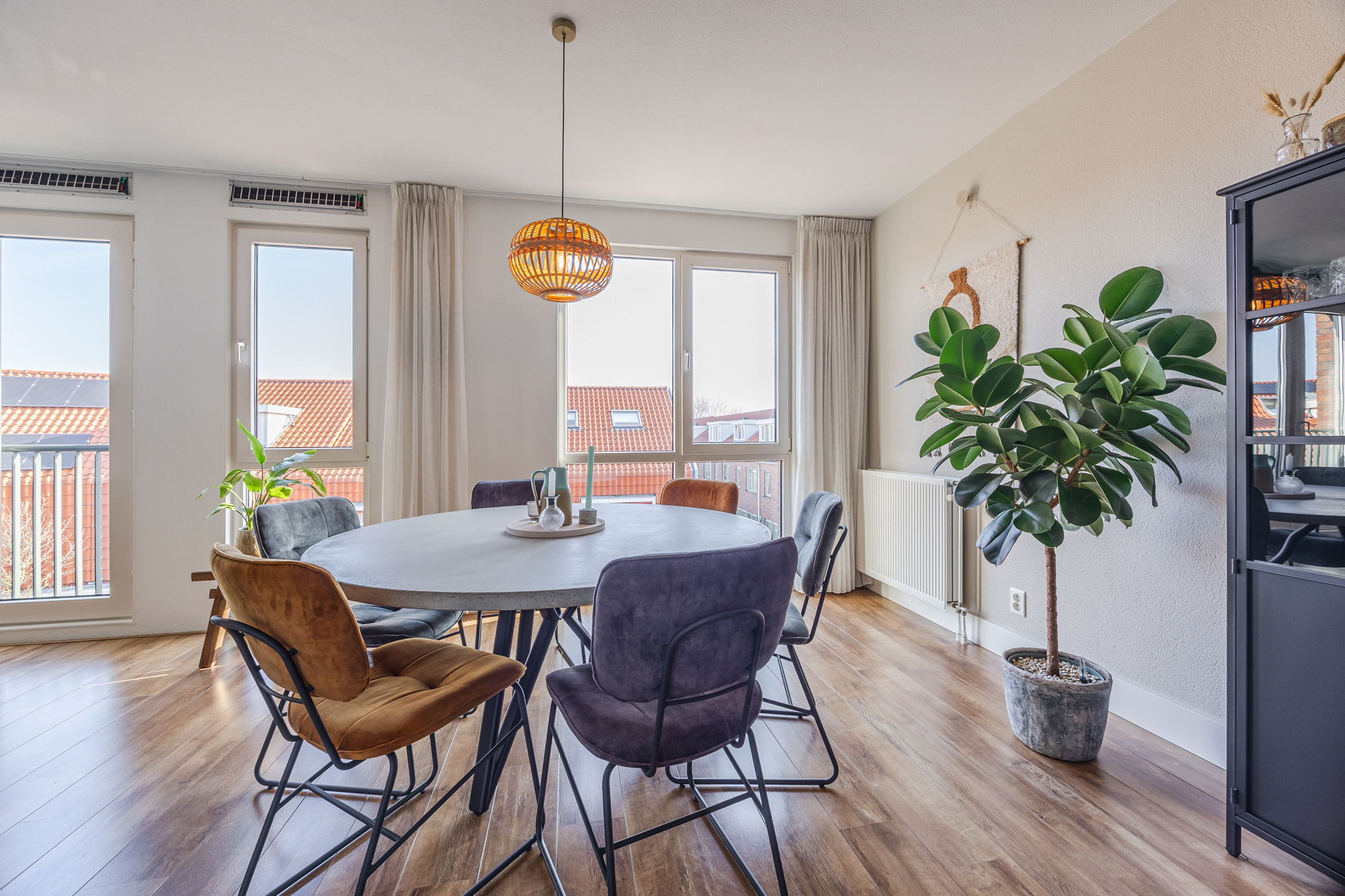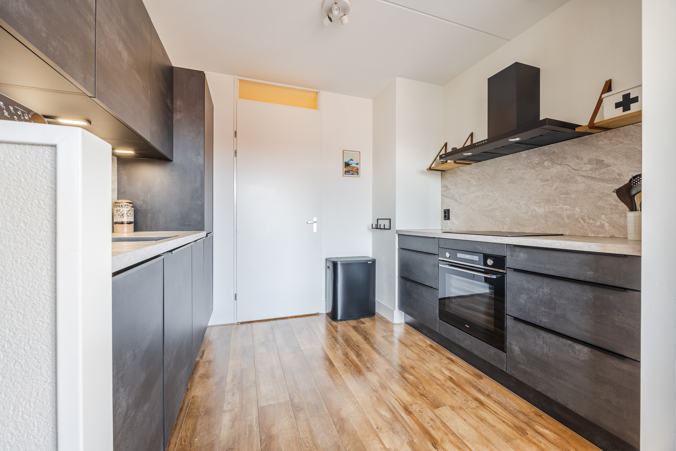 De woonkamer beschikt over grote raampartijen en een Frans balkon, waardoor er veel natuurlijk licht binnenvalt. De open keuken (bouwjaar 2023) is voorzien van diverse inbouwapparatuur, waaronder een inductiekookplaat, oven, afzuigkap, Quooker, vaatwasser, vriezer en koelkast.