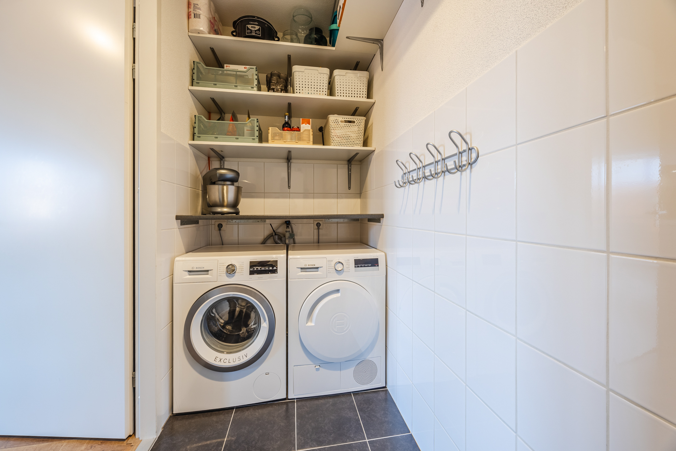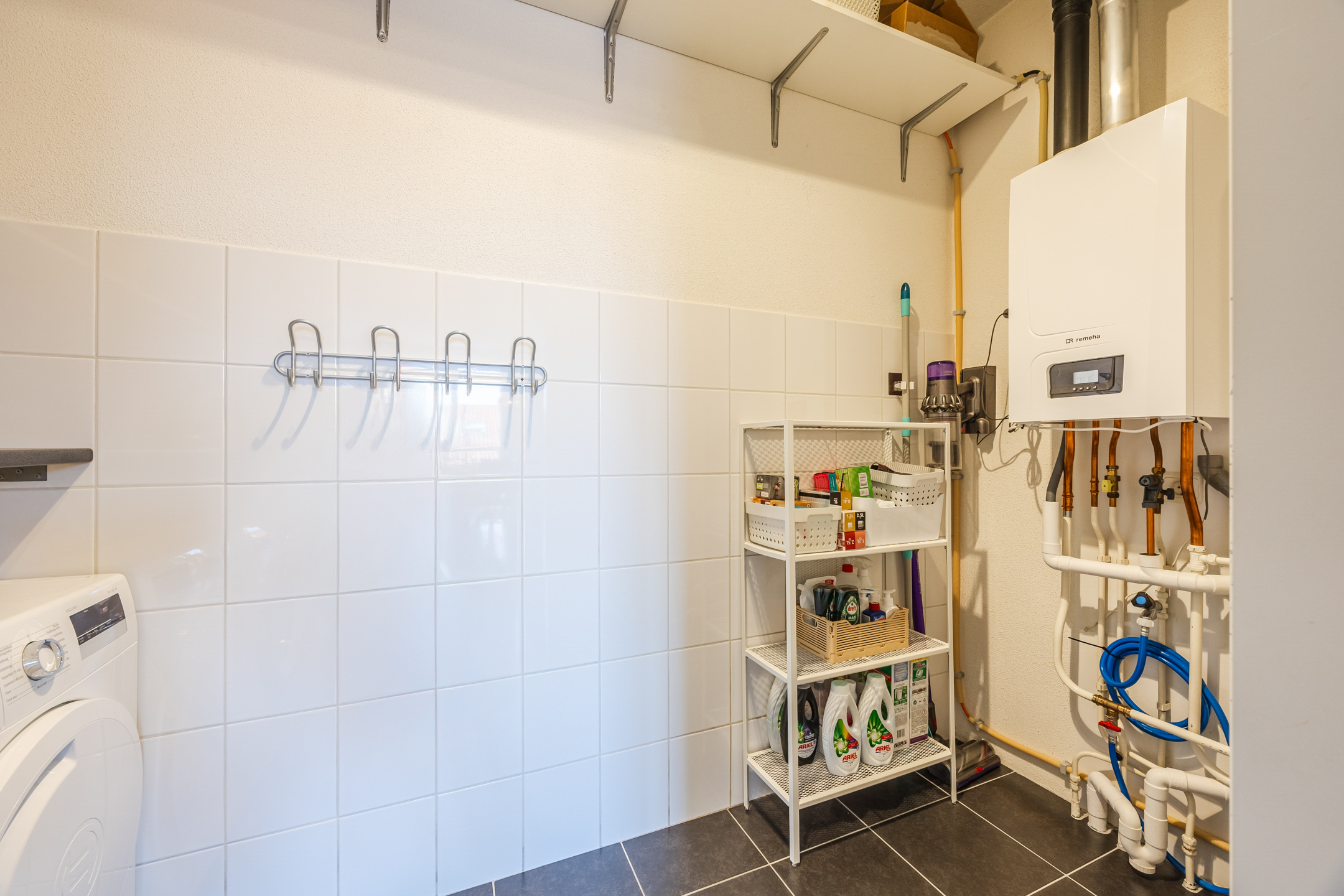 Achter de keuken bevindt zich een ruime berging met de cv-ketel (2023) en de aansluitingen voor de wasmachine en droger.