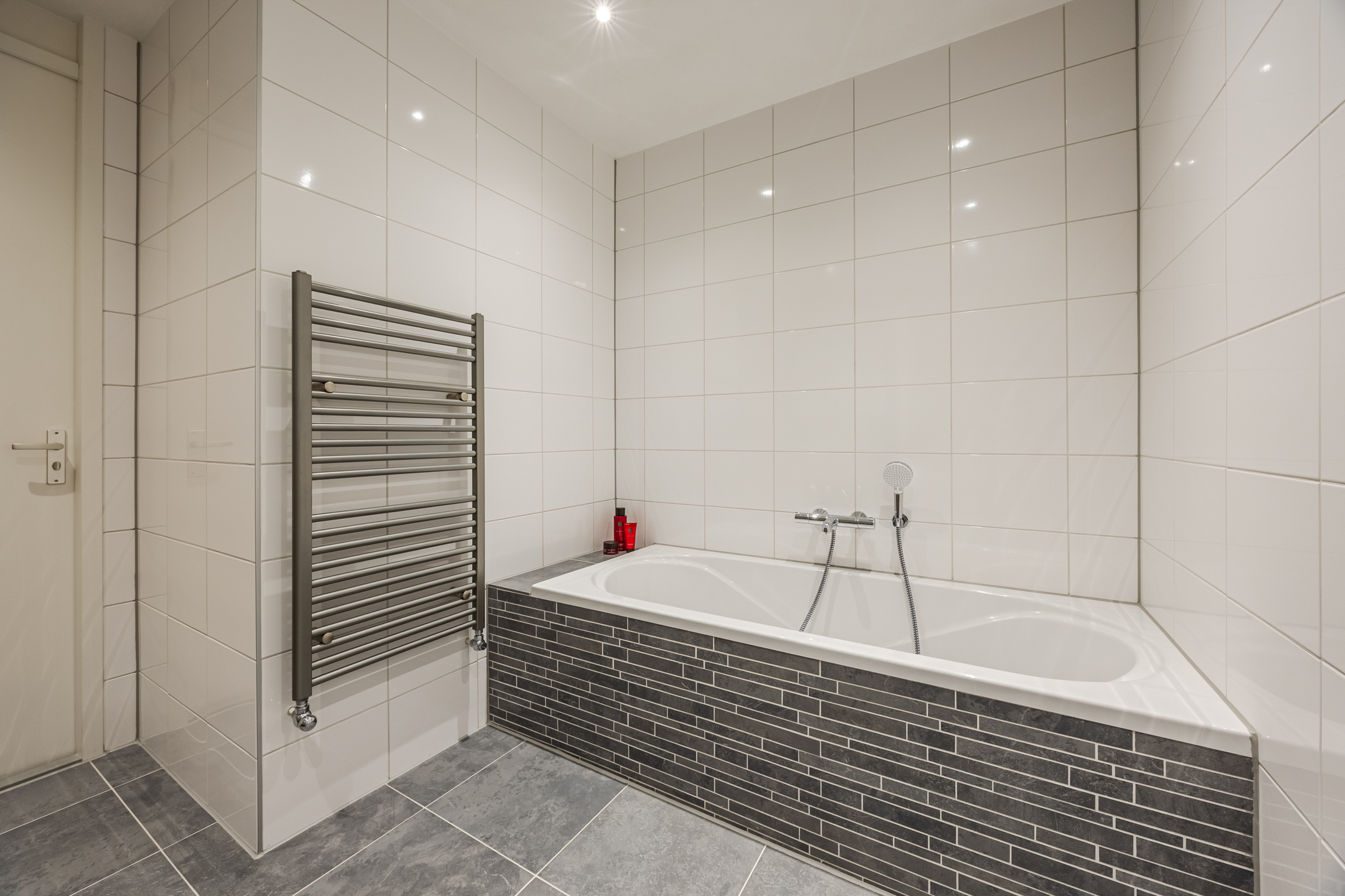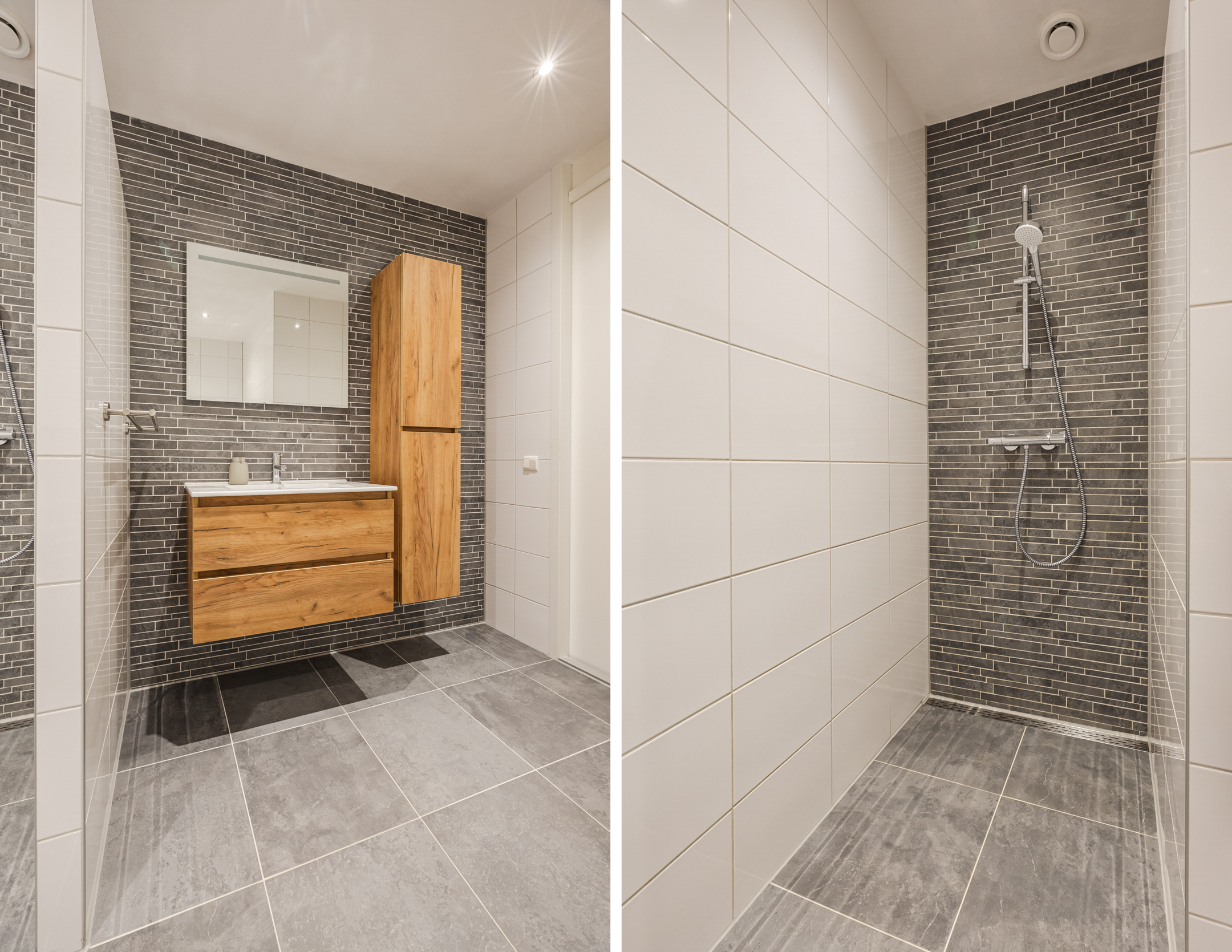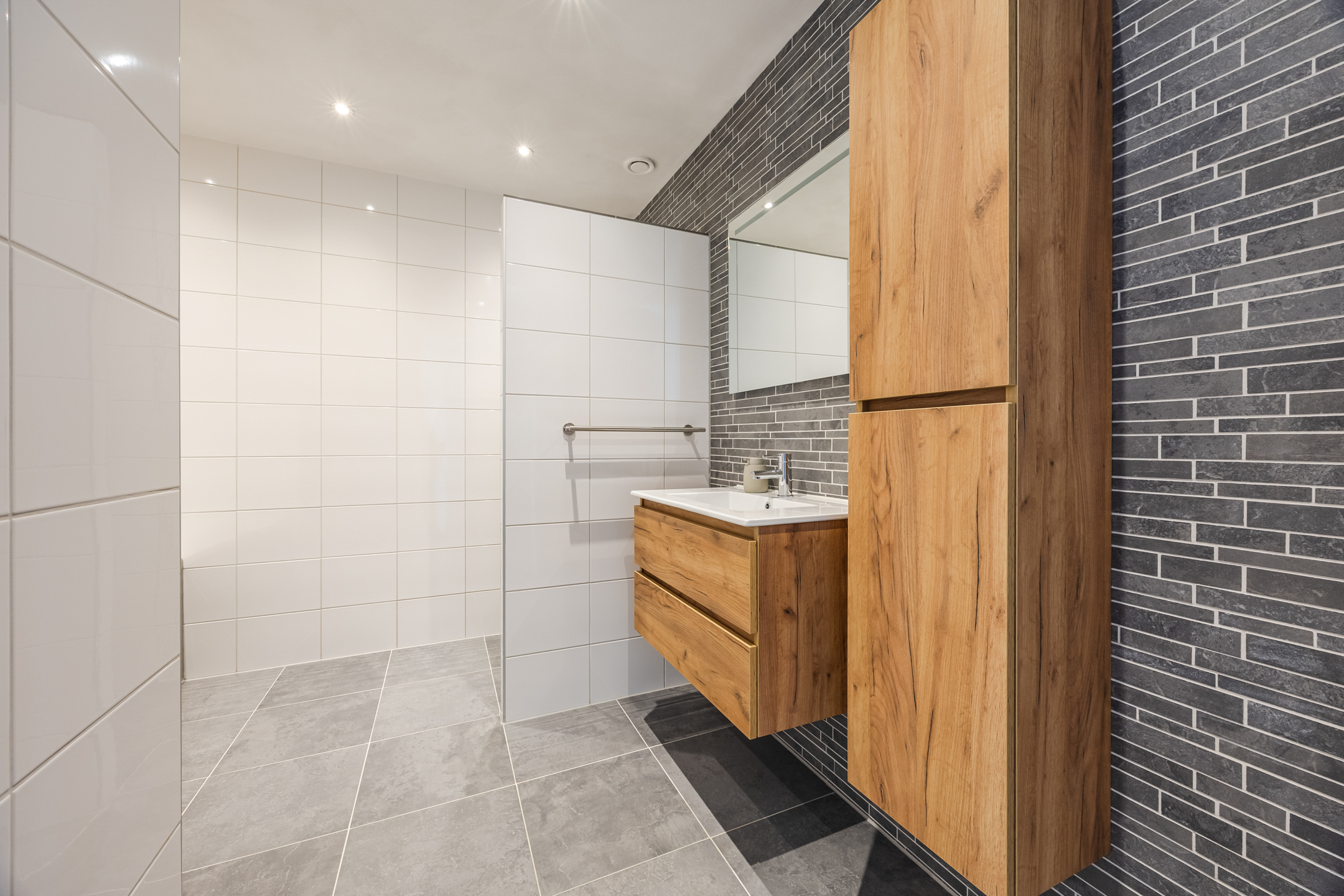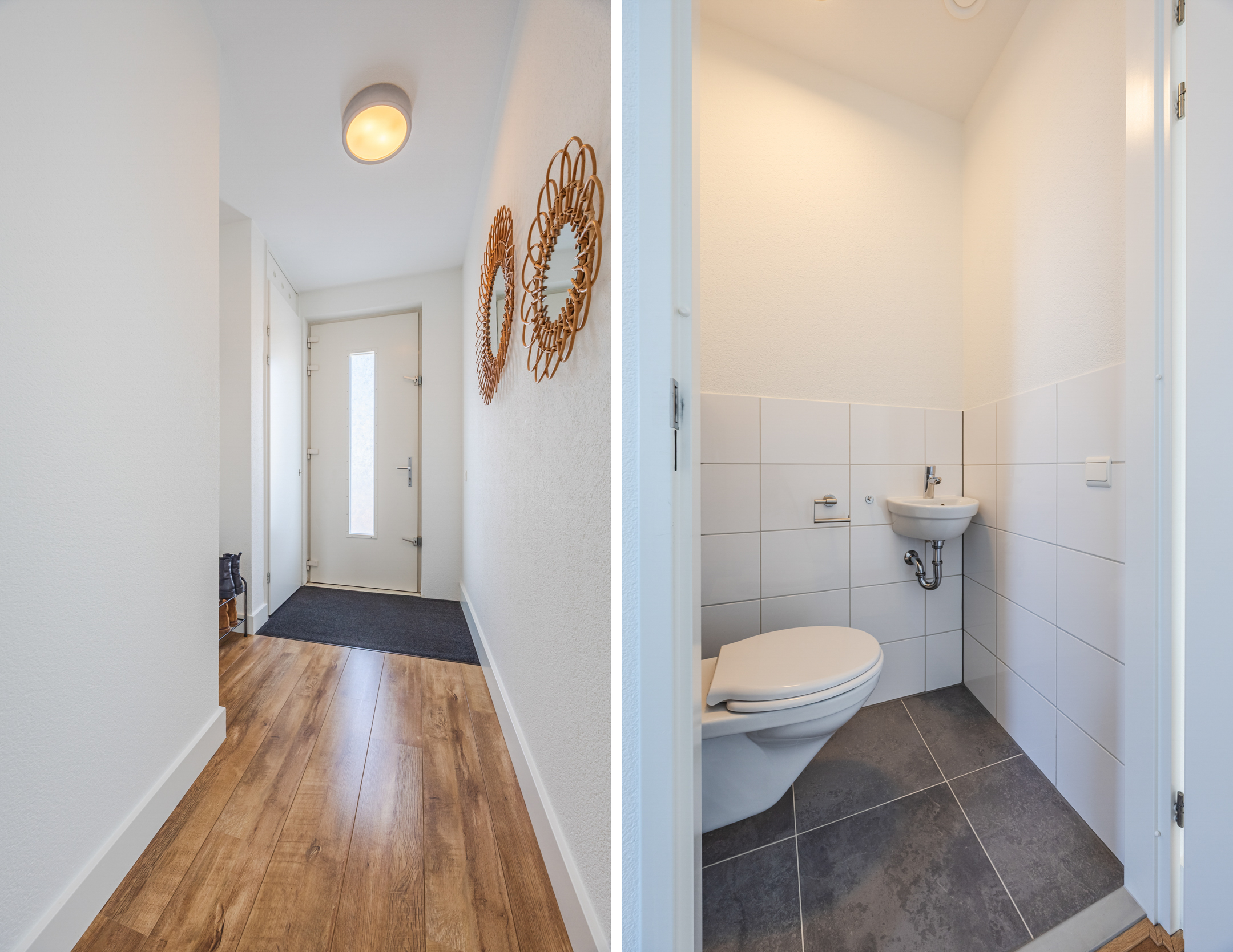 De woning komt u binnen in een ruime hal met meterkast. Aan deze zijde bevinden zich tevens twee ruime slaapkamers, beide voorzien van rolluiken. Verder is er een separaat toilet met fonteintje en een ruime badkamer met ligbad, inloopdouche en wastafelmeubel.