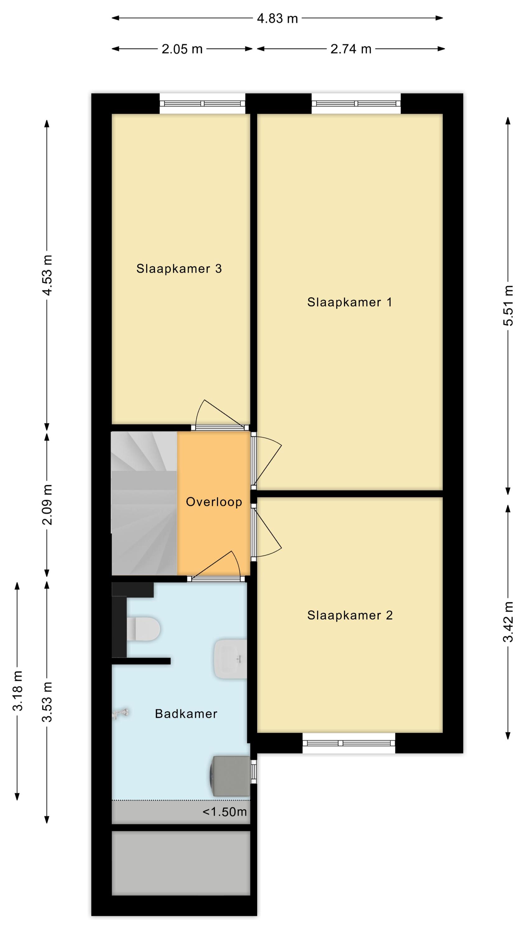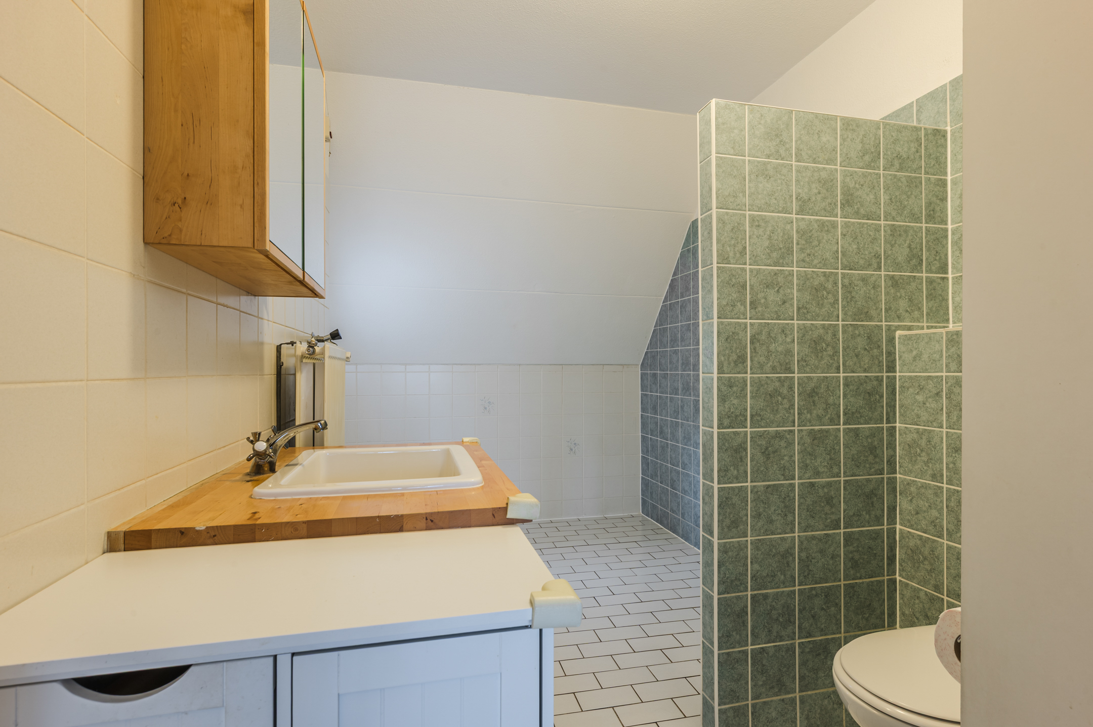 overloop, drie ruime slaapkamers en een royale badkamer met douche, wastafel en toilet. De badkamer biedt bovendien voldoende ruimte voor het plaatsen van een ligbad.