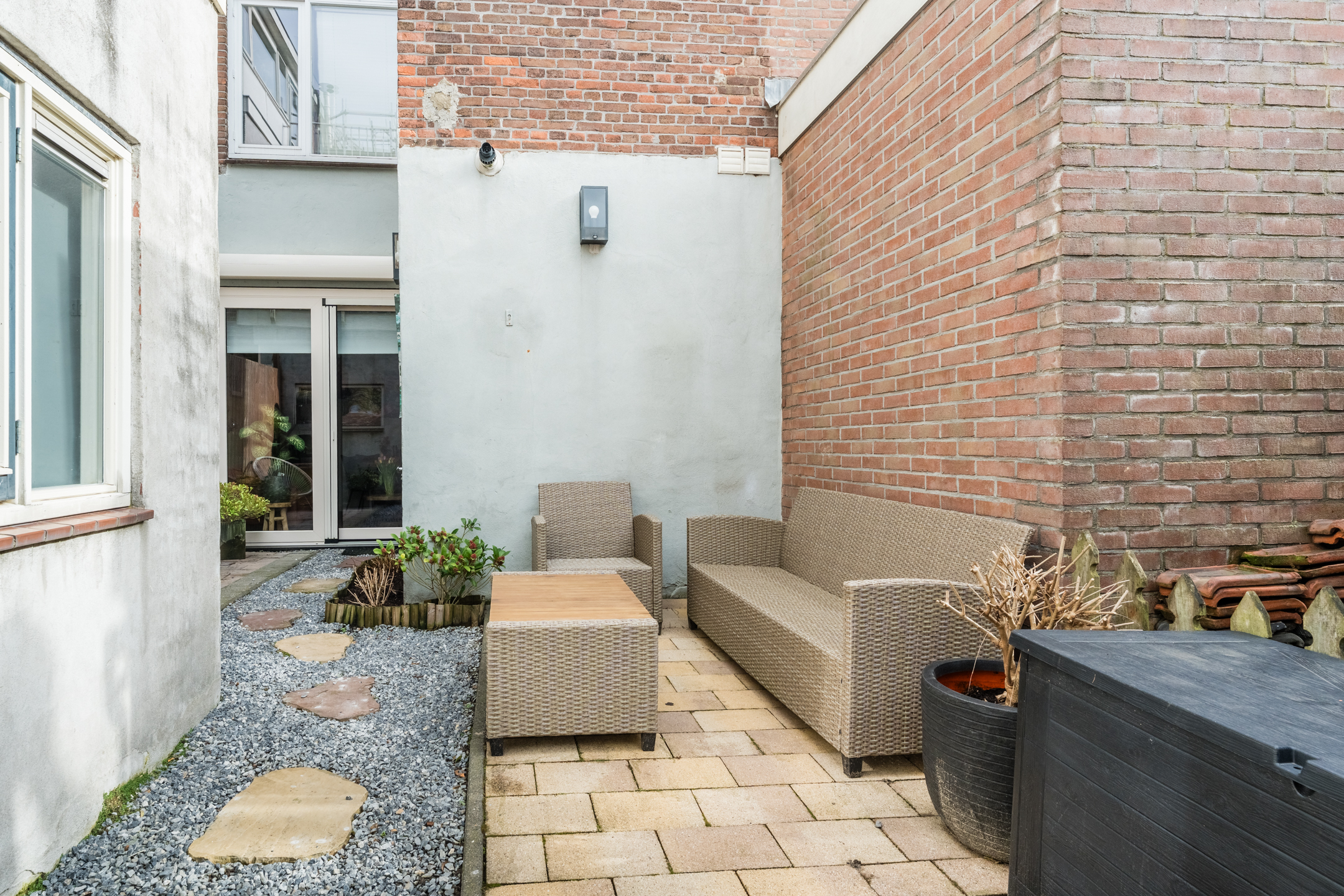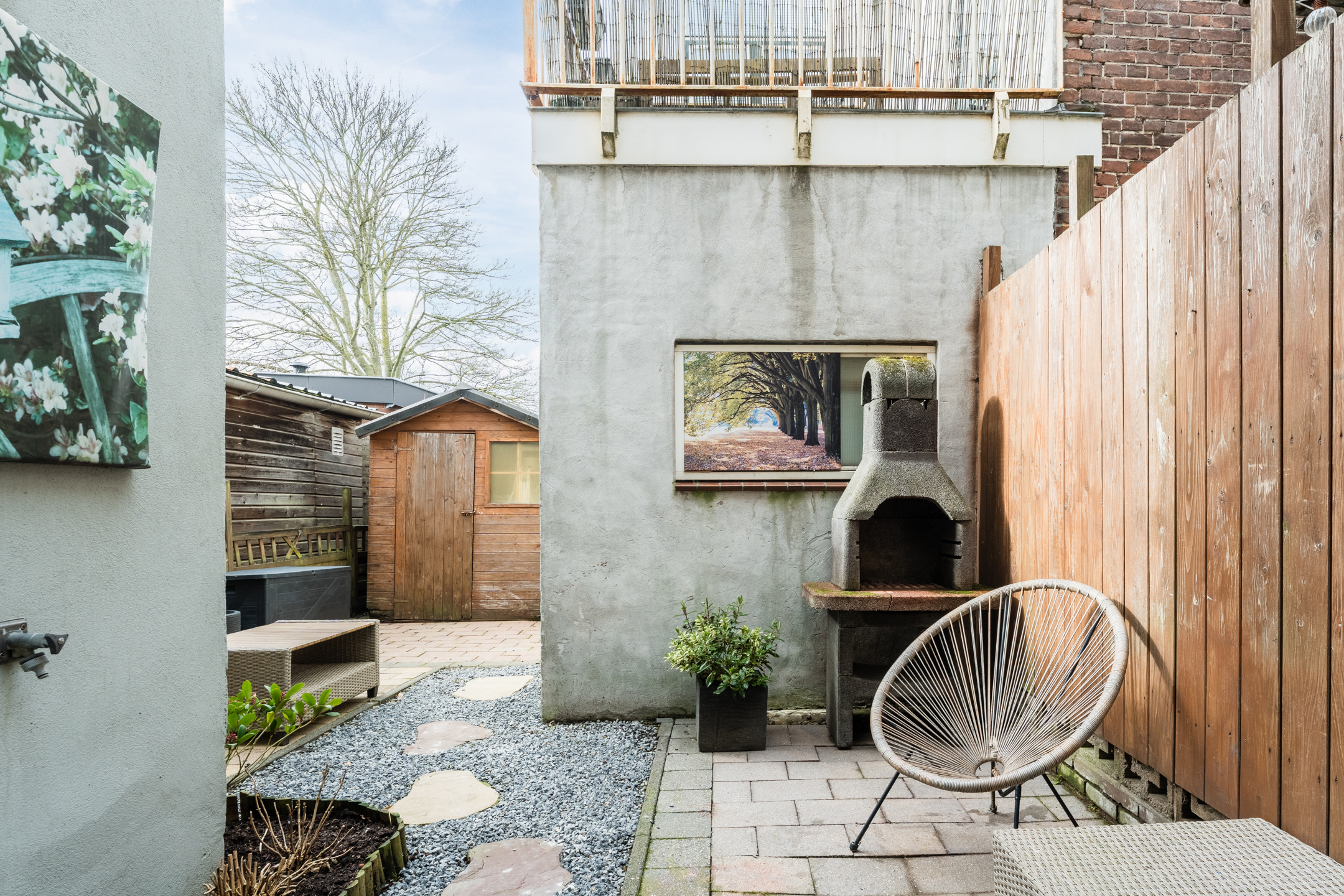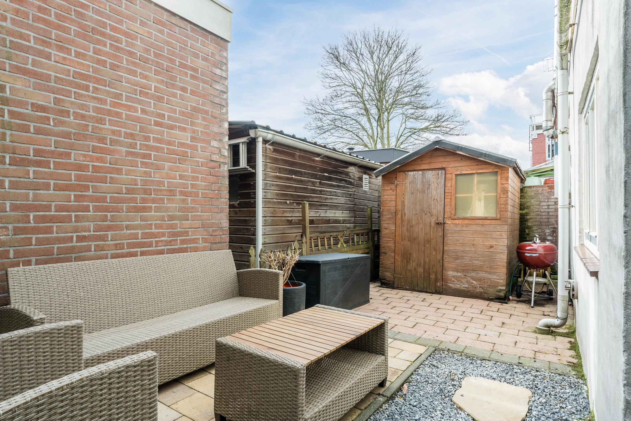 Achtertuin: grote, sfeervolle achtertuin op het westen, met veel privacy en een houten berging.
