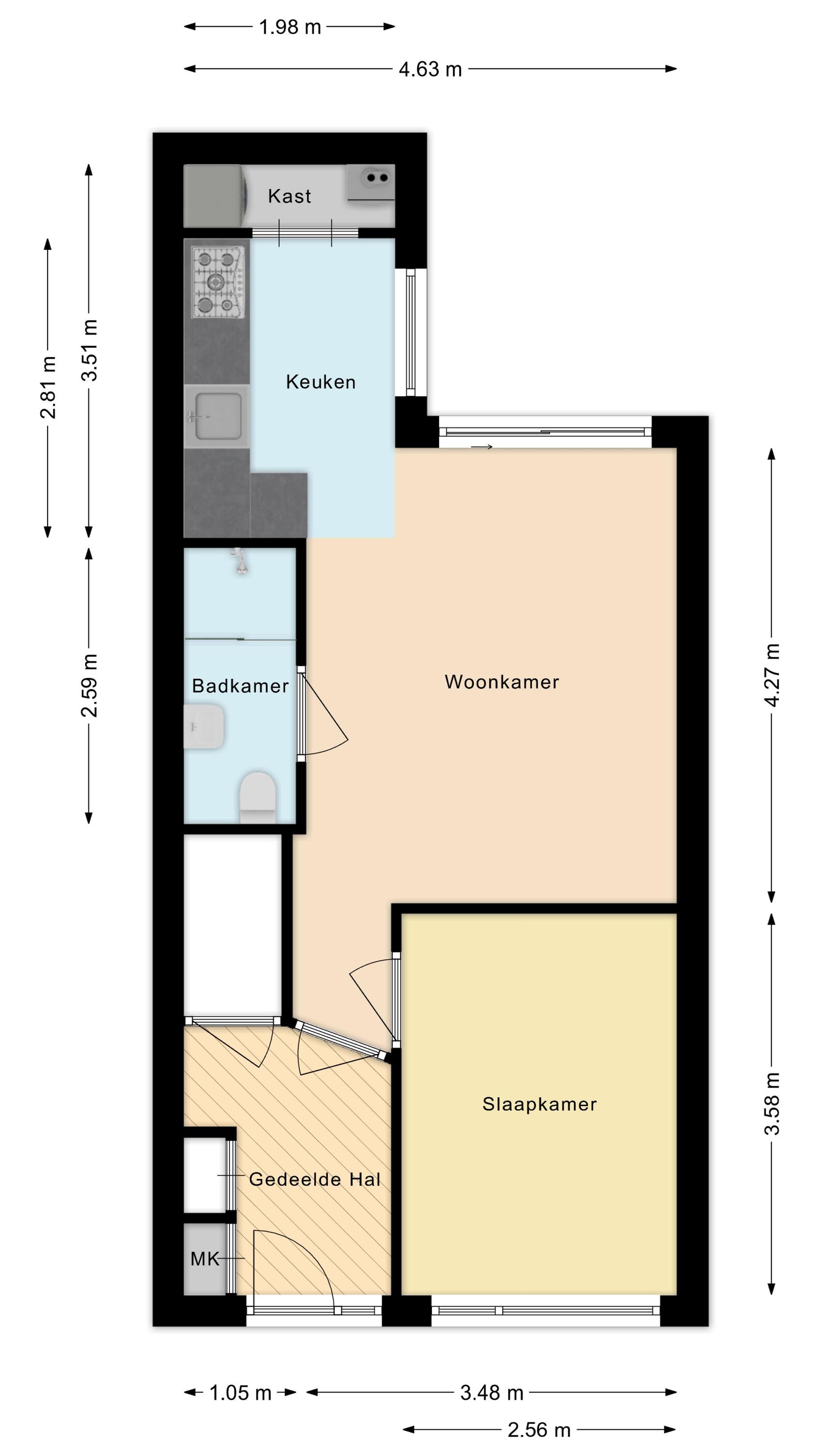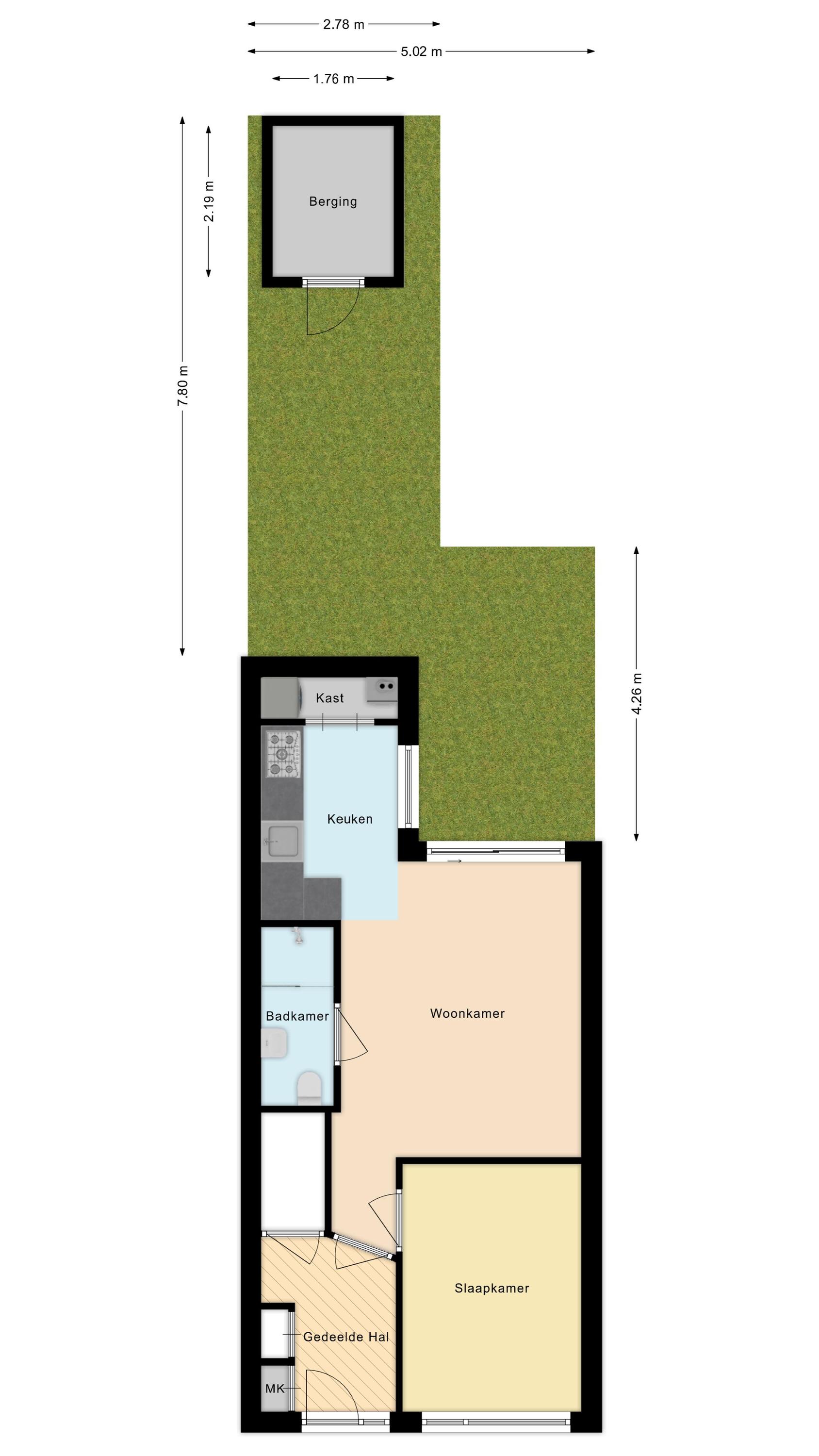 Via een gedeelde hal komt u bij uw voordeur. De slaapkamer bevindt zich aan de voorzijde van de woning. De ruime woonkamer is tuingericht en beschikt over een schuifpui naar de tuin en sfeervolle plafondspots. In de aanbouw bevindt zich de halfopen keuken. Deze is licht uitgevoerd beschikt over diverse inbouwapparatuur en praktische bijkeuken met c.v.-ketelopstelling en wasmachineaansluiting. De moderne badkamer is voorzien van een toilet, wastafel en een inloopdouche met regendouche. De gehele woning is voorzien van een fraaie pvc vloer en kunststof kozijnen met dubbele beglazing.