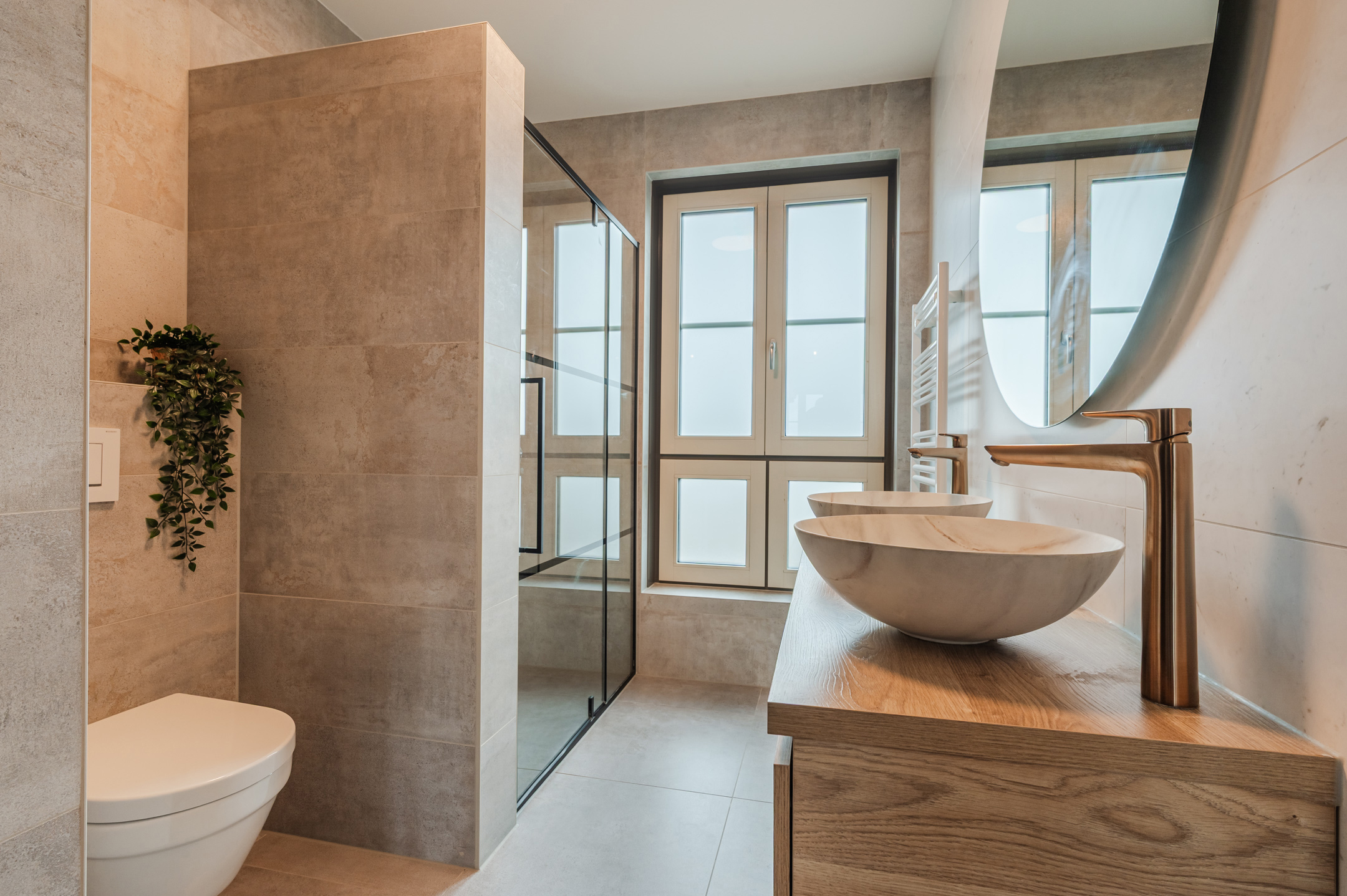 Eerste verdieping: via de nette trap bereikt u de overloop met toegang tot drie ruime slaapkamers. Alle kamers zijn voorzien van balansventilatie en ramen met karakteristieke vakverdeling. De badkamer is luxe afgewerkt met grote plavuizen en beschikt over een inloopdouche, dubbele wastafel en toilet.