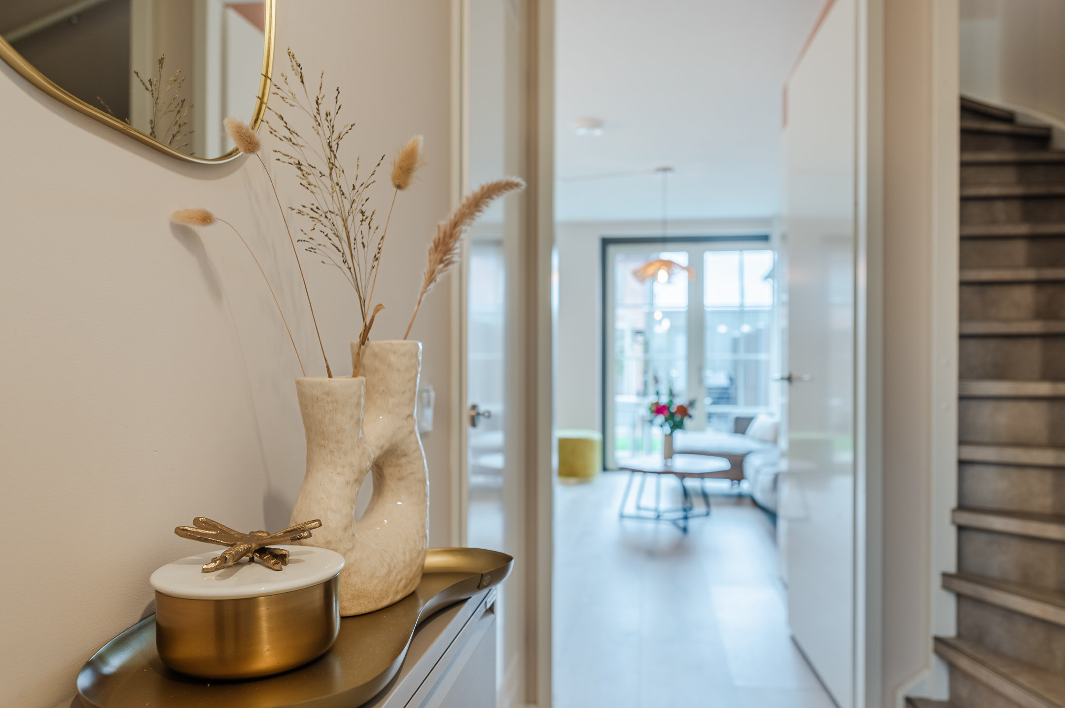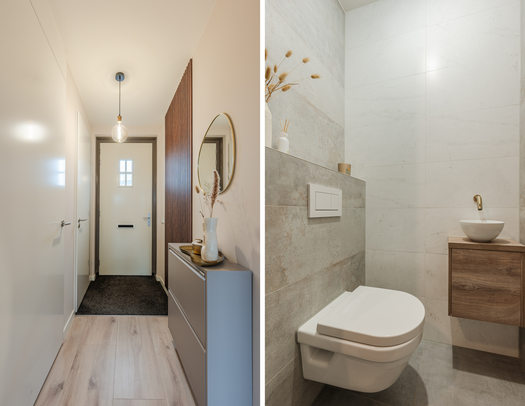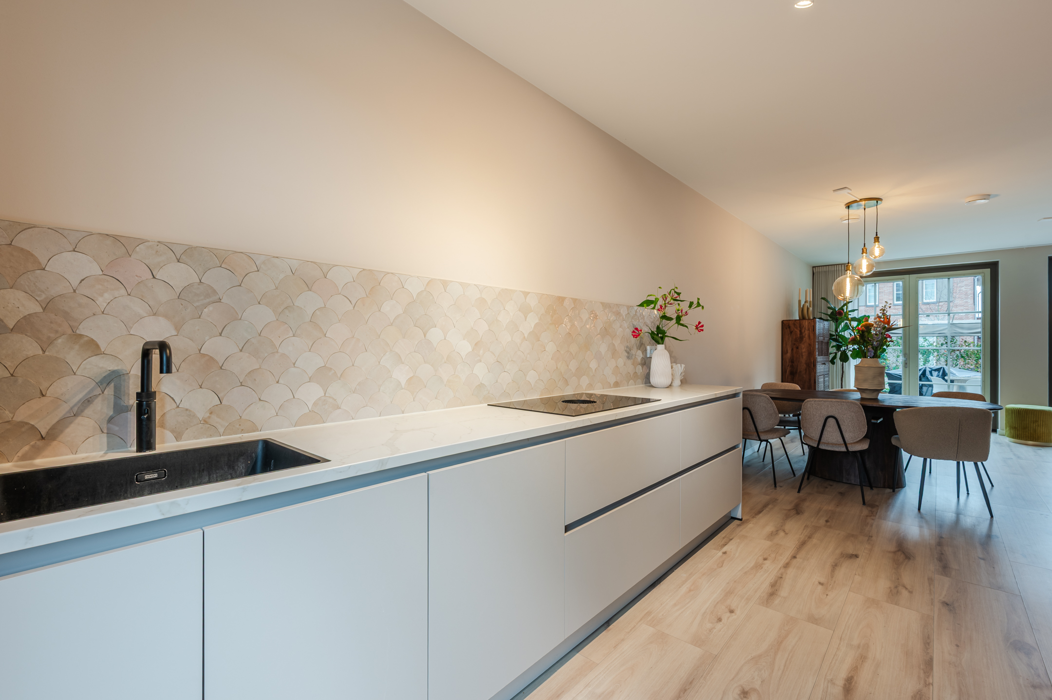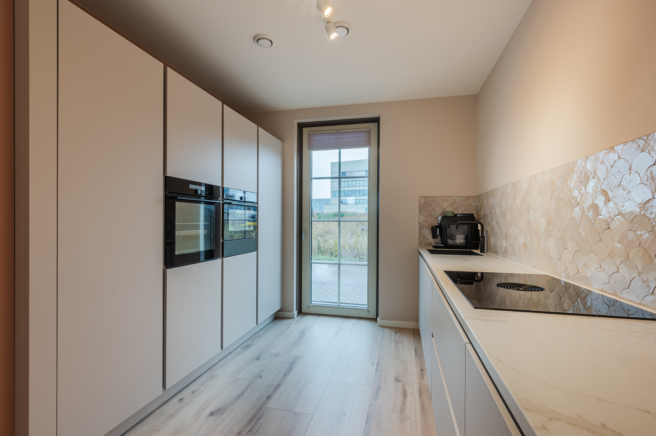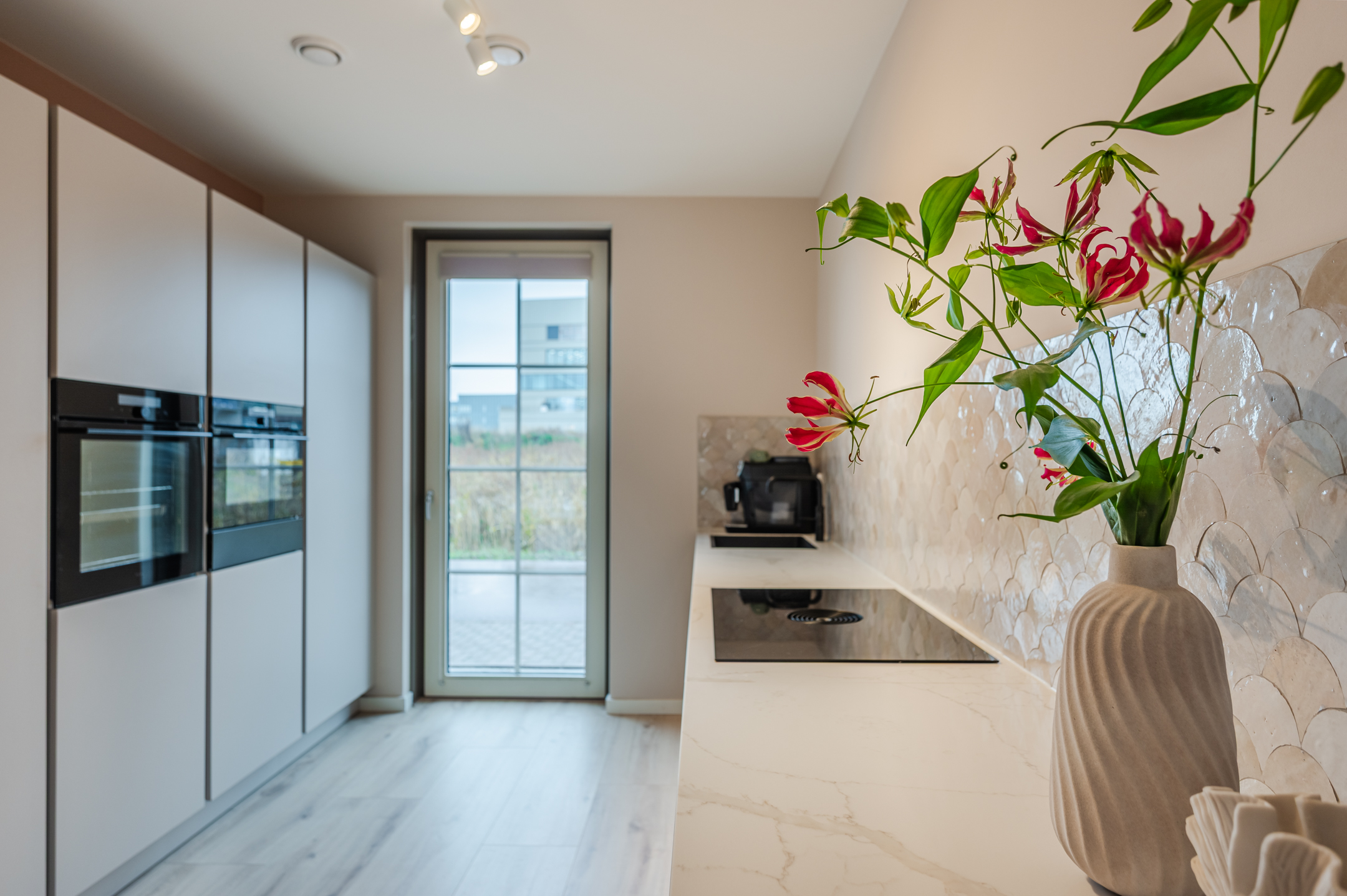 Begane grond: via de entree komt u in een fraai afgewerkte hal met lattenwand. Vanuit hier heeft u toegang tot het toilet, een berging met de warmtepomp en de woonkamer. De woonkamer is tuingericht en voorzien van 2 mooie tuingerichte deuren met vakverdeling. Dankzij de grote raampartijen geniet u van veel lichtinval. De vloer is voorzien van een houtlook vloer met vloerverwarming. Aan de voorzijde bevindt zich de moderne keuken, uitgerust met alle gemakken: een inductiekookplaat met ingebouwde afzuiging, Quooker met Cube boiler, een kastenwand met zelfreinigende oven en combi-magnetron, en een grote koelkast met vriezer.