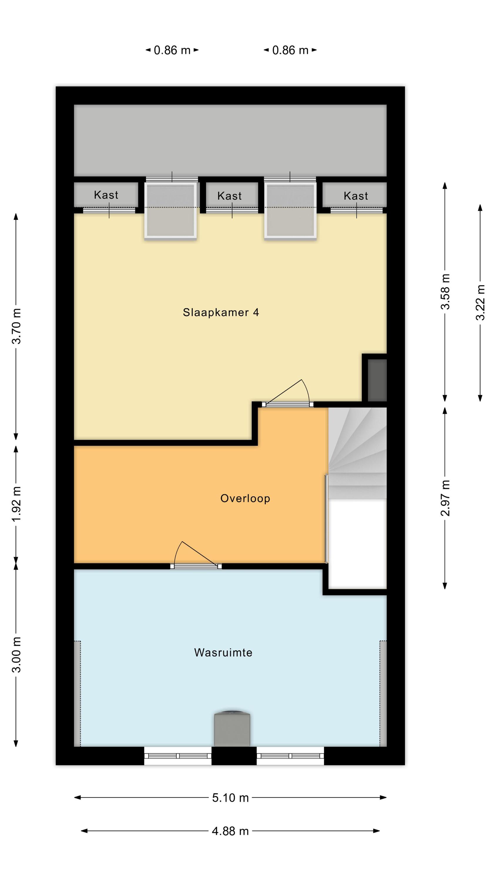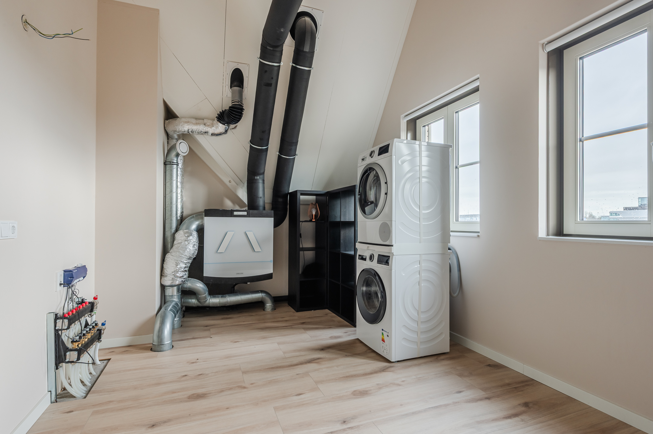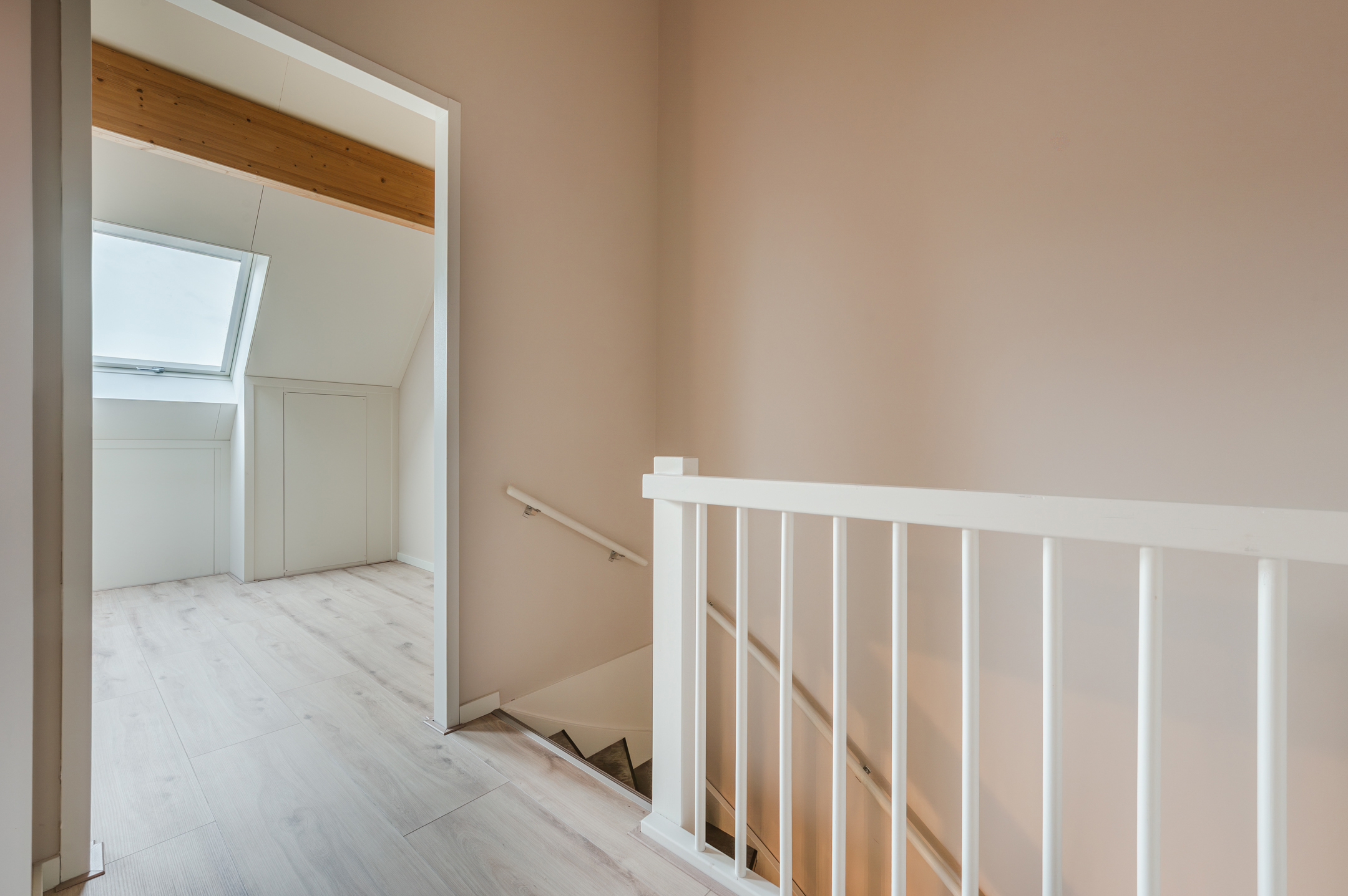 Tweede verdieping: middels een vaste trap komt u op de zolderverdieping. Via de ruime overloop bereikt u de kamers aan de voor- en achterzijde. In de kamer aan de voorzijde bevinden zich de balansventilatie en de aansluitingen voor was- en droogmachine.