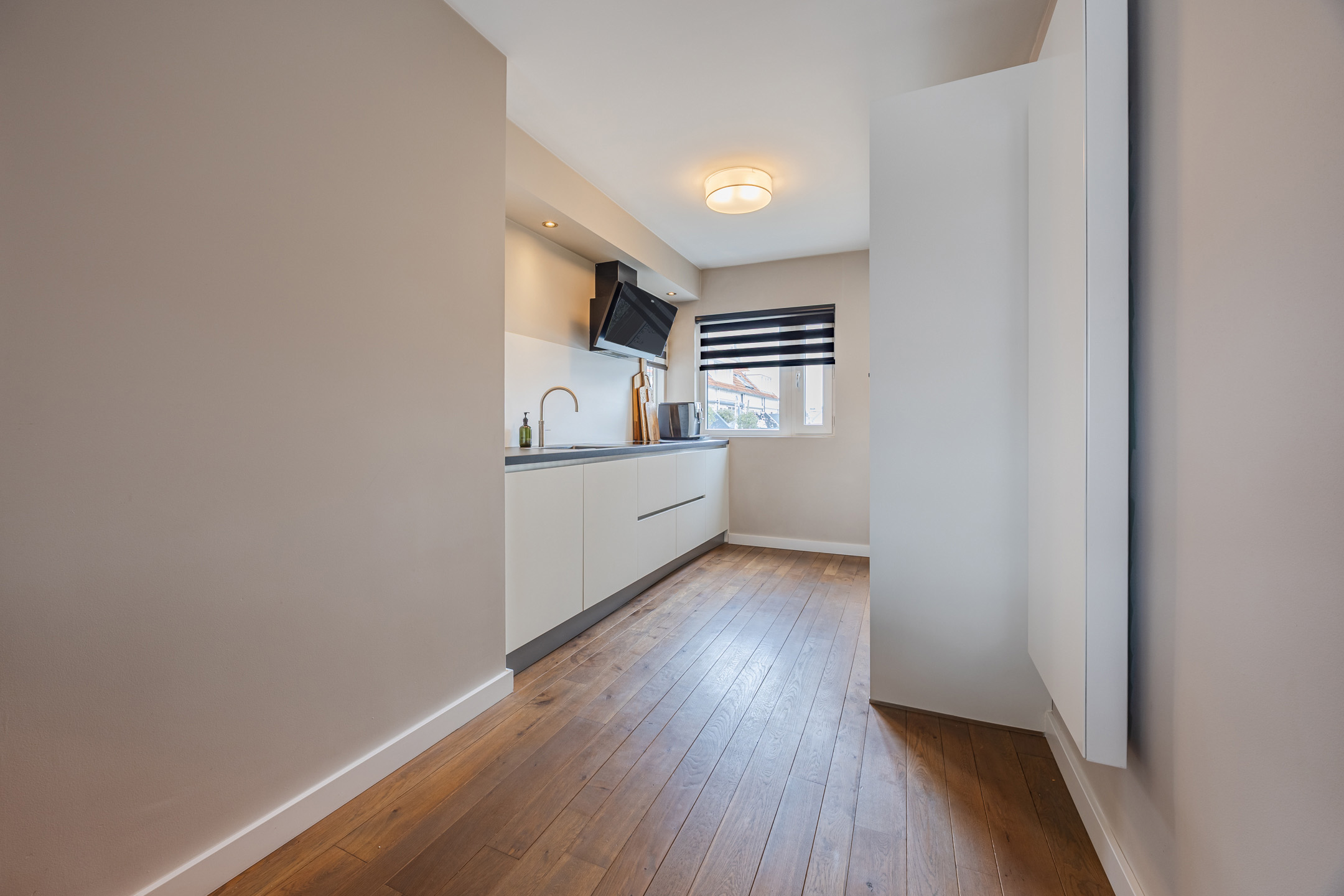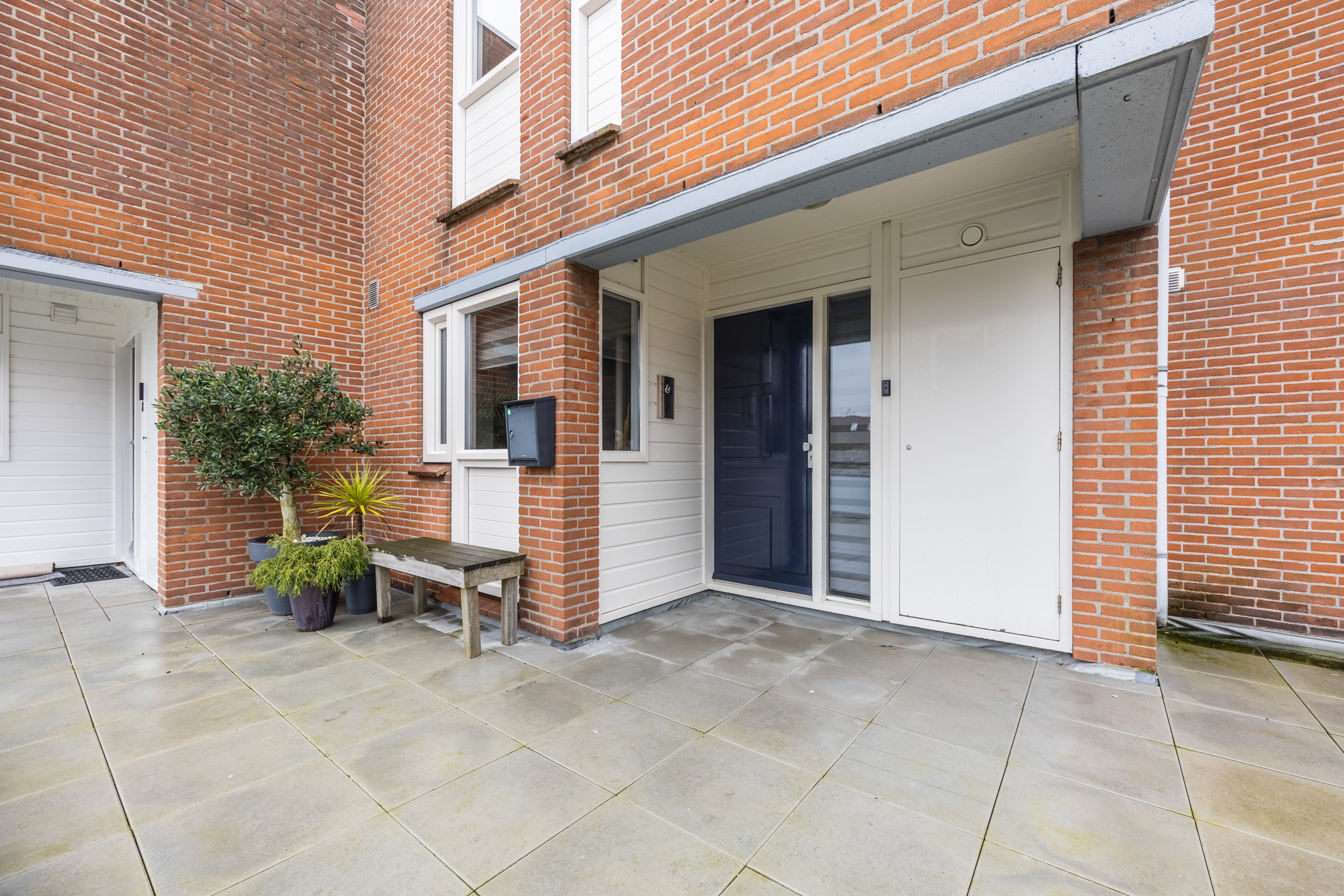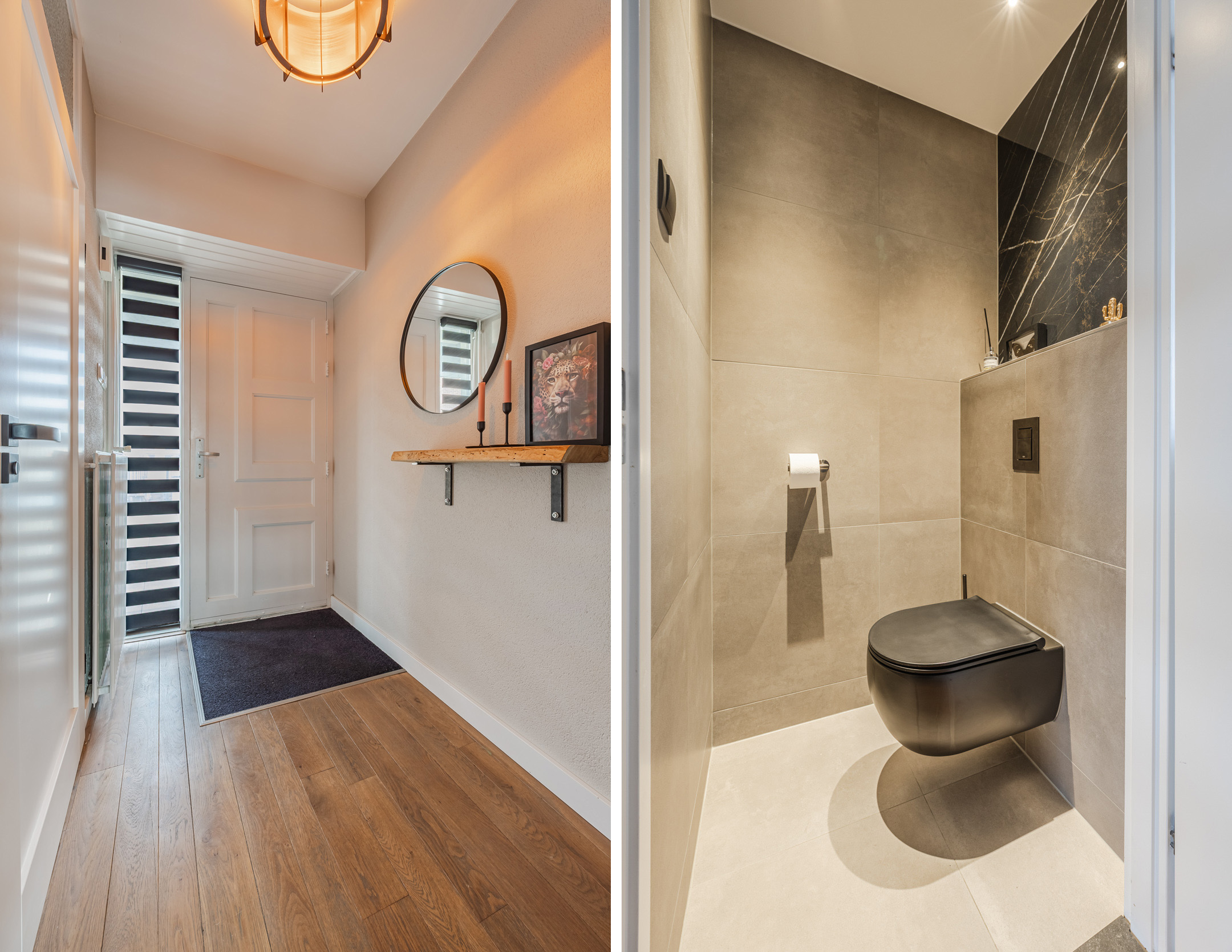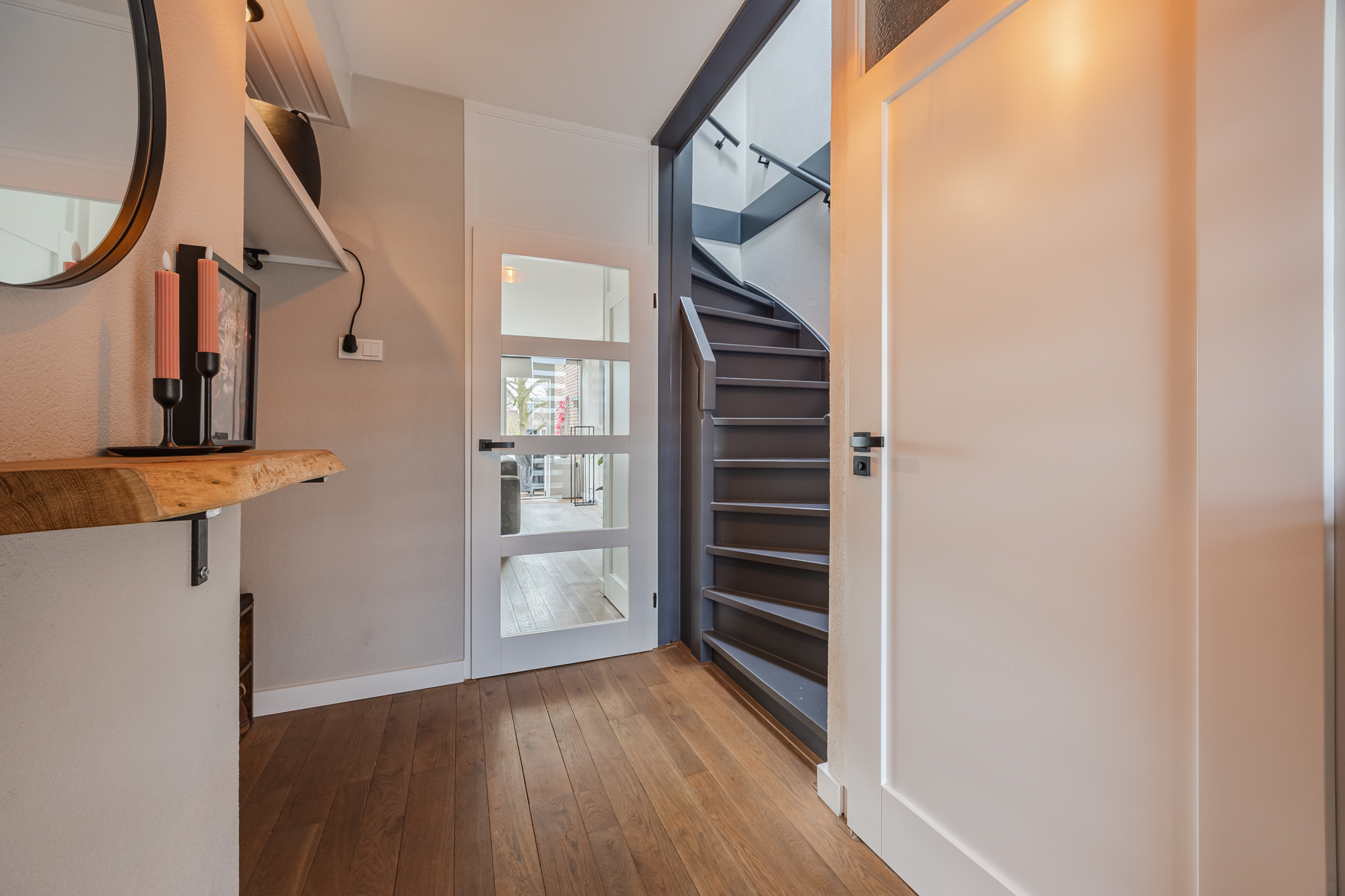Via het gezamenlijke ruime dakterras bereikt u de entree van de woning. In de hal bevindt zich het toilet (vernieuwd in 2025 en voorzien van vloerverwarming), de trap naar de verdieping en veel bergruimte voor uw jassen en tassen.
