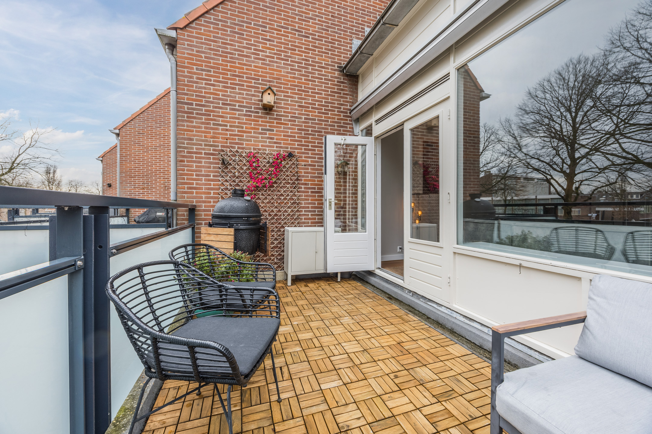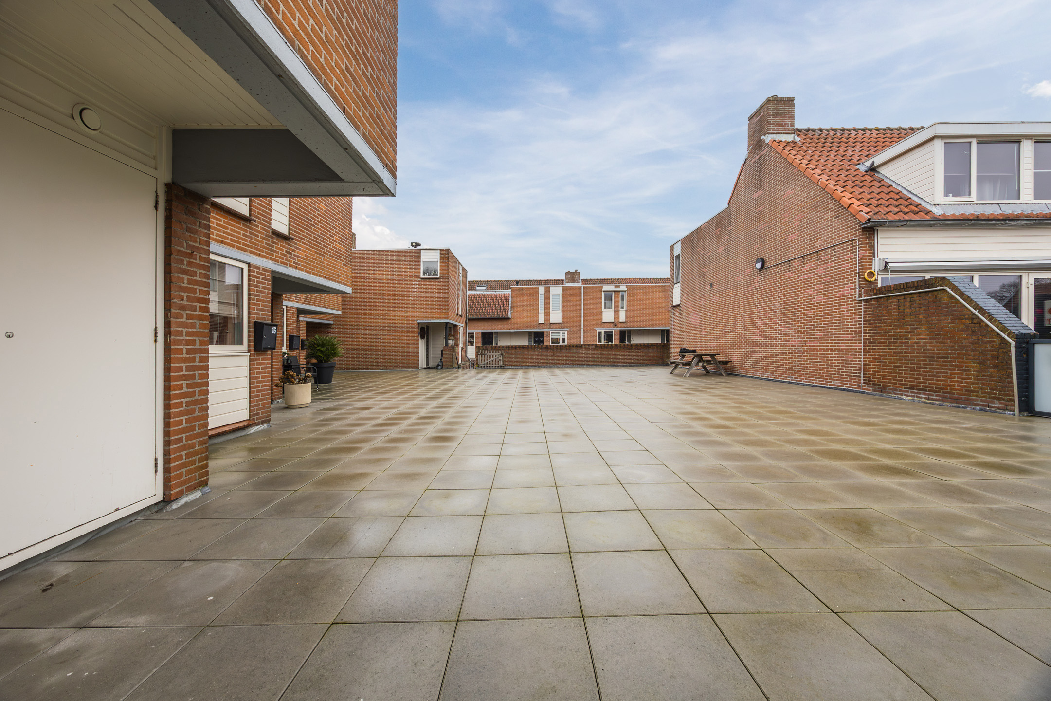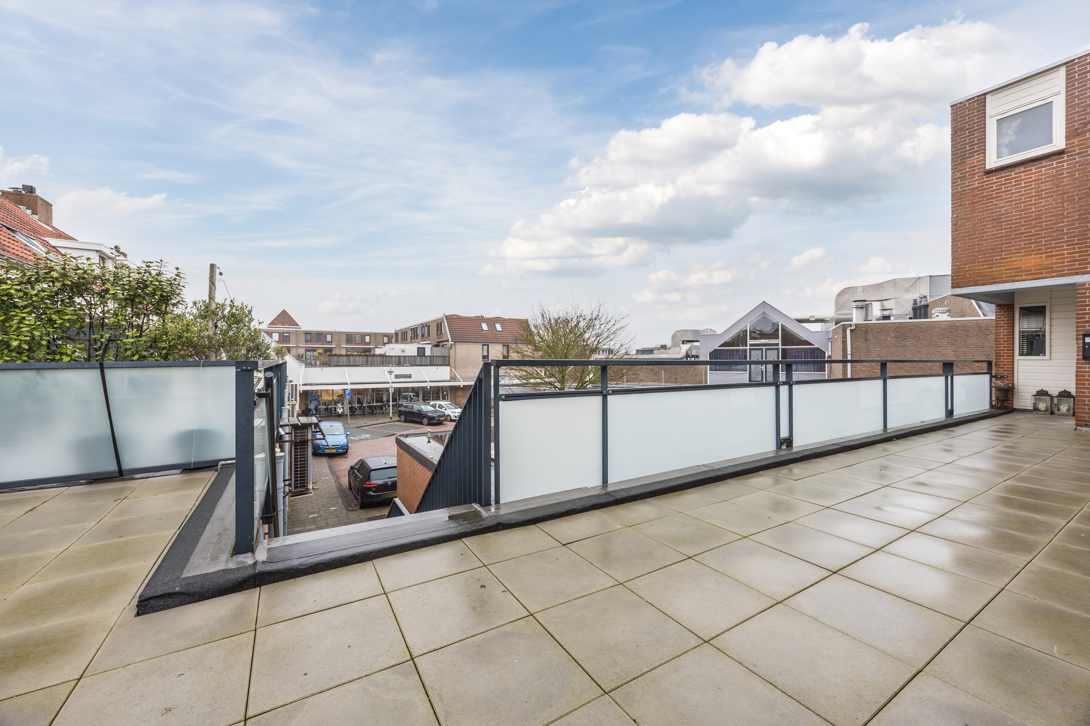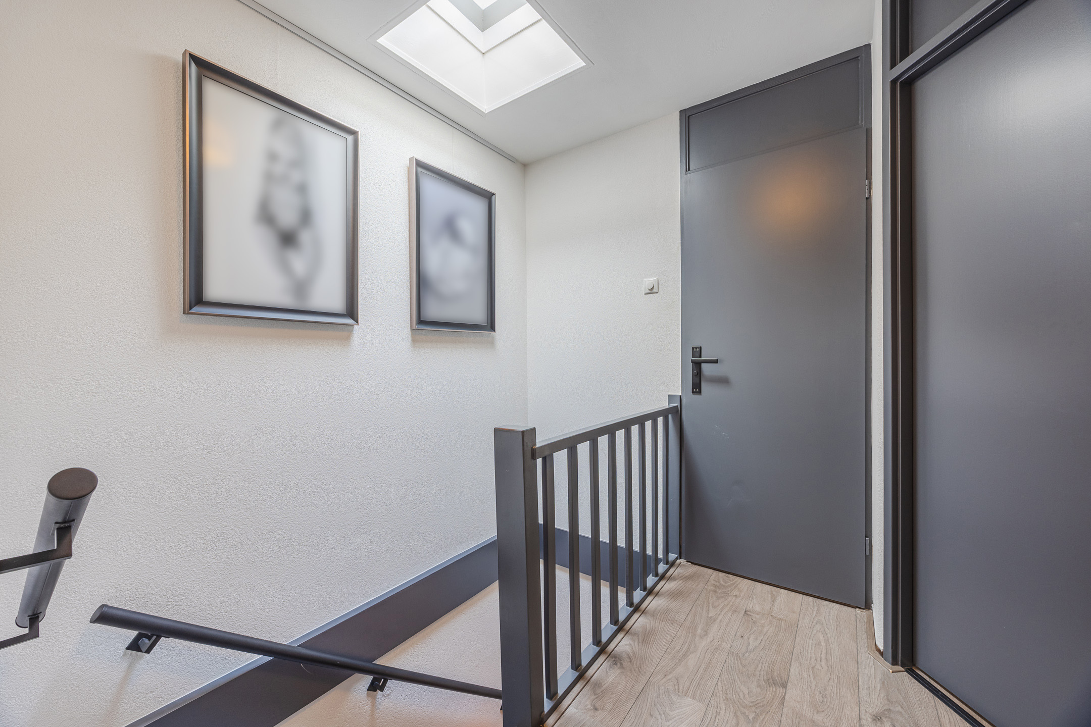 Via het gezamenlijke ruime dakterras bereikt u de entree van de woning. In de hal bevindt zich het toilet (vernieuwd in 2025 en voorzien van vloerverwarming), de trap naar de verdieping en veel bergruimte voor uw jassen en tassen.