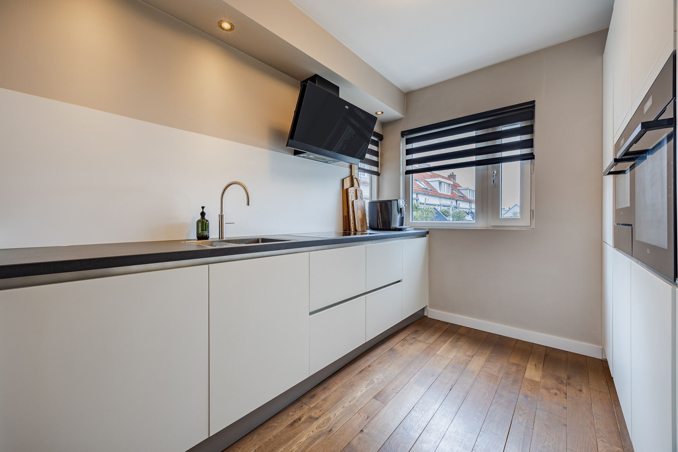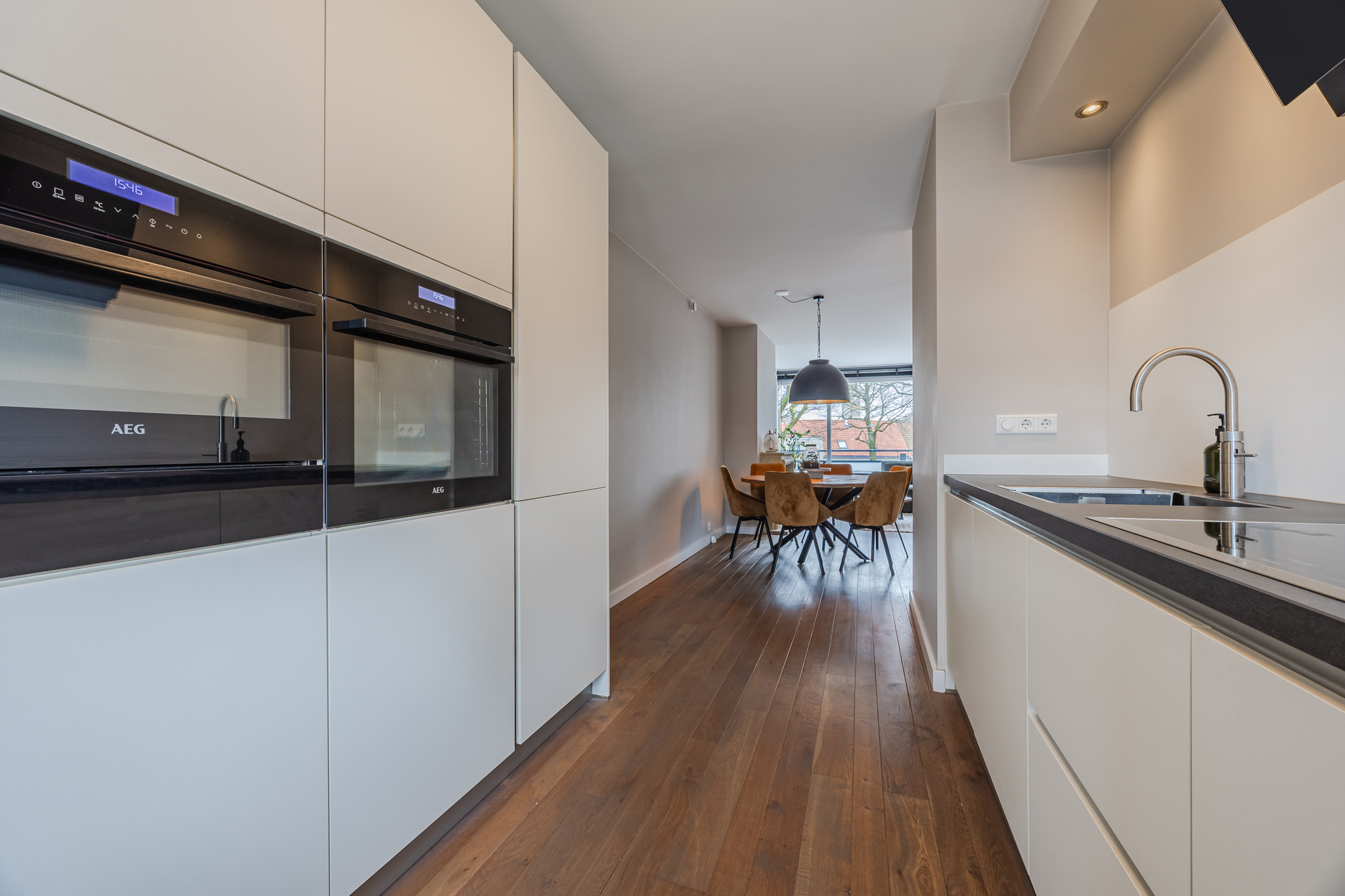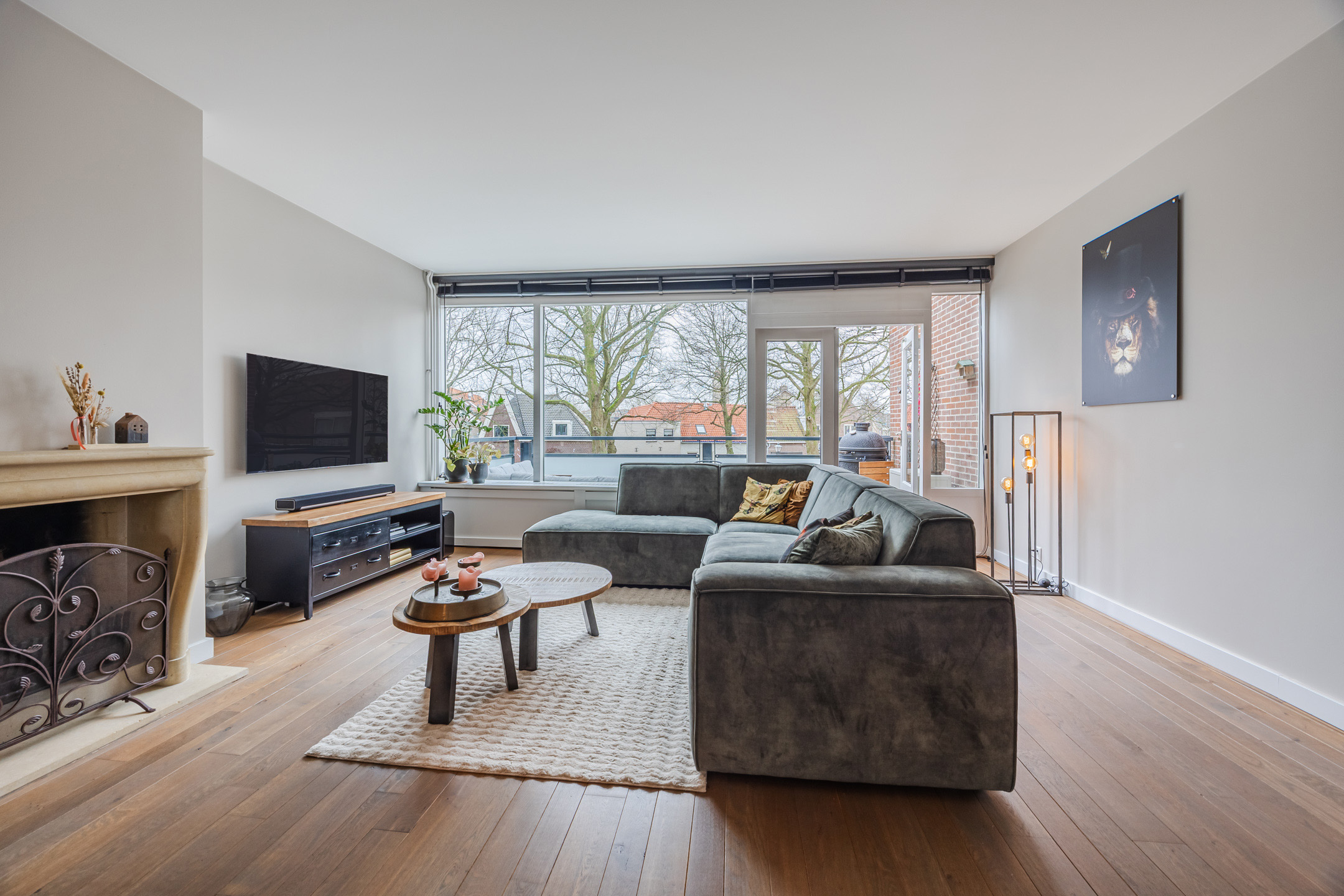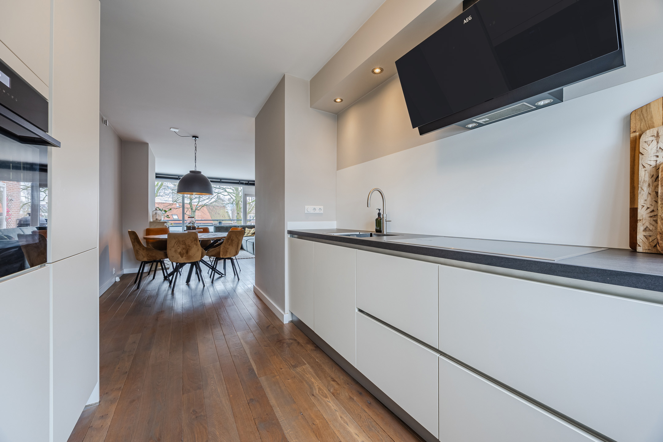 De ruime woonkamer is voorzien van een massief houten vloer, een sfeervolle werkende openhaard en toegang tot een riant balkon gelegen op het zonnige zuiden. Aan de voorzijde van de woning bevindt zich de luxe keuken (slechts 7 jaar oud), die is voorzien van een Quooker, vaatwasmachine, 4-pits inductie kookplaats, oven én combi-oven, koelkast en vriezer (voornamelijk AEG apparatuur).