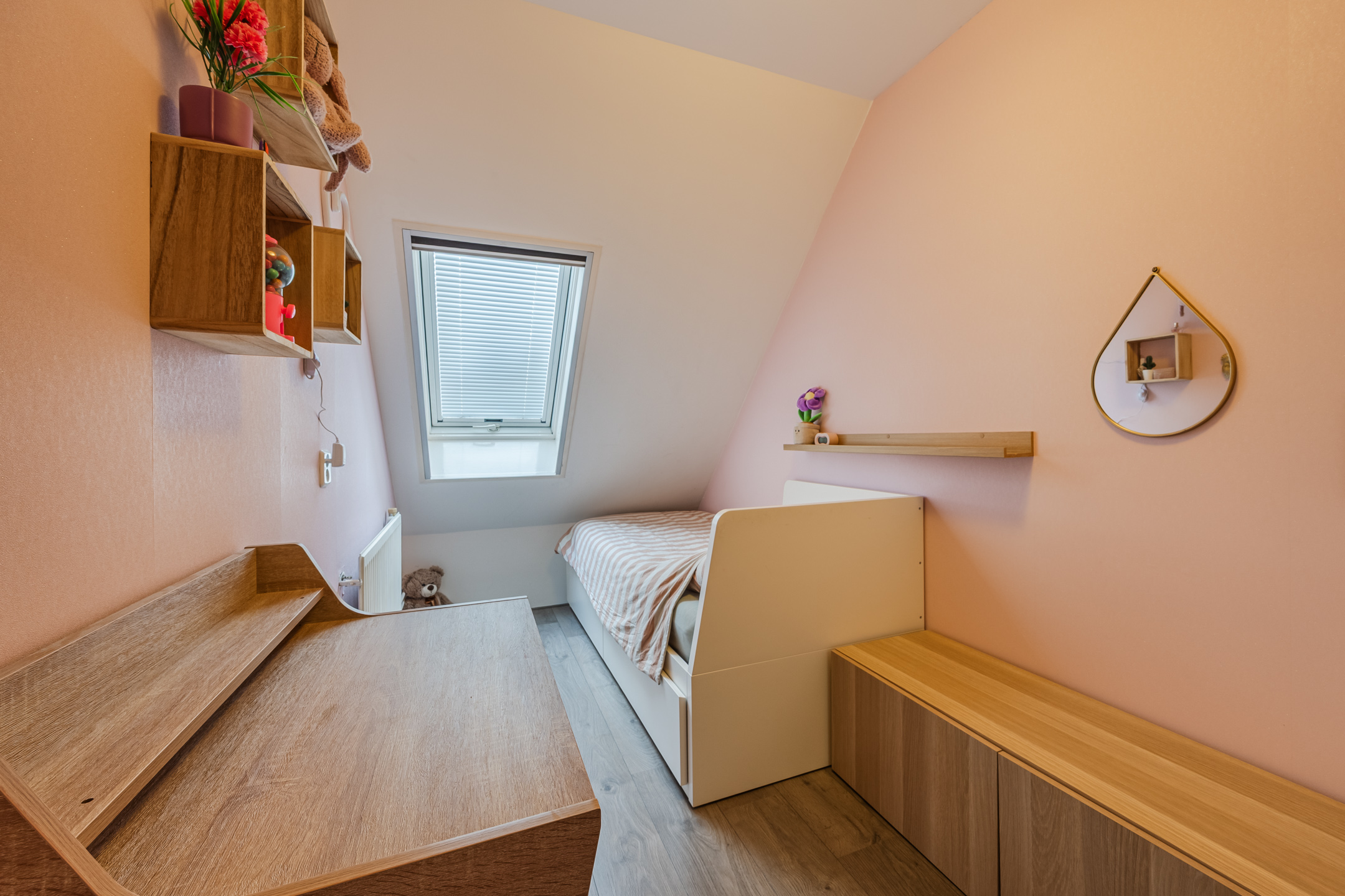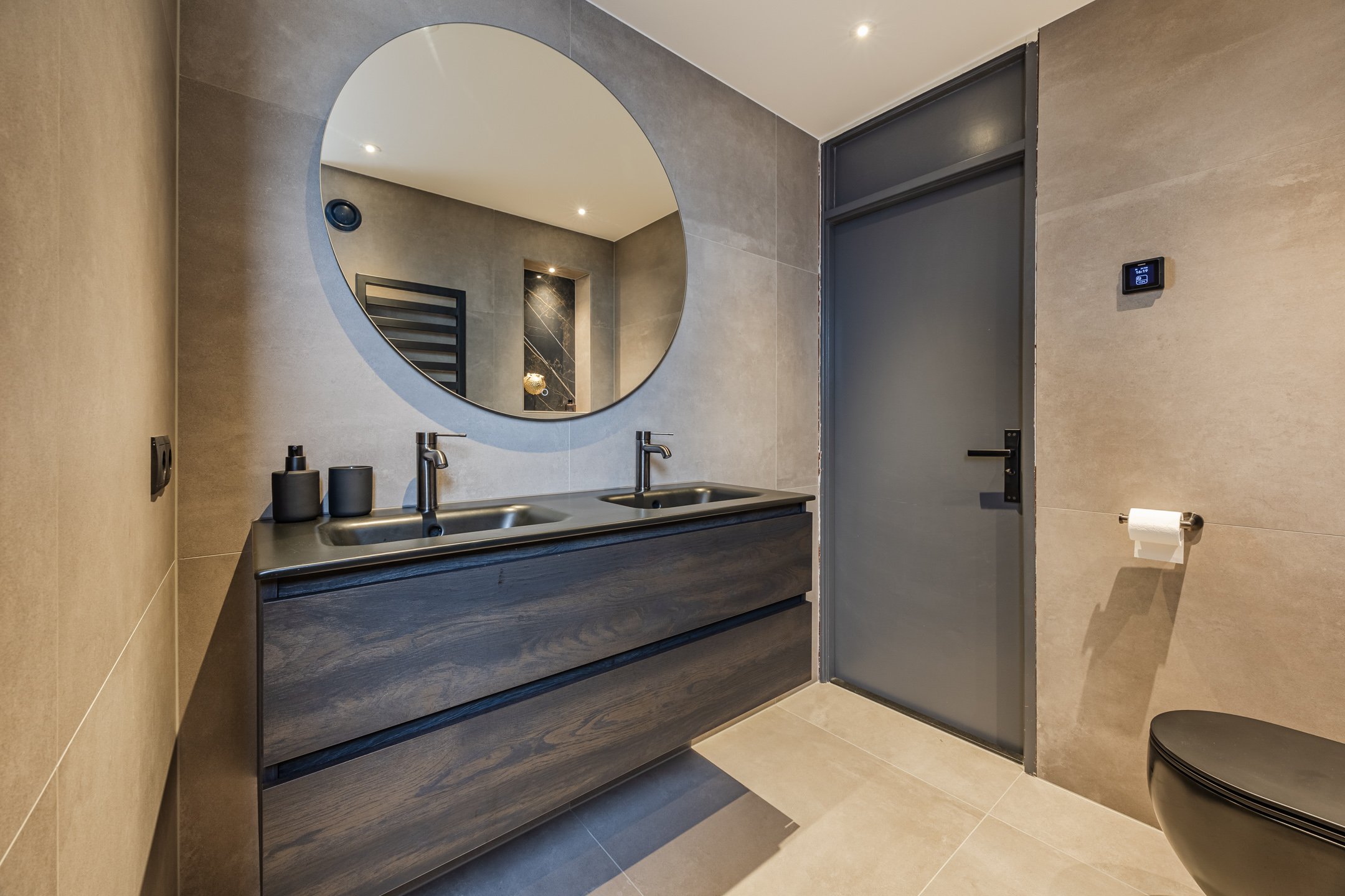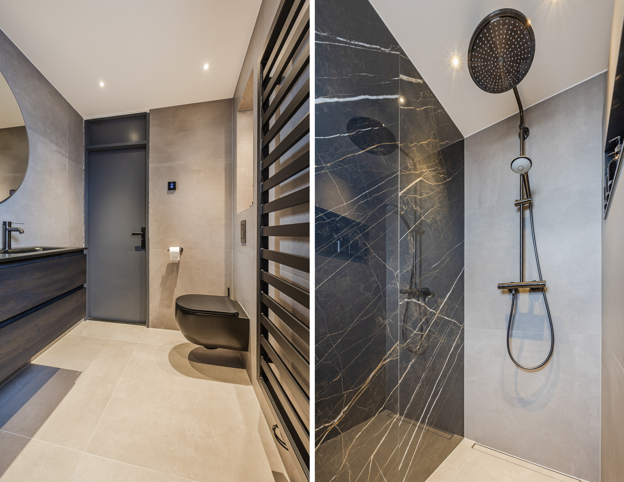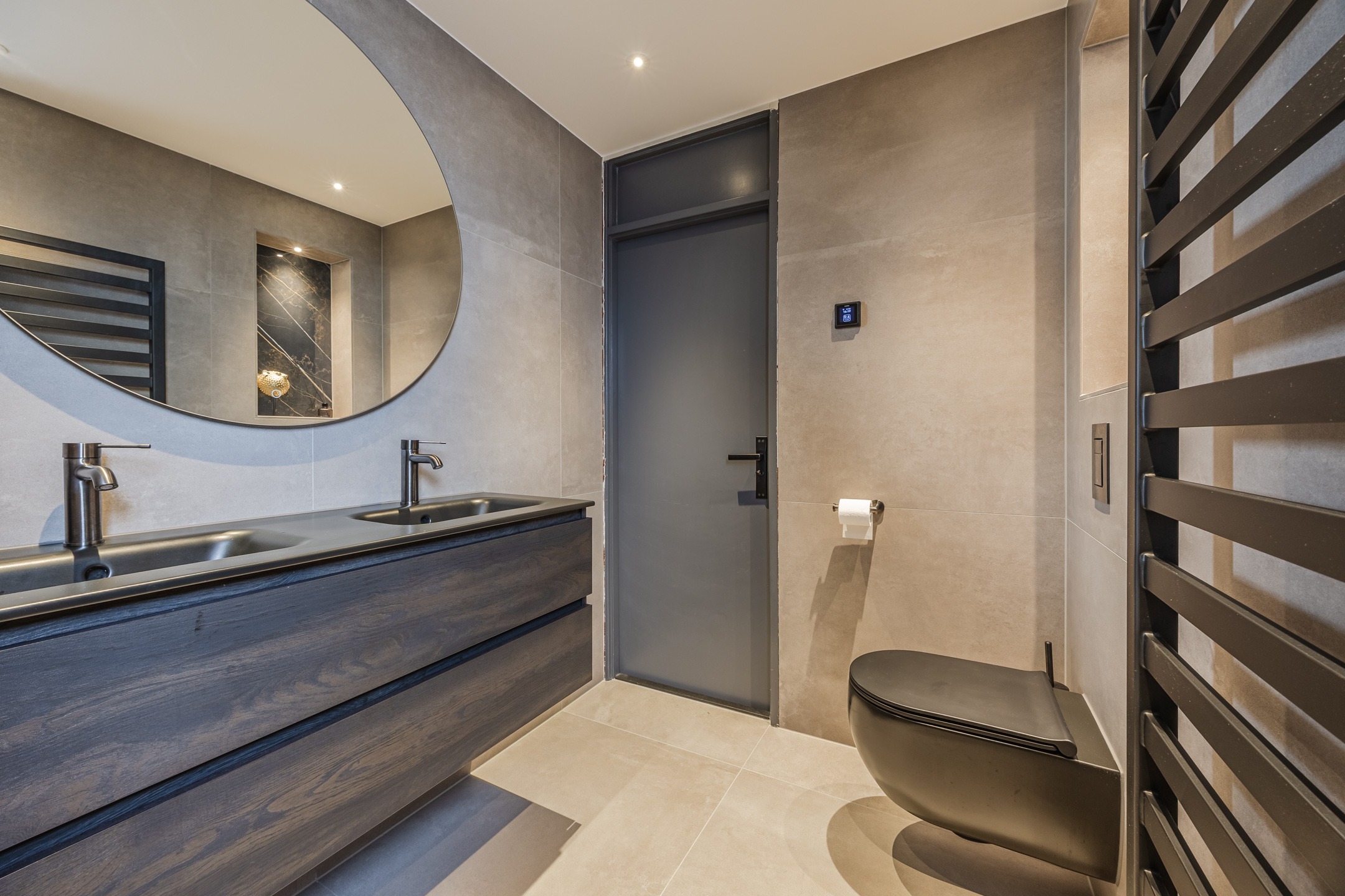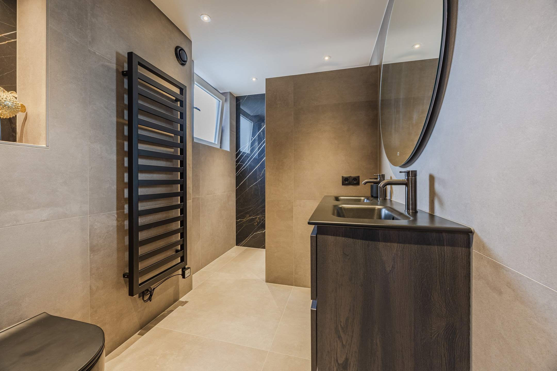 De badkamer is in 2025 vernieuwd en voorzien van hoogwaardige materialen en vloerverwarming. Zo is er een dubbele wastafel aanwezig, een toilet en een ruime inloopdouche.