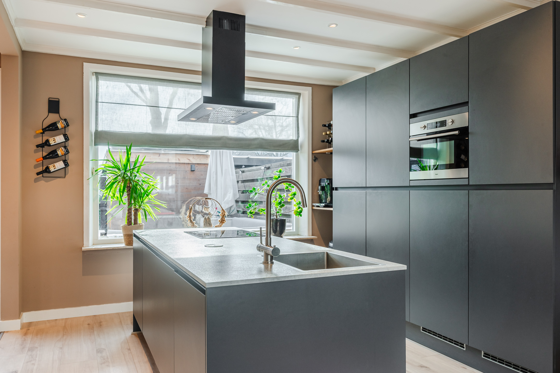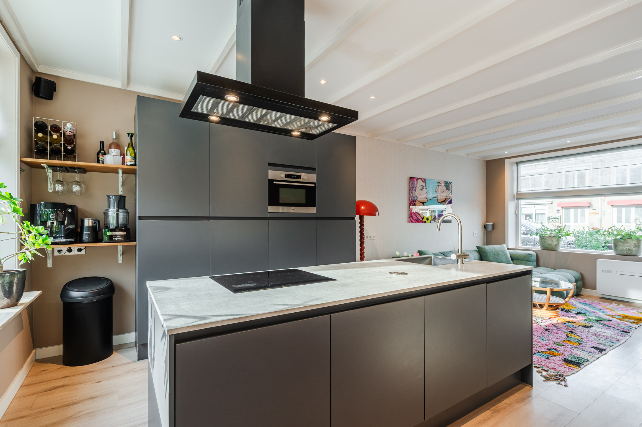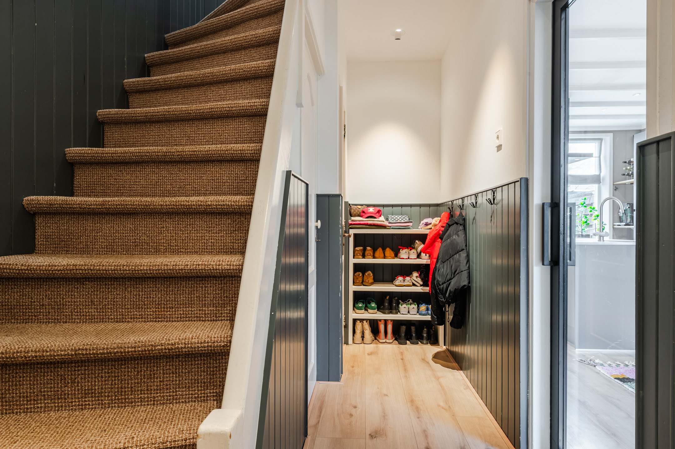 Entree, hal met meterkast en praktische trapkast. De moderne toiletruimte is voorzien van een hangend toilet. De lichte woonkamer loopt vloeiend over in de luxe open keuken aan de tuinzijde (2018). Deze keuken is een droom voor kookliefhebbers, compleet met kookeiland en hoogwaardige inbouwapparatuur.
