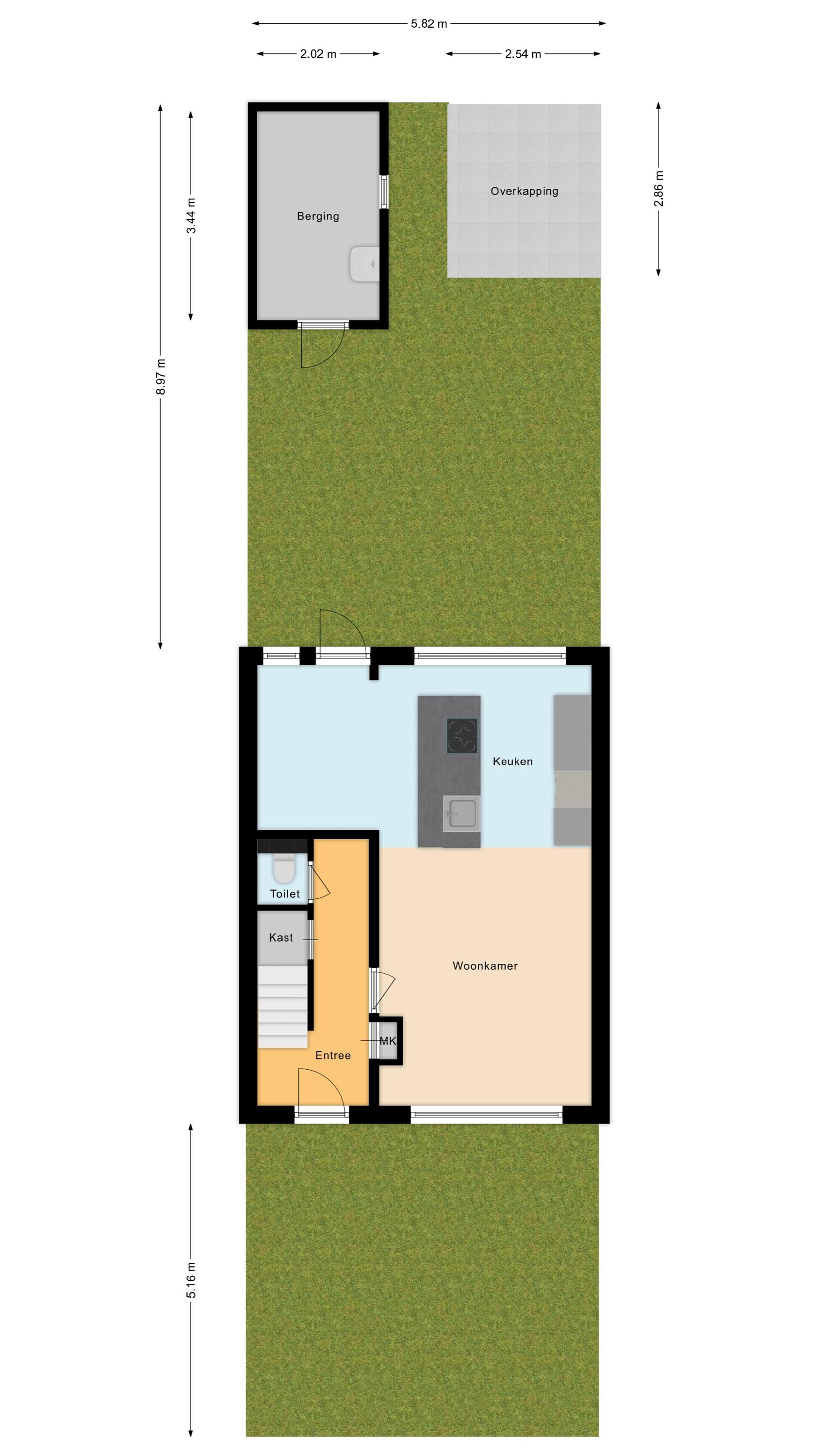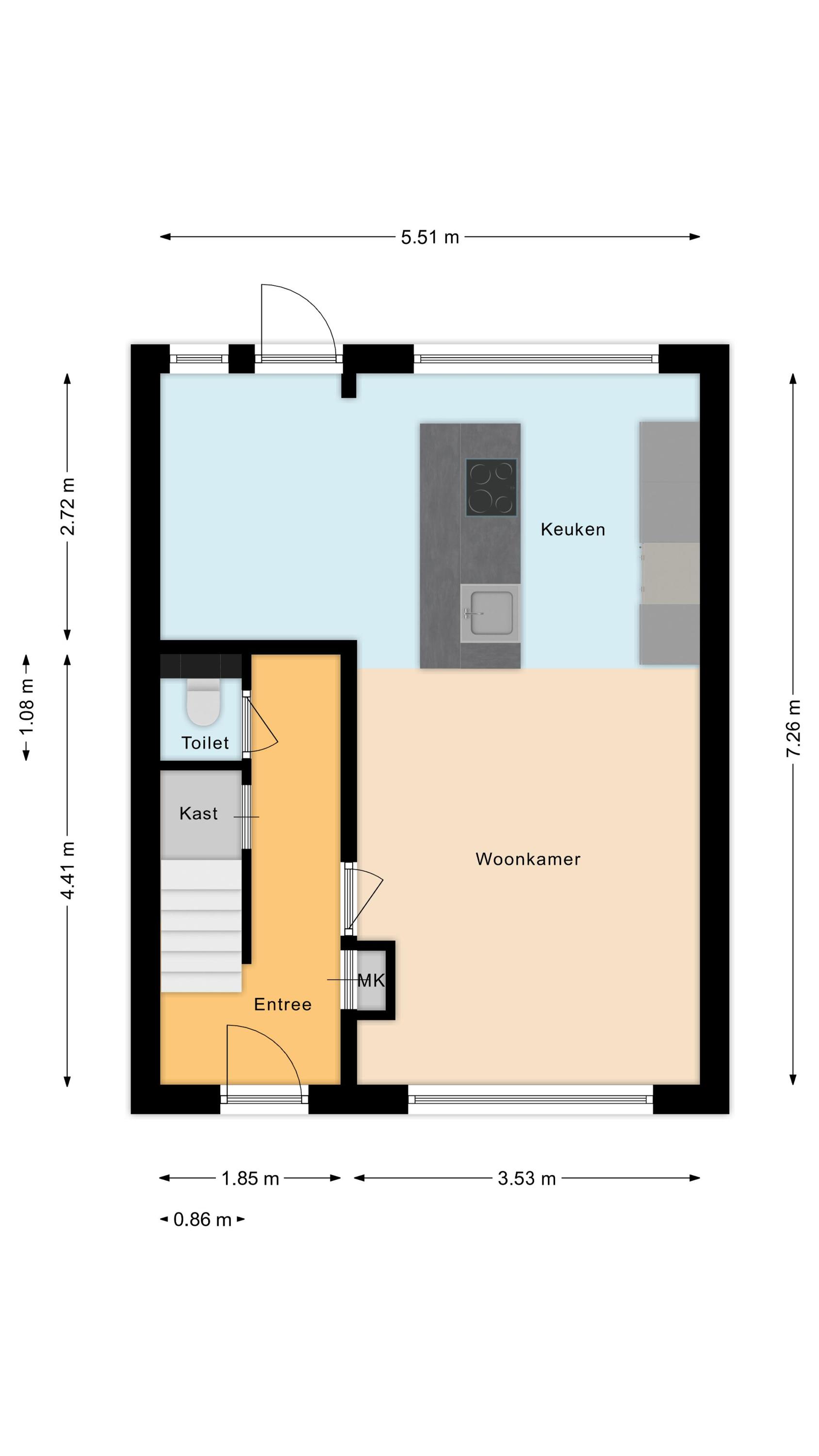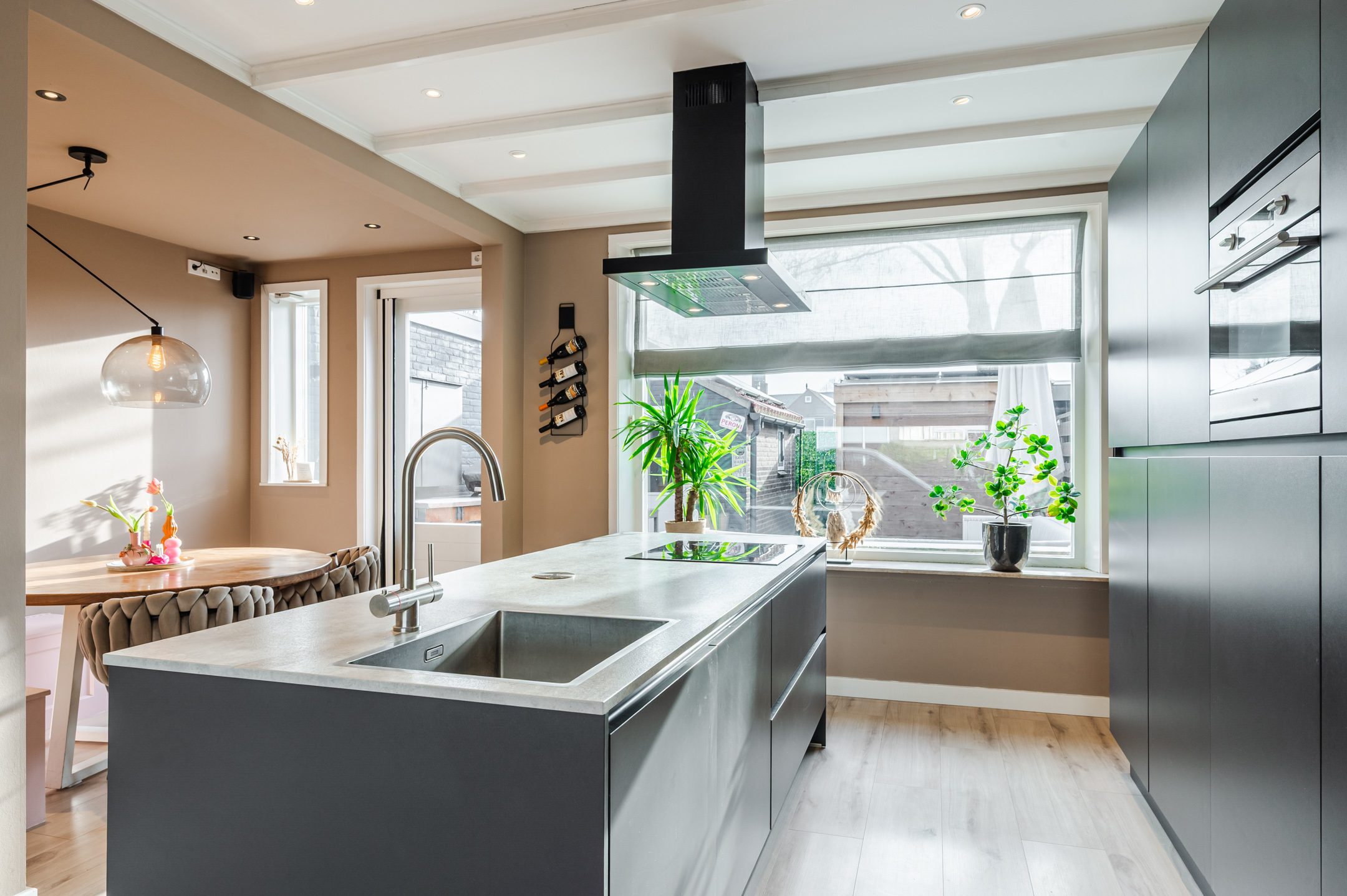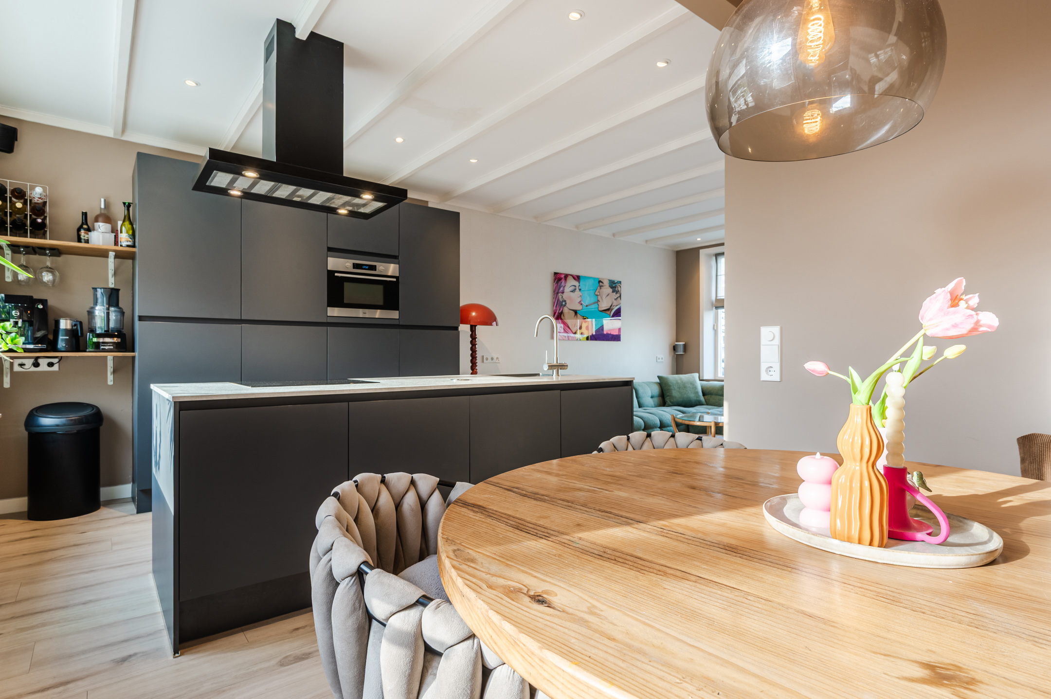Entree, hal met meterkast en praktische trapkast. De moderne toiletruimte is voorzien van een hangend toilet. De lichte woonkamer loopt vloeiend over in de luxe open keuken aan de tuinzijde (2018). Deze keuken is een droom voor kookliefhebbers, compleet met kookeiland en hoogwaardige inbouwapparatuur.