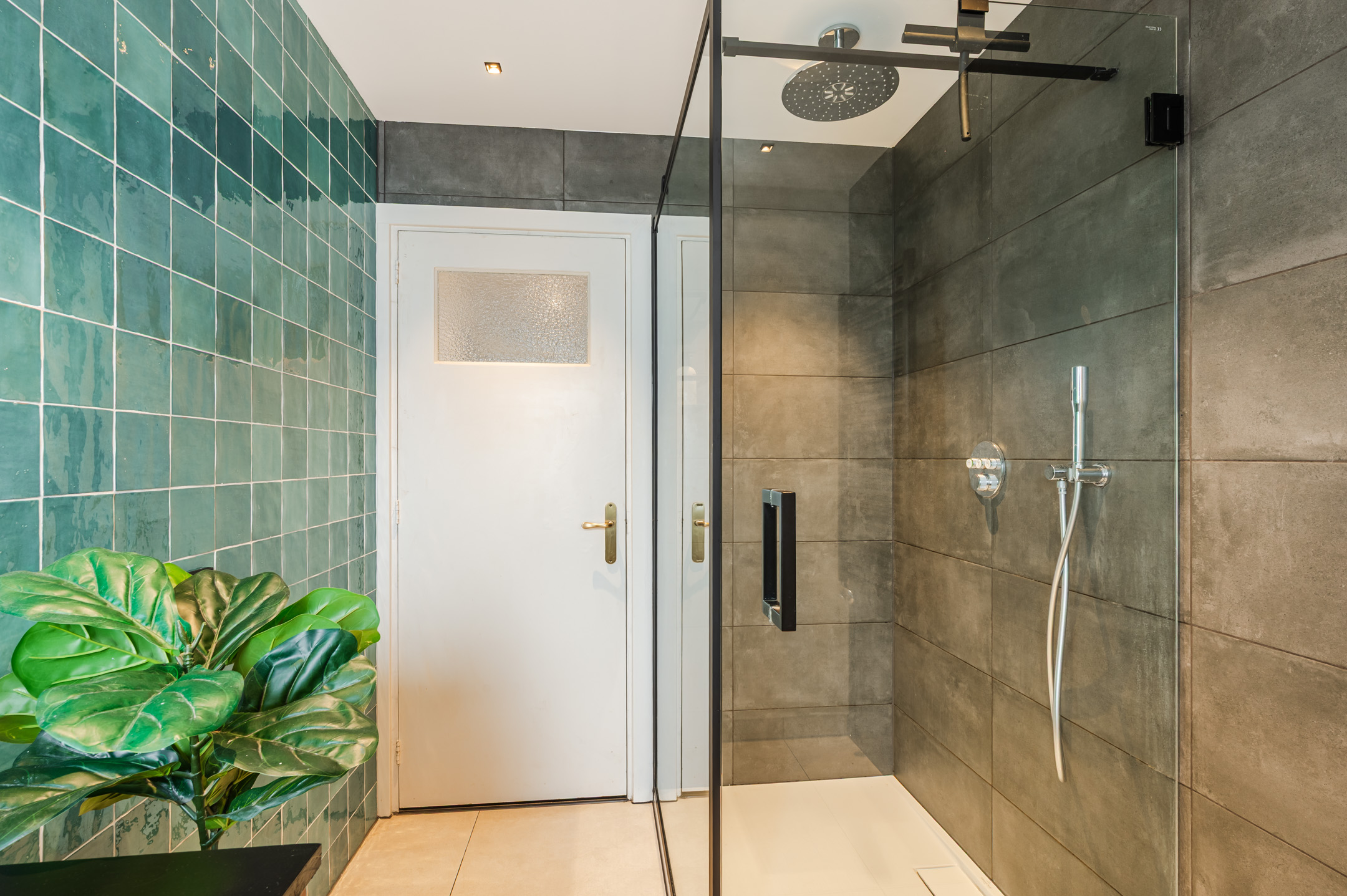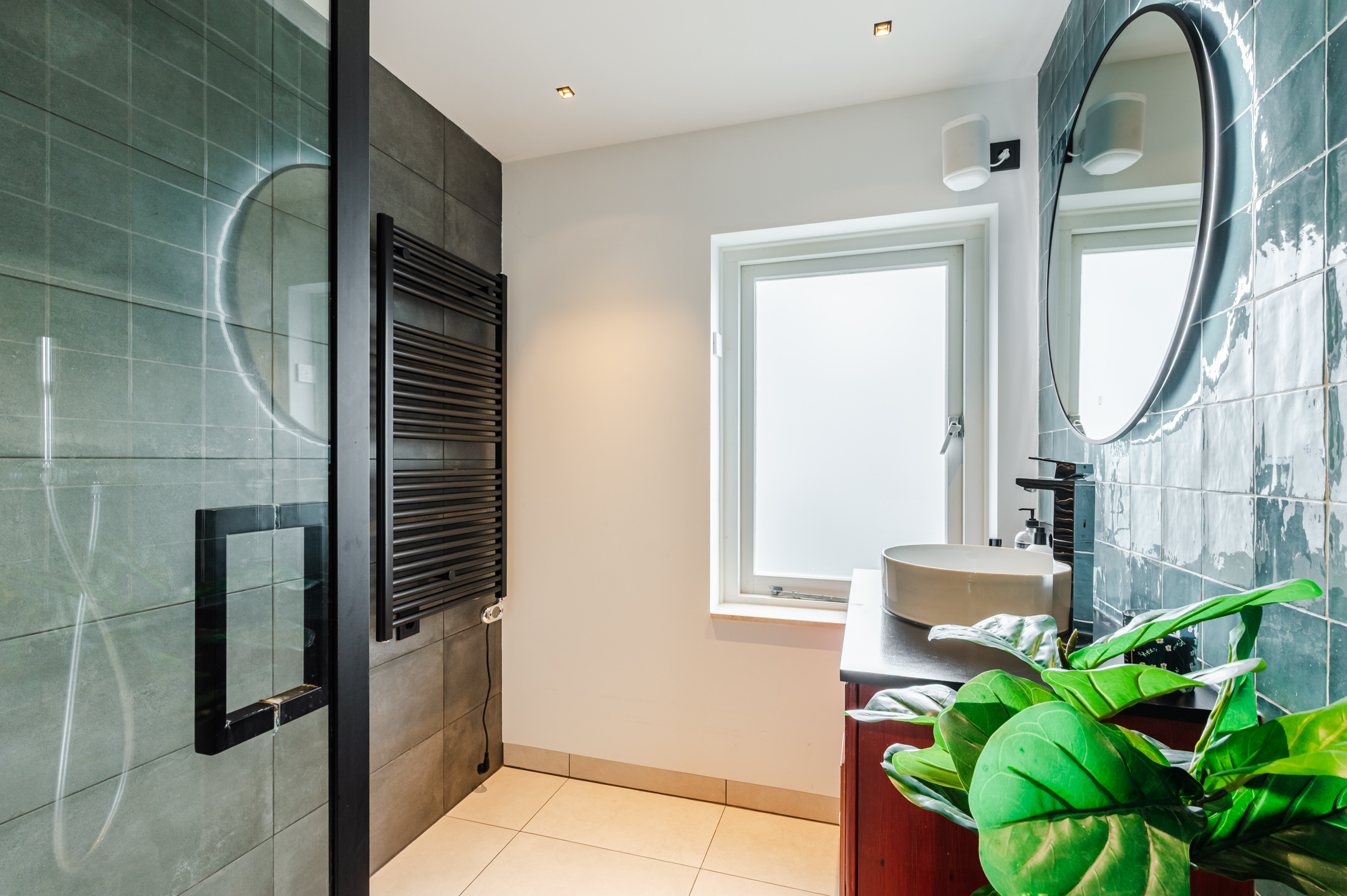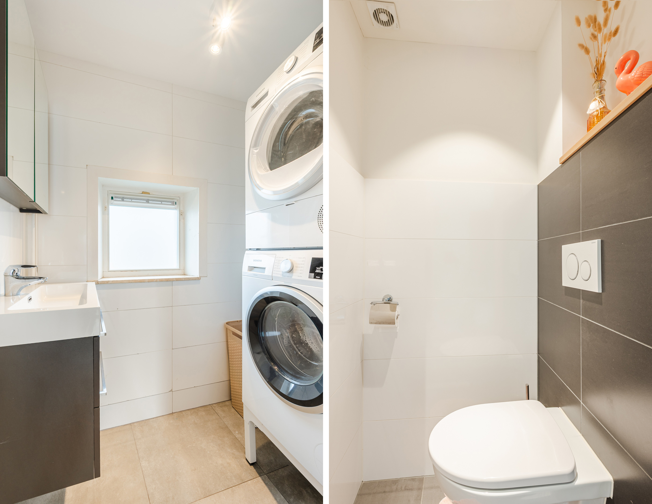 Overloop met een separaat tweede toilet (hangend). Hier bevinden zich twee ruime slaapkamers en een moderne badkamer (2023) die is uitgerust met een inloopdouche, stijlvol wastafelmeubel en een designradiator. Erg praktisch is de aparte wasruimte op deze verdieping.