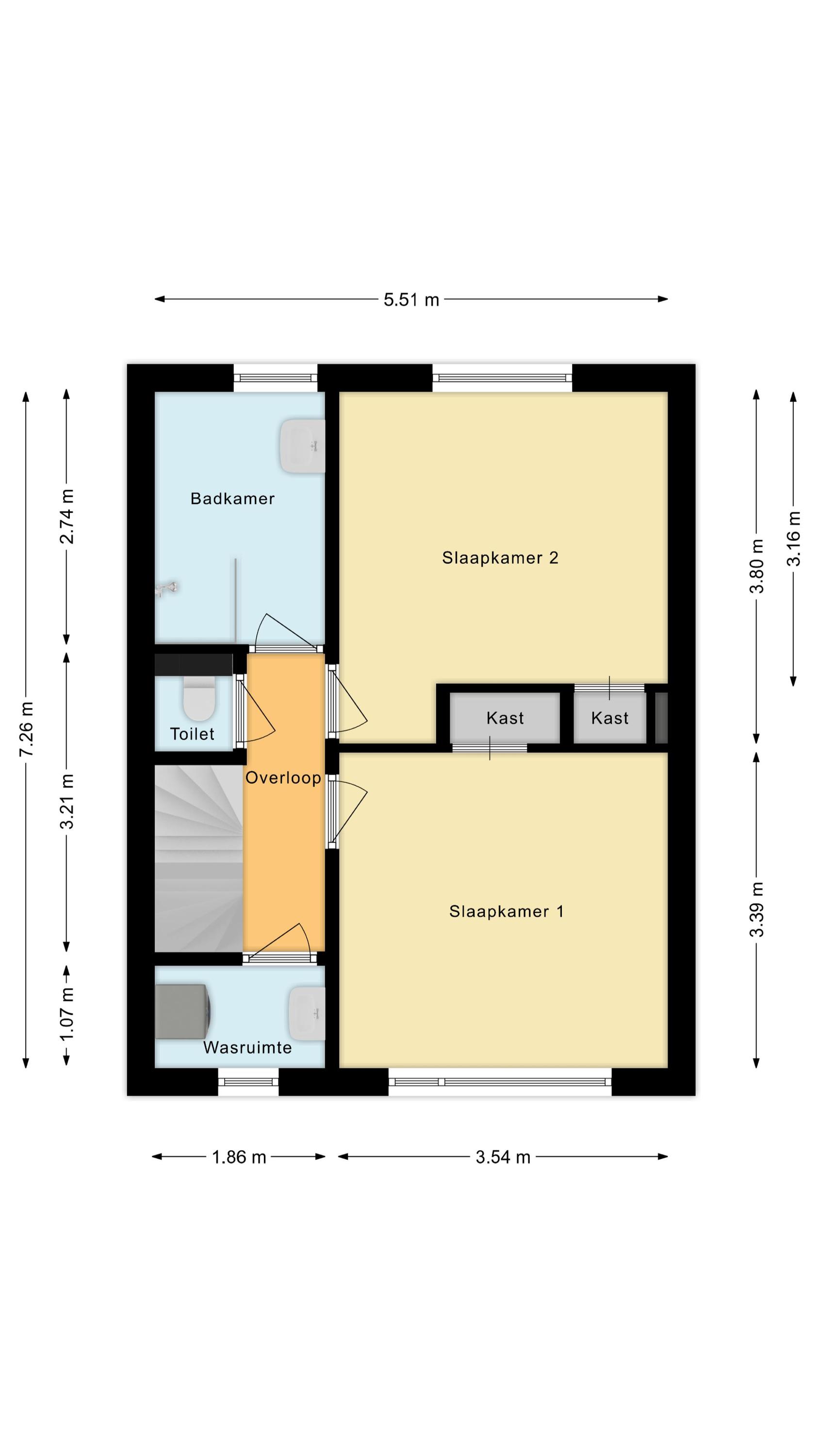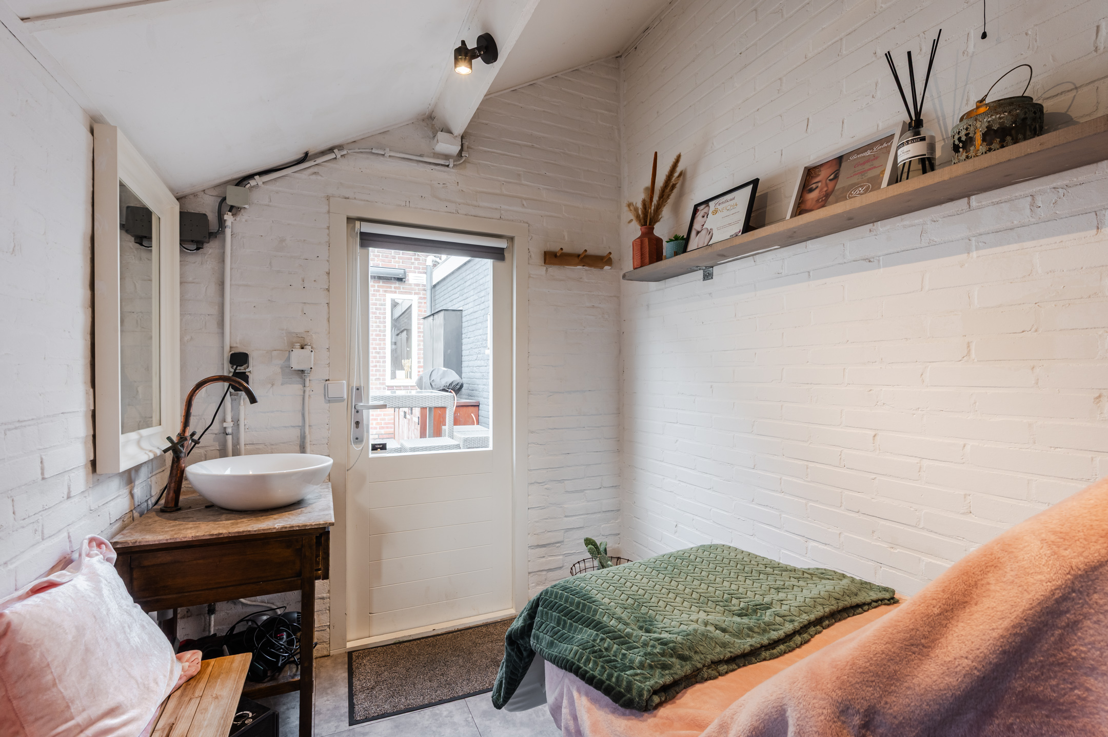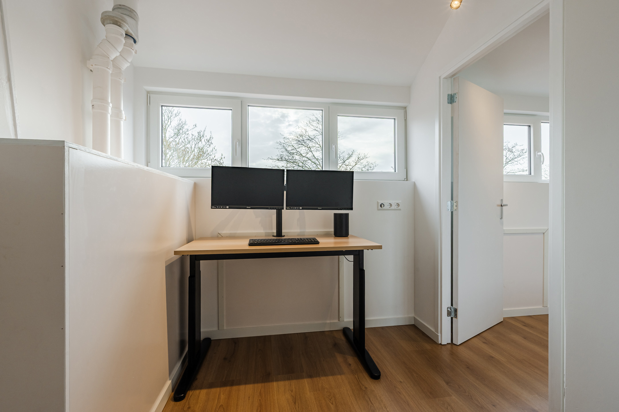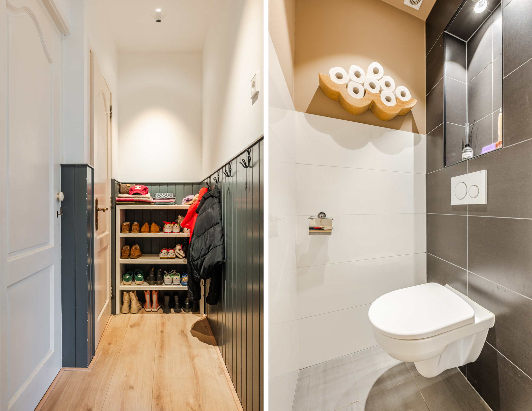 Overloop met een separaat tweede toilet (hangend). Hier bevinden zich twee ruime slaapkamers en een moderne badkamer (2023) die is uitgerust met een inloopdouche, stijlvol wastafelmeubel en een designradiator. Erg praktisch is de aparte wasruimte op deze verdieping.