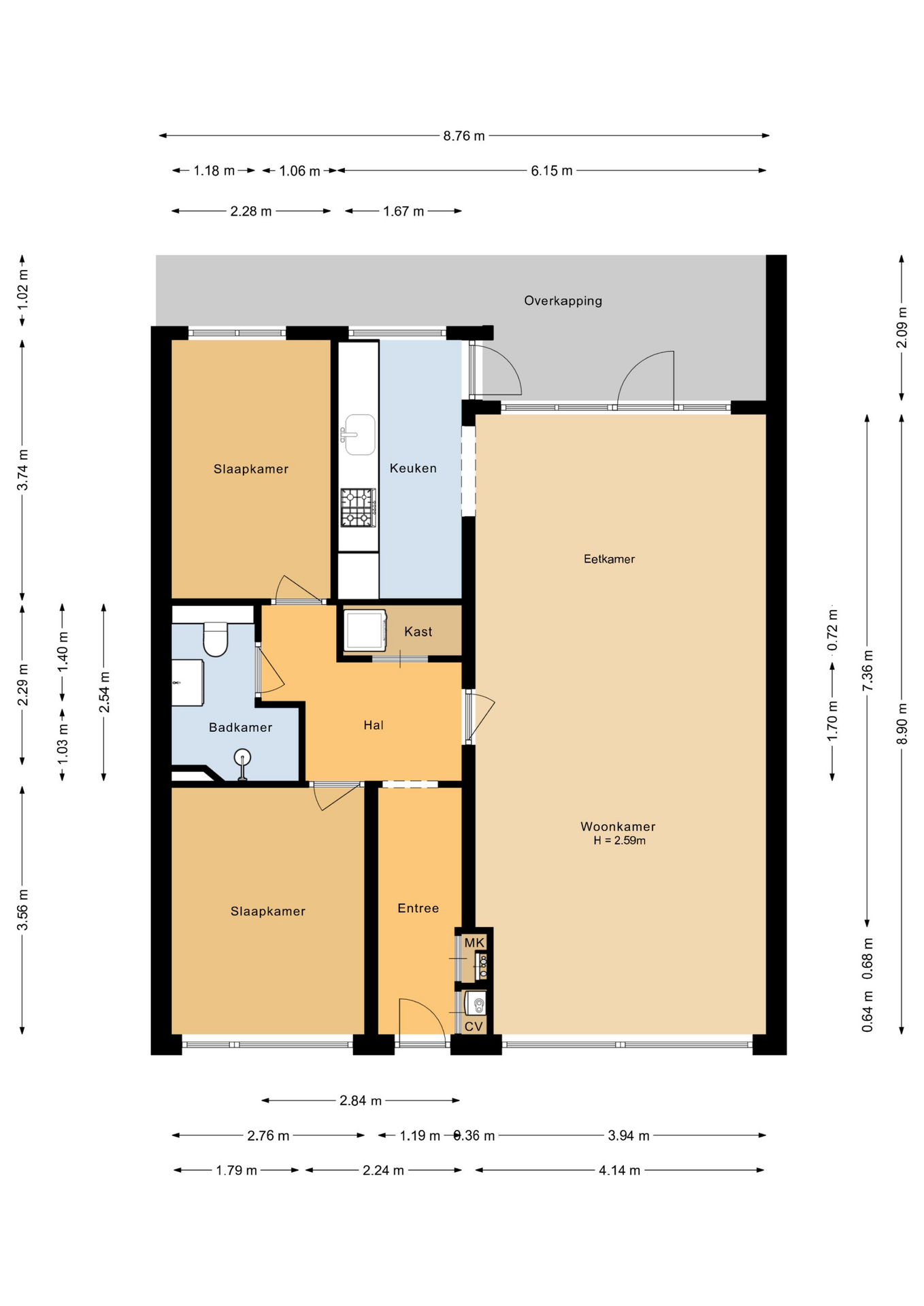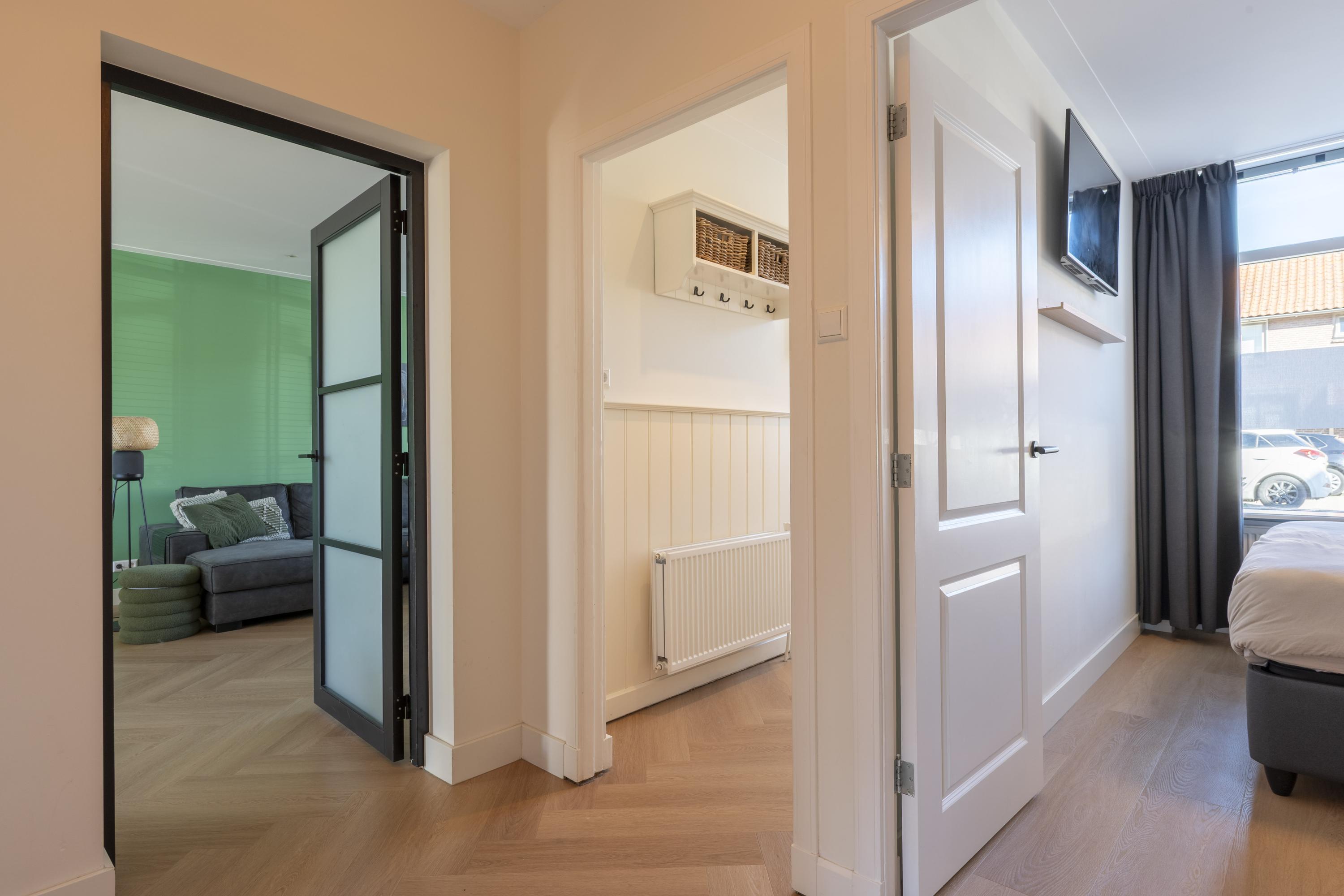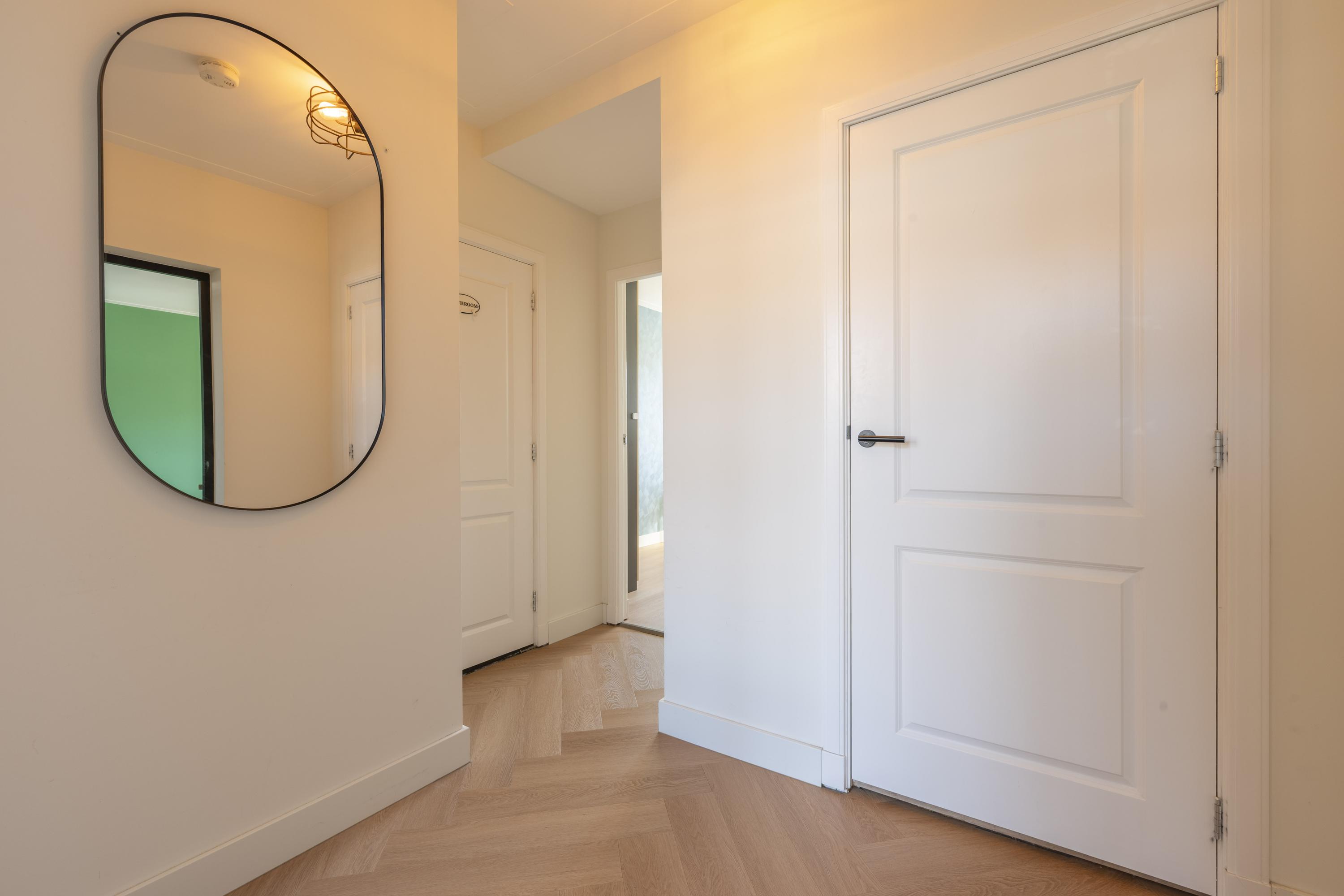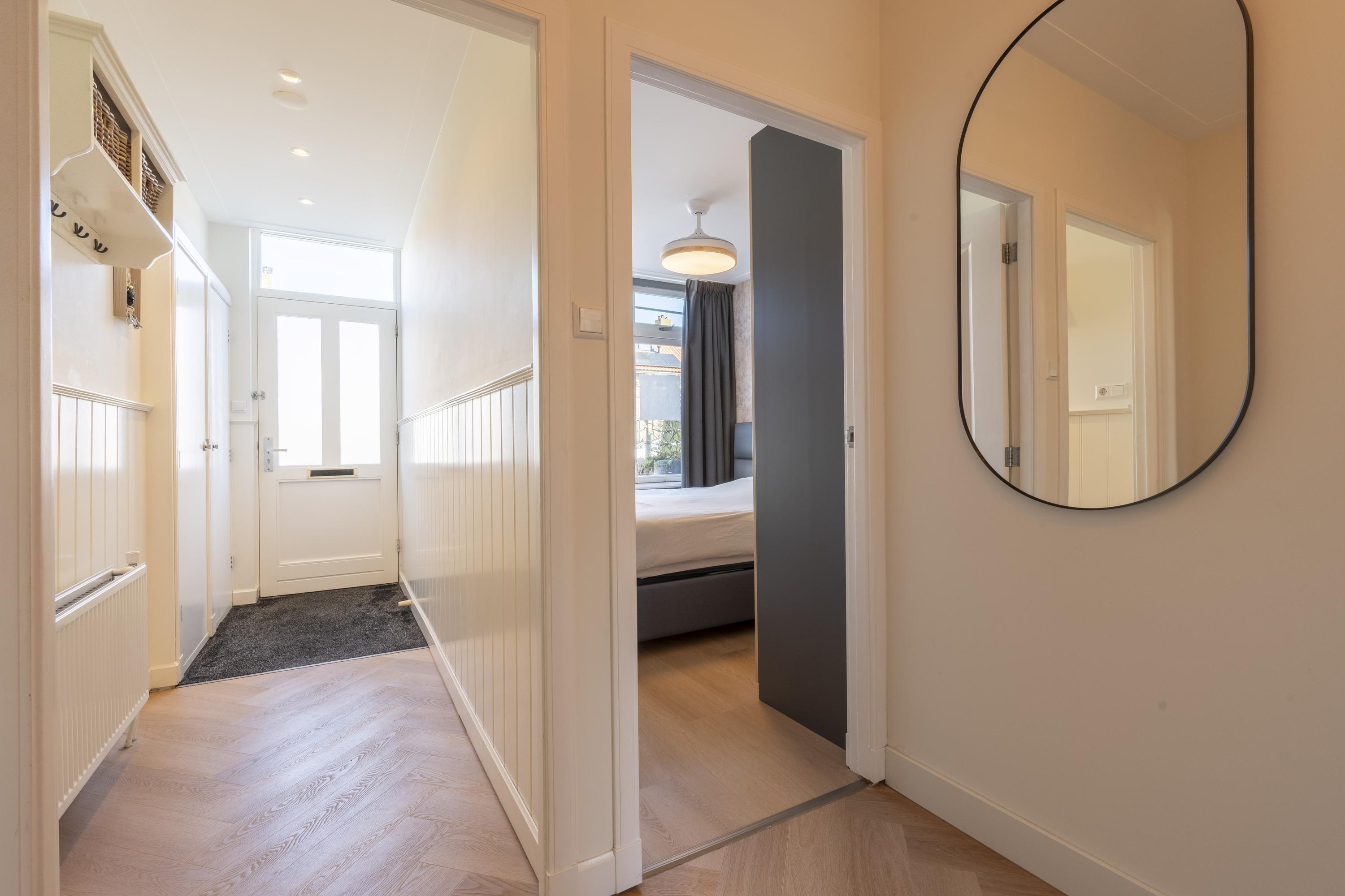 Via de verzorgd aangelegde voortuin met oprit bereikt u de hoofdentree van de woning. U komt binnen in een ruime entree met meterkast en voldoende ruimte voor een garderobe. De centrale hal beschikt over een praktische wasruimte met plaats voor een wasmachine en droger. Vanuit de hal heeft u toegang tot twee ruime slaapkamers en een nette badkamer, voorzien van een douche, wastafelmeubel, handdoekradiator en hangtoilet.